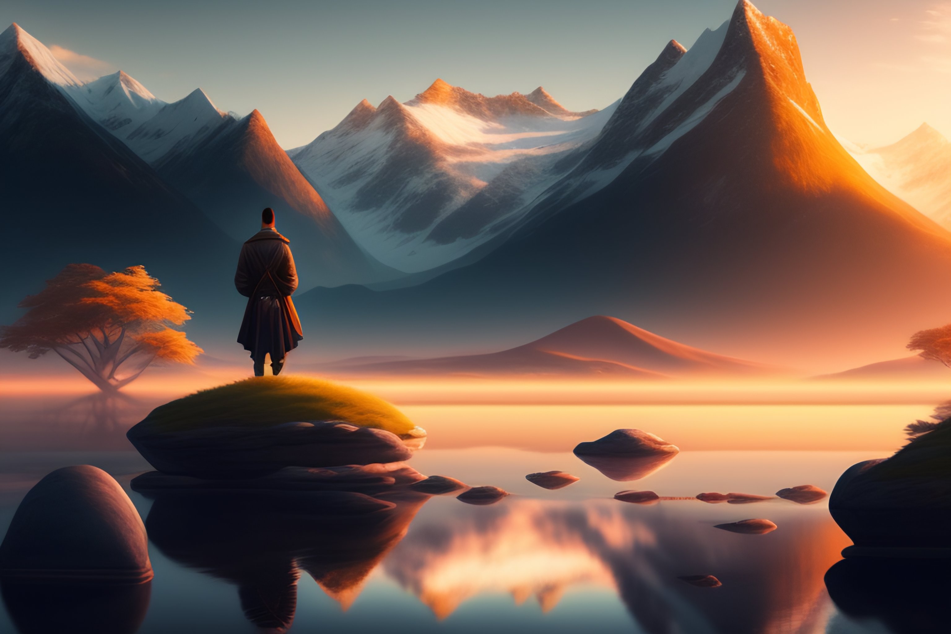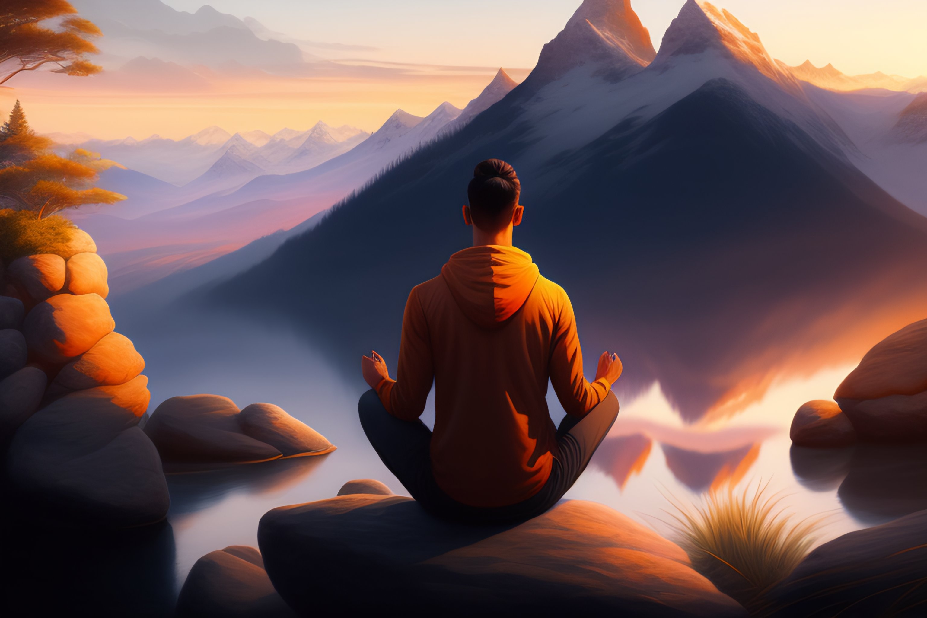 Photo image of a person meditating in nature with a peaceful sunset, around the mountains, wide view, ultra realistic, intricate, elegant, highly detailed, digital painting, artstation, concept art, smooth, sharp focus, wide angle shot, illustration, art by artgerm and greg rutkowski and alphonse mucha