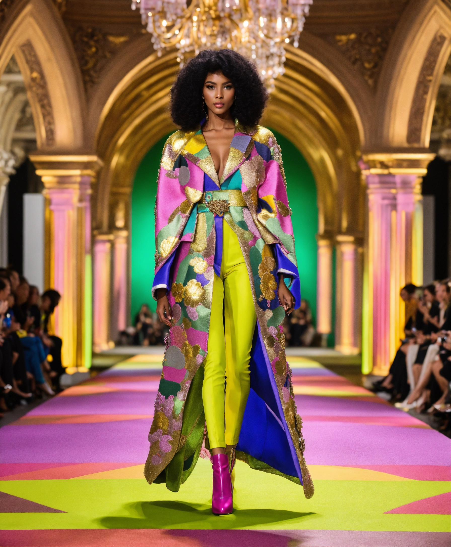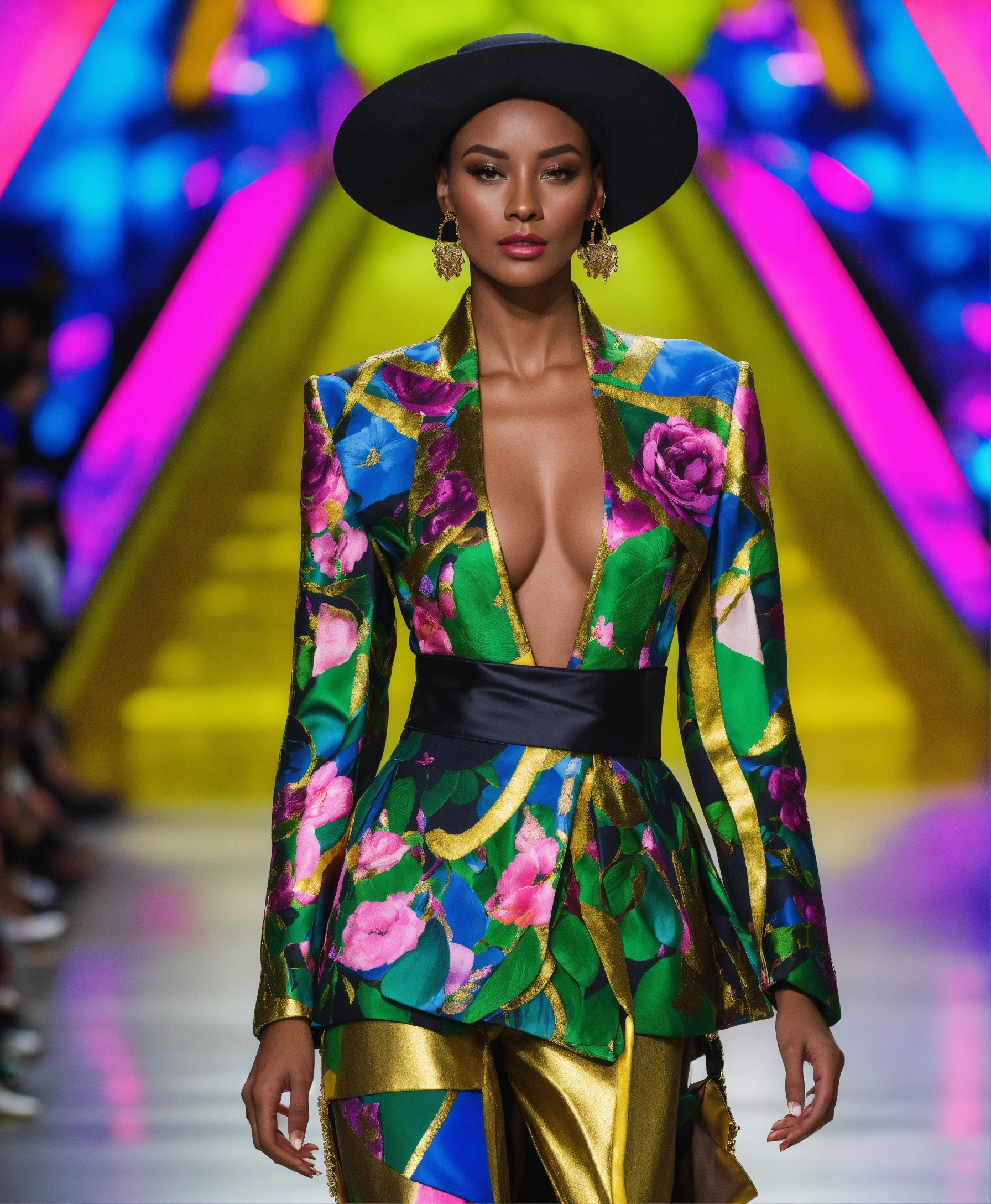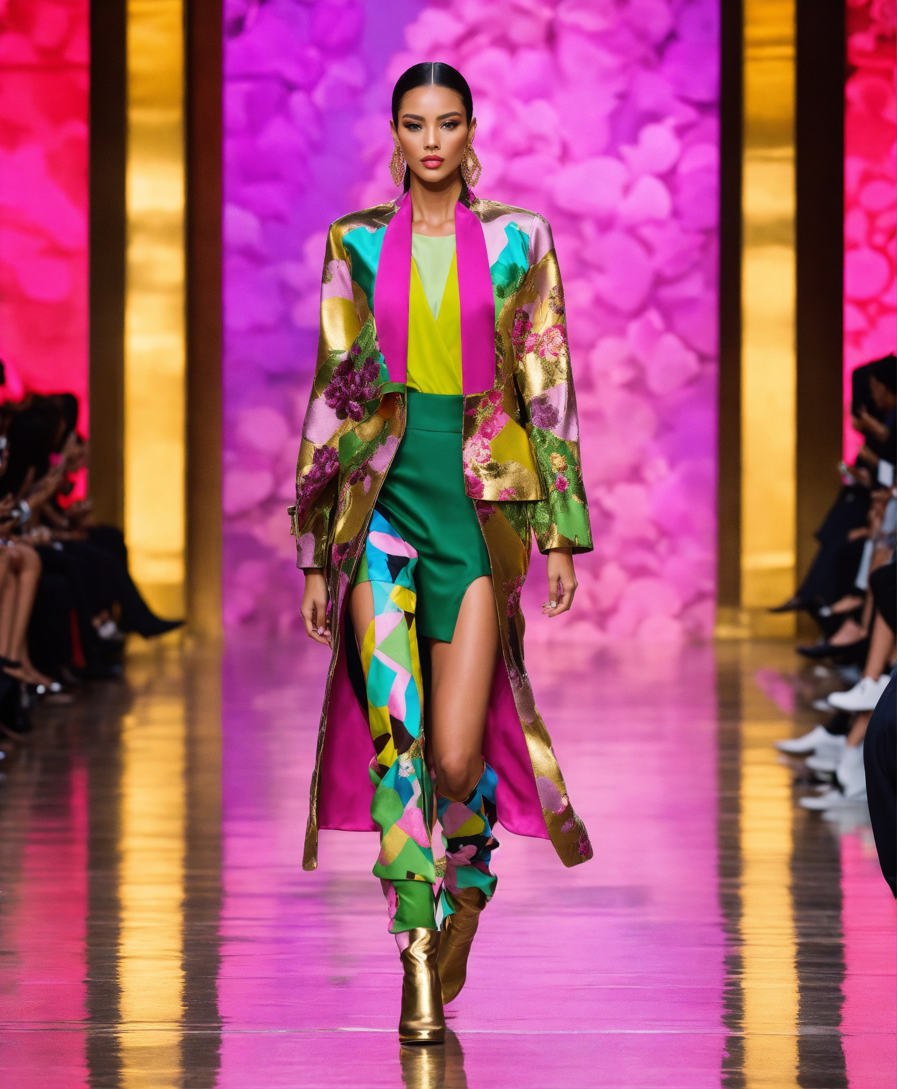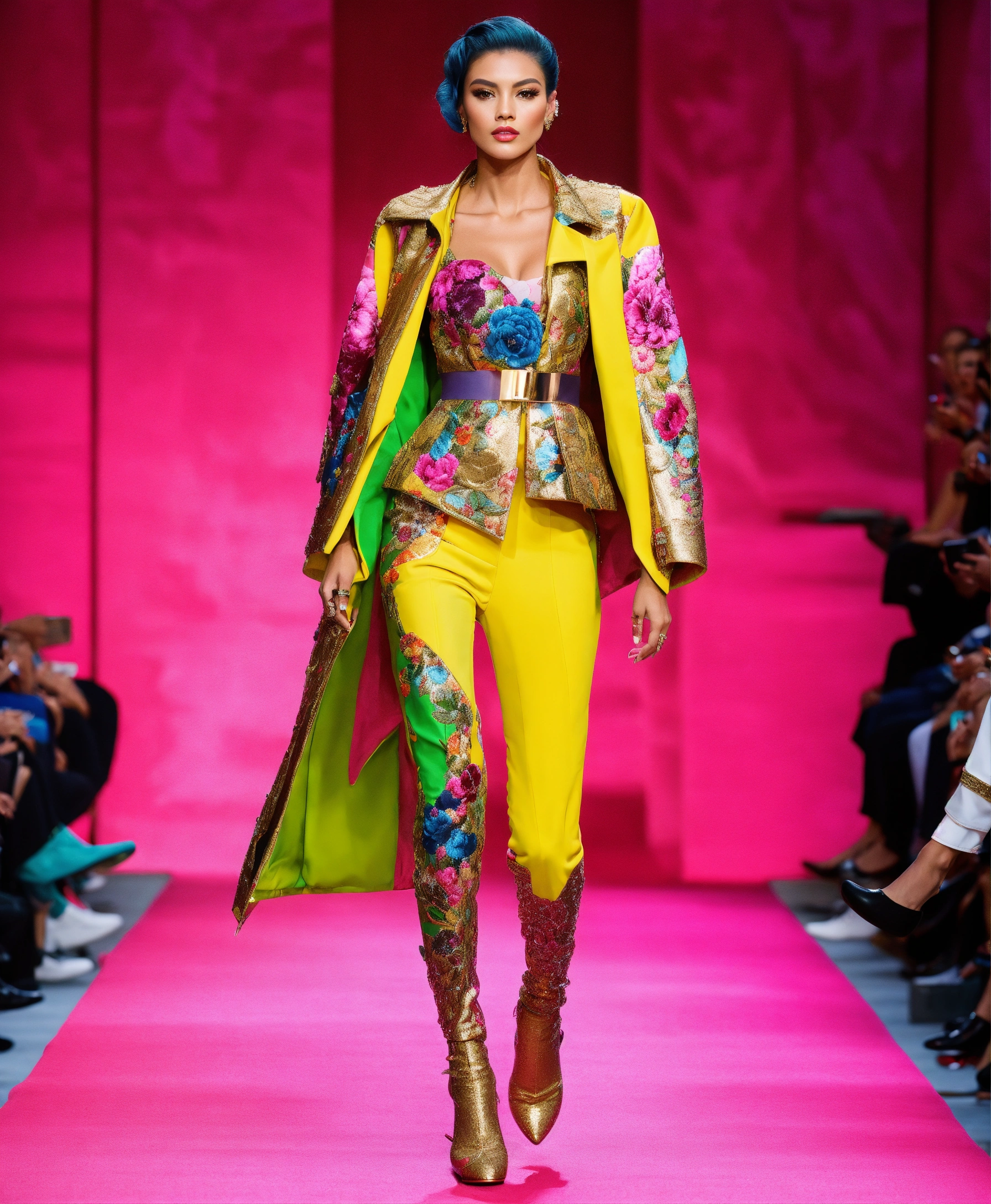 Ultra realistic full body photo of a stylish edgy american model walking the runway modeling summer designer novelty interesting complex unusual street sporty classy modern dolman sleeve outfit brave, paris versailles details cutouts and and gold geometric pattern floral structured tailored jacket pink gold green lilac peridot silver magenta lime fuchsia yellow blue black gray copper mauve bronze haute couture ultimate elegance beautiful luxurious awesome appliques haute couture wealthy billionaire opulent majestic cutouts novelty resplendent magnificent sublime 12k