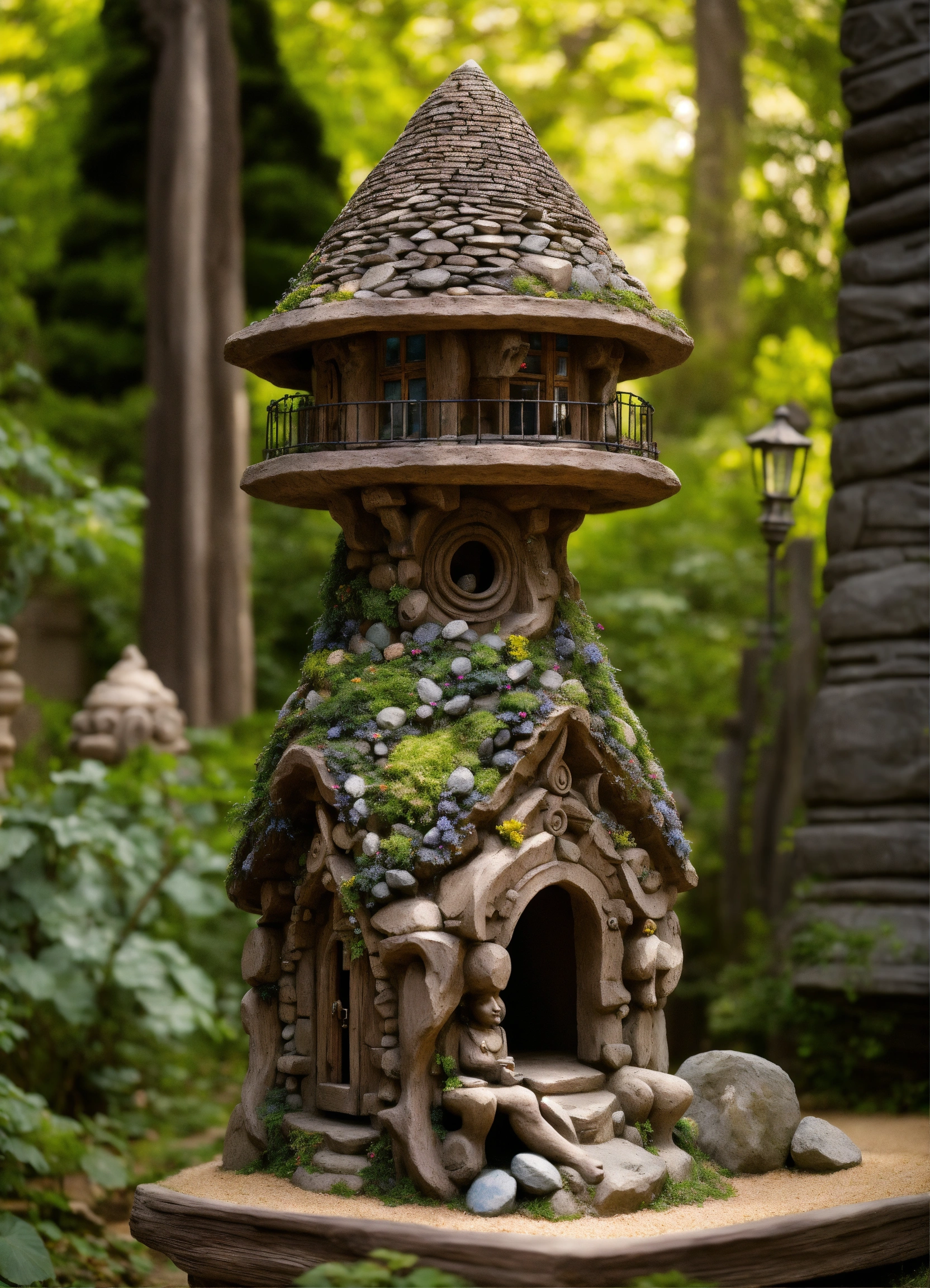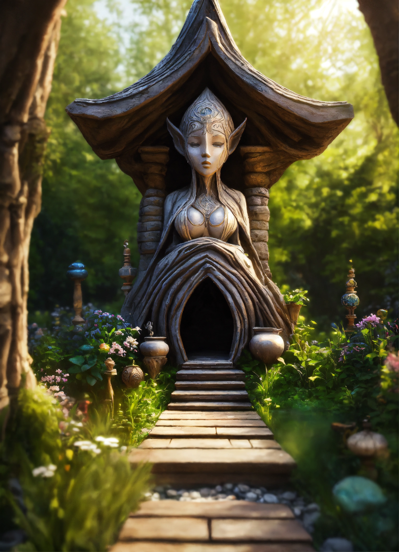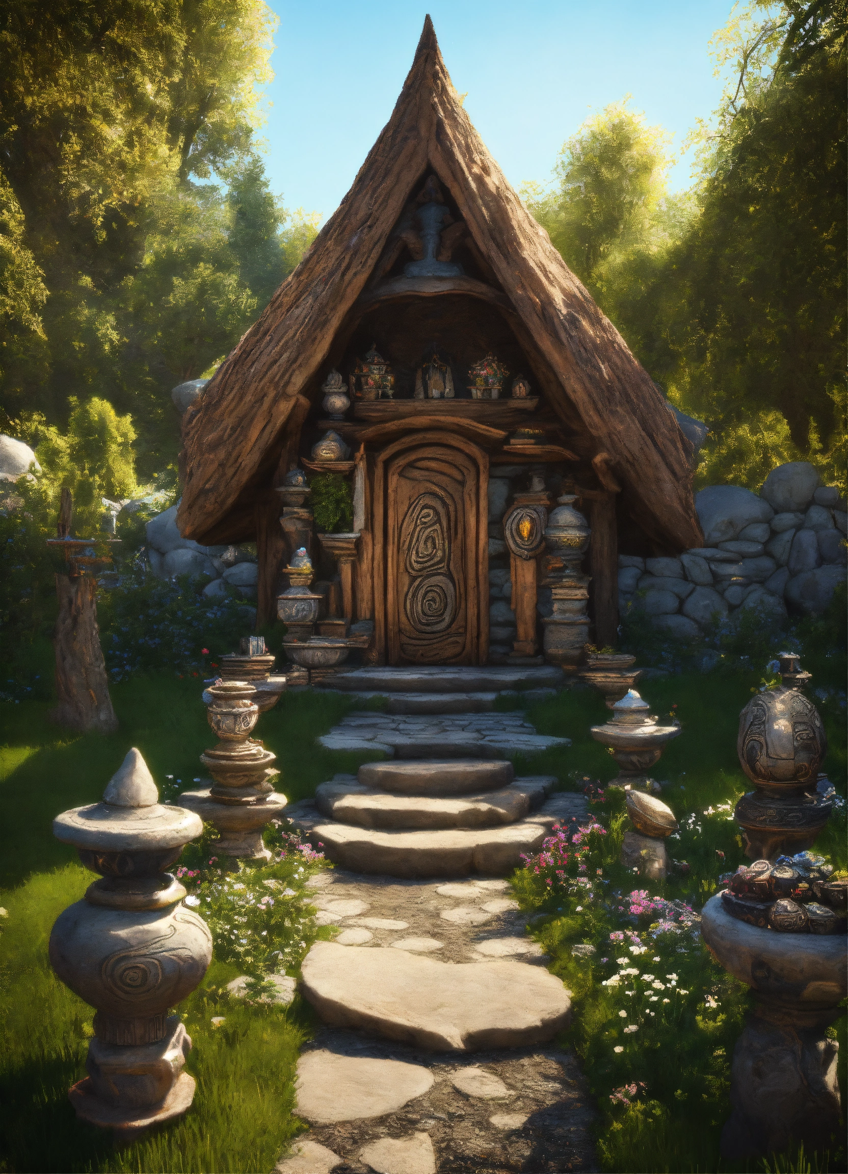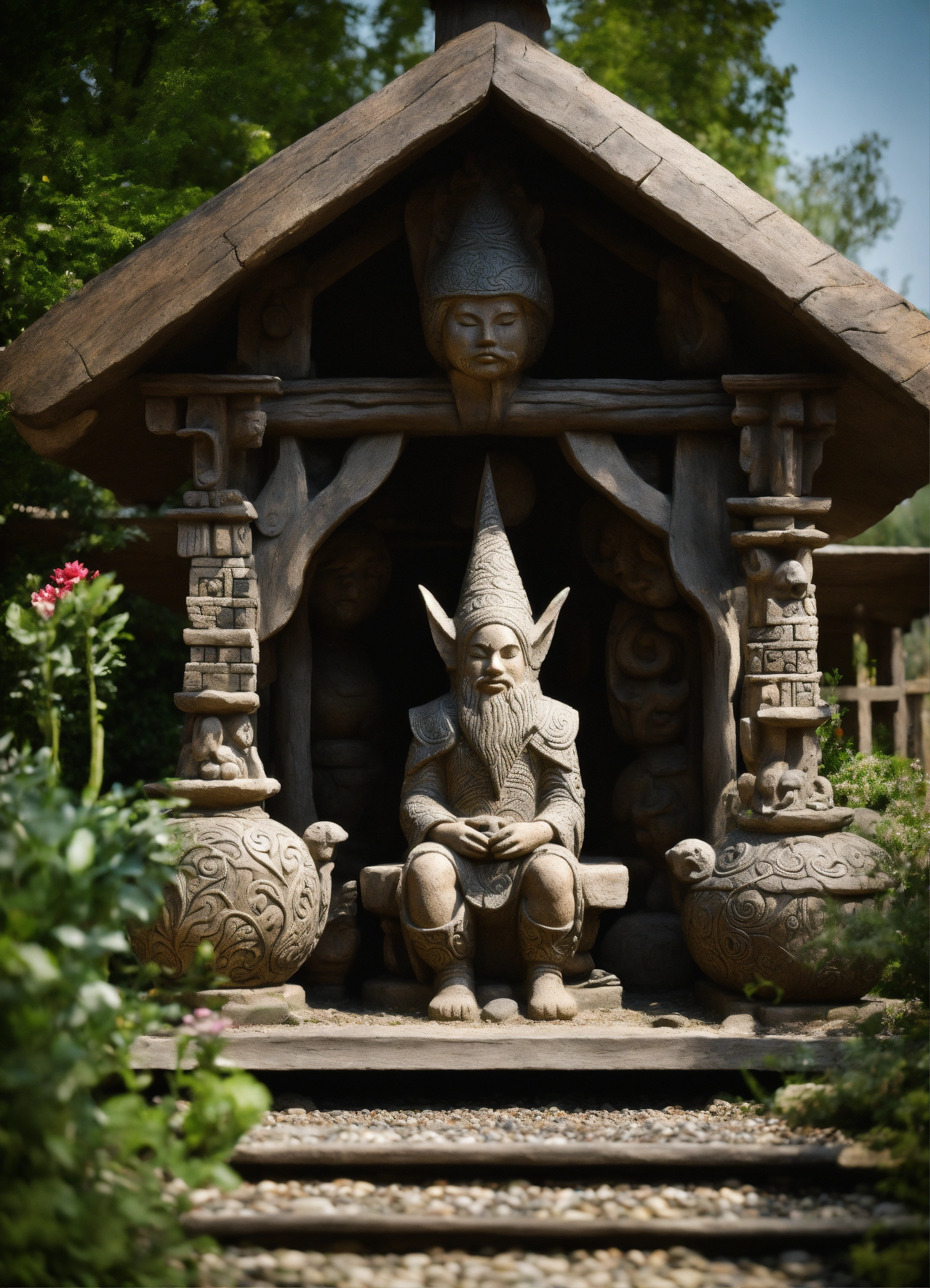 An ancient spiritual hooded female gnome medieval cabin . style of alex grey, giger.unreal engine.totem sculptures.swirling patterned stone pathway courtyard.wood.stone.driftwood.statues. artistic sculpture.air bnb house/backyard.stone lanterns.tall sculptured posts.pond