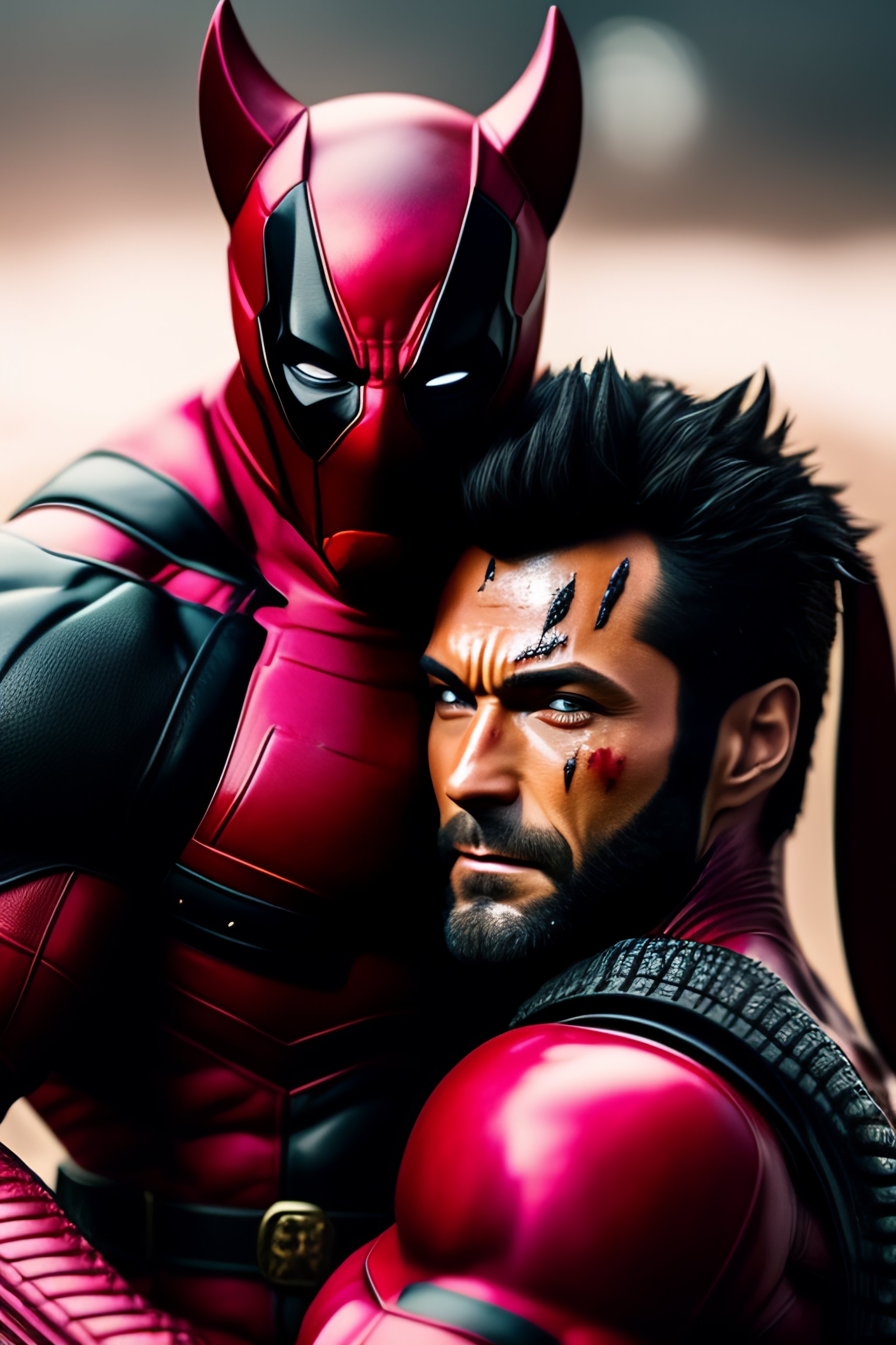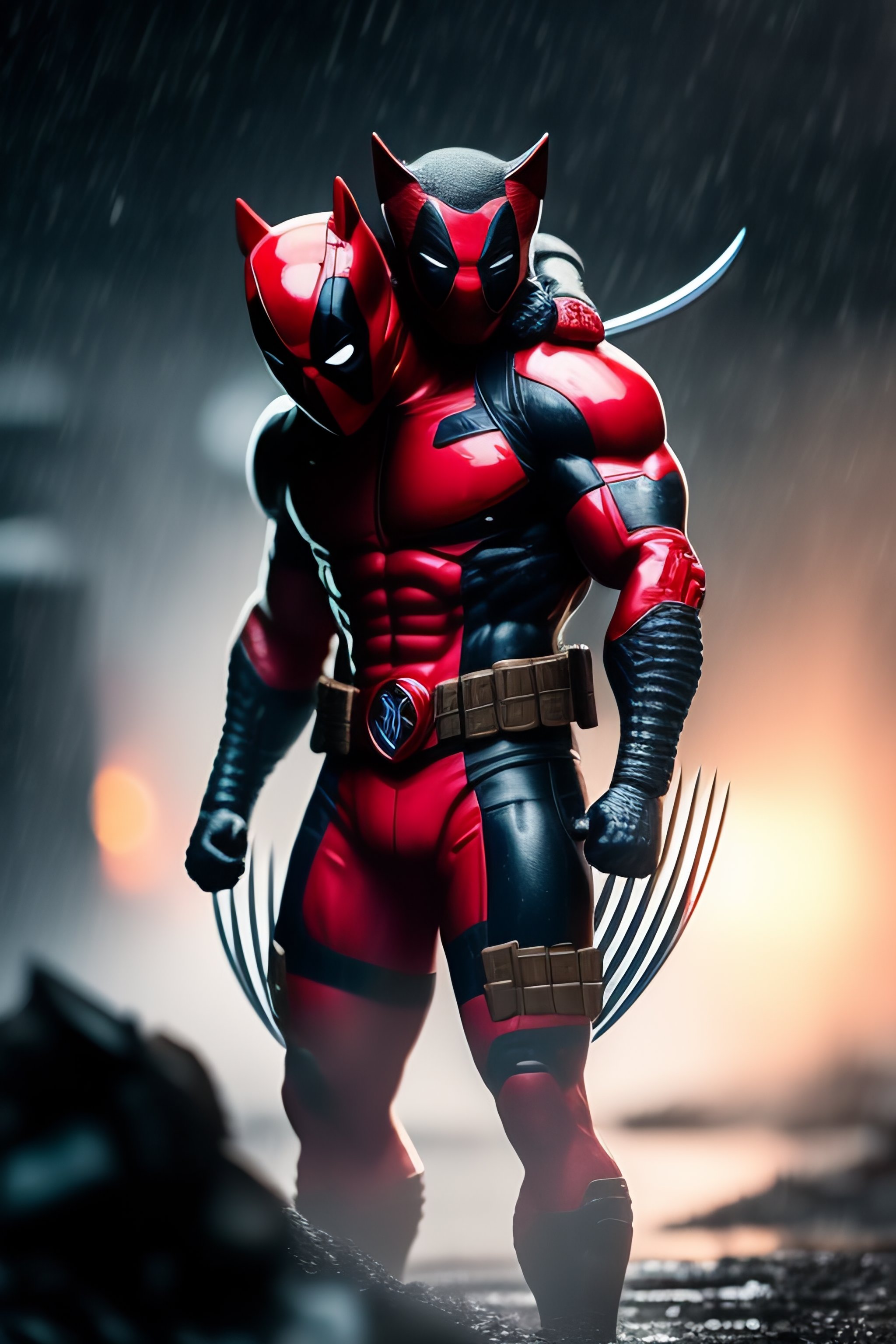 Wolverine carrying deadpool between his arms, on the ground under the rain, in battlfield full of mud and blood and damaged buildings