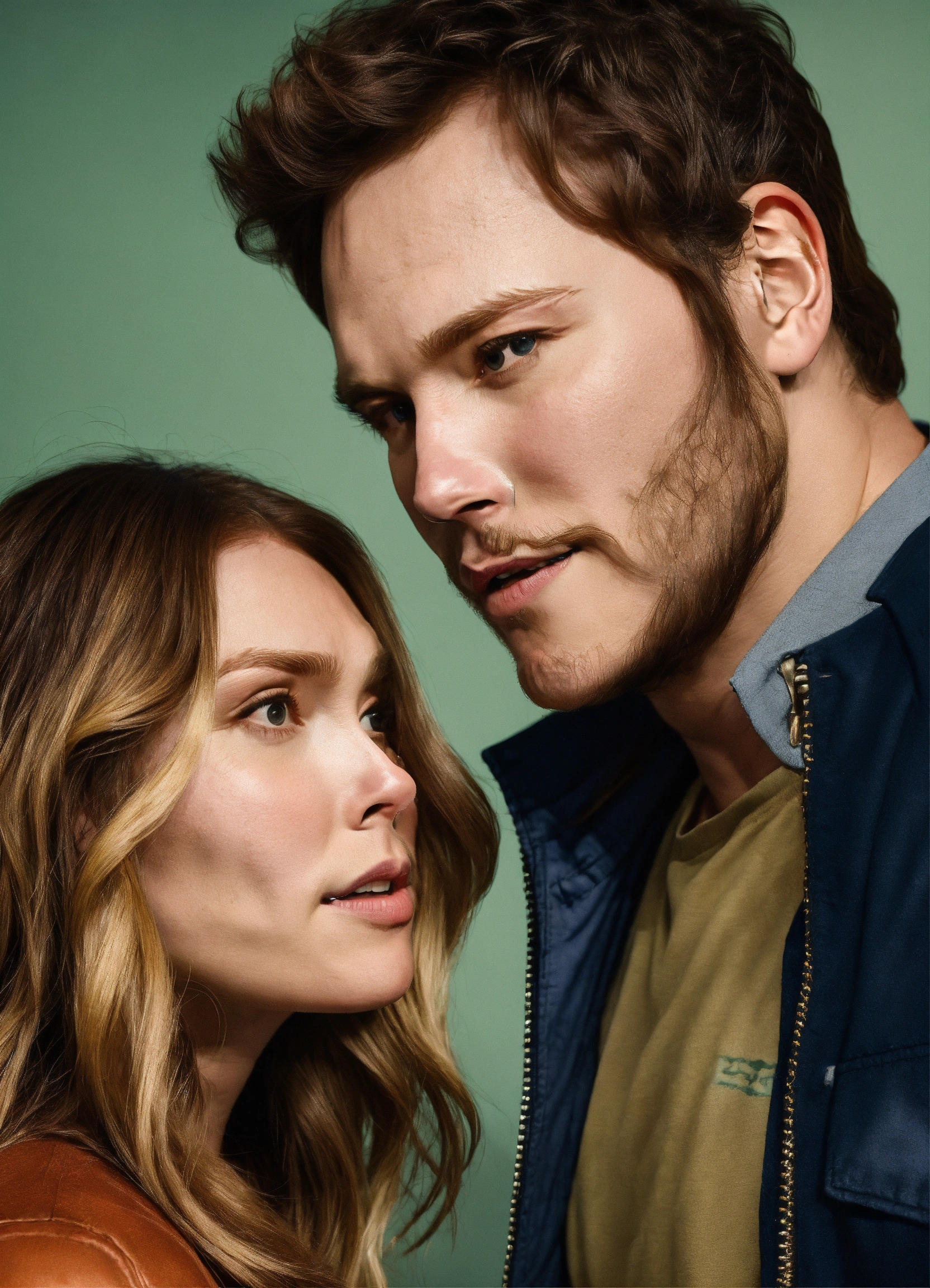 Chris pratt and elizabeth olsen are arguing each other in the restroom