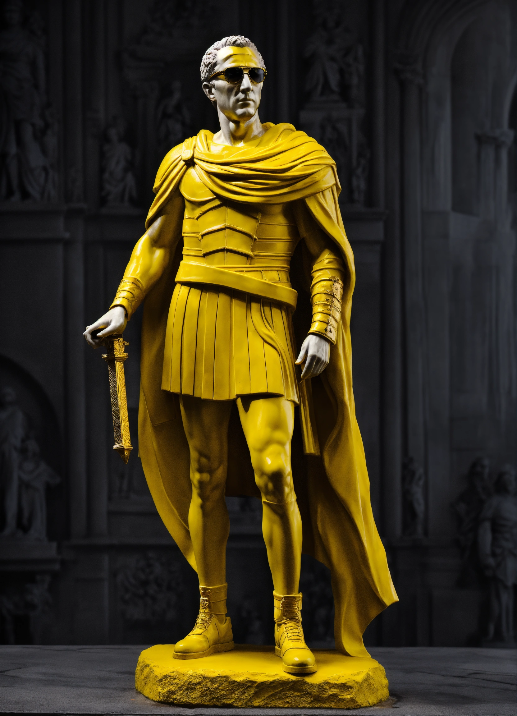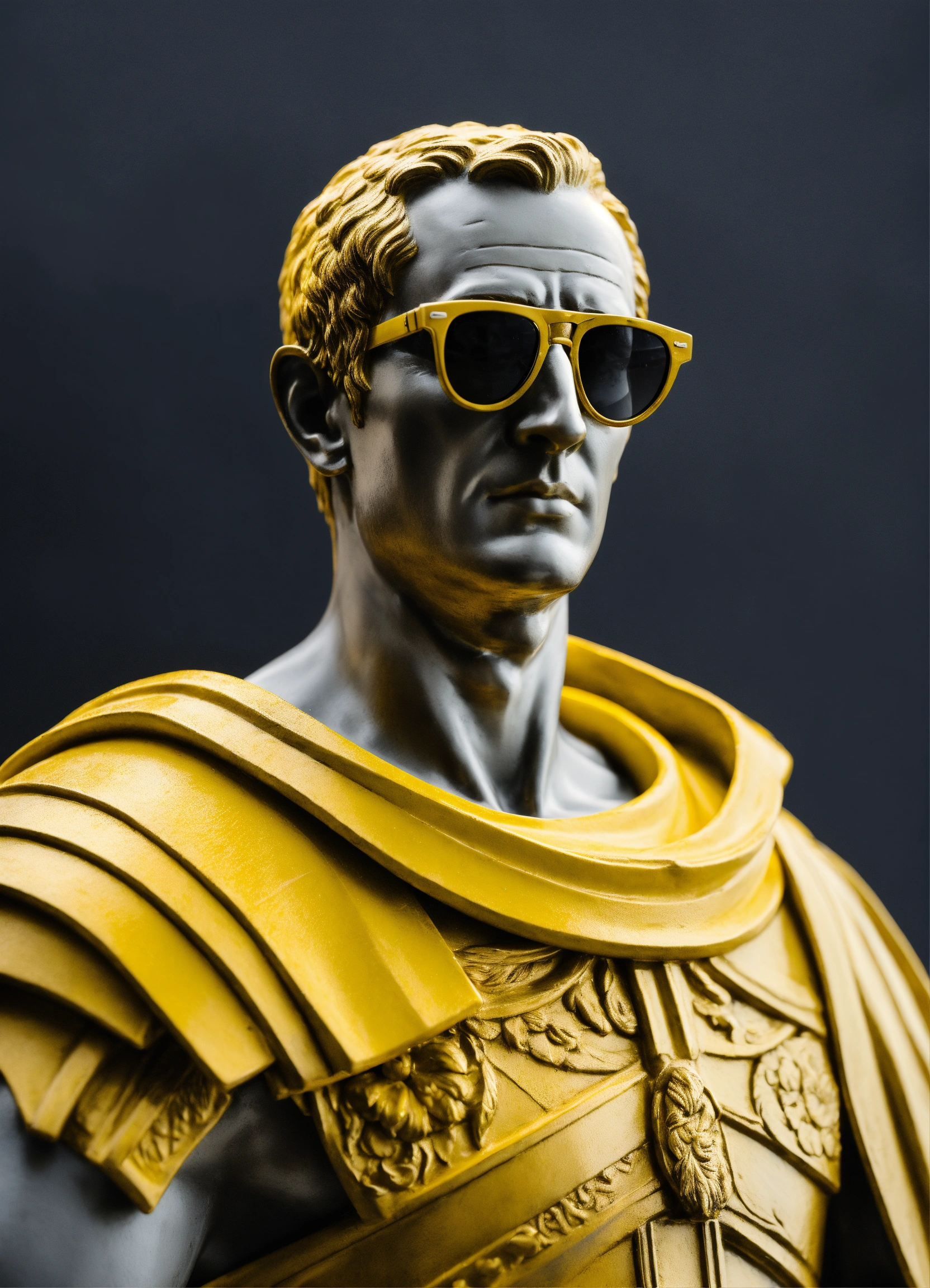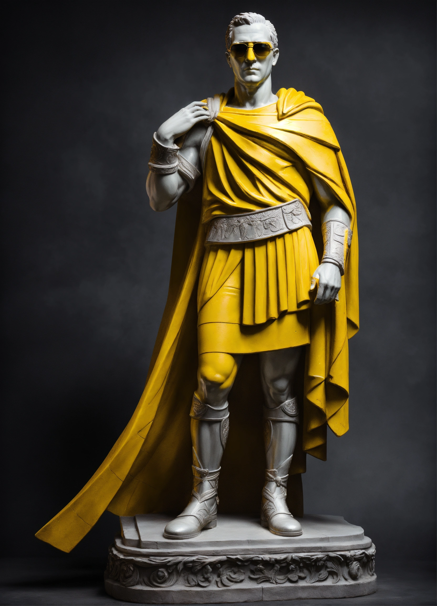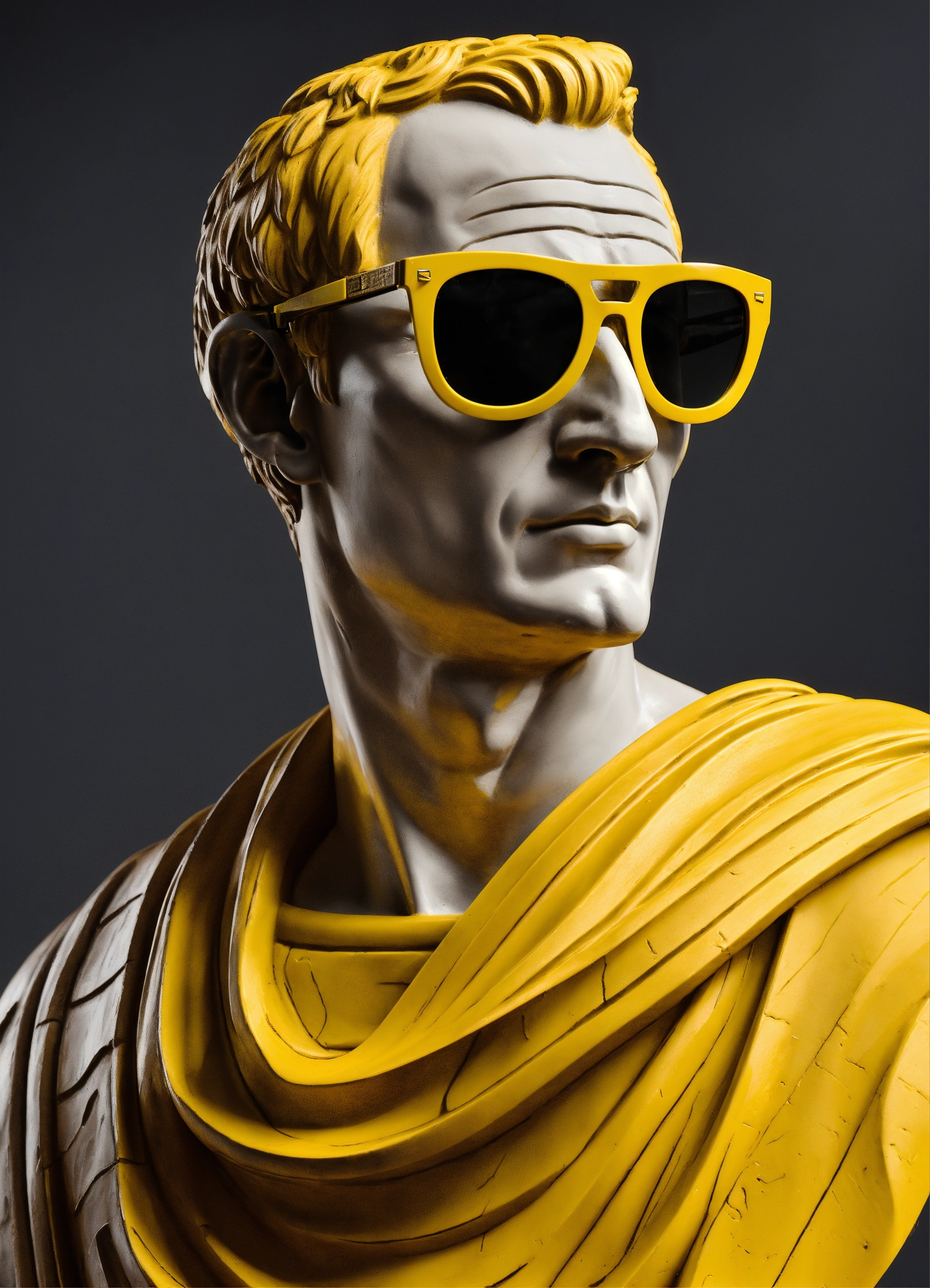 Julius caesar statue with yellow color and matte texture, with modern sunglasses and dark gray background