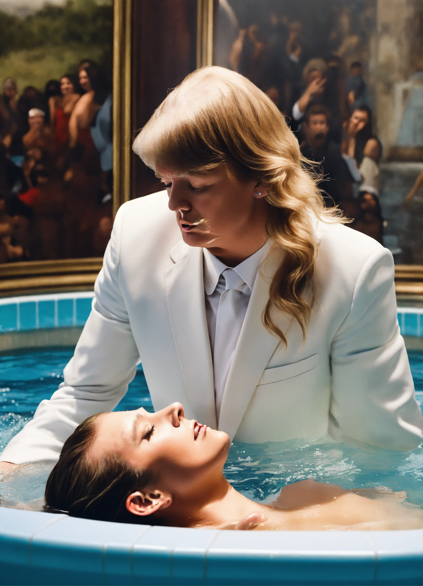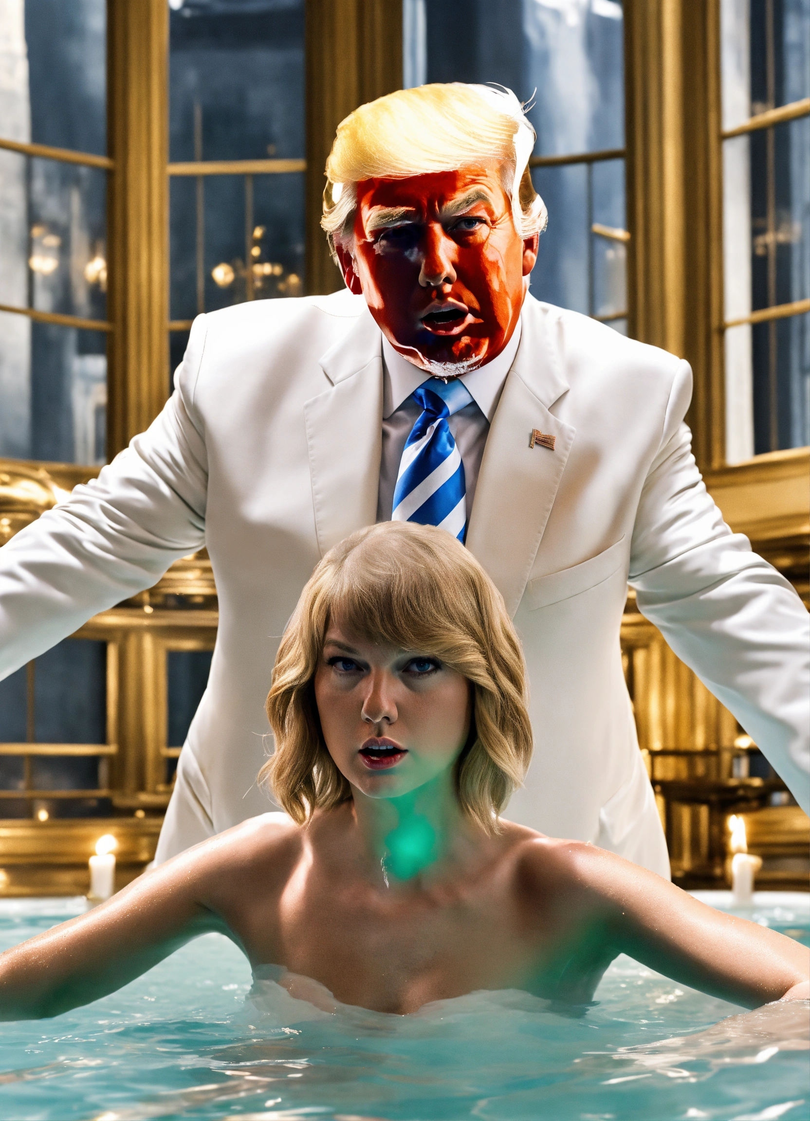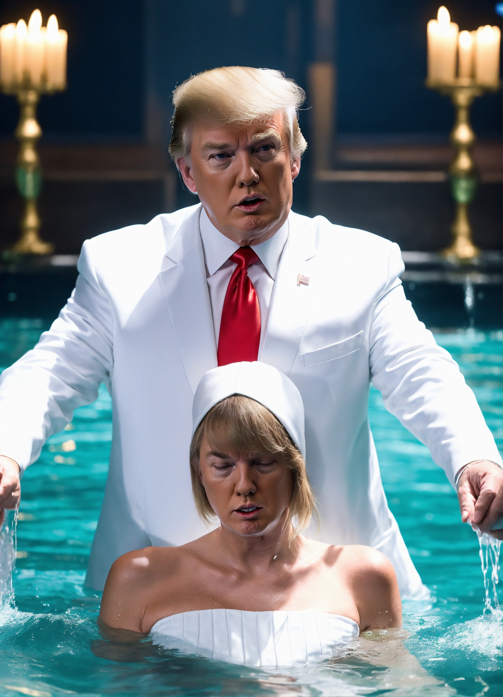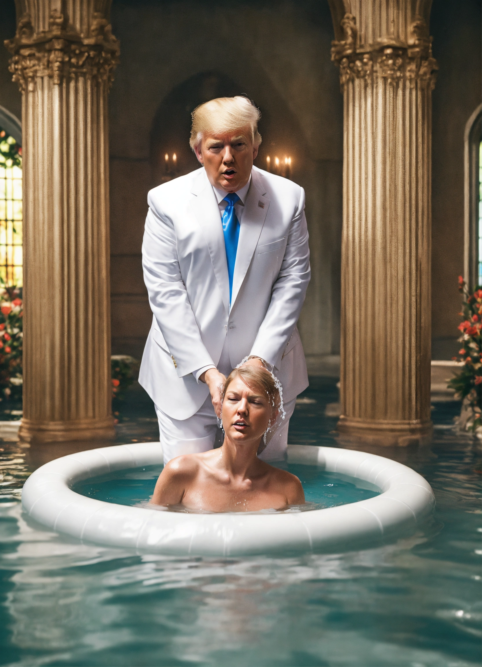 Photo realistic shot of donald trump in a white suit getting baptized by taylor swift