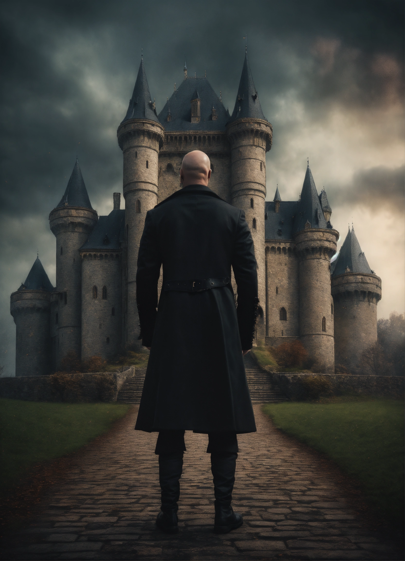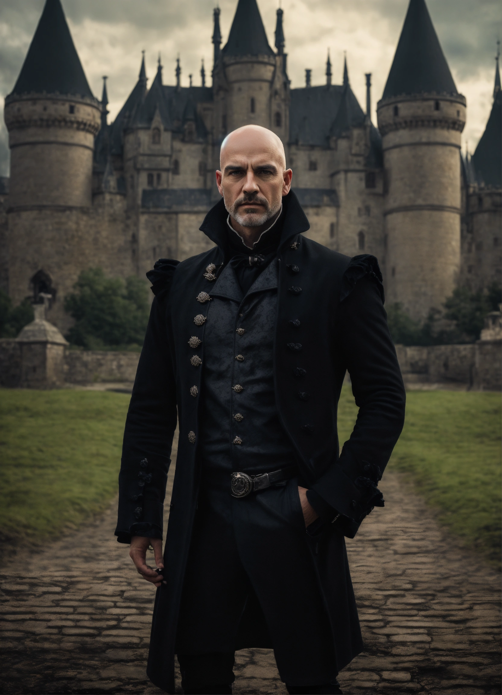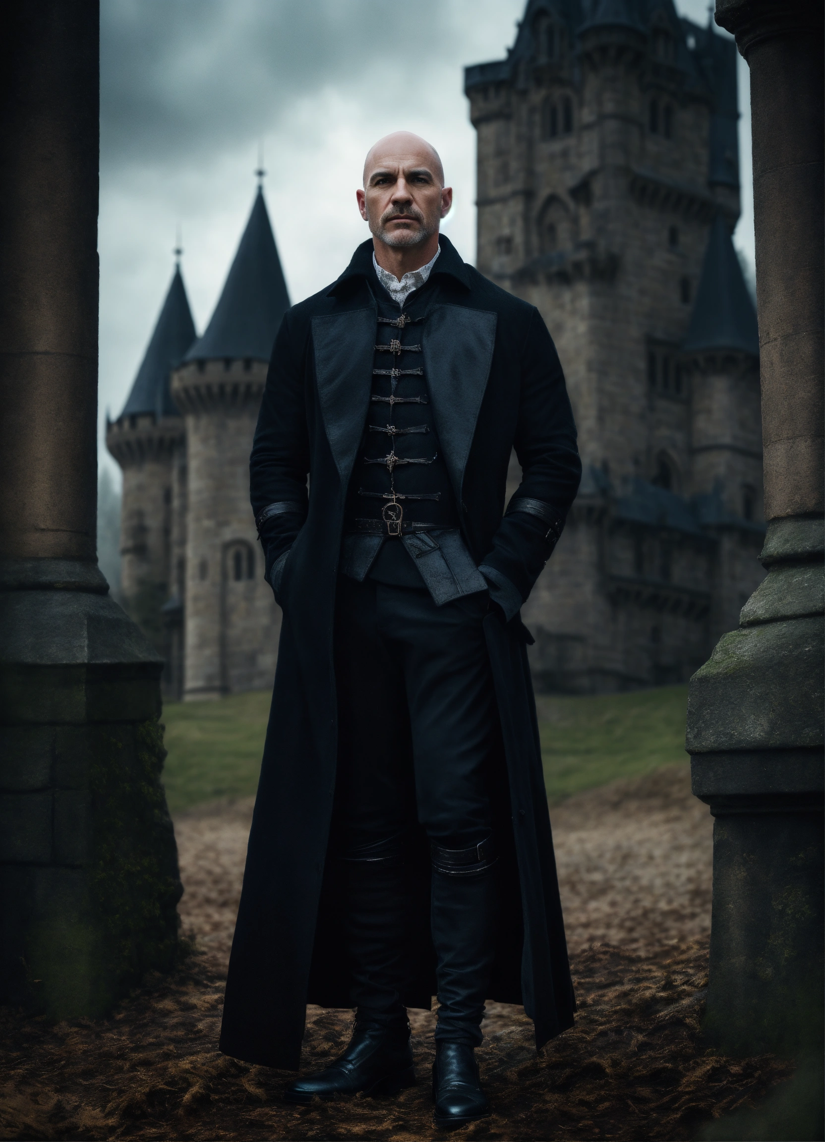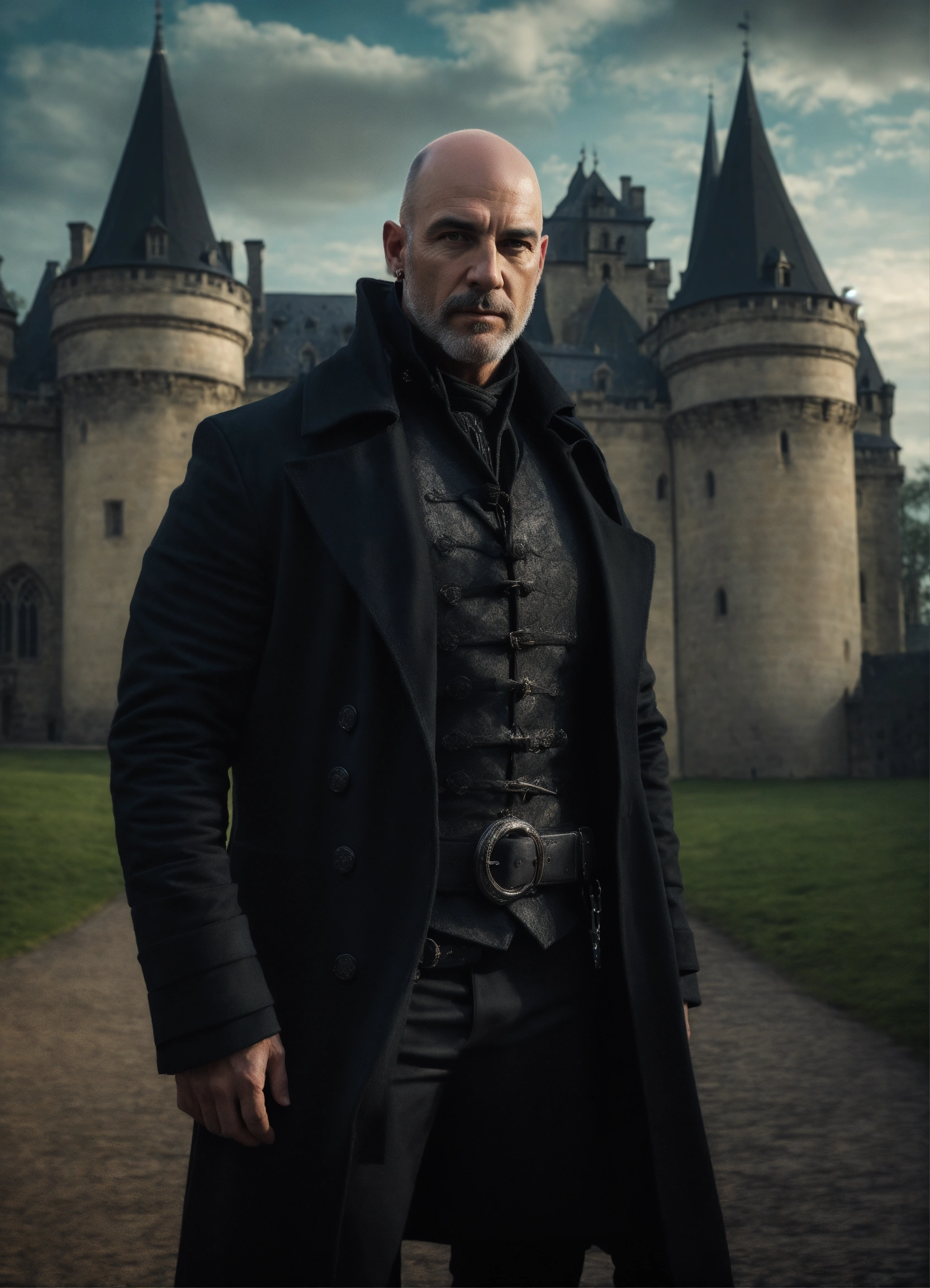 Portrait of a strong handsome bald man standing in front of a gothic castle wearing a black short coat, mystic, dark fantasy, realistic photo, high detail, digital painting, cinematic, stunning, hyper-realistic, sharp focus, high resolution 8k, insanely detailed