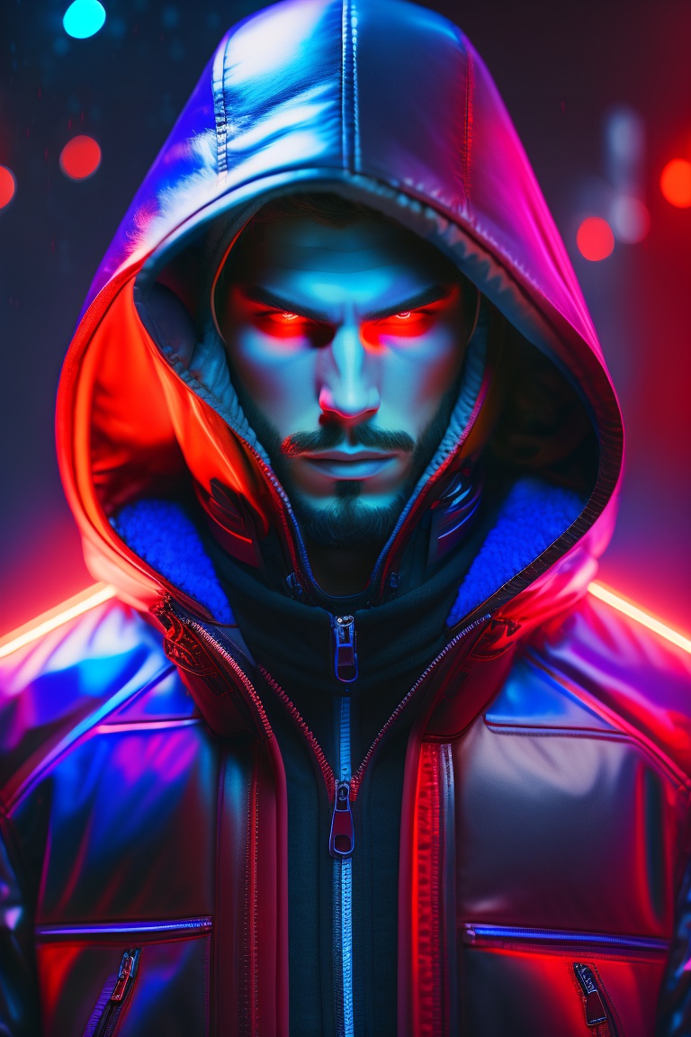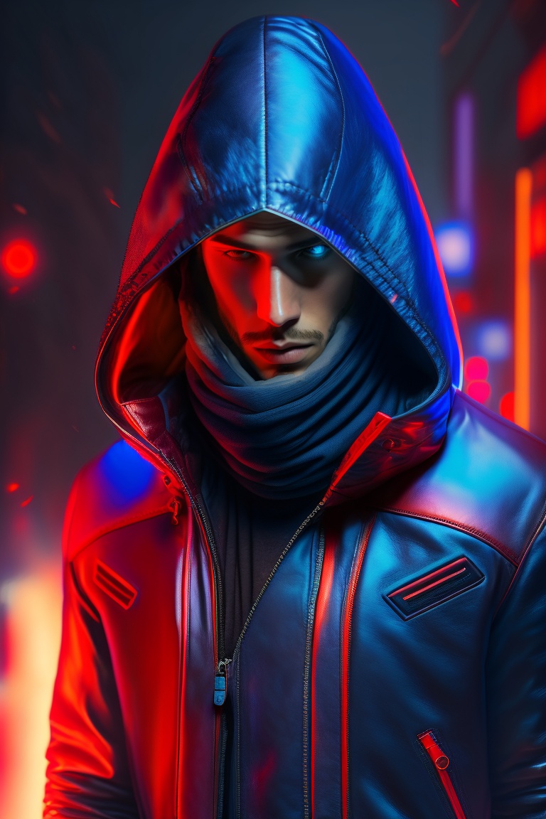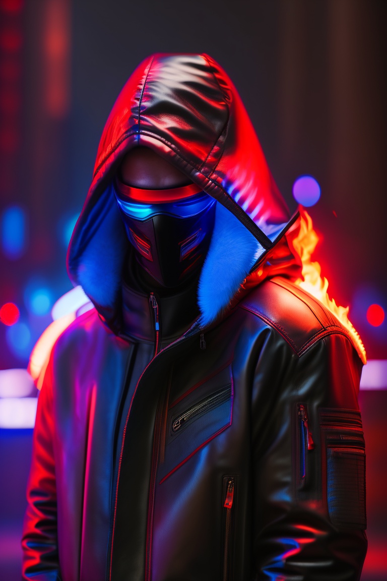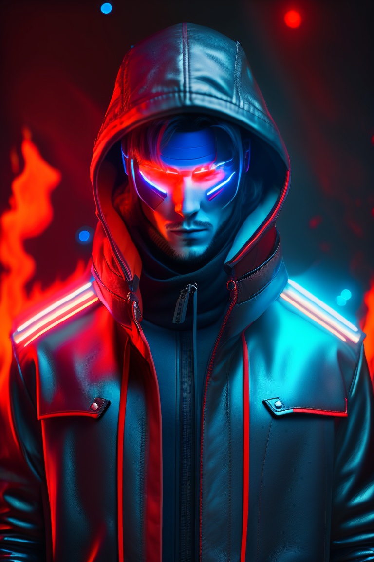 Cyberpunk hacker style man with hood and fire style red and blue neon light reflecting in open leather jacket, no face just neon eyes