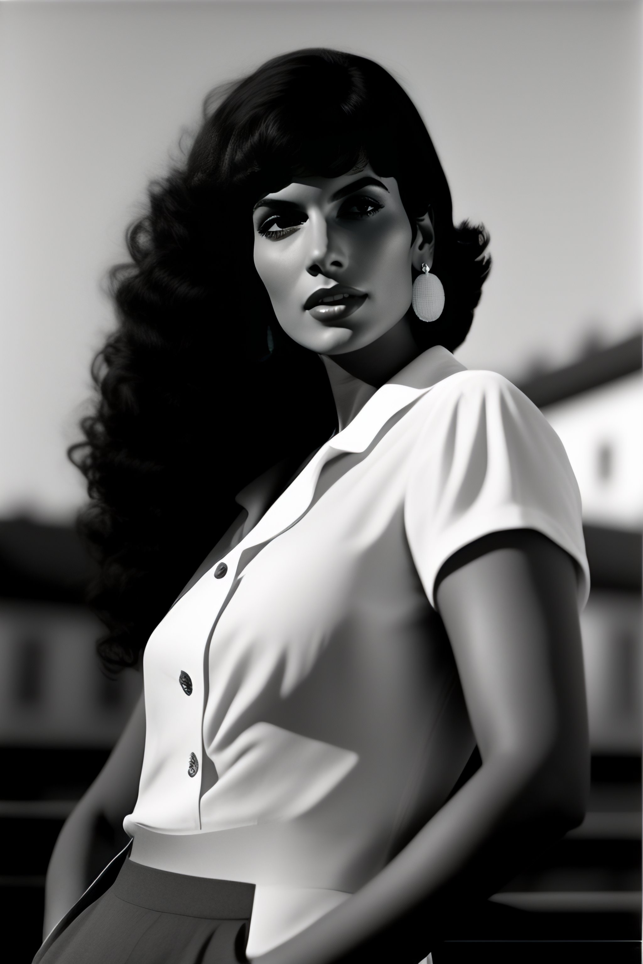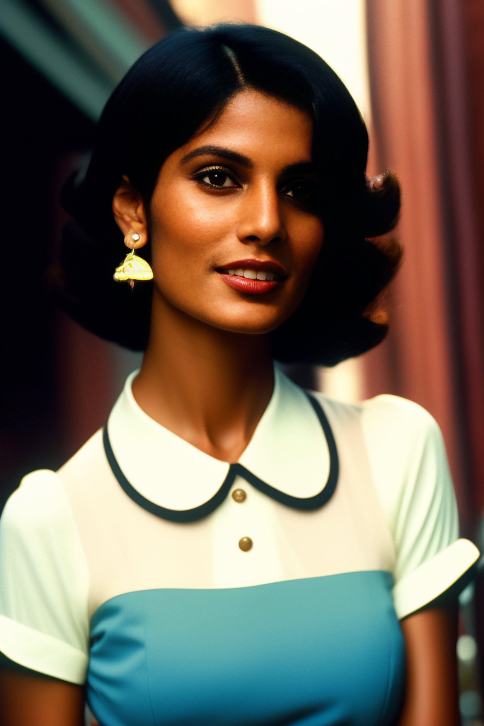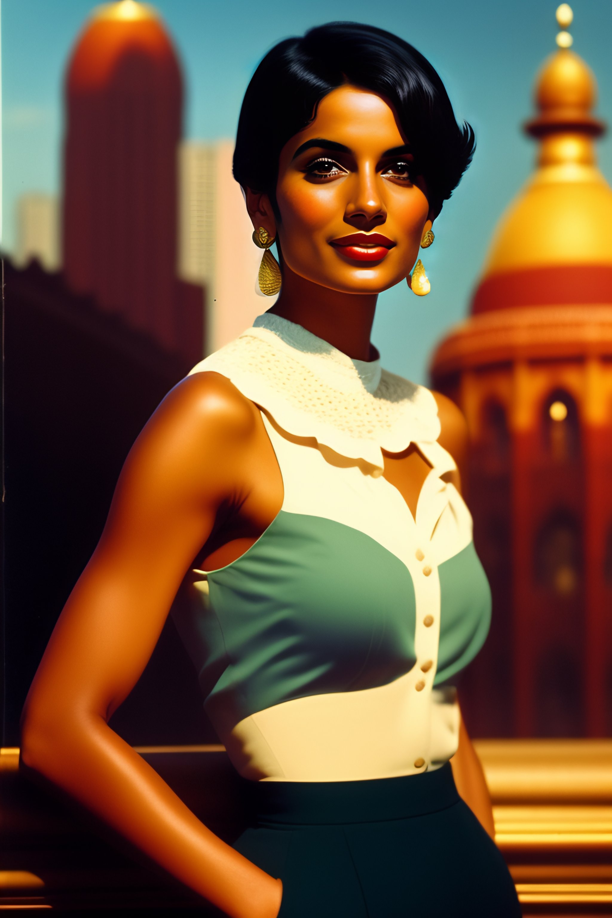 Anglo-indian woman in early 30s, short black straight hair, like taylor swift, full body, no makeup, short hoop earrings, skyline in the background, wearing blouse with sweetheart neck and peter pan collar, high heels, full length, head band