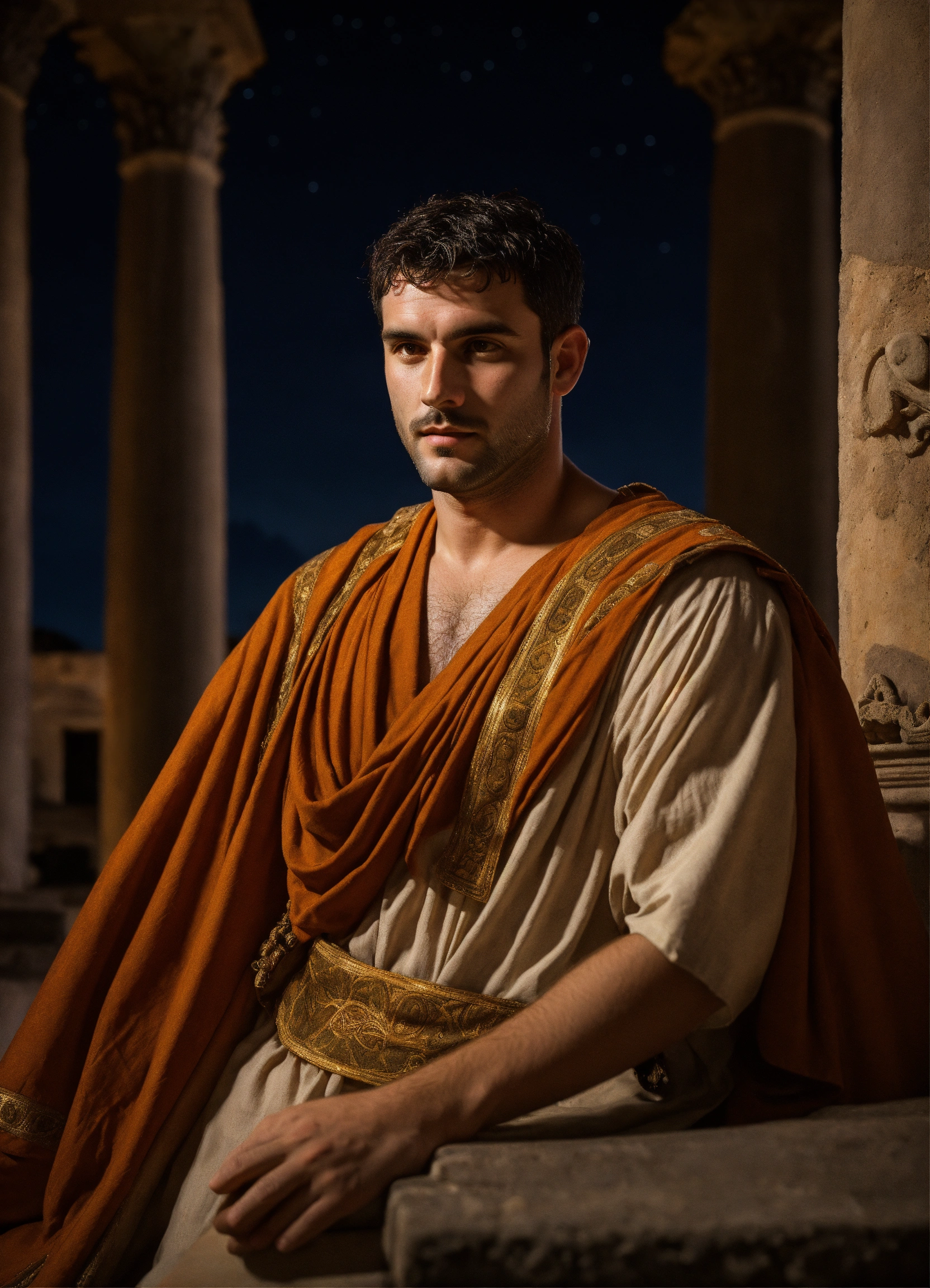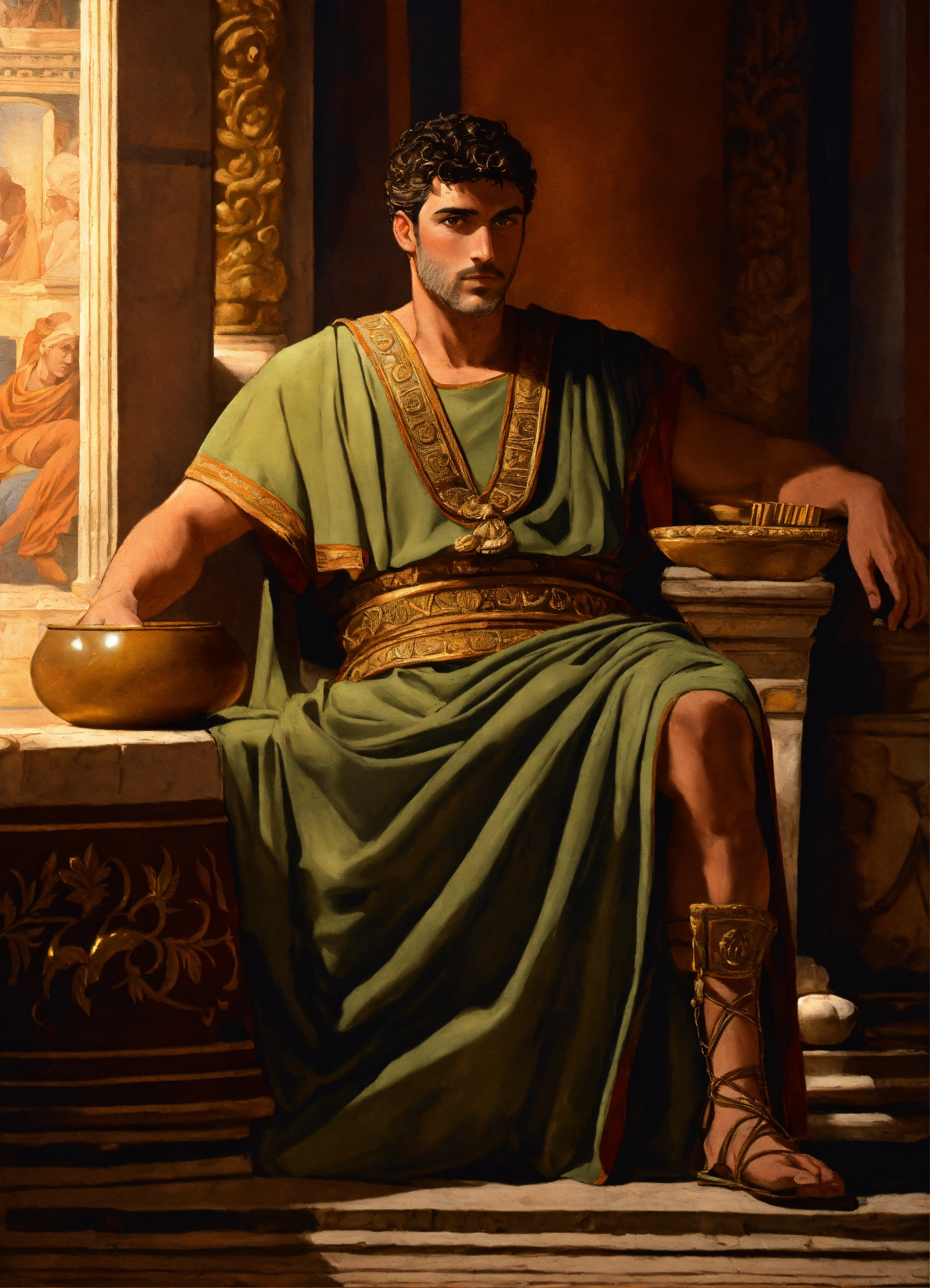 A rich roman tribune wearing a rich roman tunic, 30 years old, beardless, shaved face, close shave, dark-haired, charismatic, ancient rome, relaxing in his rich pompeian villa, pompei, detailed decor, at night, in the art of zeilyan, hyperdetailed, 8k