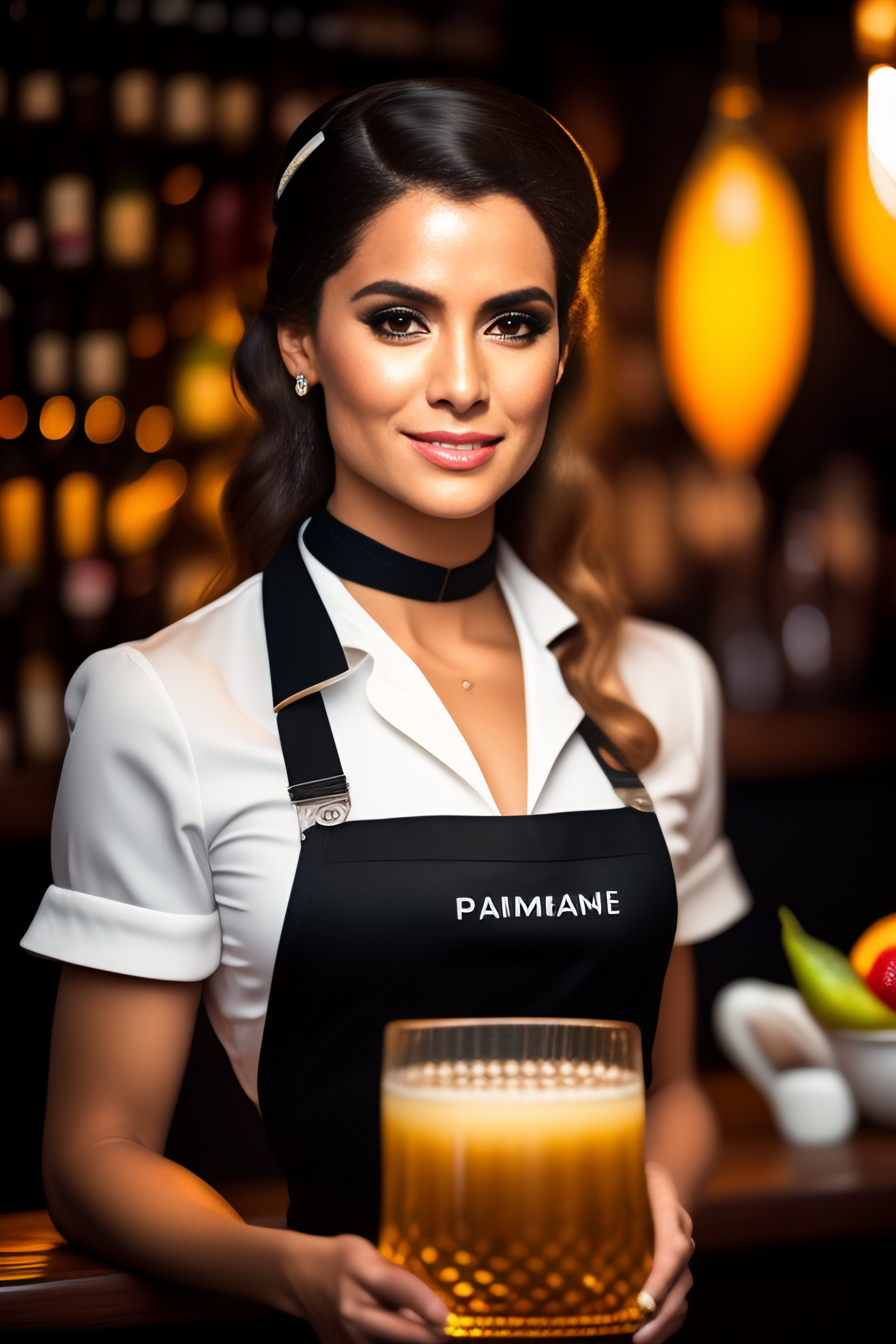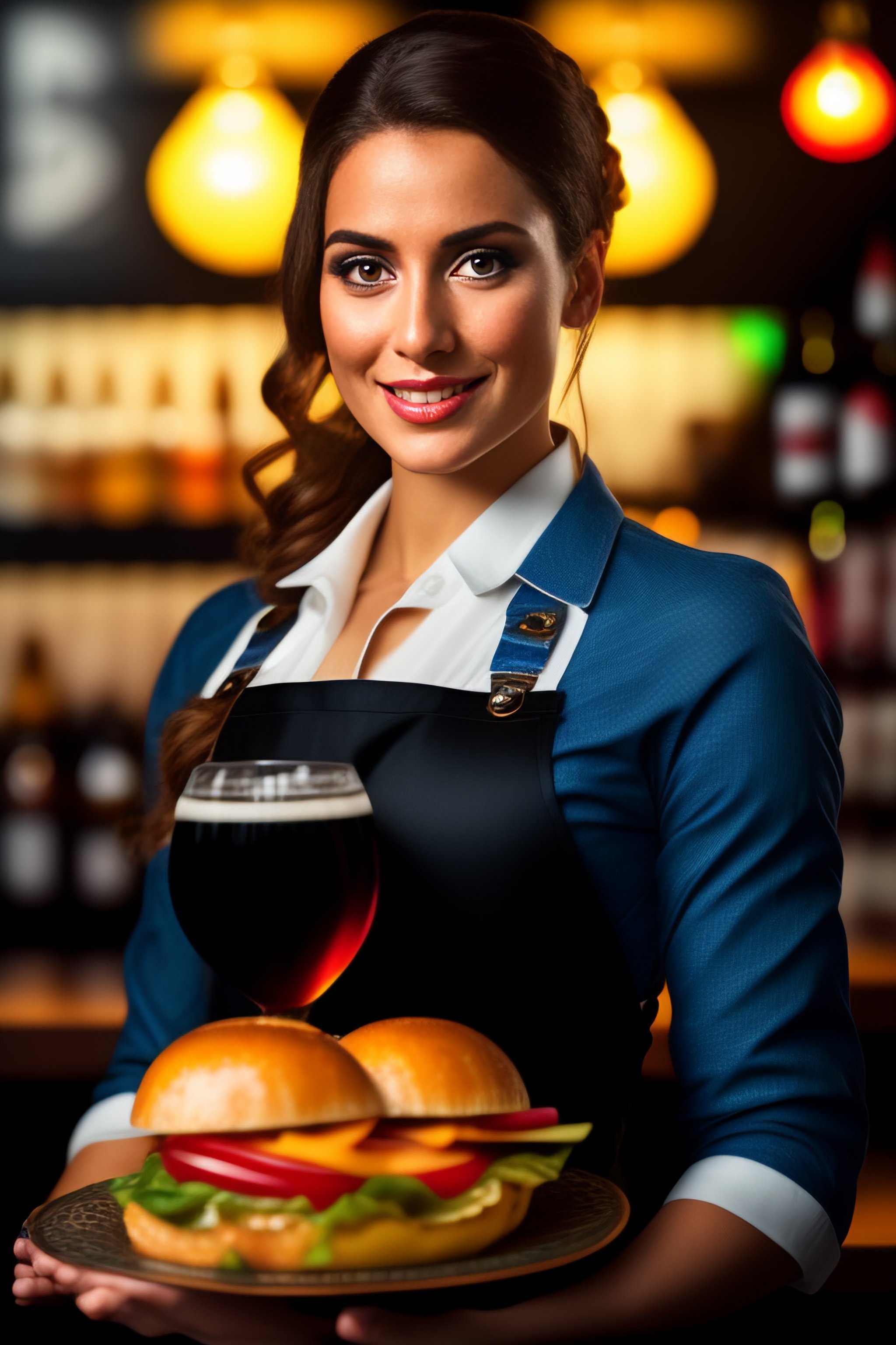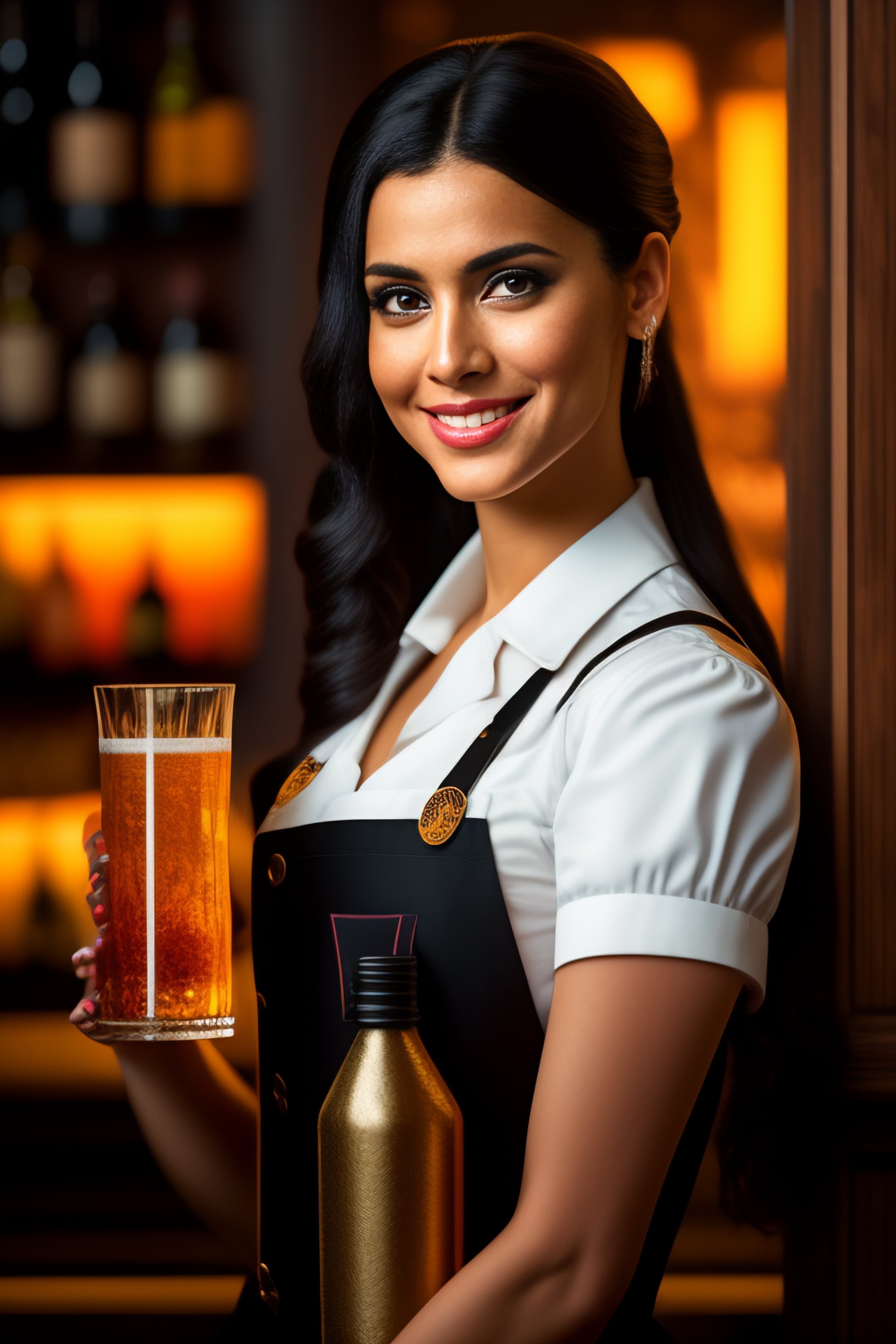 Portrait of a young woman waitress wearing black overalls inside a lush restaurant with lots of soft drinks, she is holding a bundle of champaine