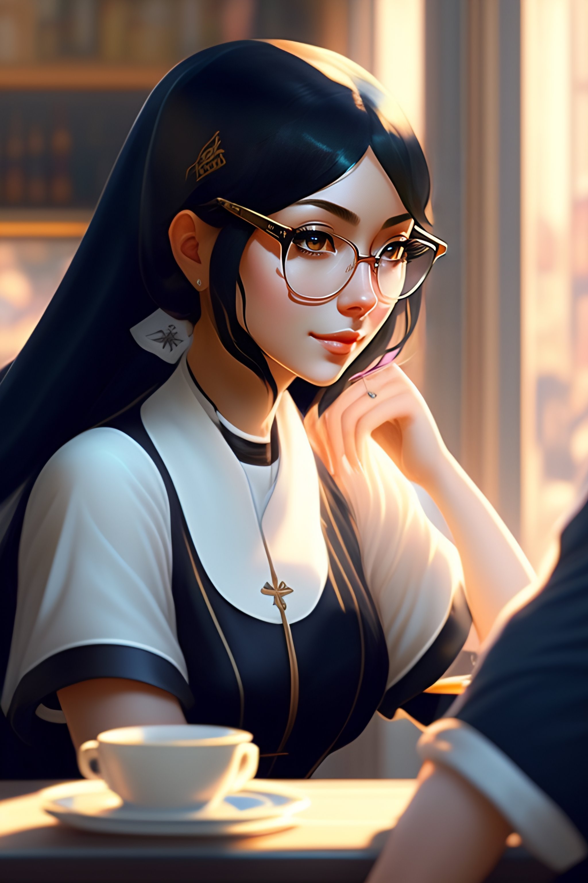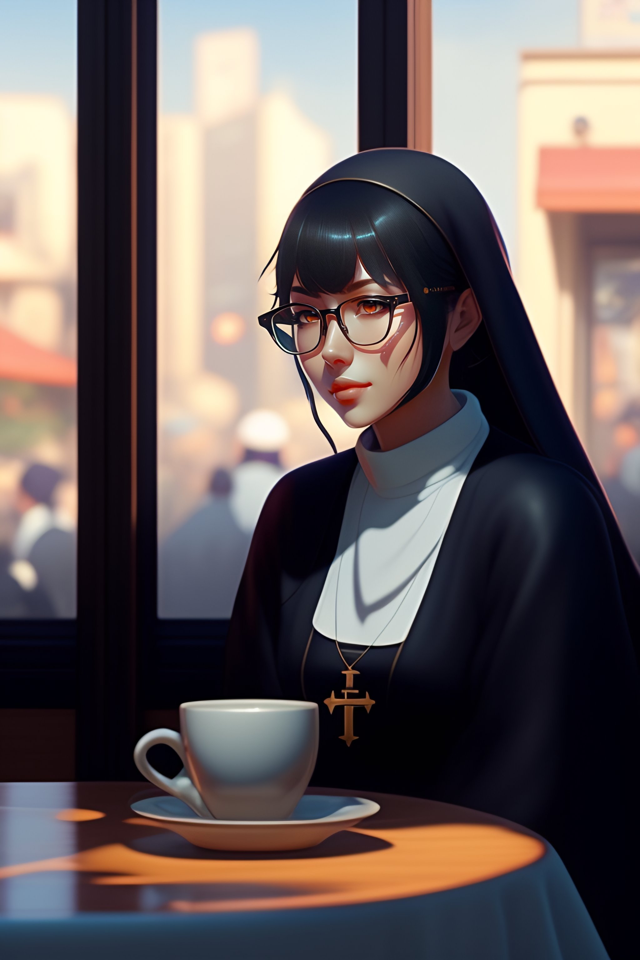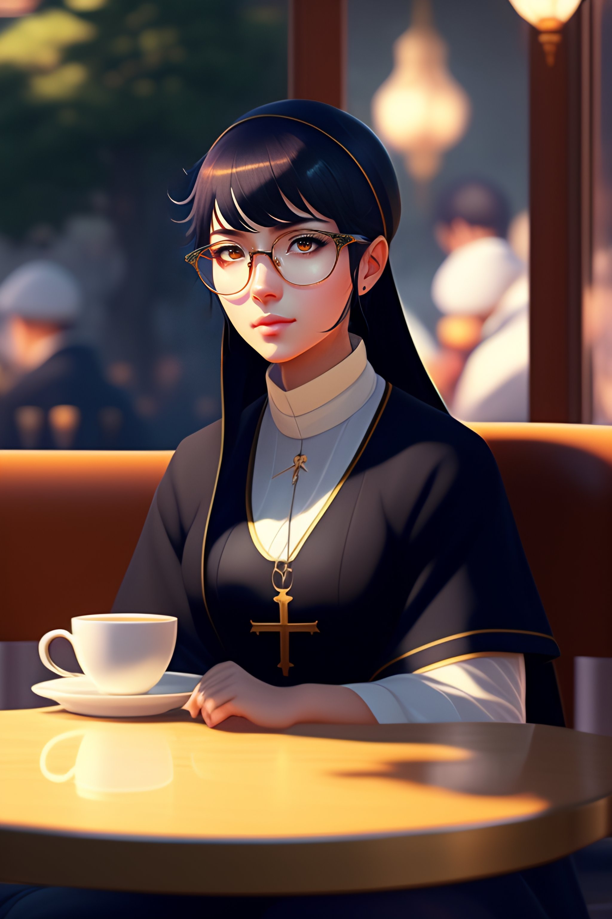 Cute nun black hair black wayfarer glasses sitting inside cafe drinking coffee with background by greg rutkowski makoto shinkai kyoto animation key art feminine mid shot