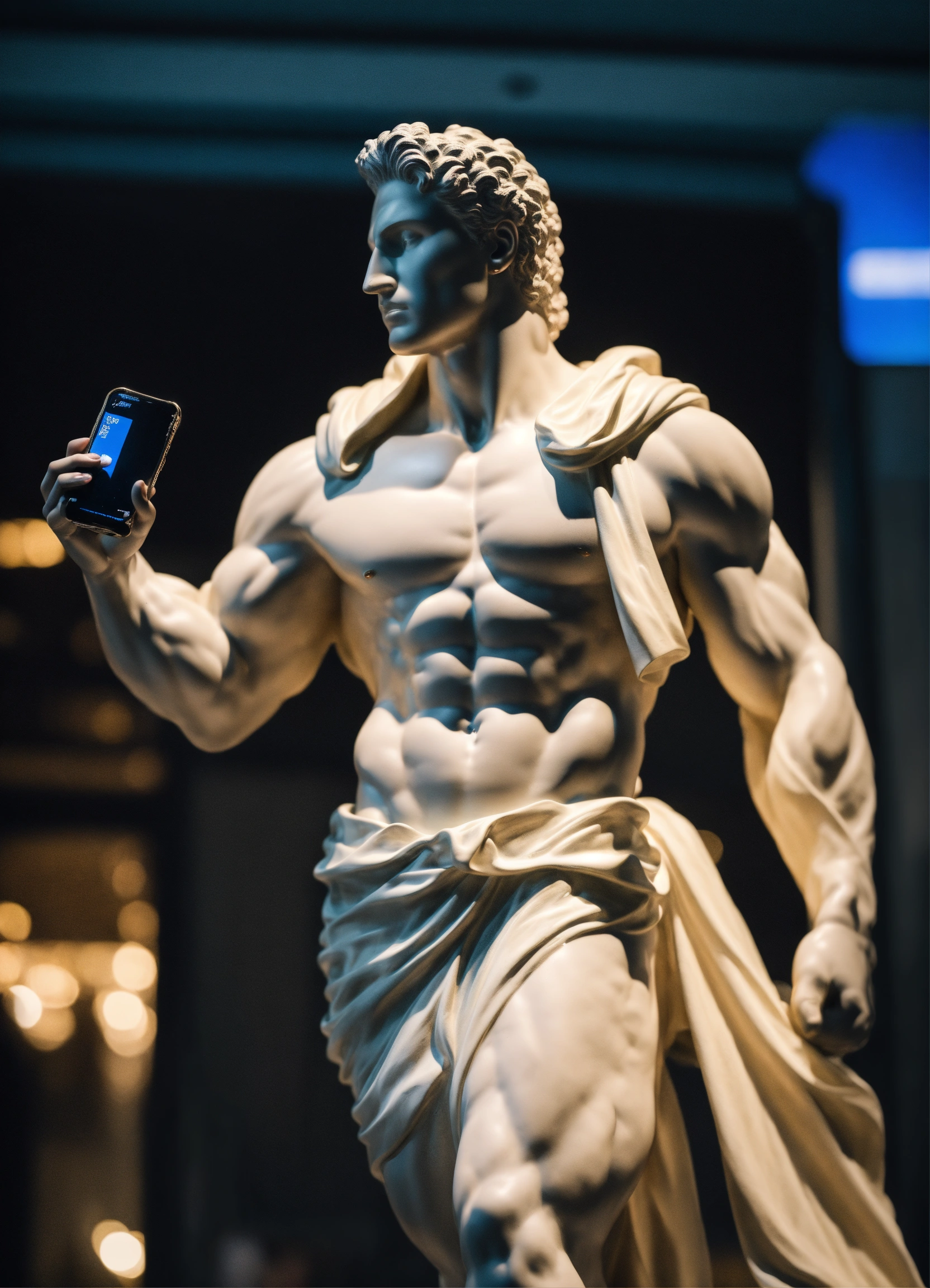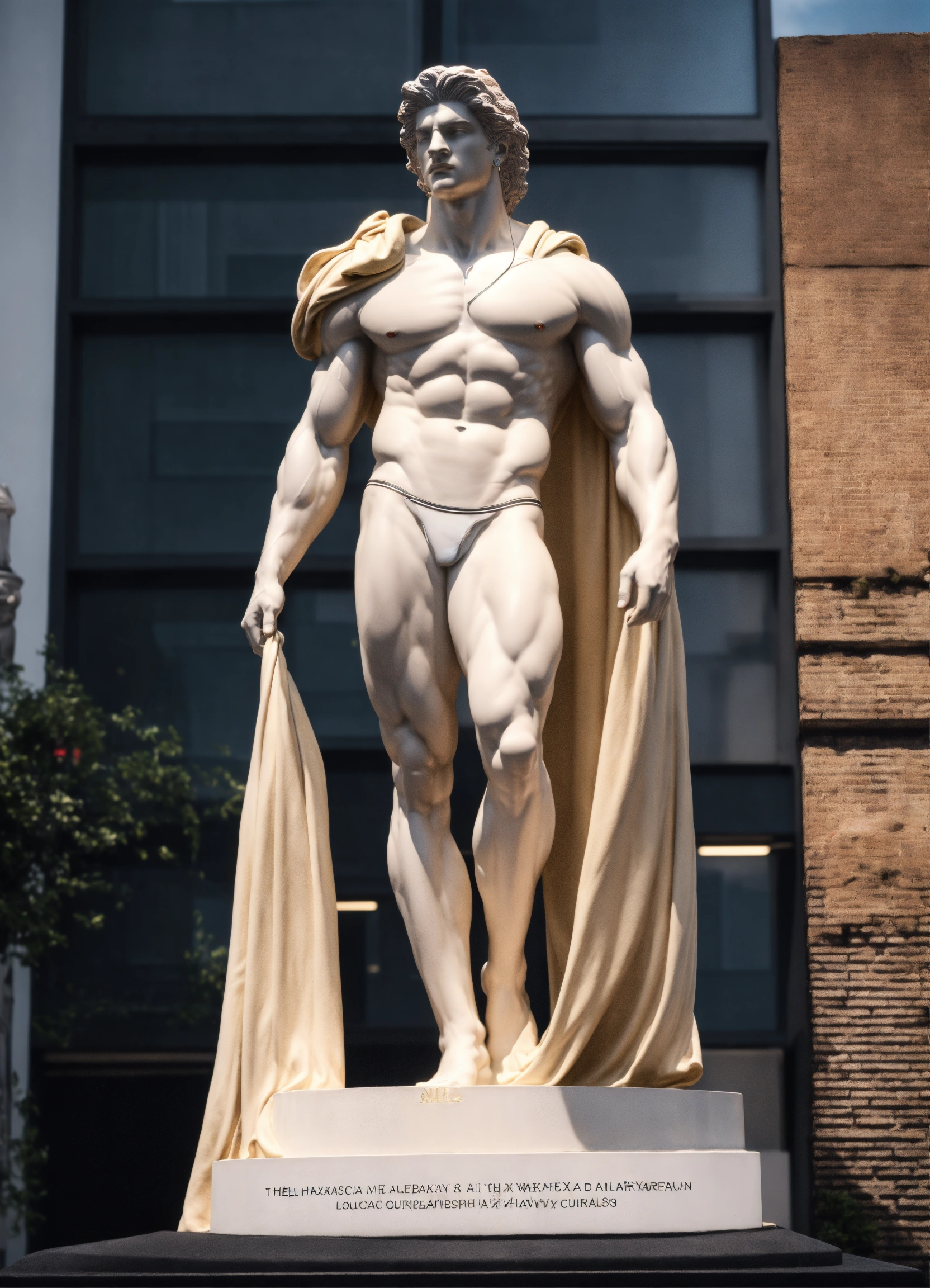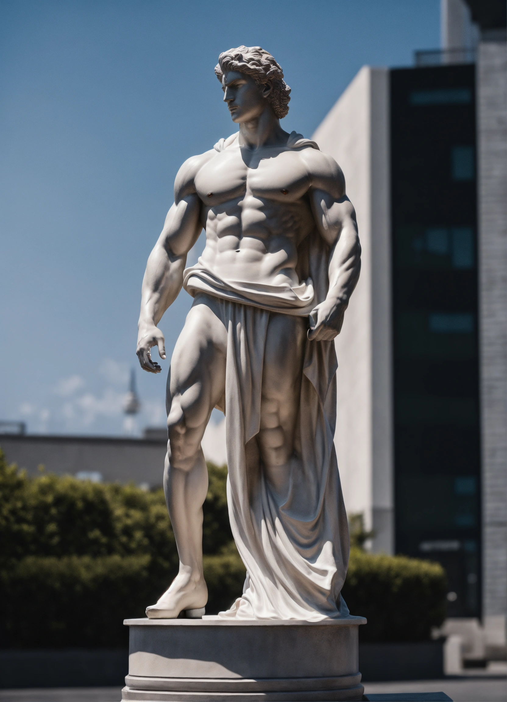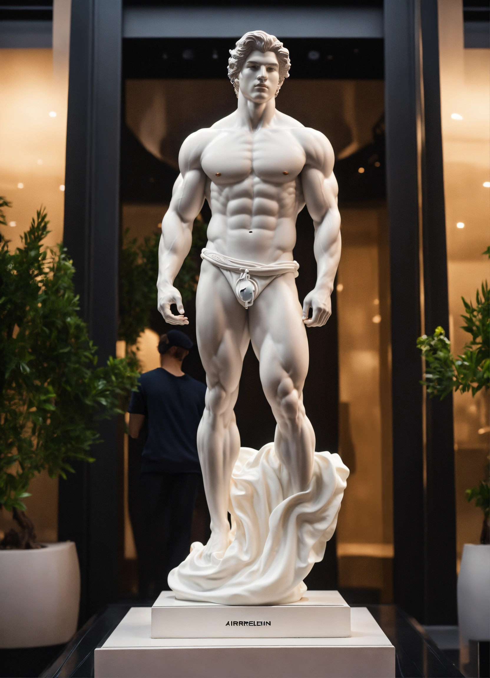 A statue from a muscular greek god statue with a wavey middel parting hair with white color on his body with a black backround standing on a podest 8k wearing airpods max and a black hoddie standing next to a lamborghini
