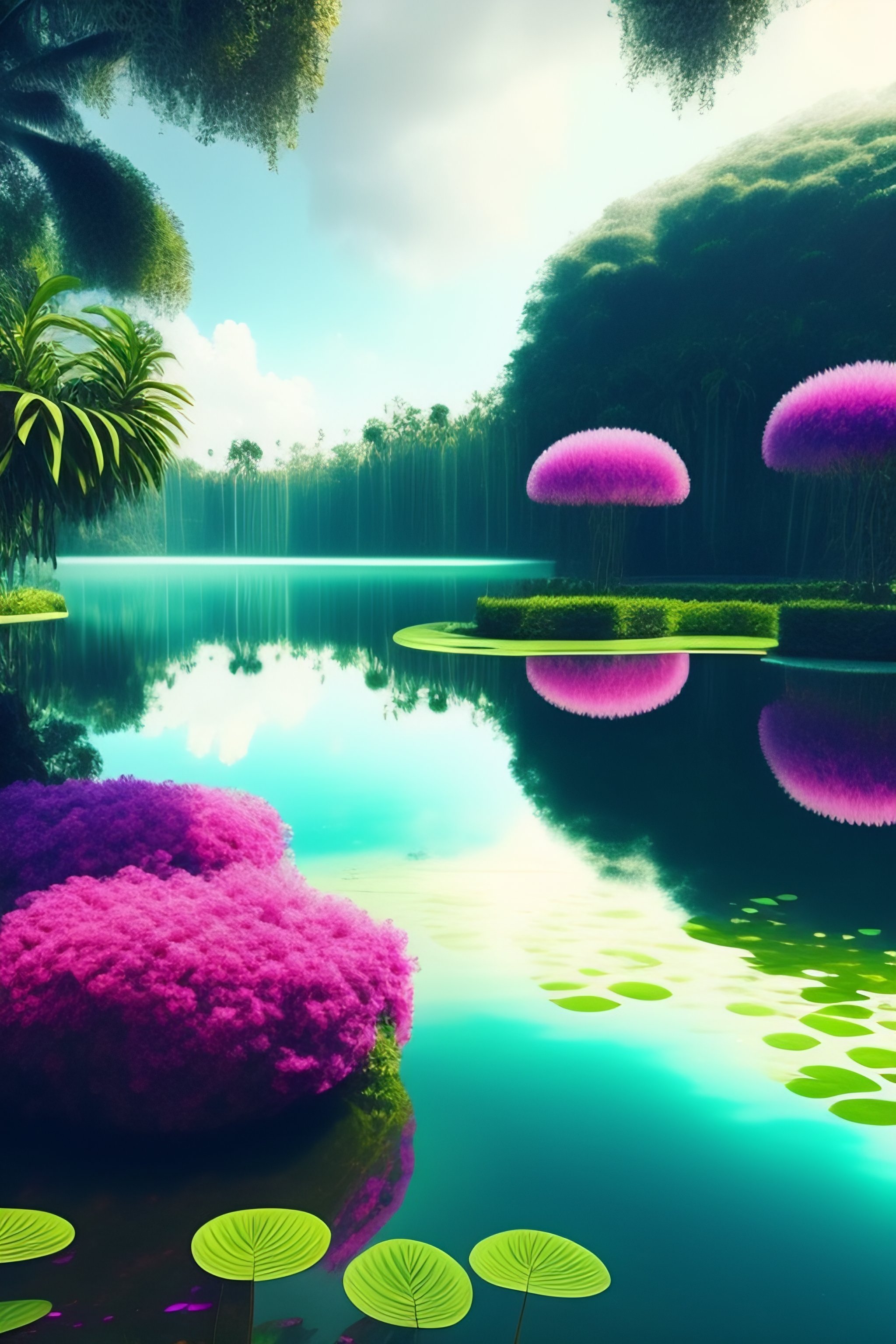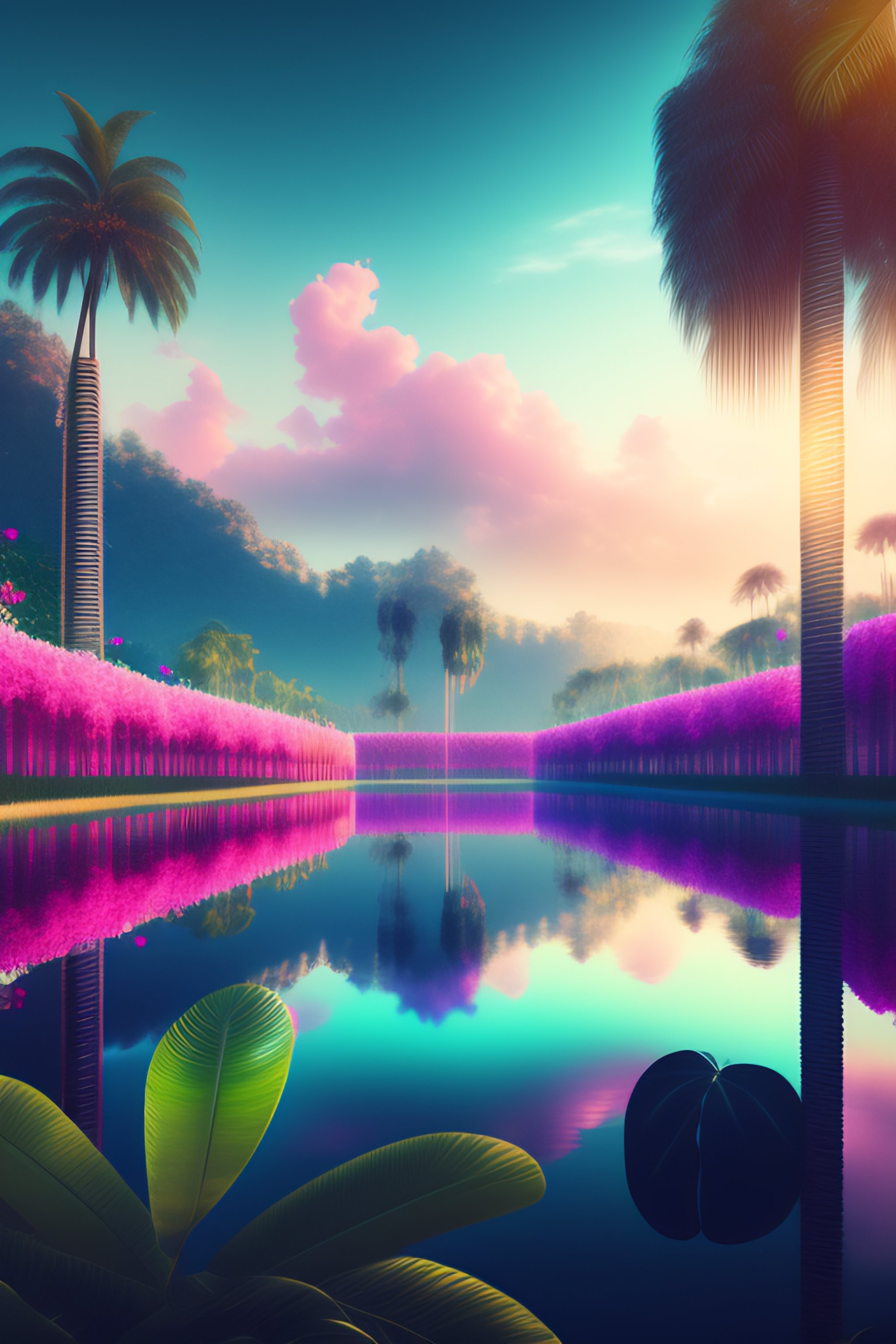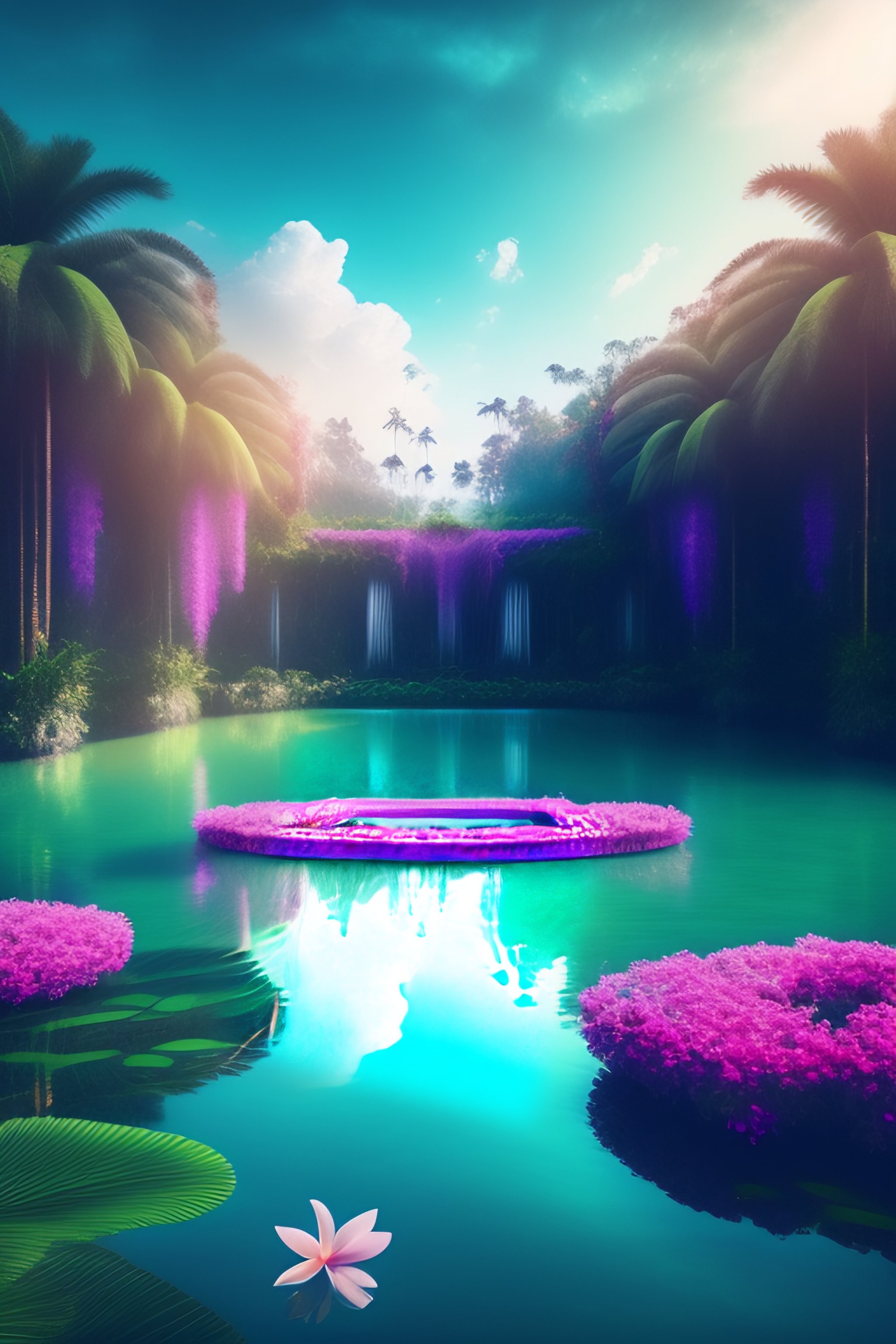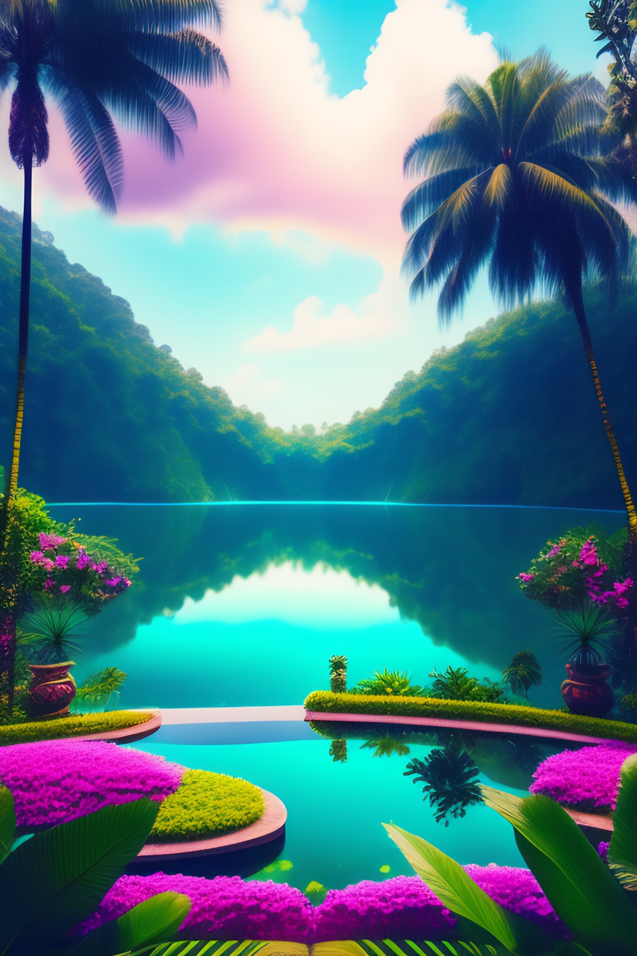 Infinity glass clear lake surrounded by rain forrest, bright cloud sky, vines, palm trees, bali indonesia, dreamy garden, digital matte, hyperrealistic surrealism, epic stunning, a surreal liminal space, highly detailed, calming, meditative, pink arches, flowing silk sheets, palm trees, dreamscape, dali, bosch, https://lexica.art/prompt/0922a38c-7be6-4360-a0b5-a977f0c84c9e