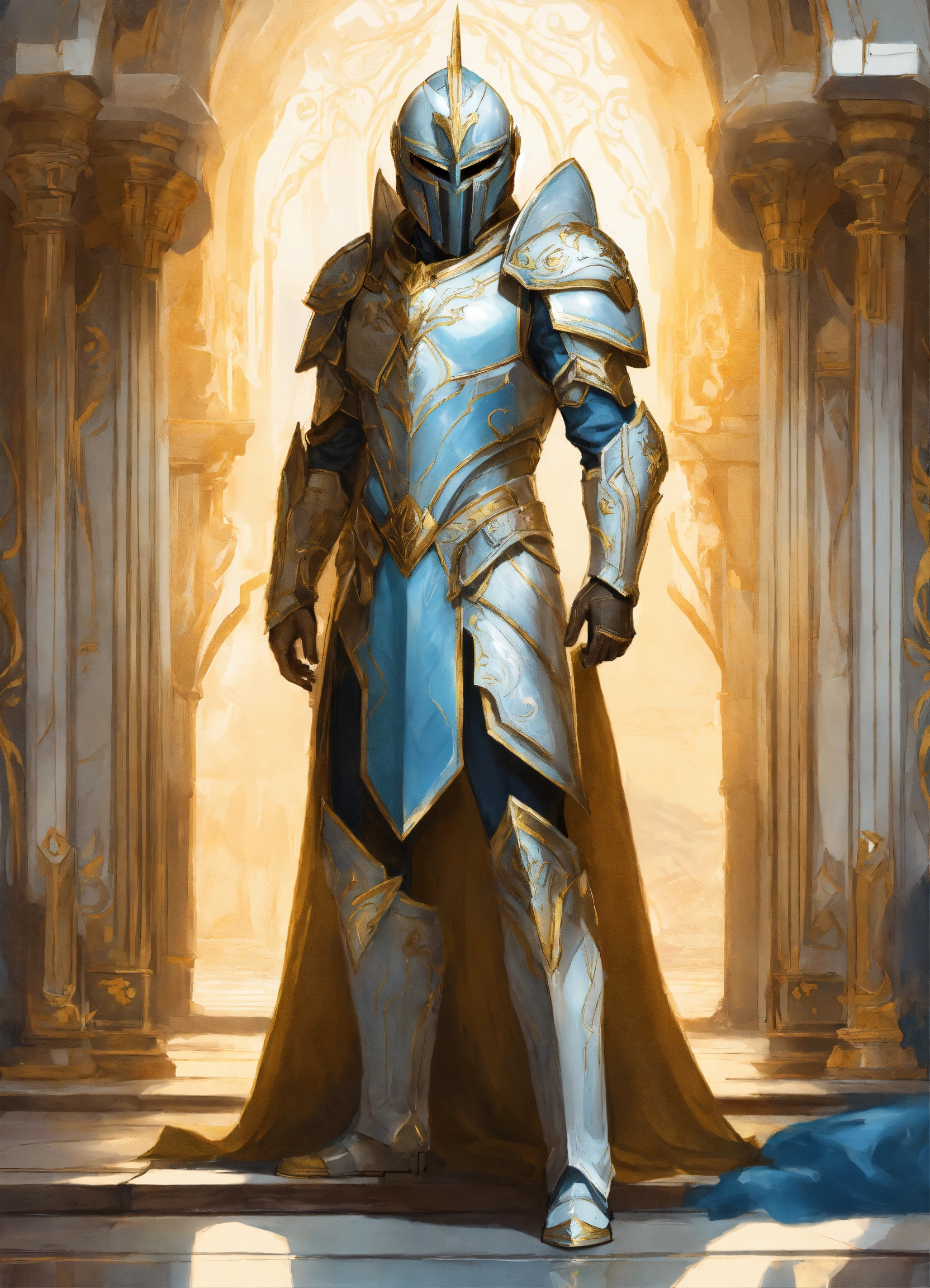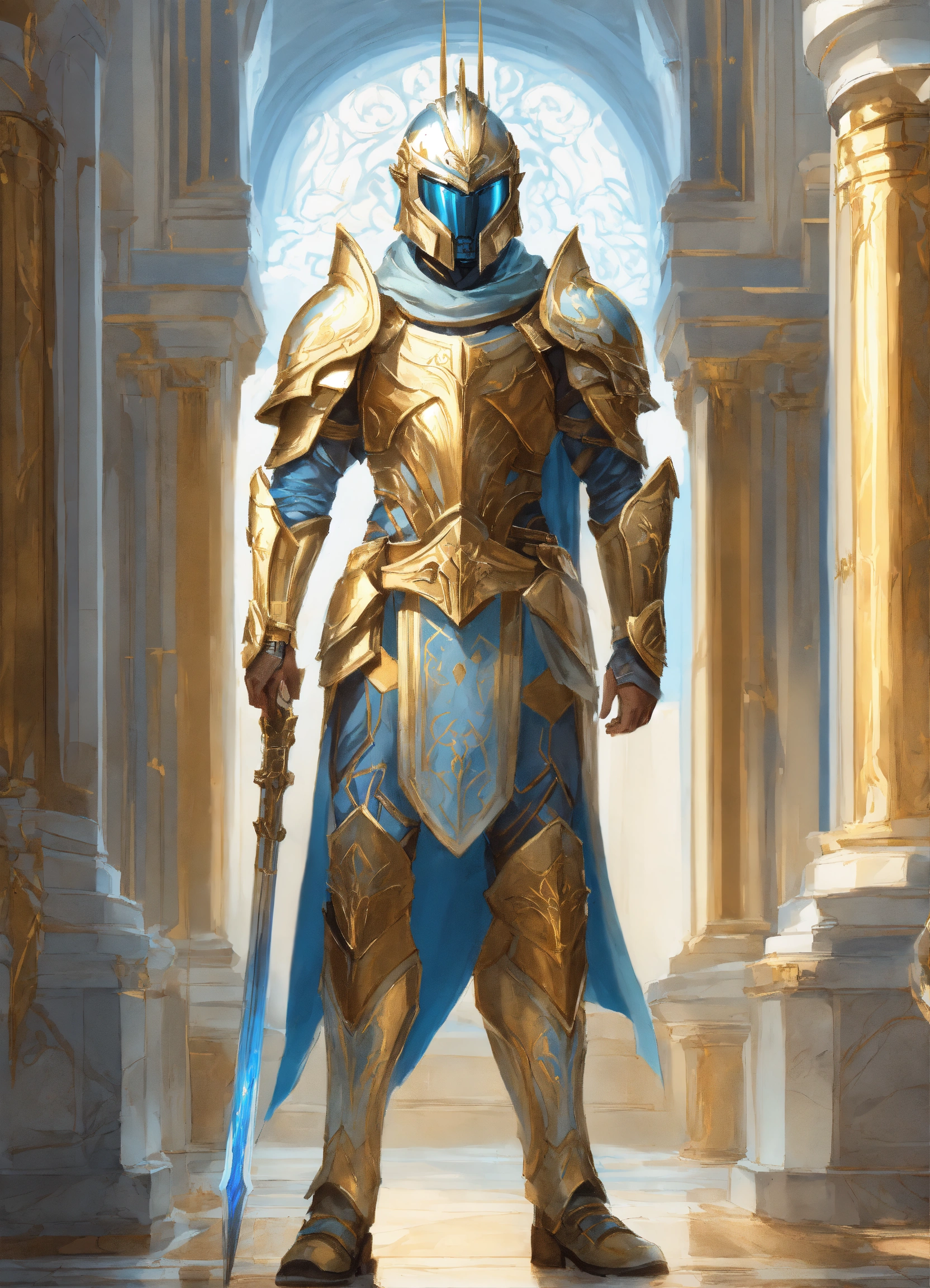 Epic drawing of a full body of a high elf sci fi soldier wearing sci fi armor and helmet, spartan style mask, white and light blue and gold armor armor, boots, male, standing in an an elegant marble elven palace
