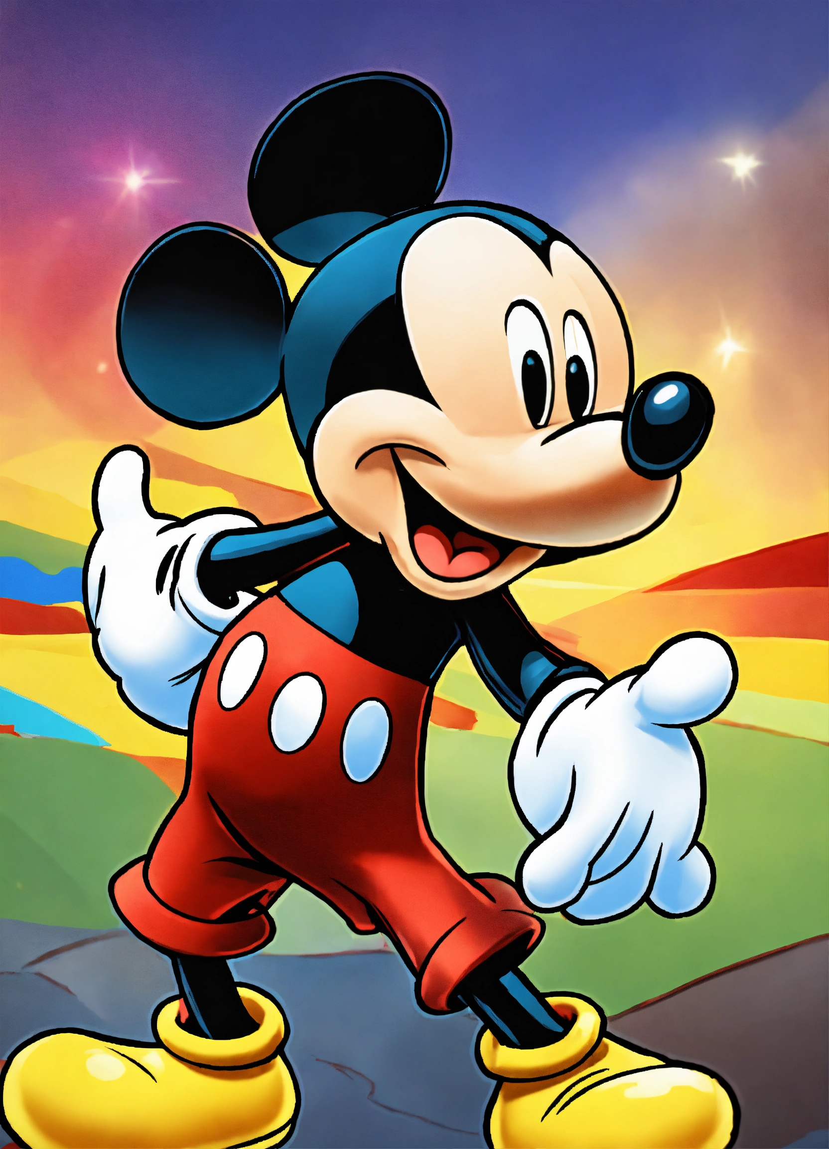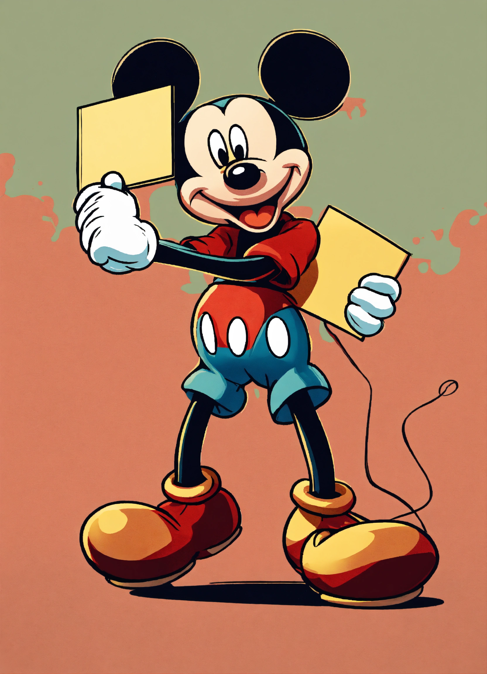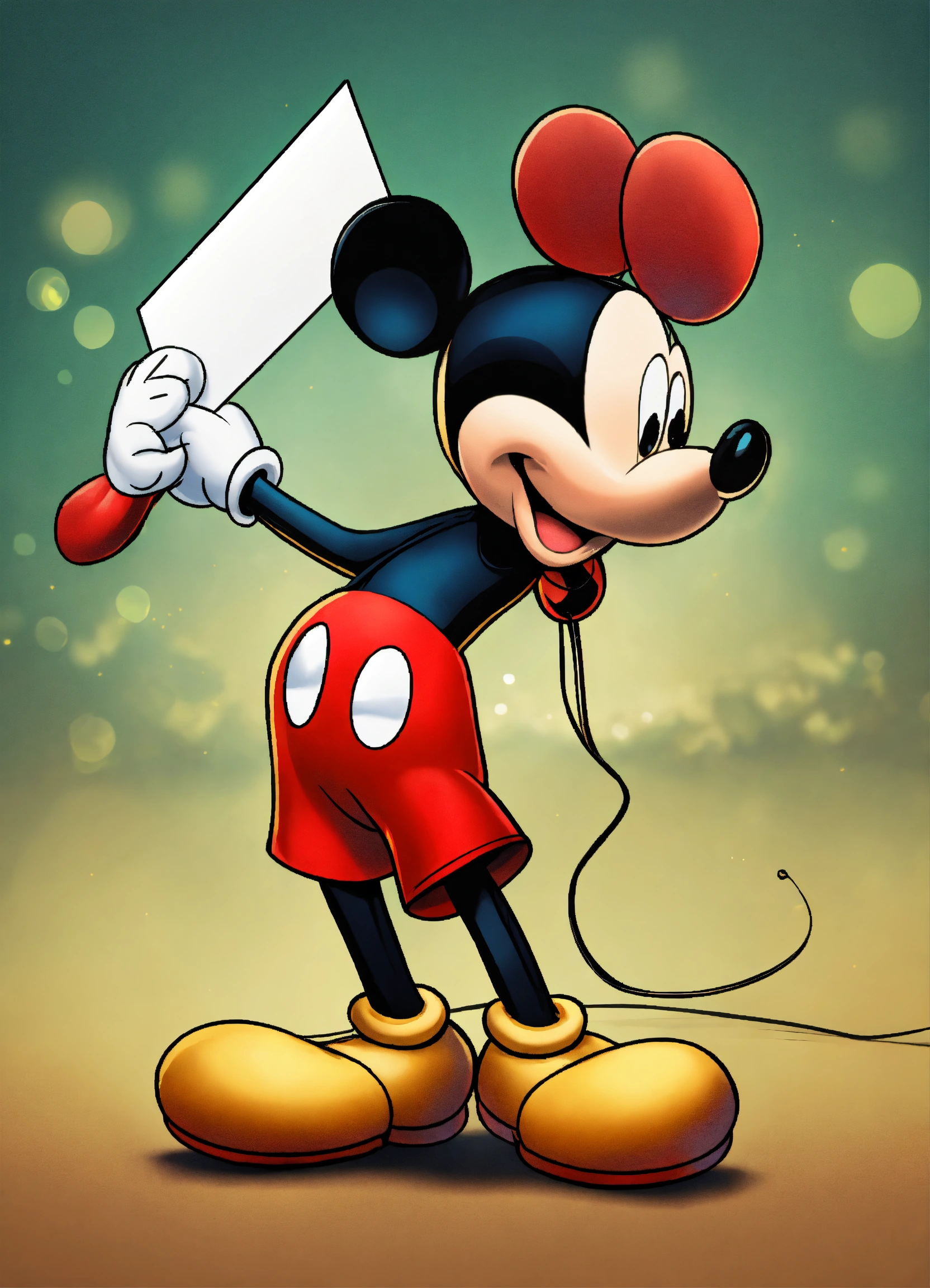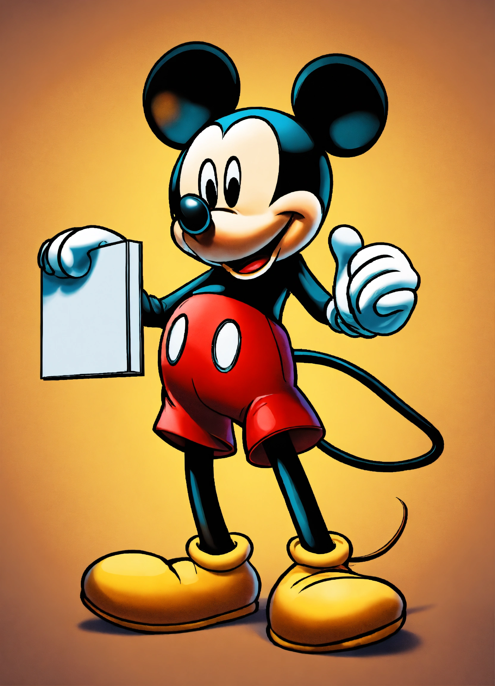 2d mickey mouse holding a sign in his hands, 8 k, high detail. full length. background colored colors simple
