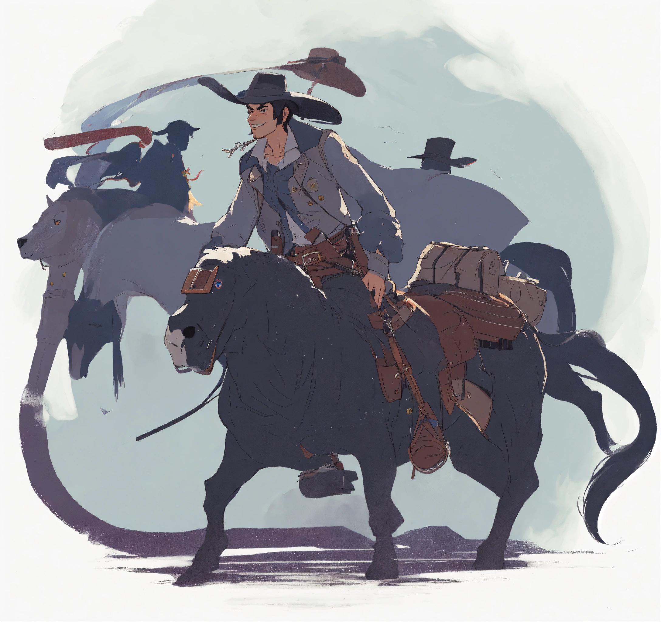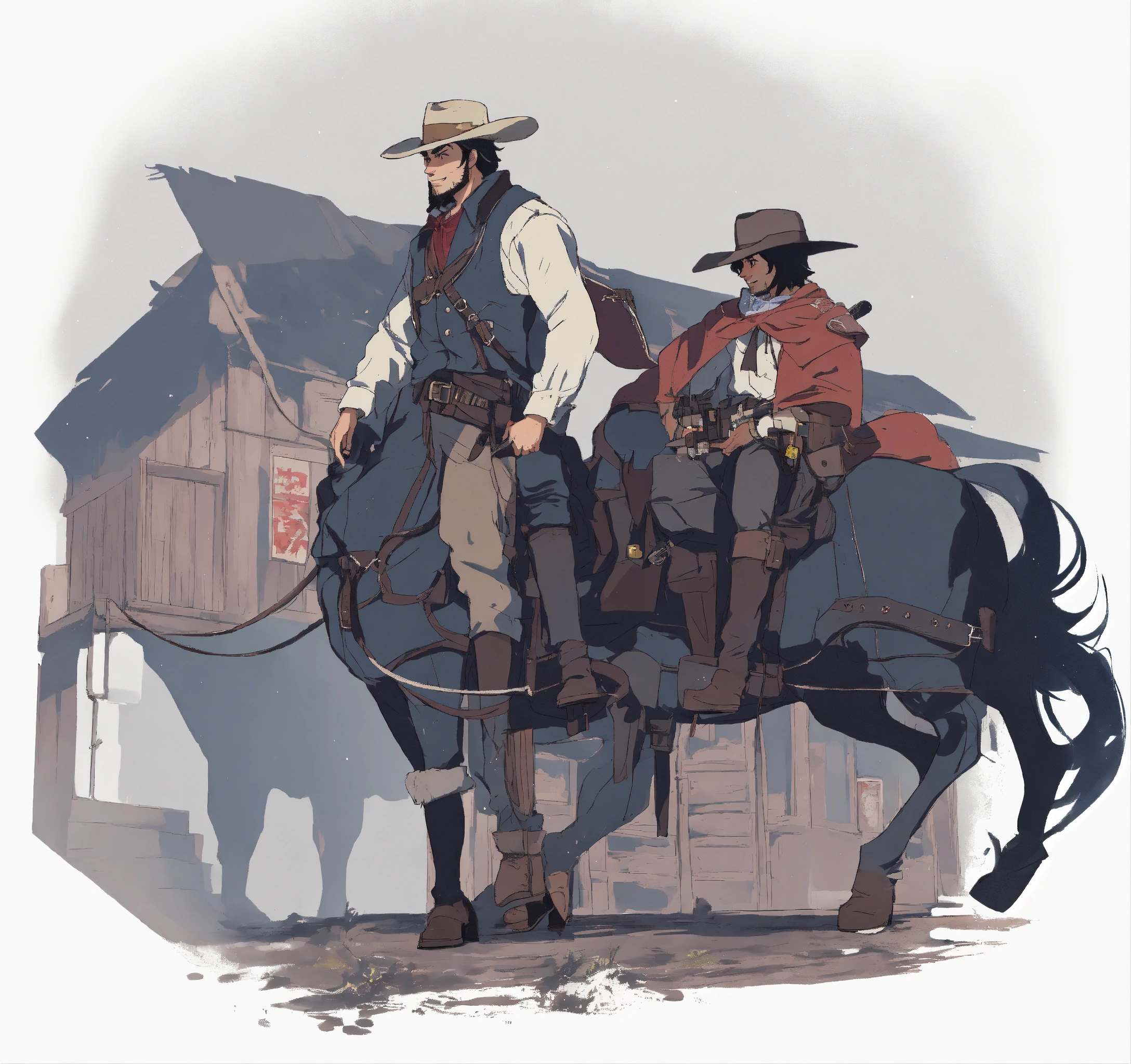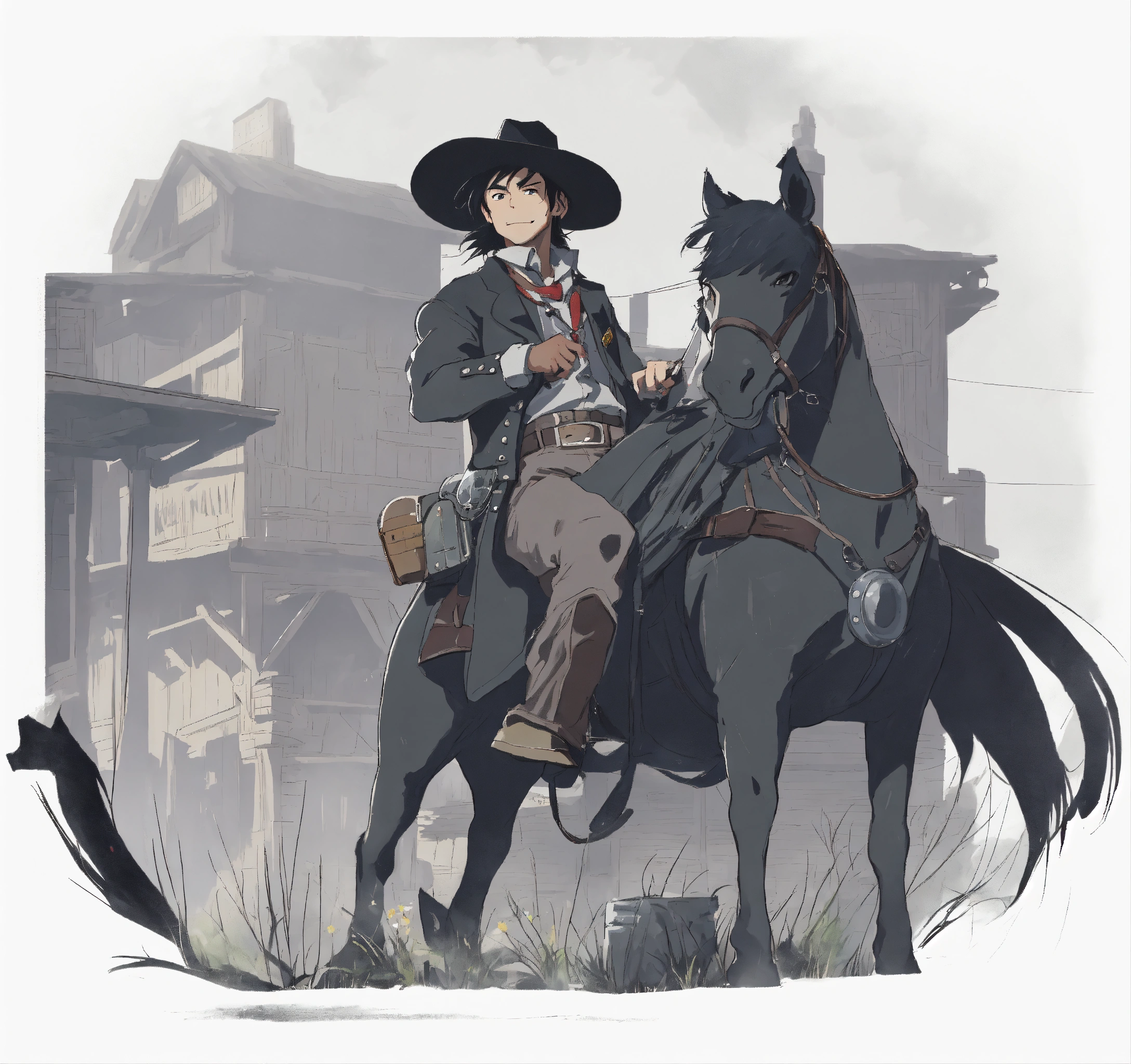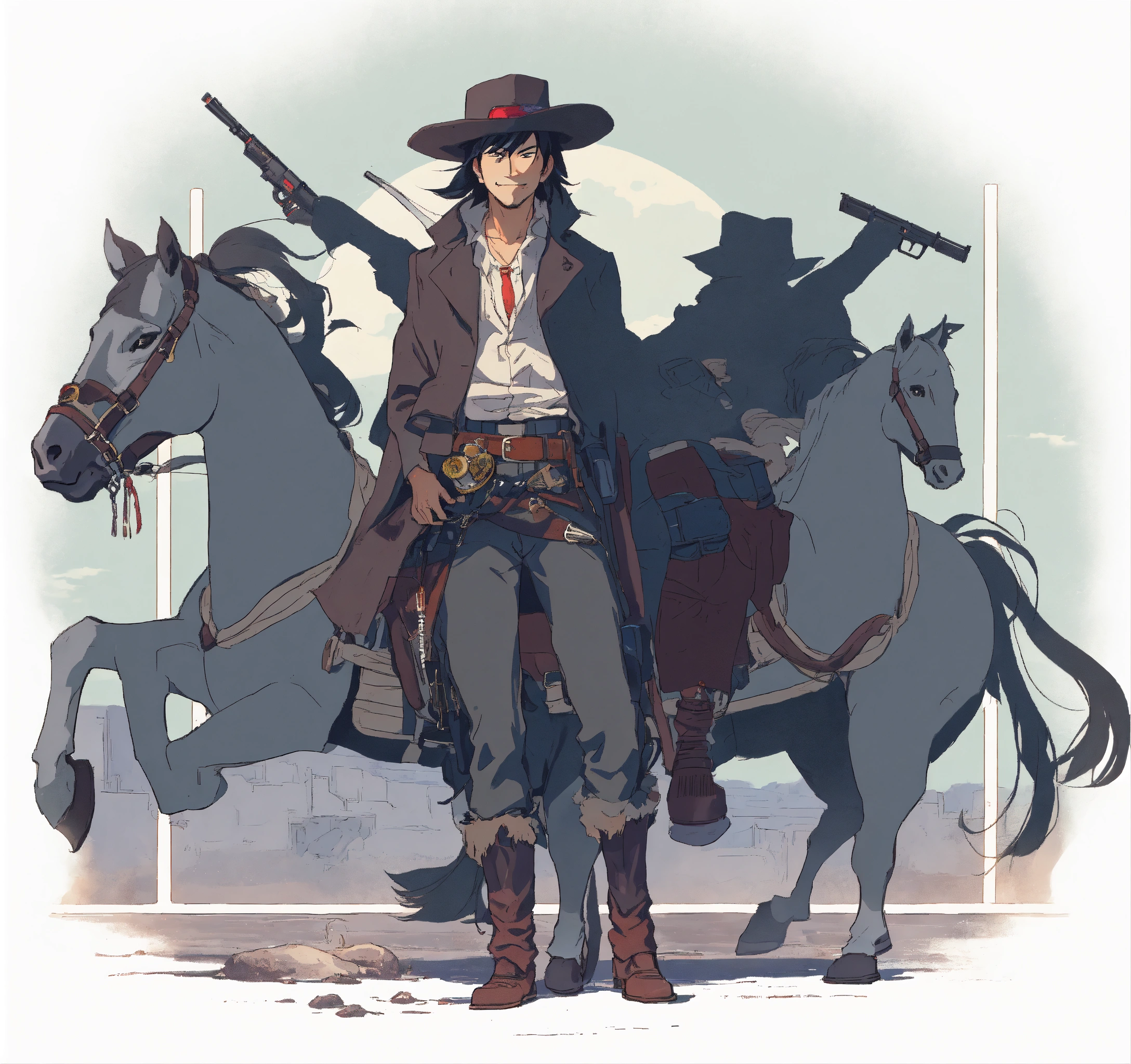 Wild west gunslinger, male, wild west outlaw, portrait, studio ghibli, akira toriyama, james gilleard, trending pixiv fanboxe, 4k, the style of 90's vintage anime, black hair, smirking