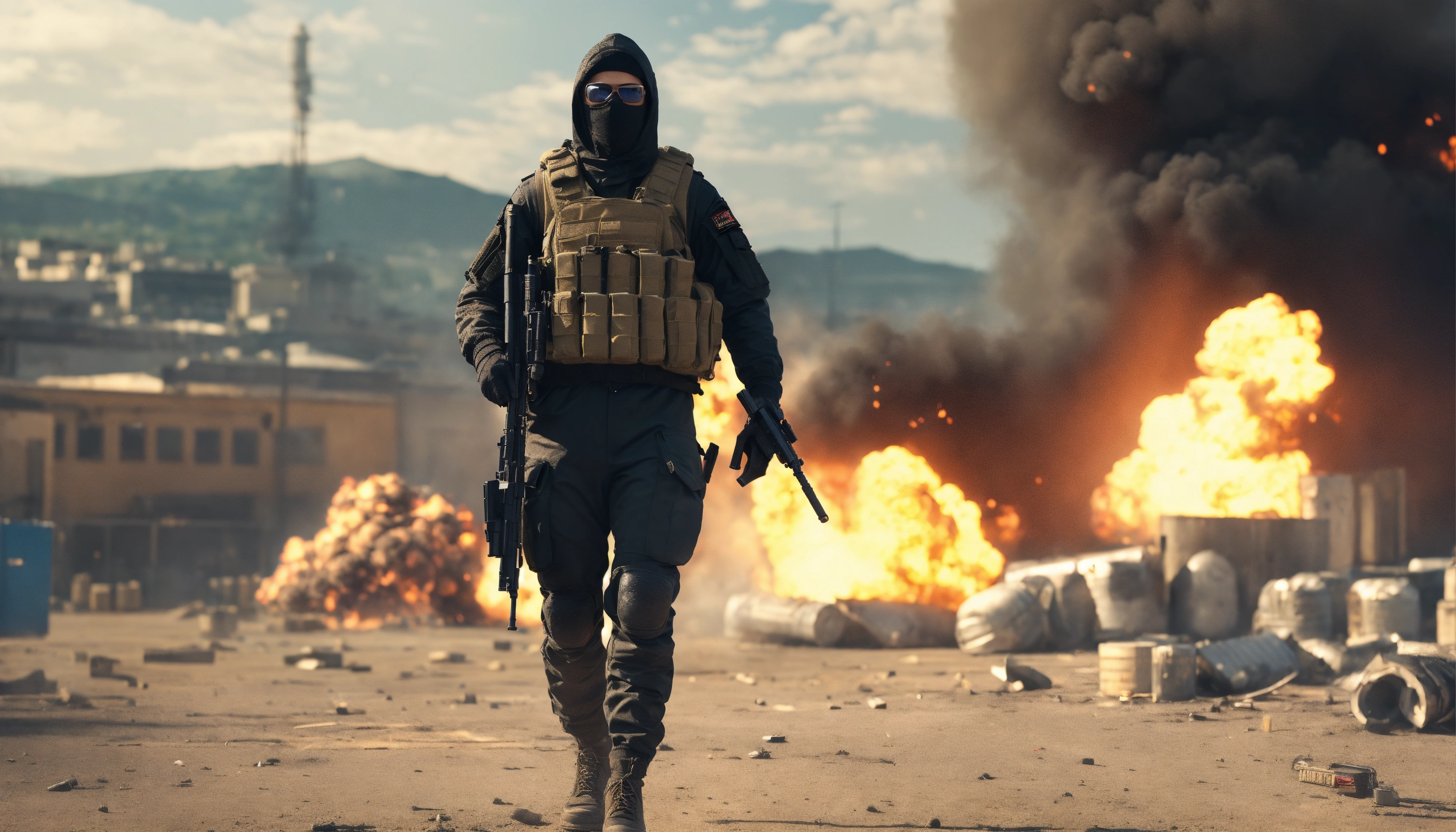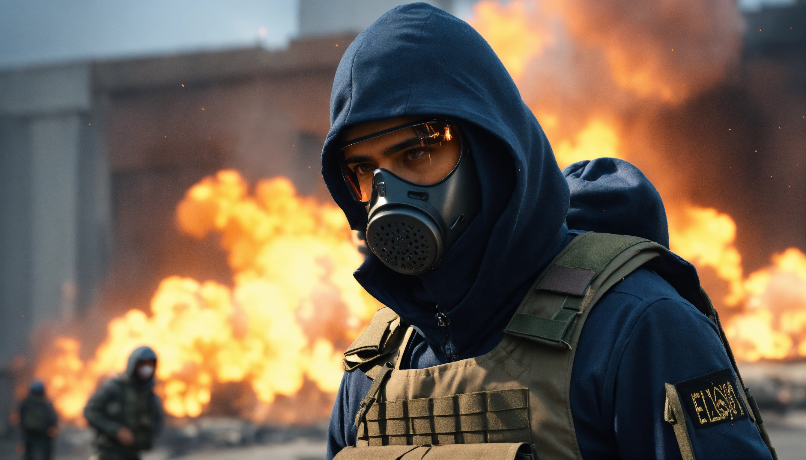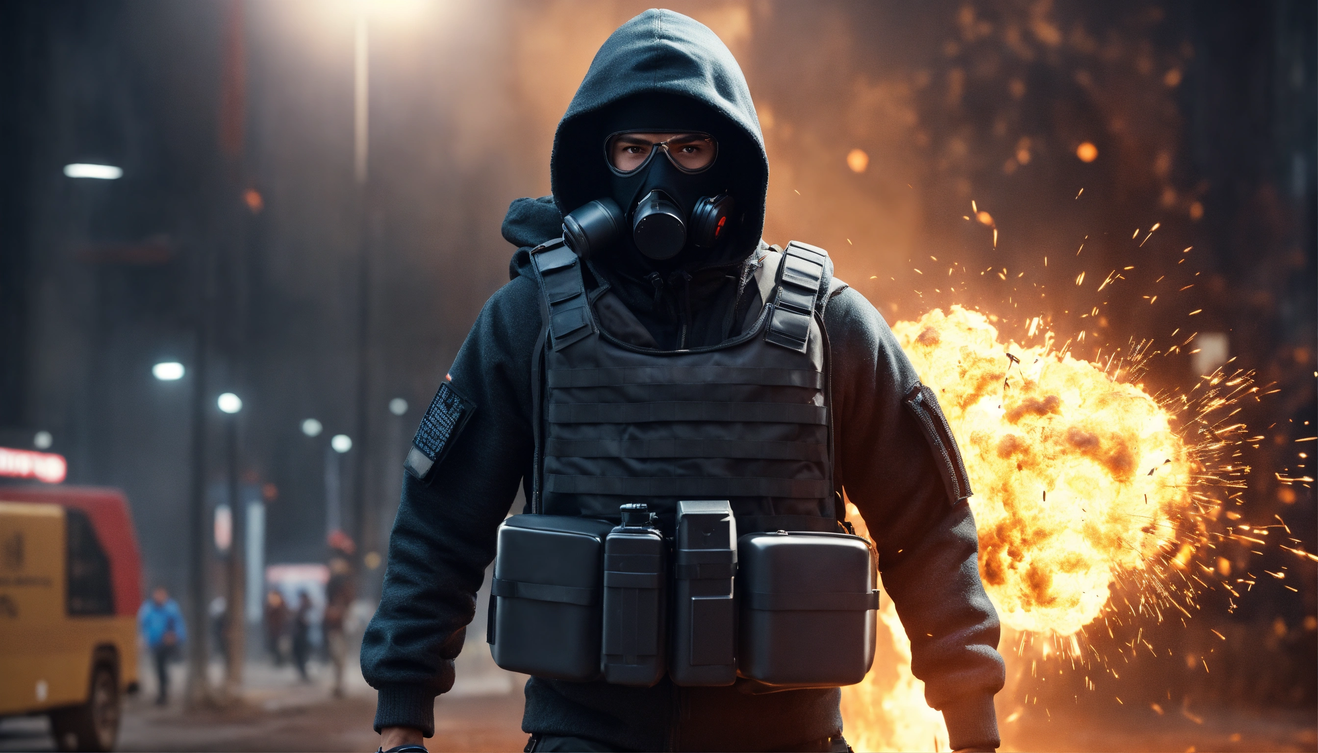 Full length male terrorist ready for terrorist attack. strapped with bunch of dynamite bomb, explosives with tnt around body. bomber vest. man wearing hoodie, balaclava mask on face. octane render, highly detailed, lighting, professional, realistic, sharp focus, 4k, 8k, high resolution, candid, personal, bright lighting, ultra-detailed, bright lighting, photo, photography