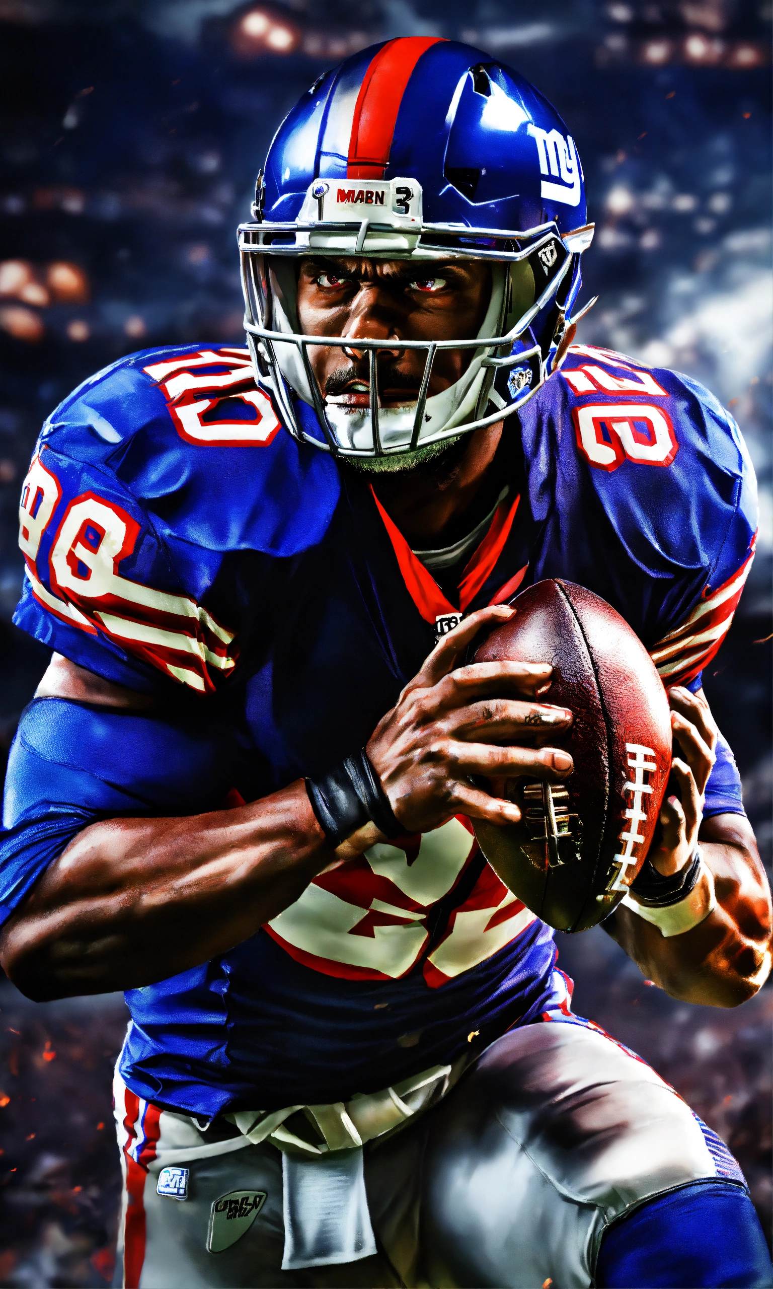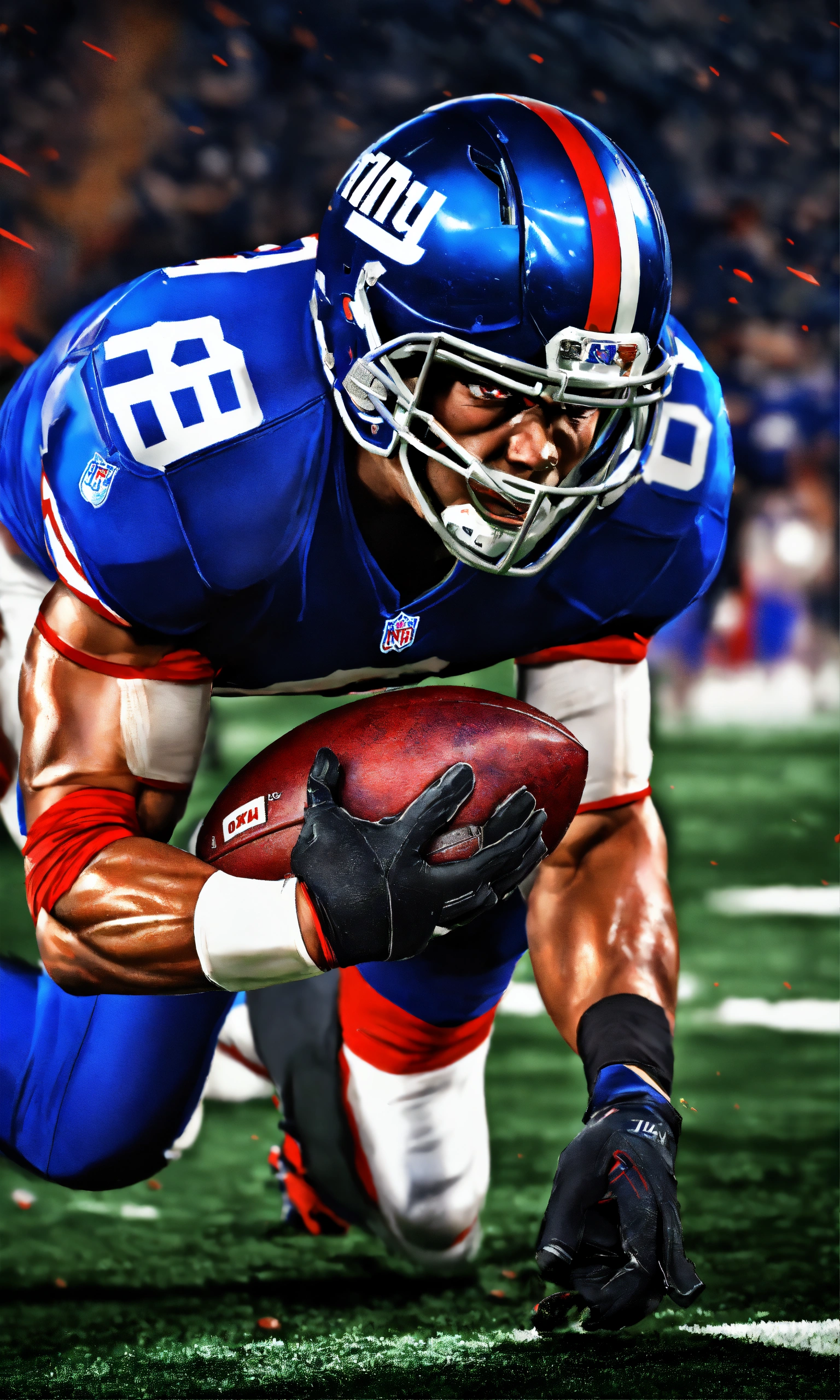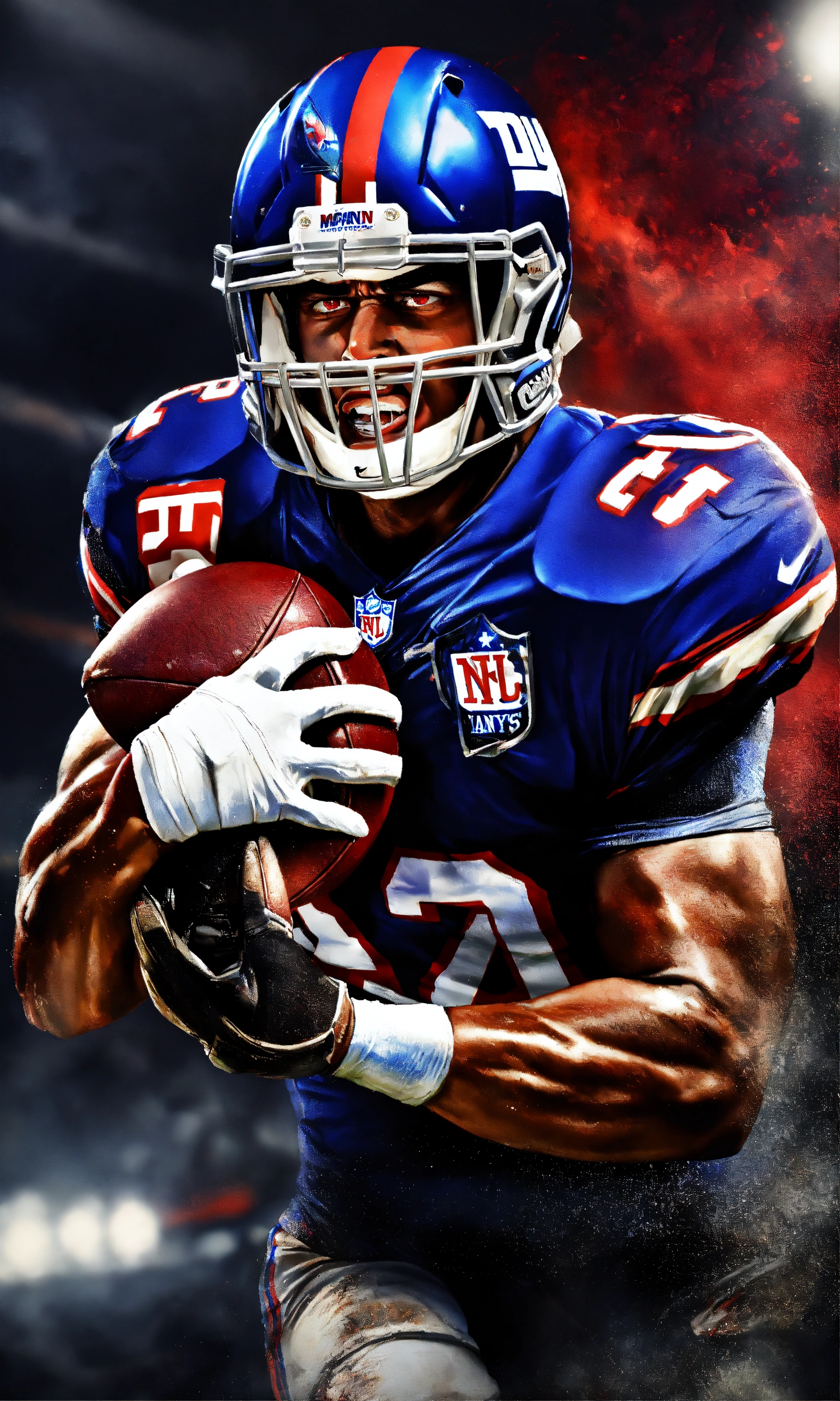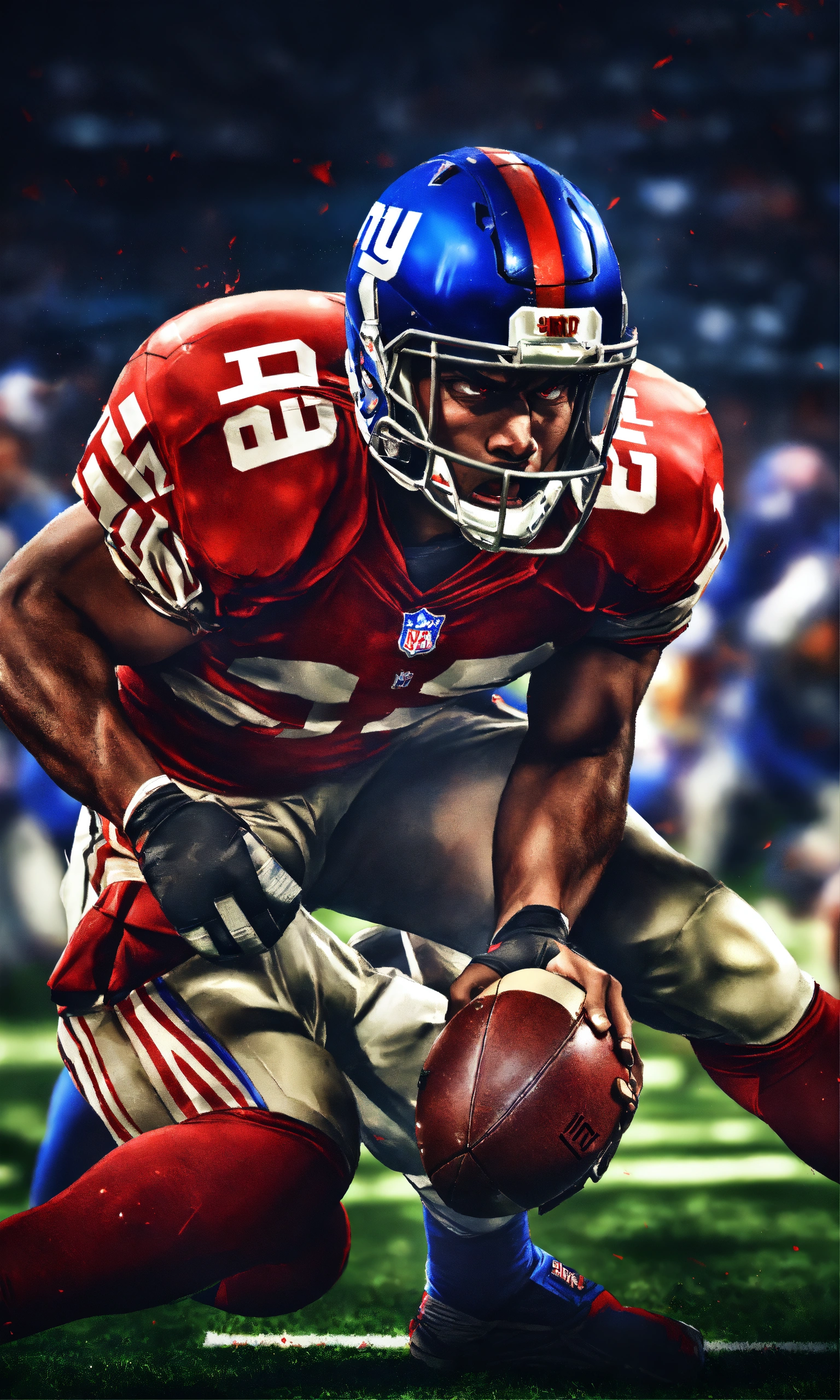 High end aggressive nfl football player, photography, dramatic lighting, hyper detailed, hyper realistic, black background, angry face, tough looking, red eyes, video game cover, nfl blitz, hyper realistic photo, in defensive position, intimidating, new york giants, madden football, facing forward, realistic, play action, catching, hungry, determined