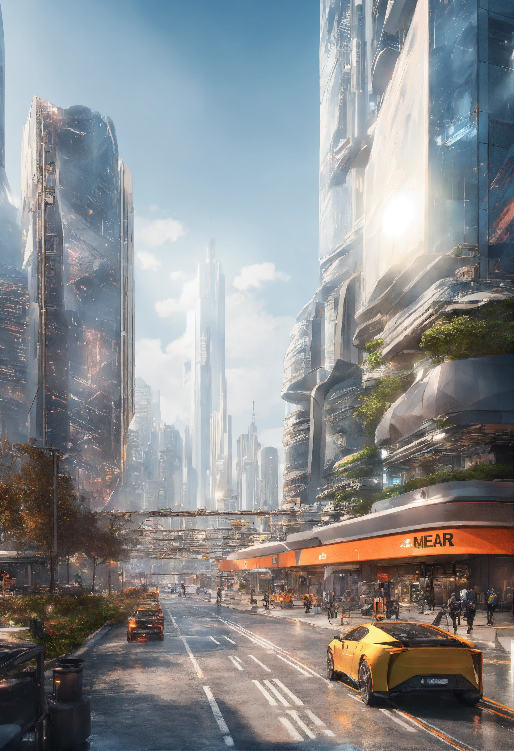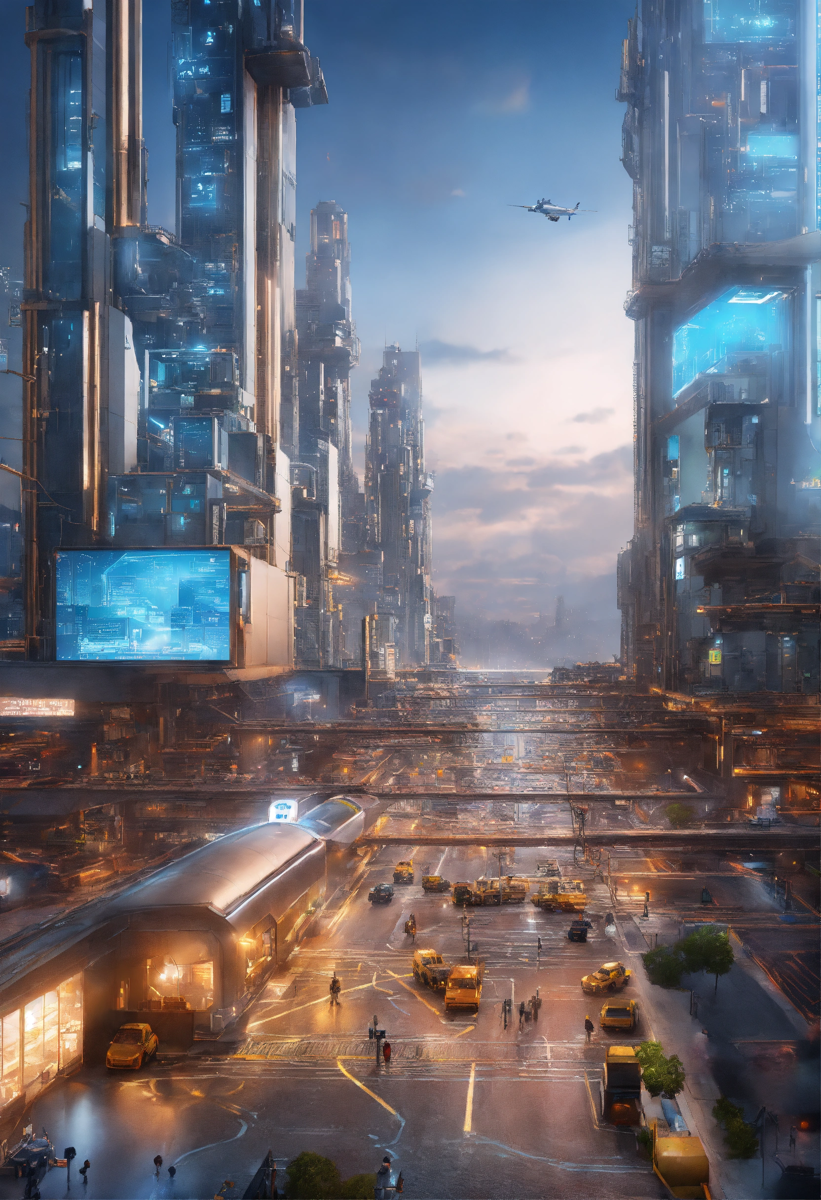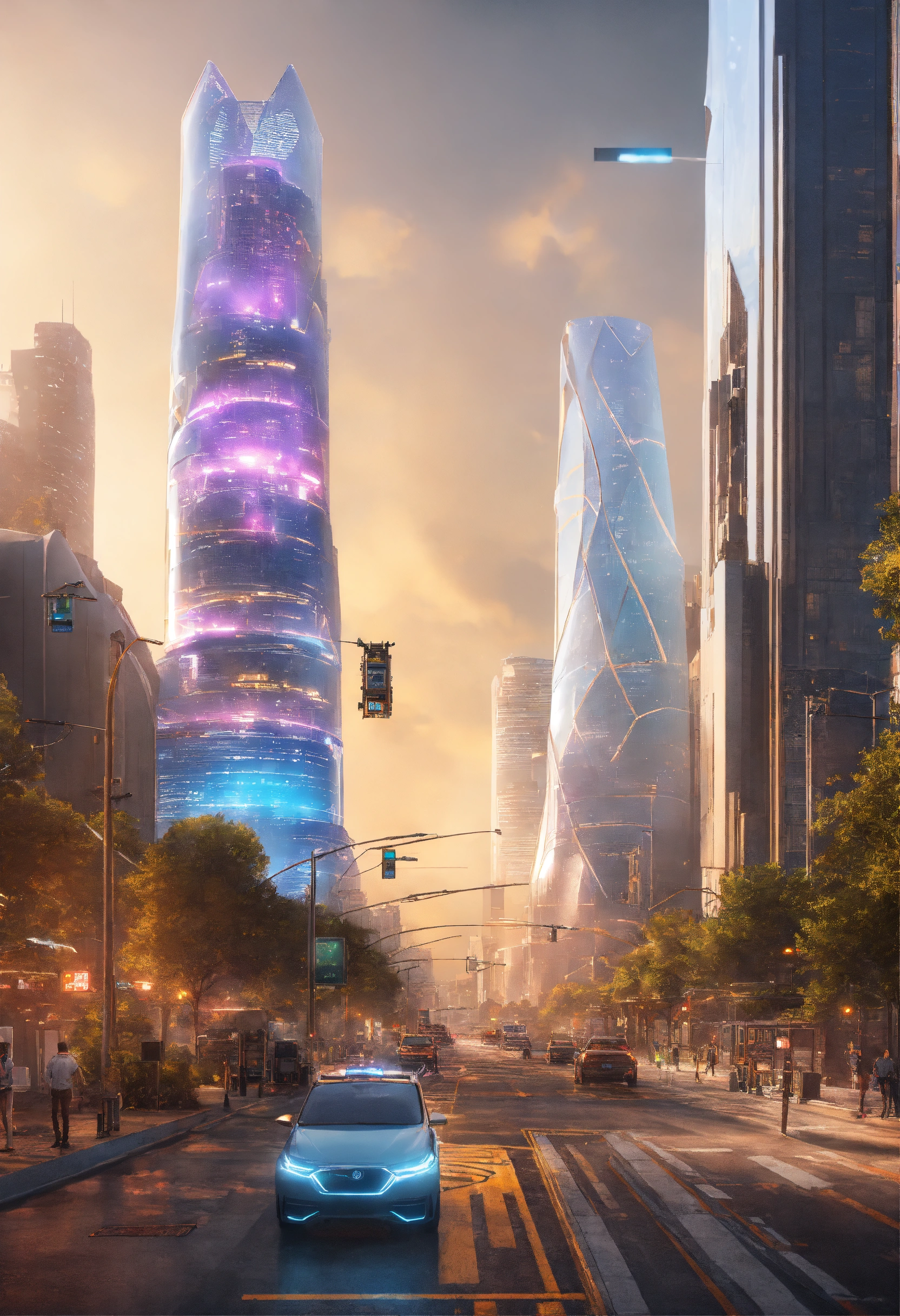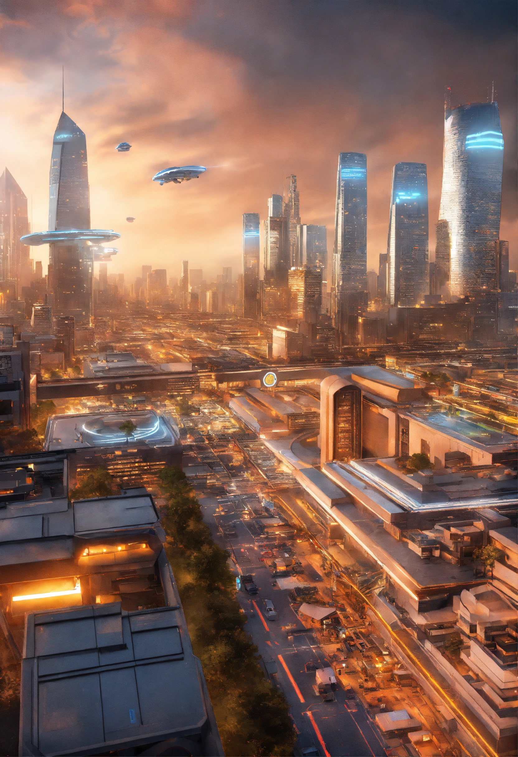 Photorealistic visualization of a futuristic cityscape, showcasing ai-driven safety systems and industry 5.0 technologies actively promoting occupational health and safety.