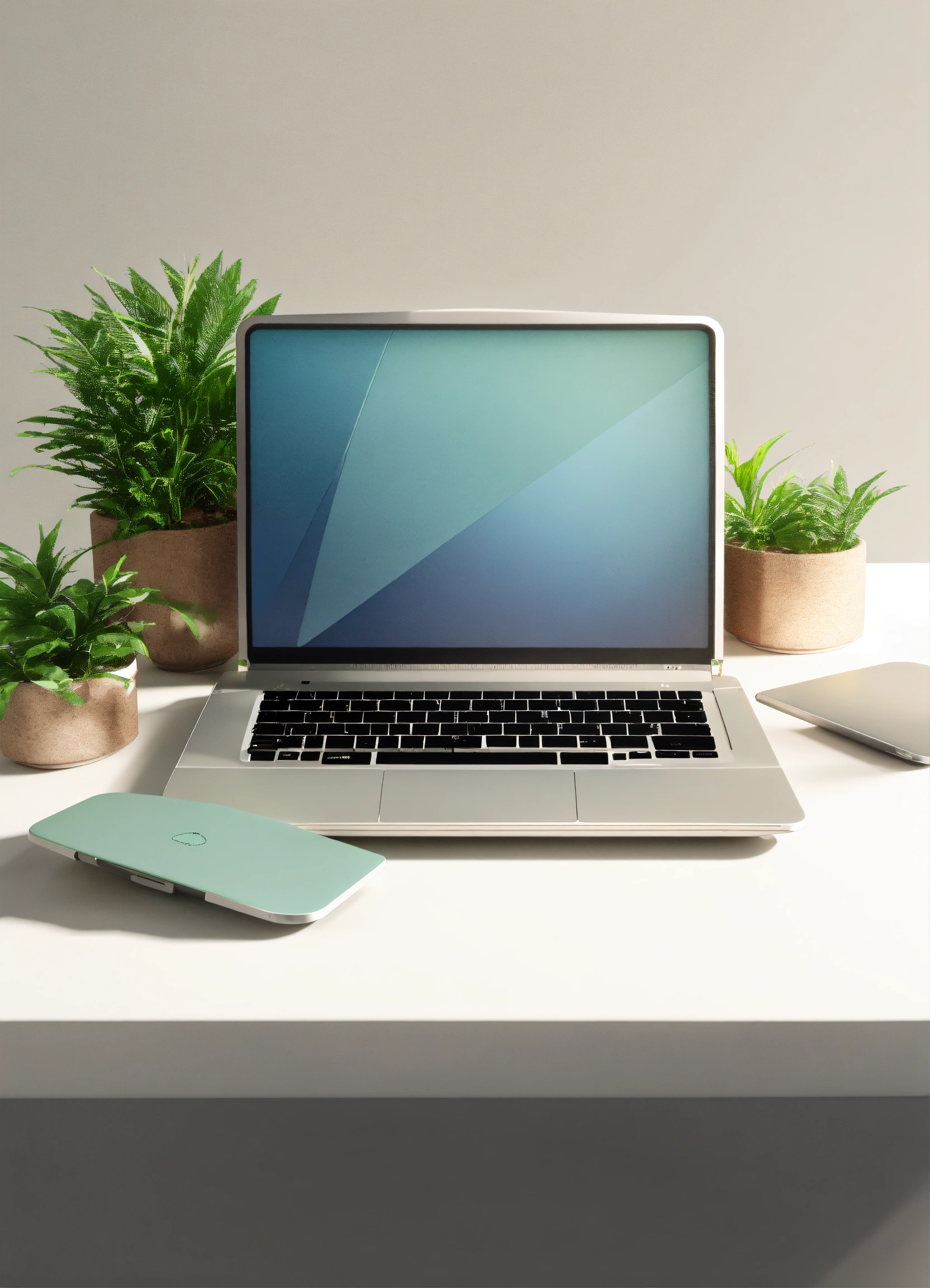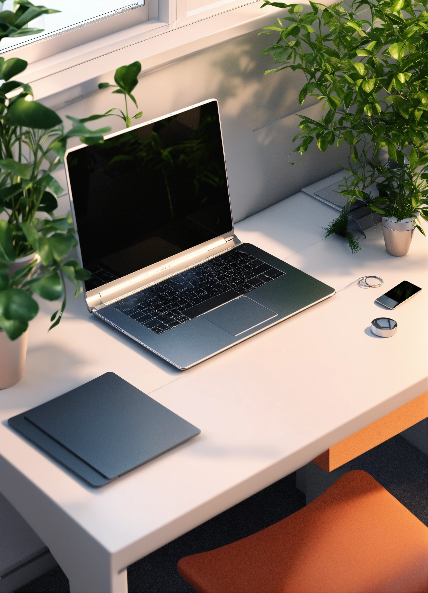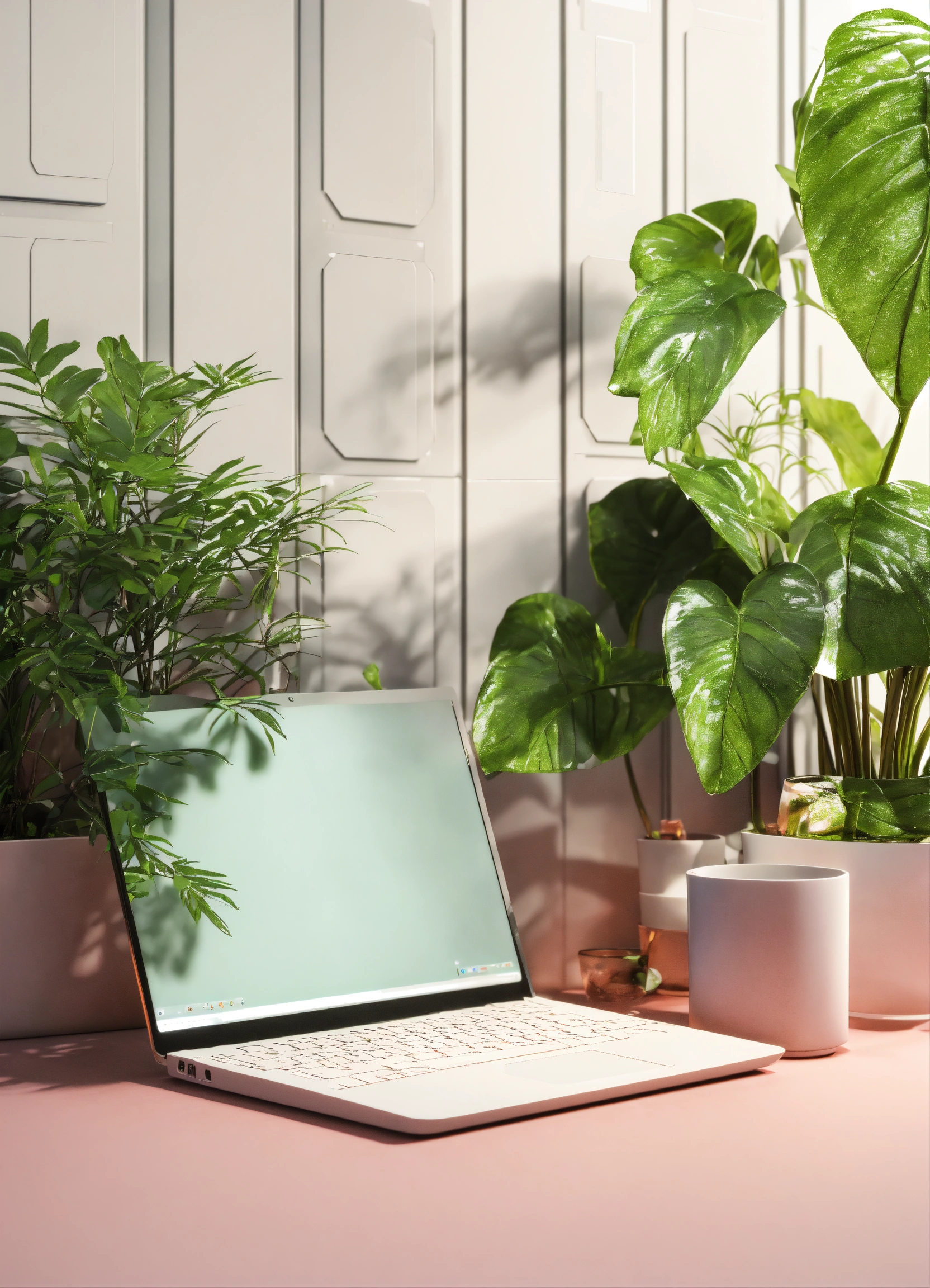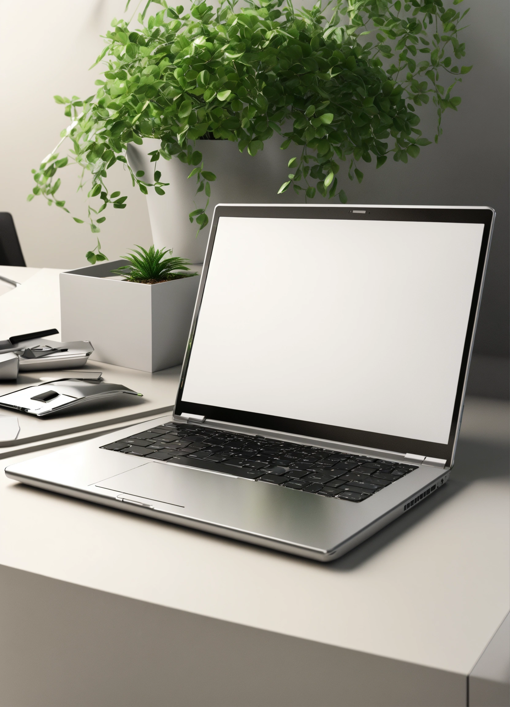 A high poly 3d render of a laptop showing emails, in an abstract layout of desk, plants with a clean finish and polished look, with contrasting shadows and a clean matt --v4. white background.