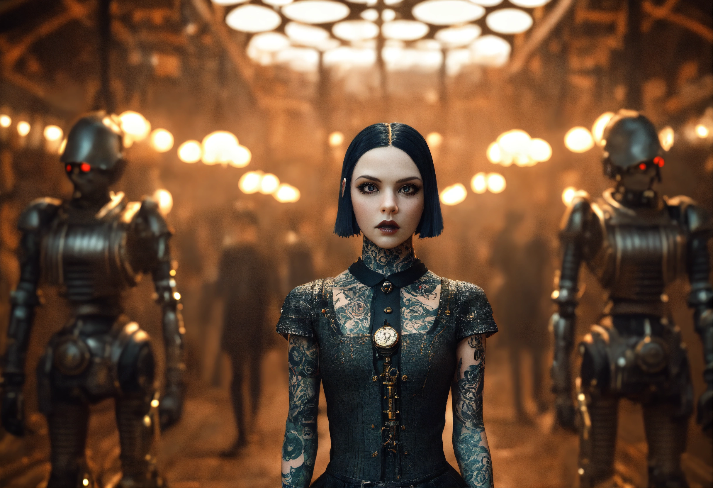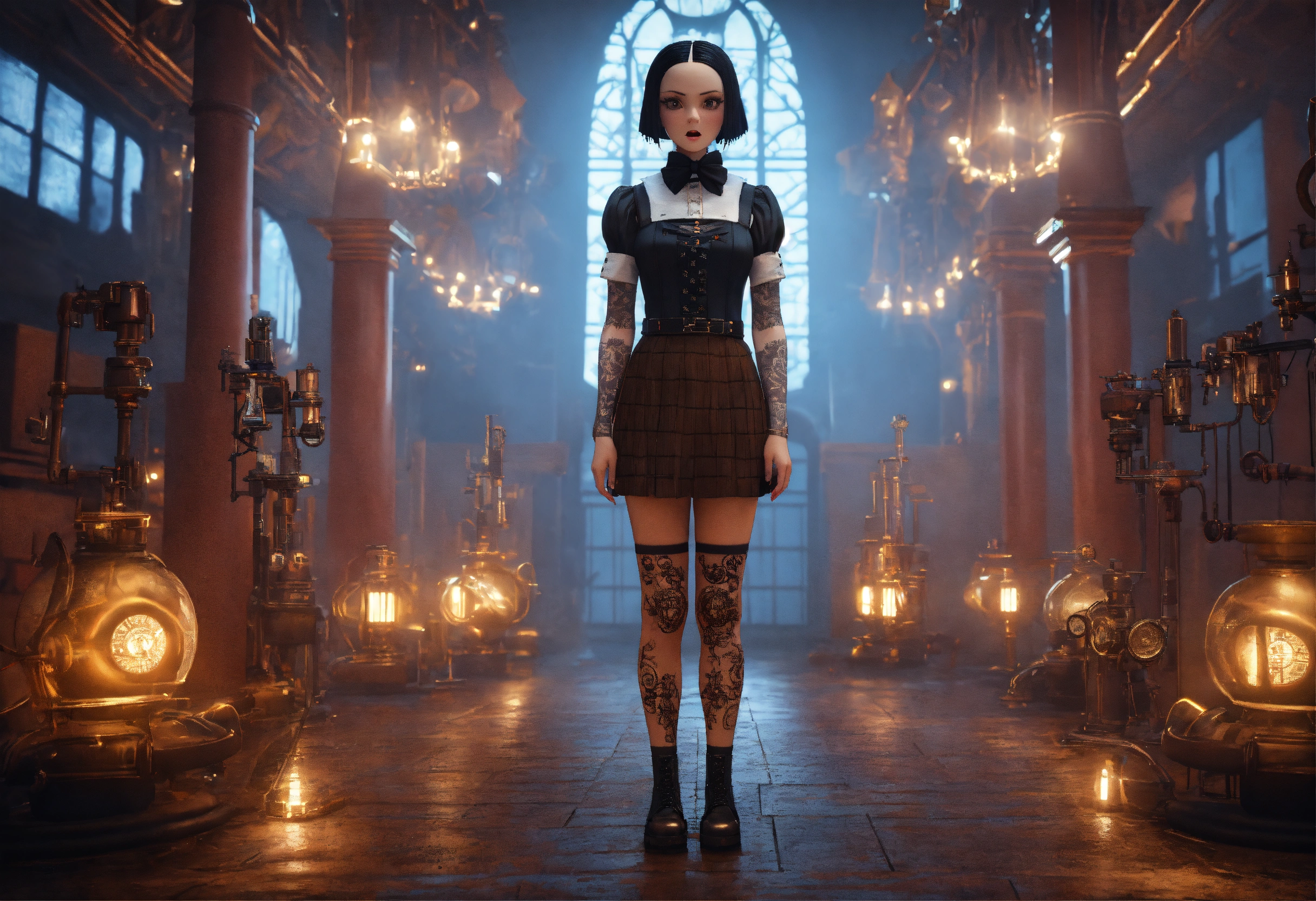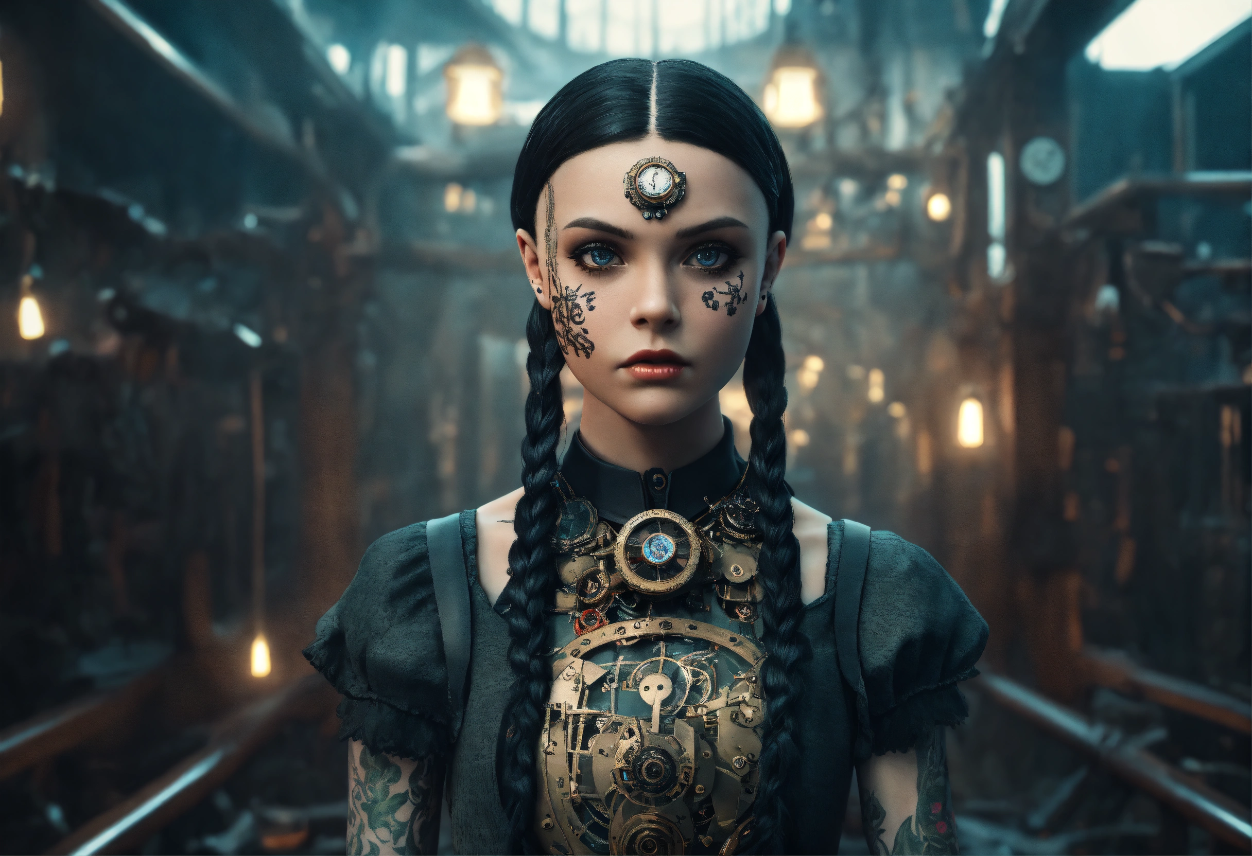 Girl, standing in the center of the image, wednesday addams wearing tattooed steampunk cybernetic appearance, 3d rendering. looking very scared.