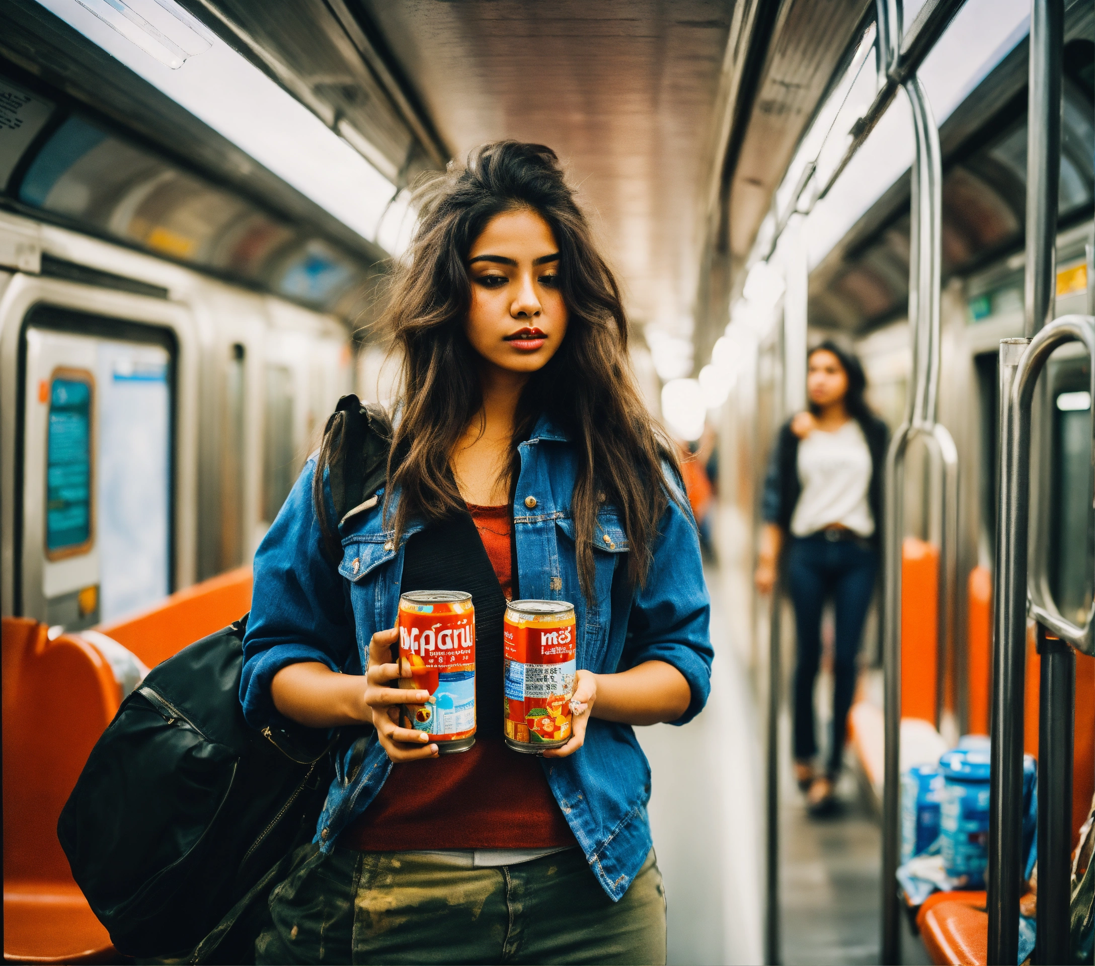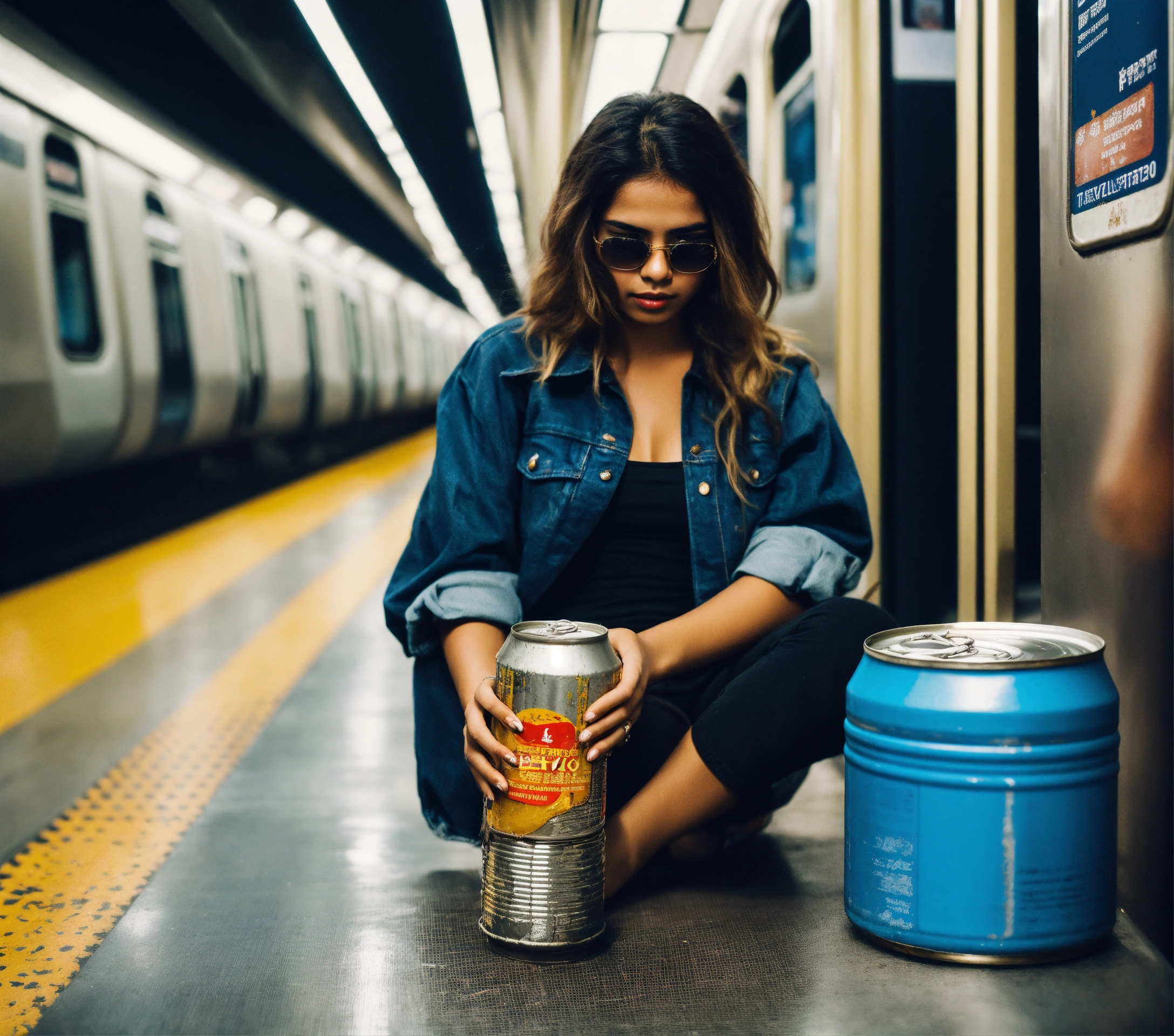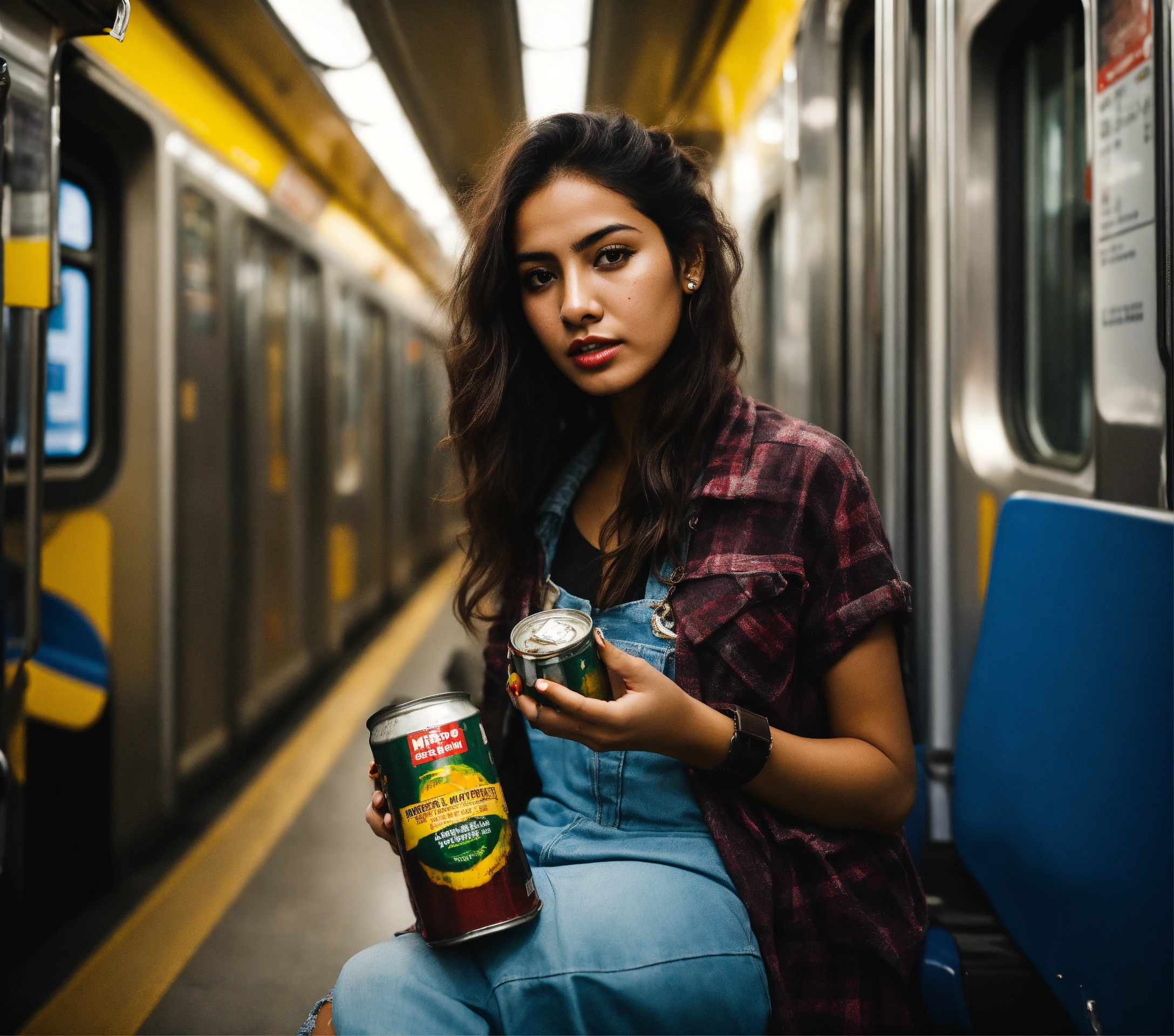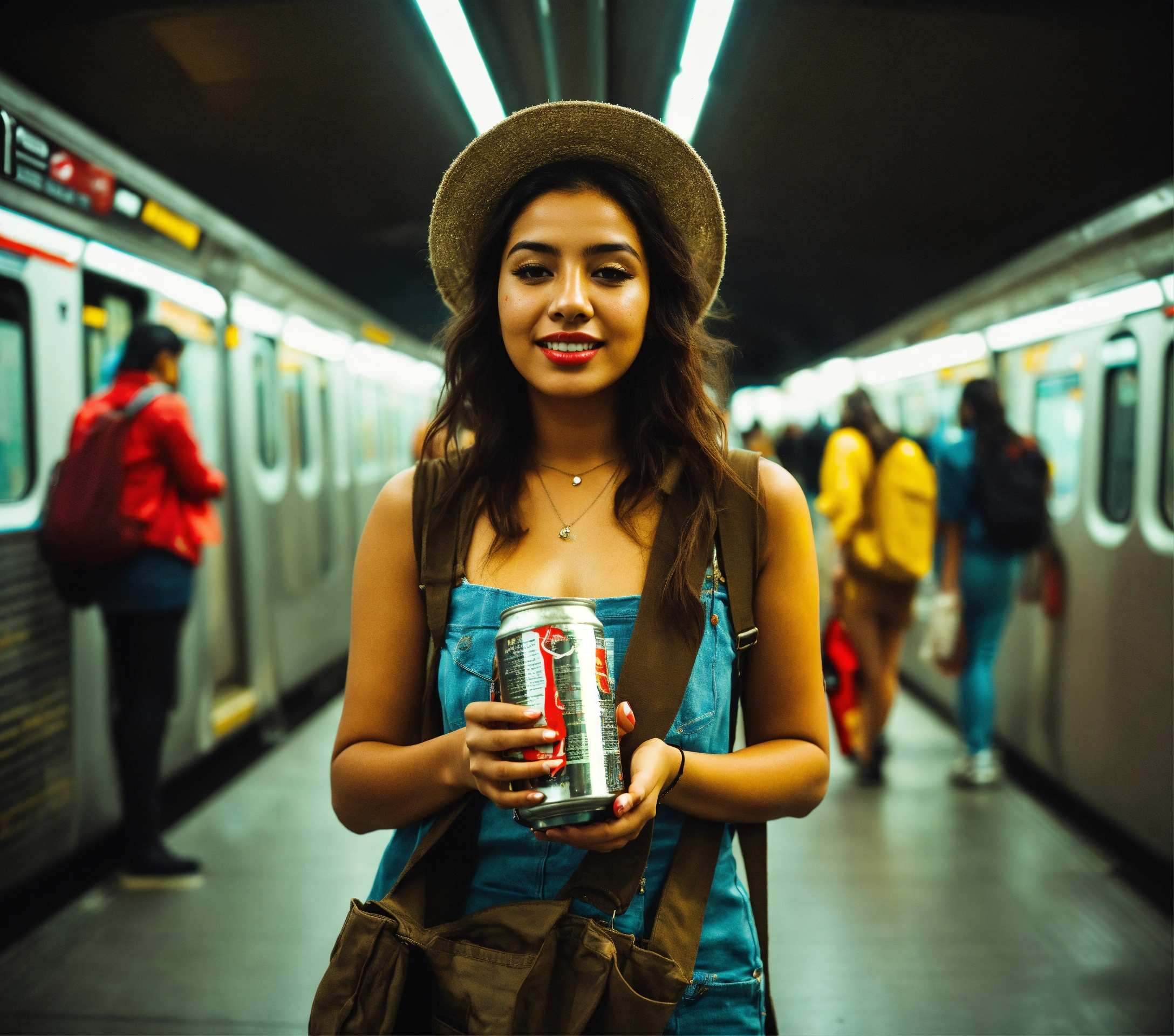 Latina girl in grunge fashion having canned bevarage while travelling in metro rail