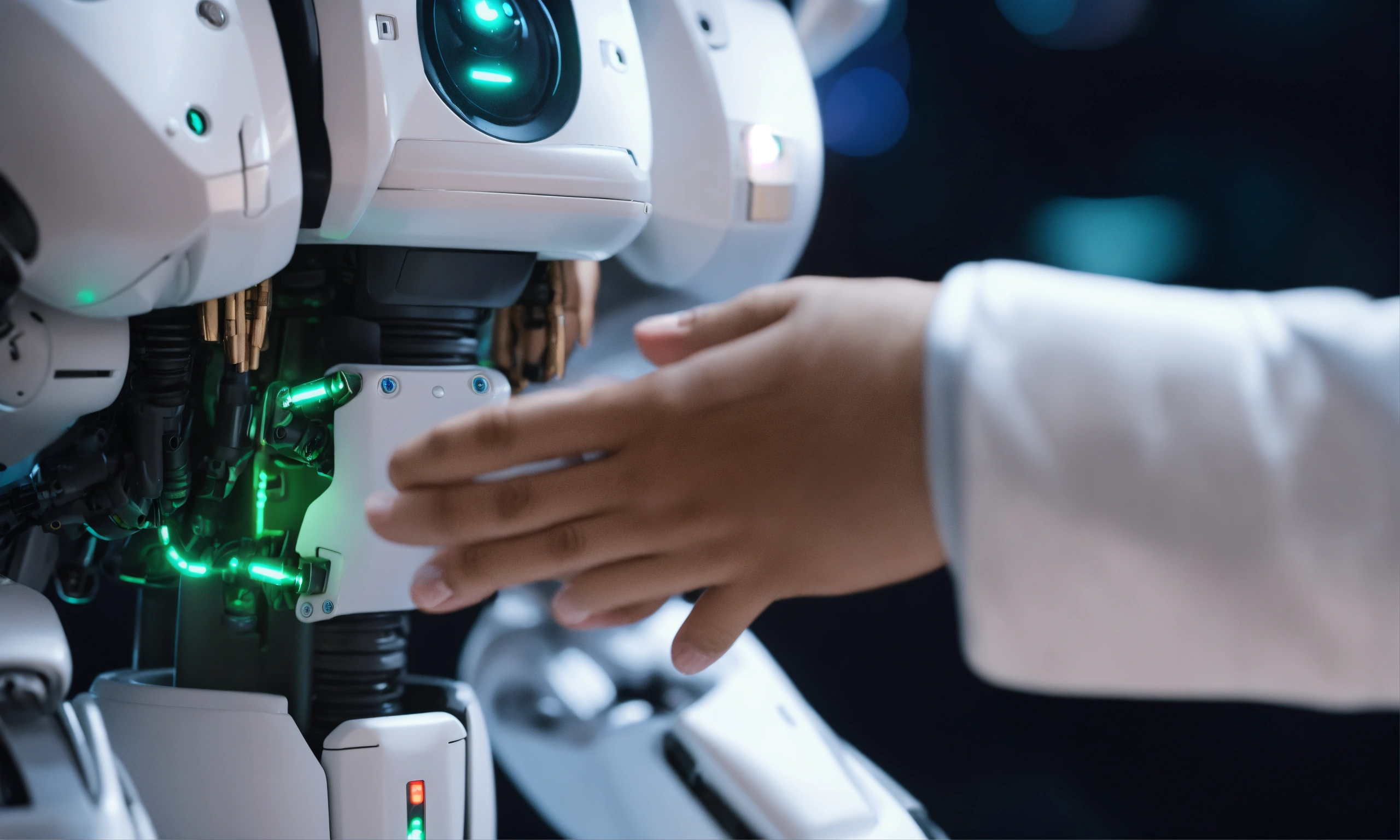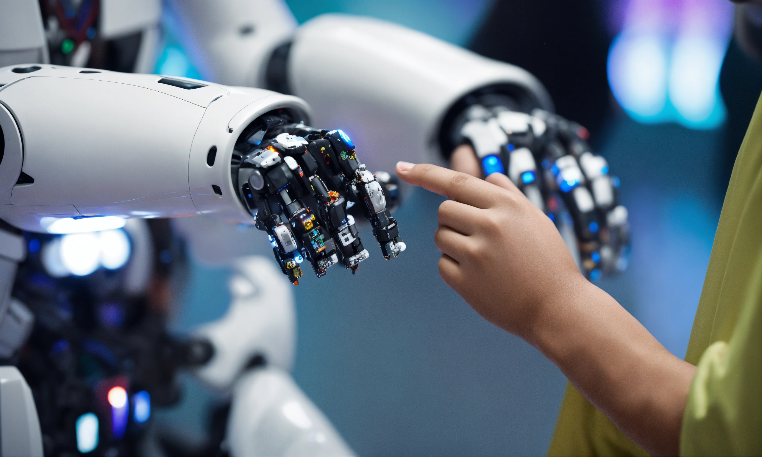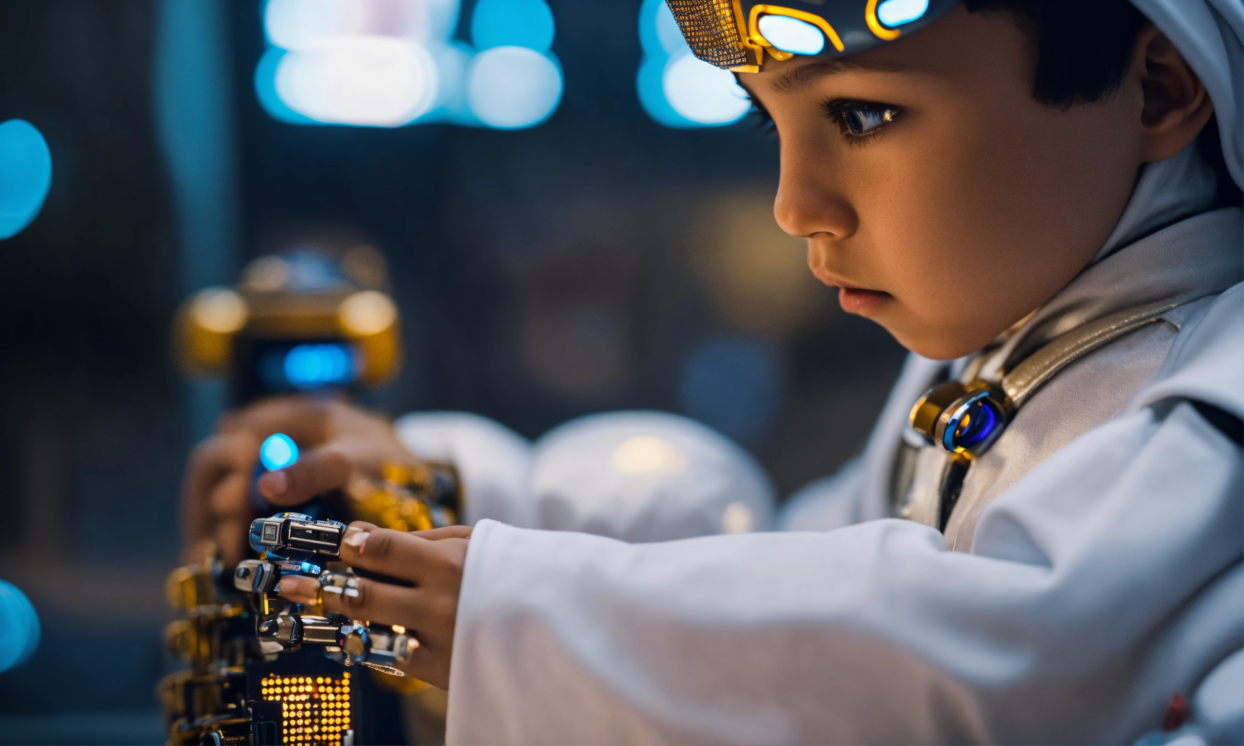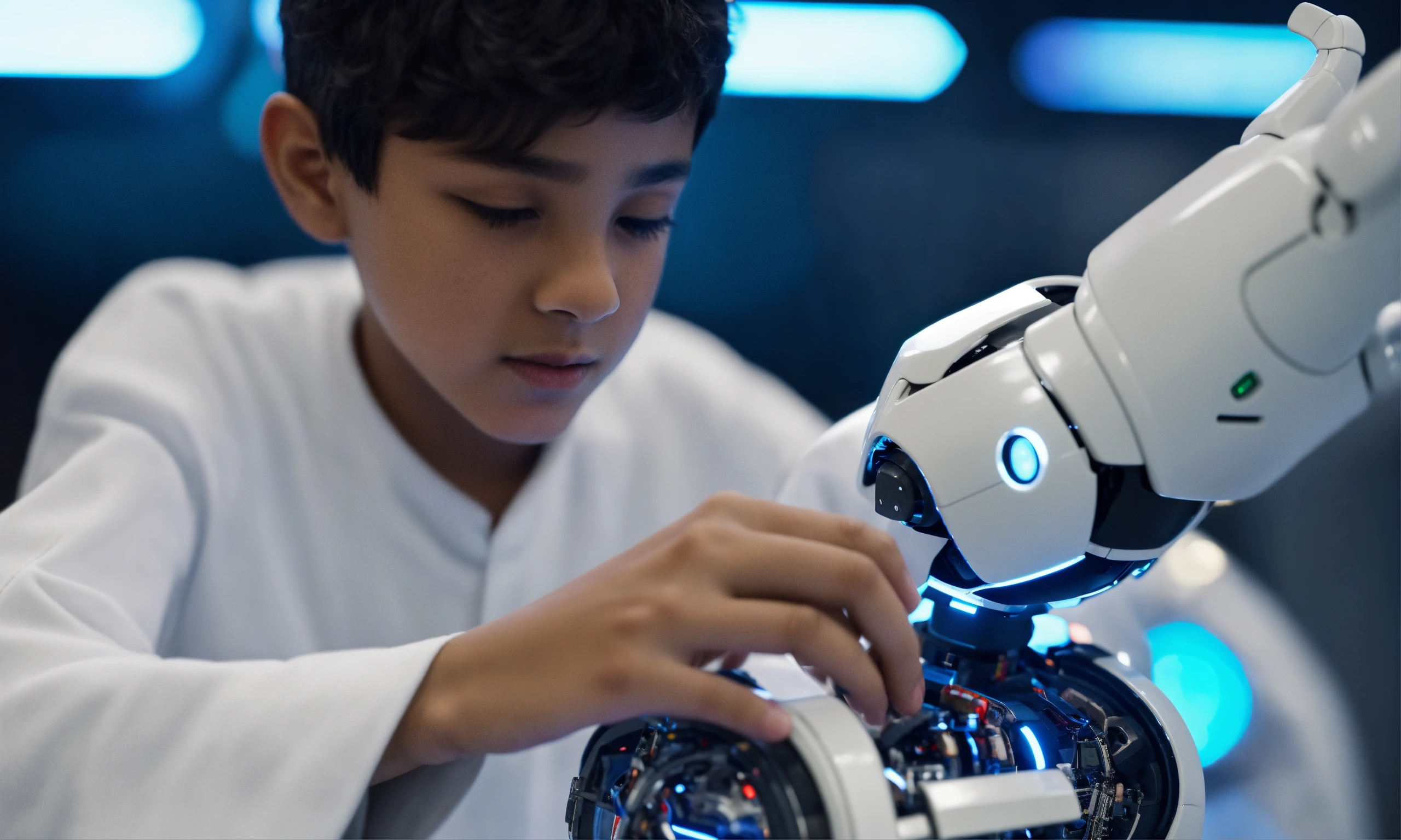Close up of a saudi kid touching fingers with a robot, white costume, photo-realistic, 8k, high definition