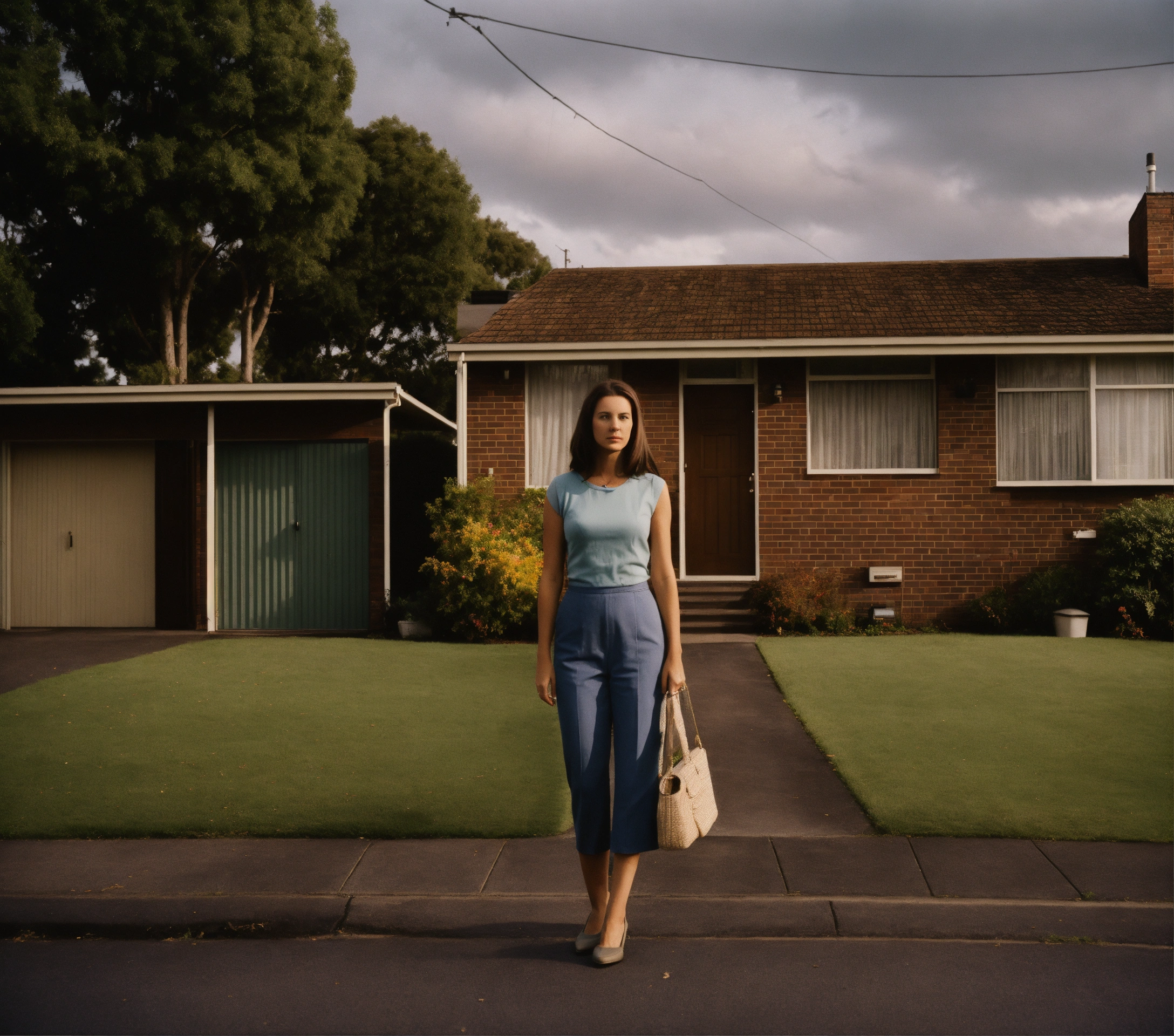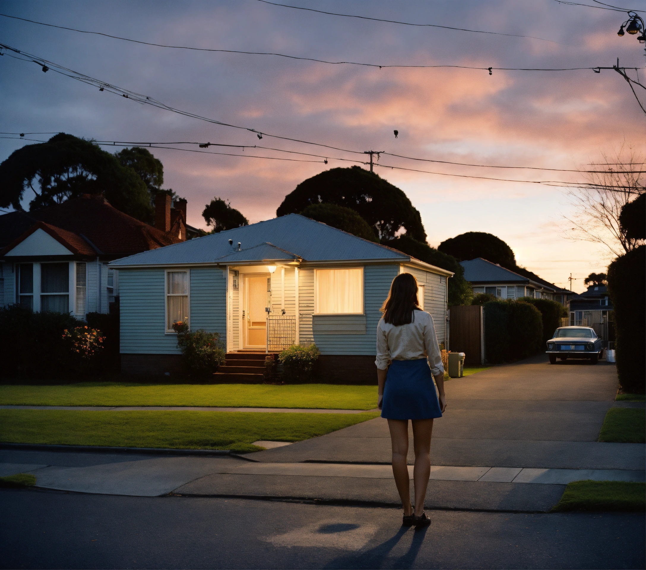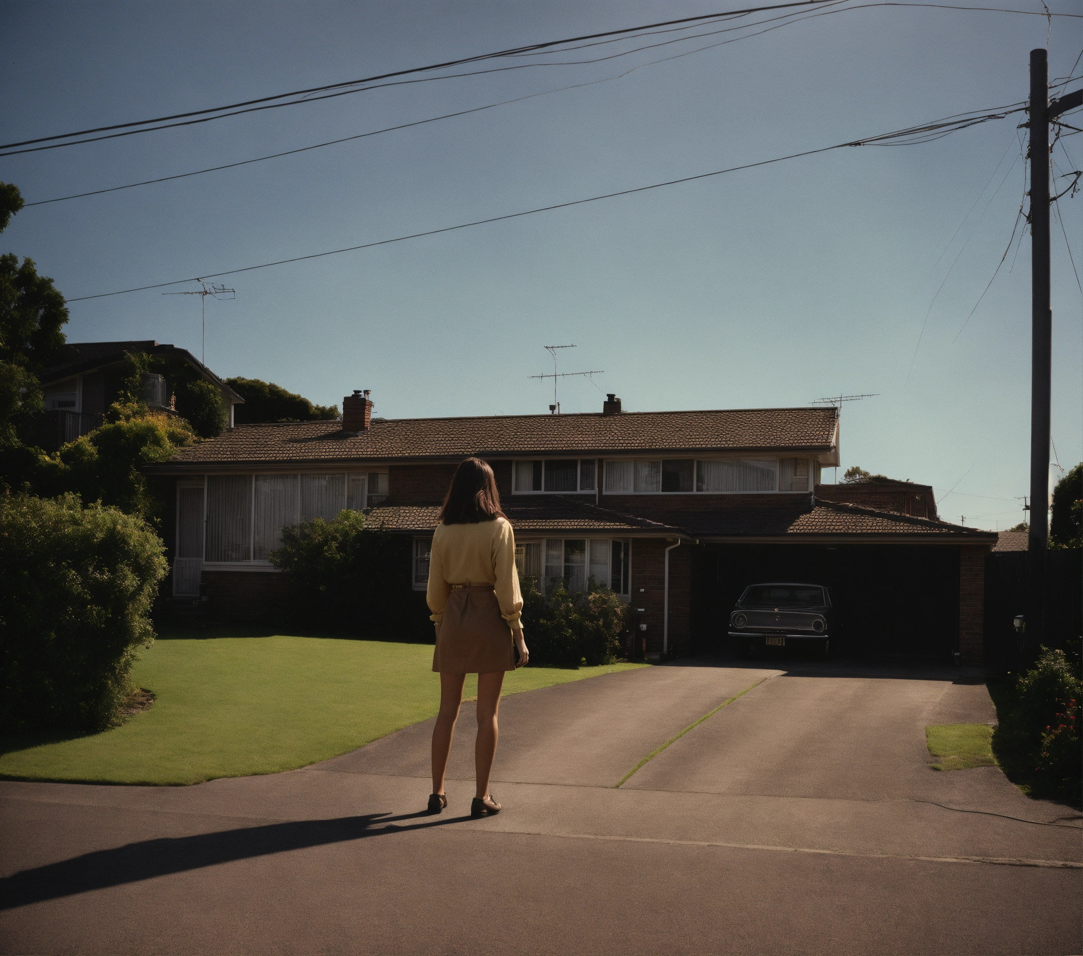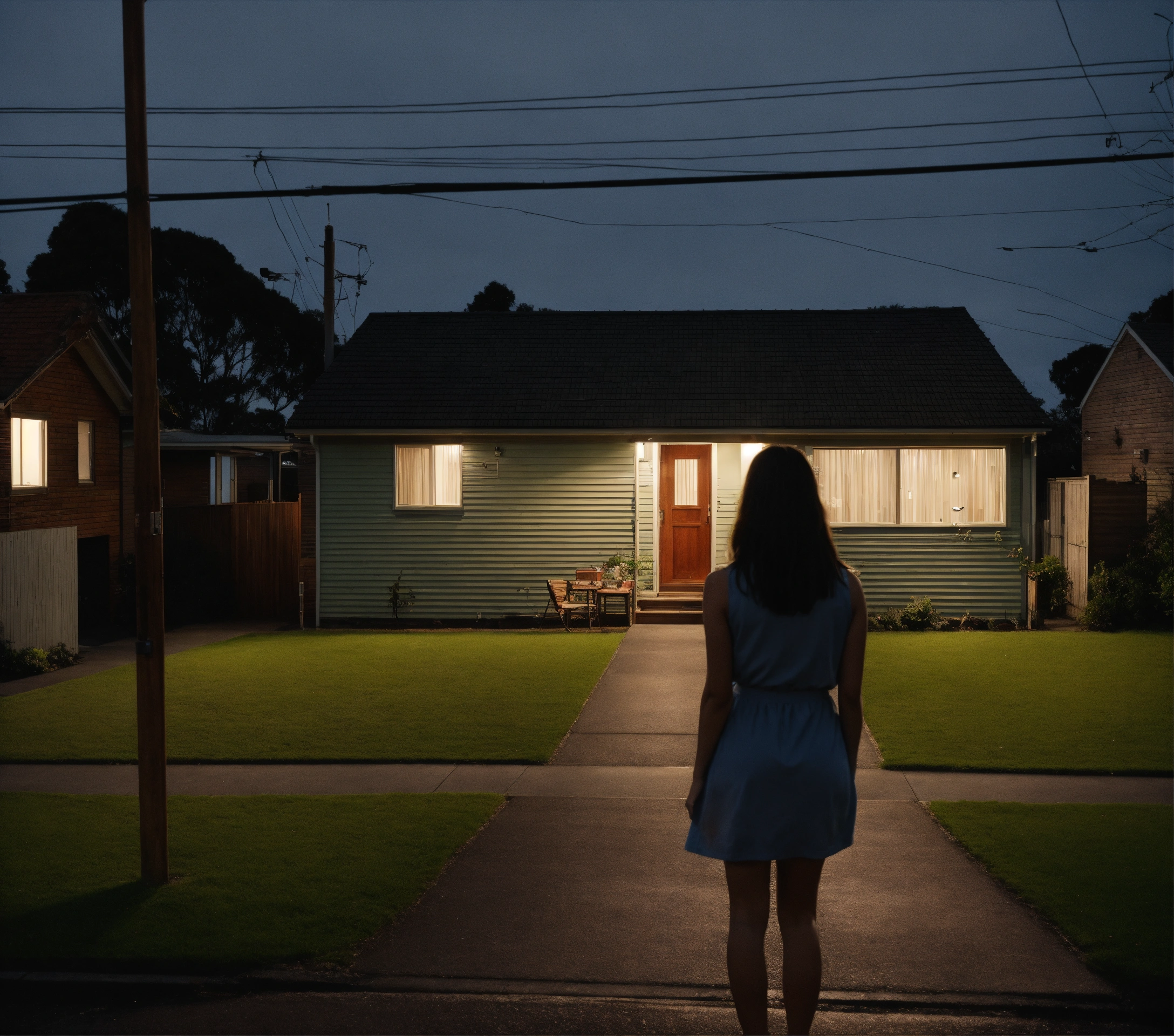 A photograph of a woman with long brown hair standing in the driveway in front of a suburban weatherboard 1970s housing commission home, wide format gregory crewdson style image and colour grading, rear view of woman, the sky is visible above the home, it's late in the day and the street lights are on and a lamp is on inside the home, cinematic