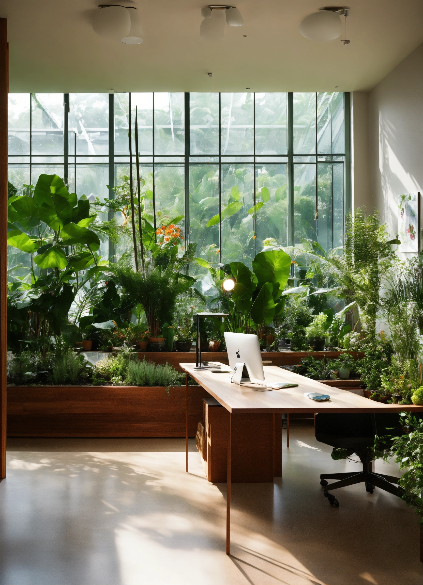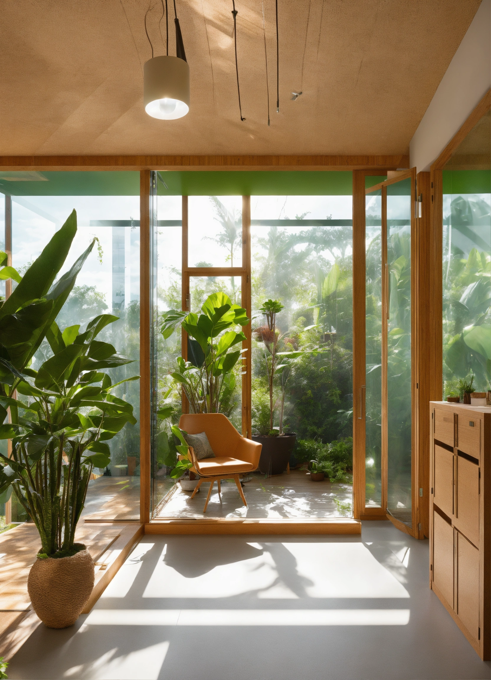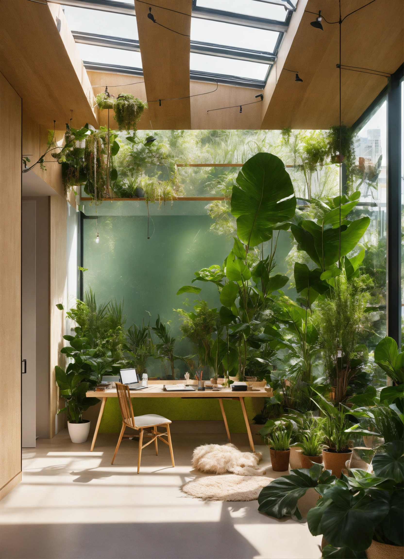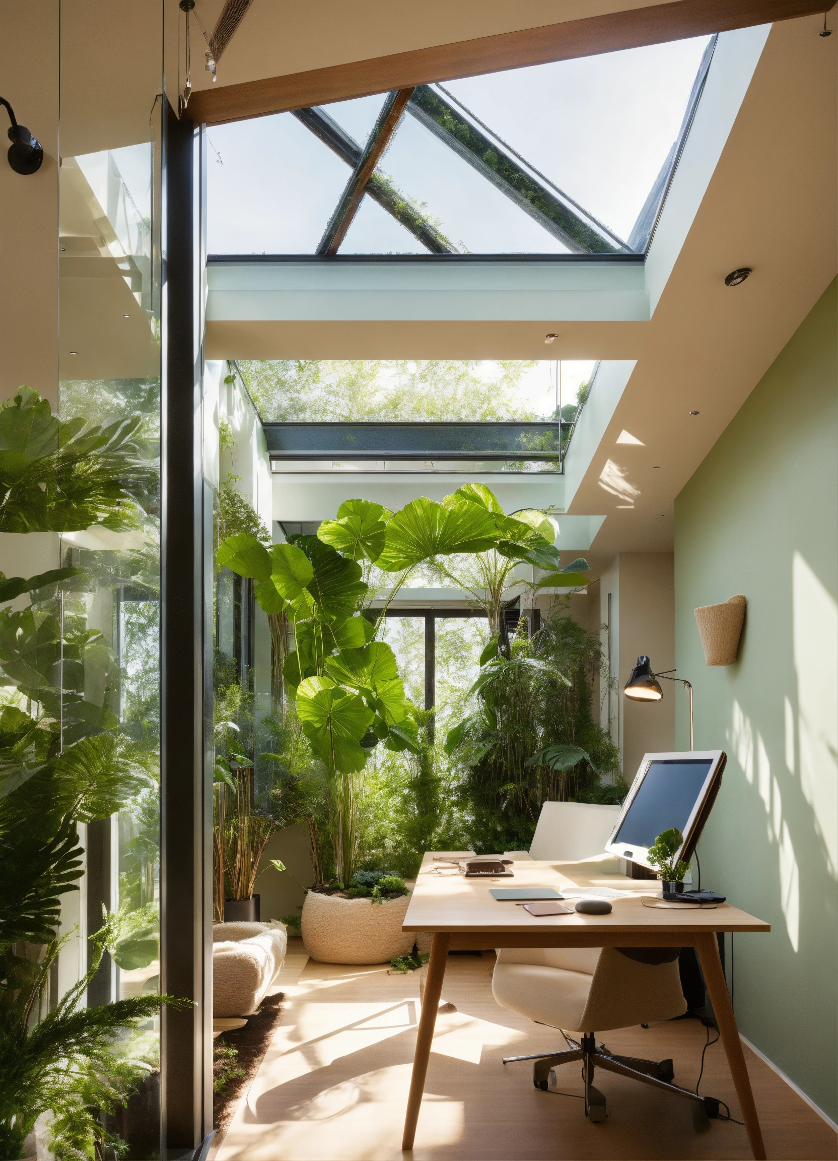 Home office project light colours glass modern style tropical plants sustainable building green roof light coloursinterior view