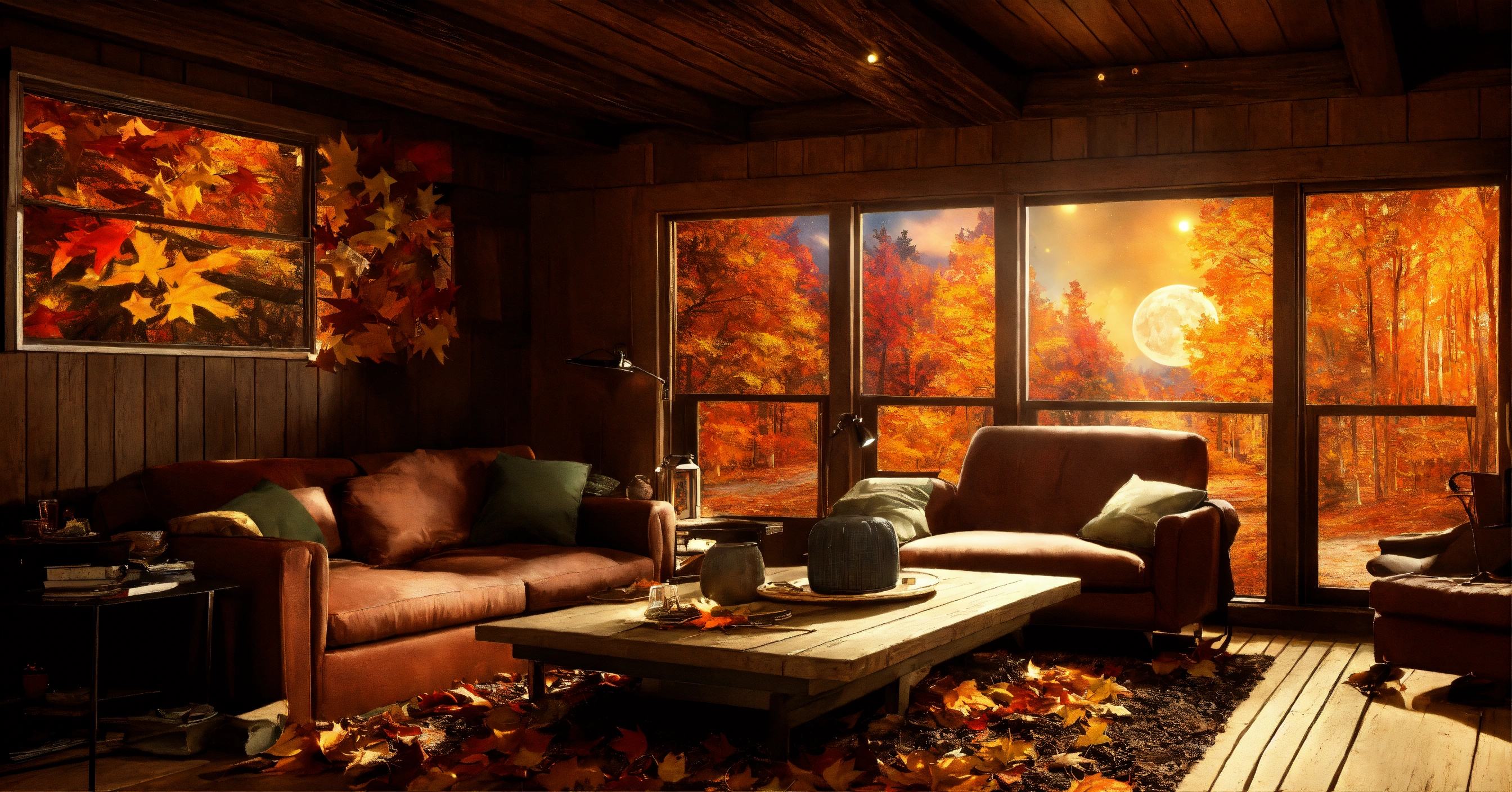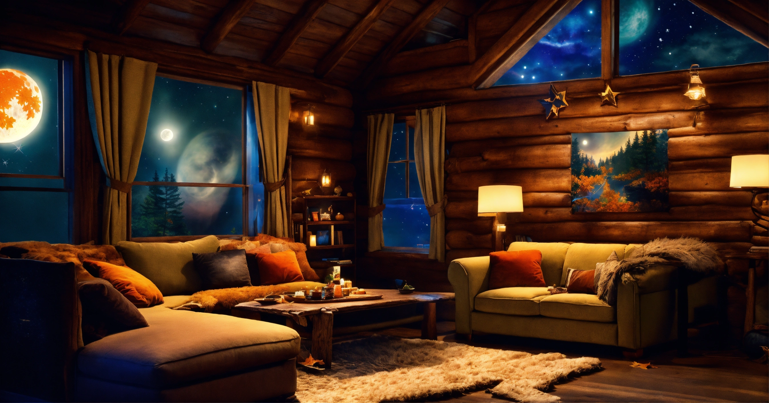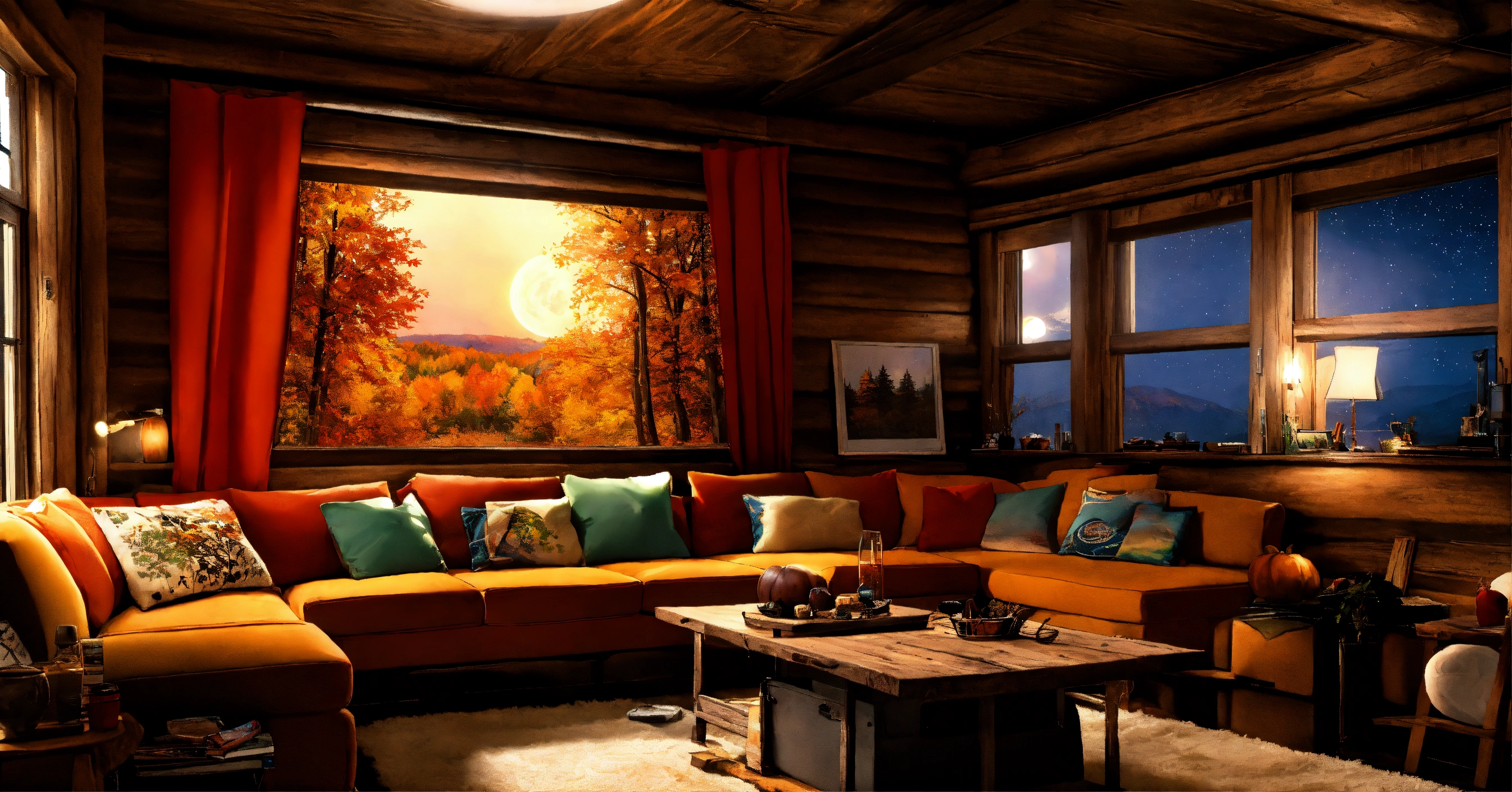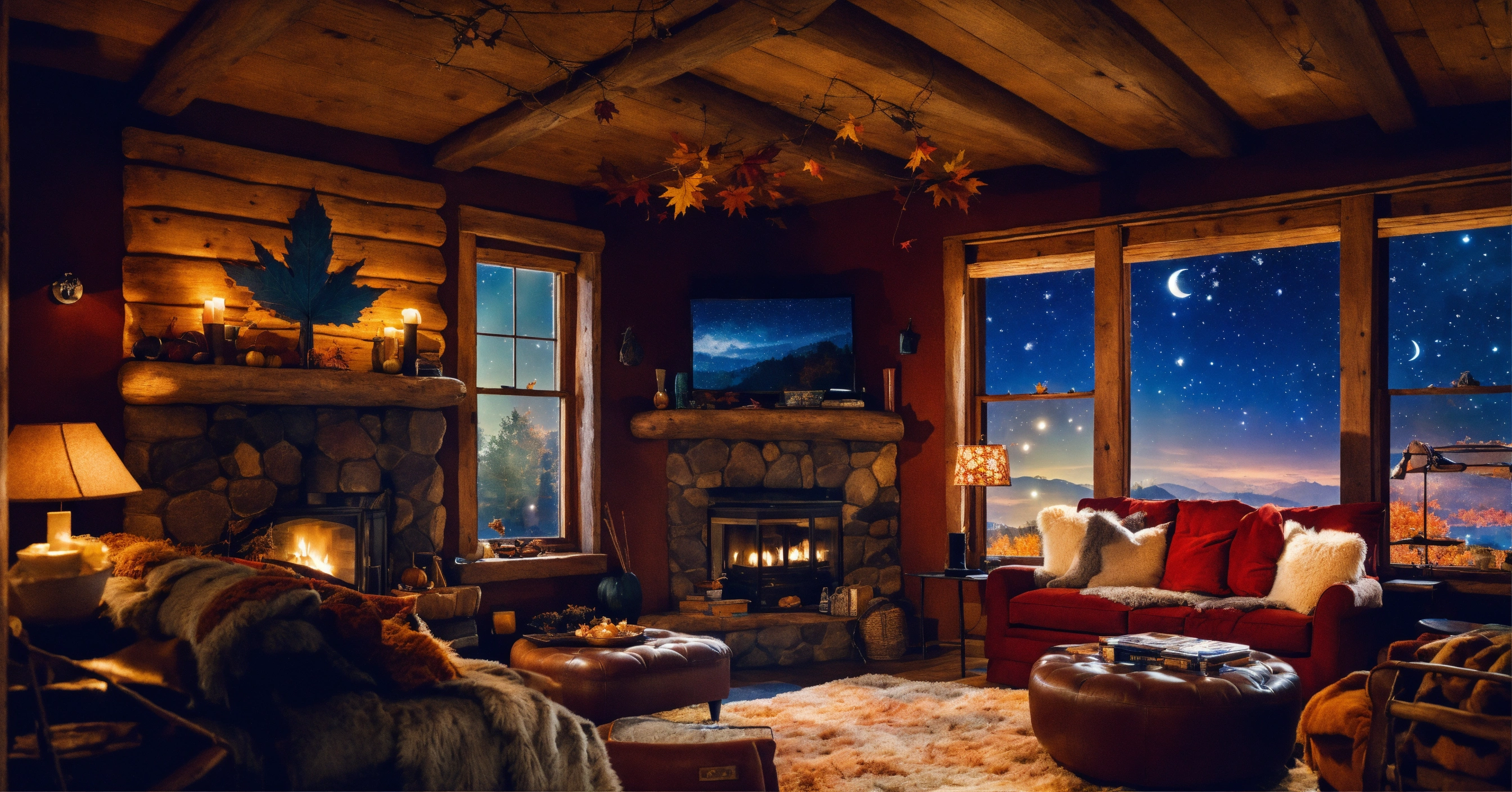 Cabin living room fall leaves, night window, fluffy rug, grafitti fall pics living room big couch dark wood, stars moon, sky ceiling