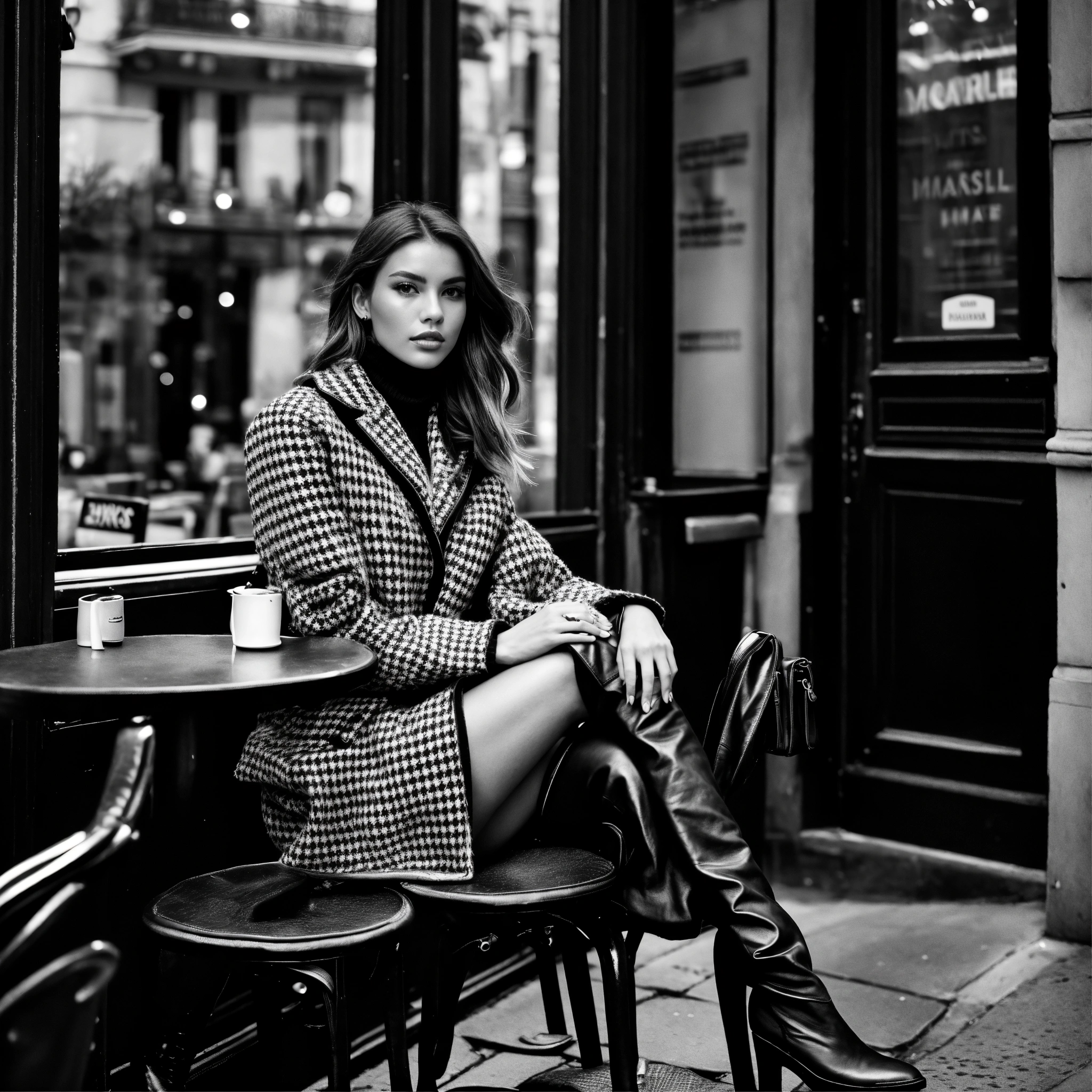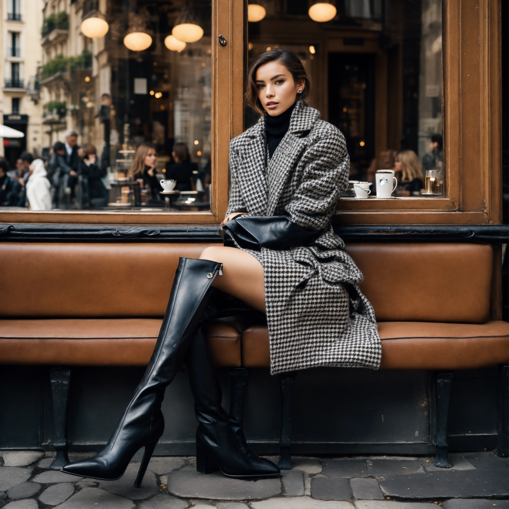 A chic female model sits at a quaint café in the marais district of paris, wrapped in an oversized houndstooth blazer over a turtleneck sweater dress, her legs crossed in thigh-high leather boots. the image should have a 'caught-in-the-moment' feel, as if snapping the pinnacle of fall fashion for a trend-setting magazine cover.