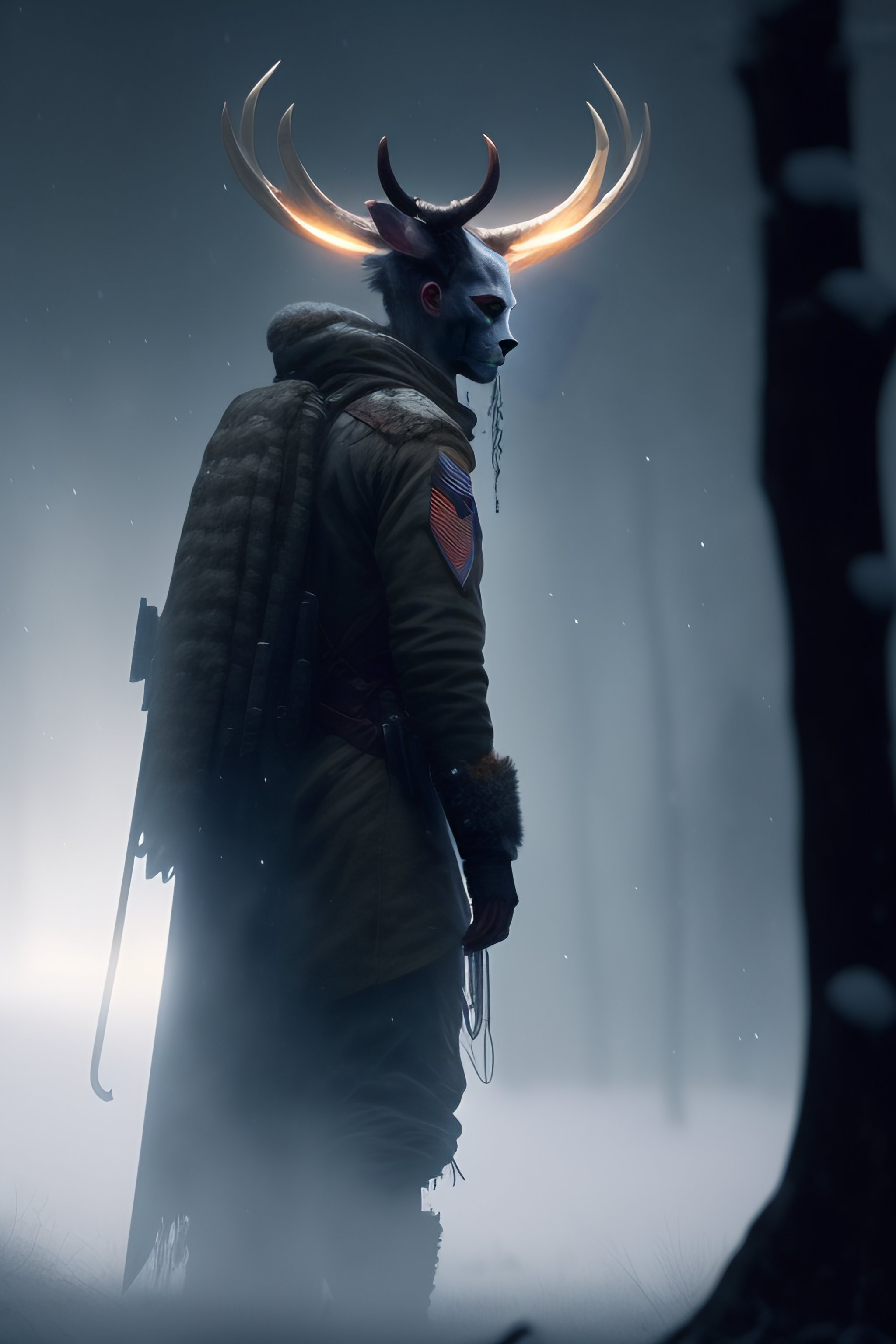 A skinny wendigo with glowing white eyes with the bloody body of a soldier, highly detailed digital art, extreme detail, art by greg rutkowski, volumetric lighting, character design, unreal engine 5, character design, d&d, slahser, violent, stranger things