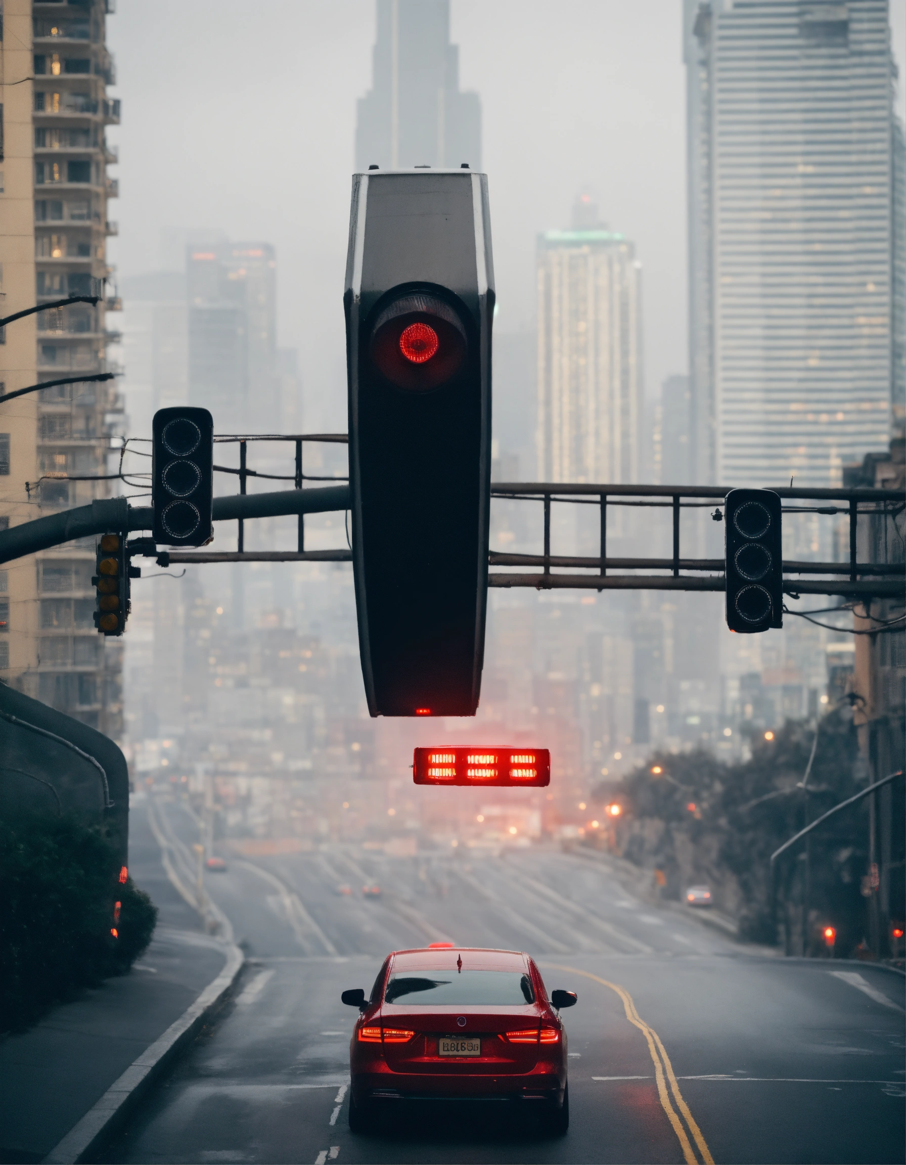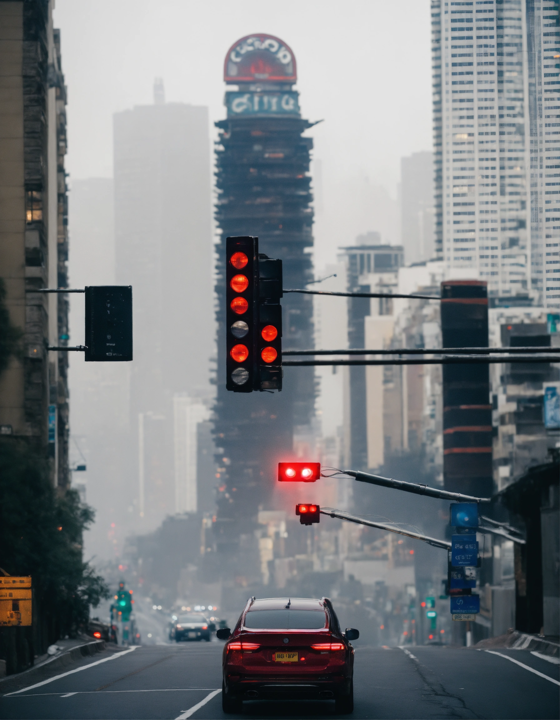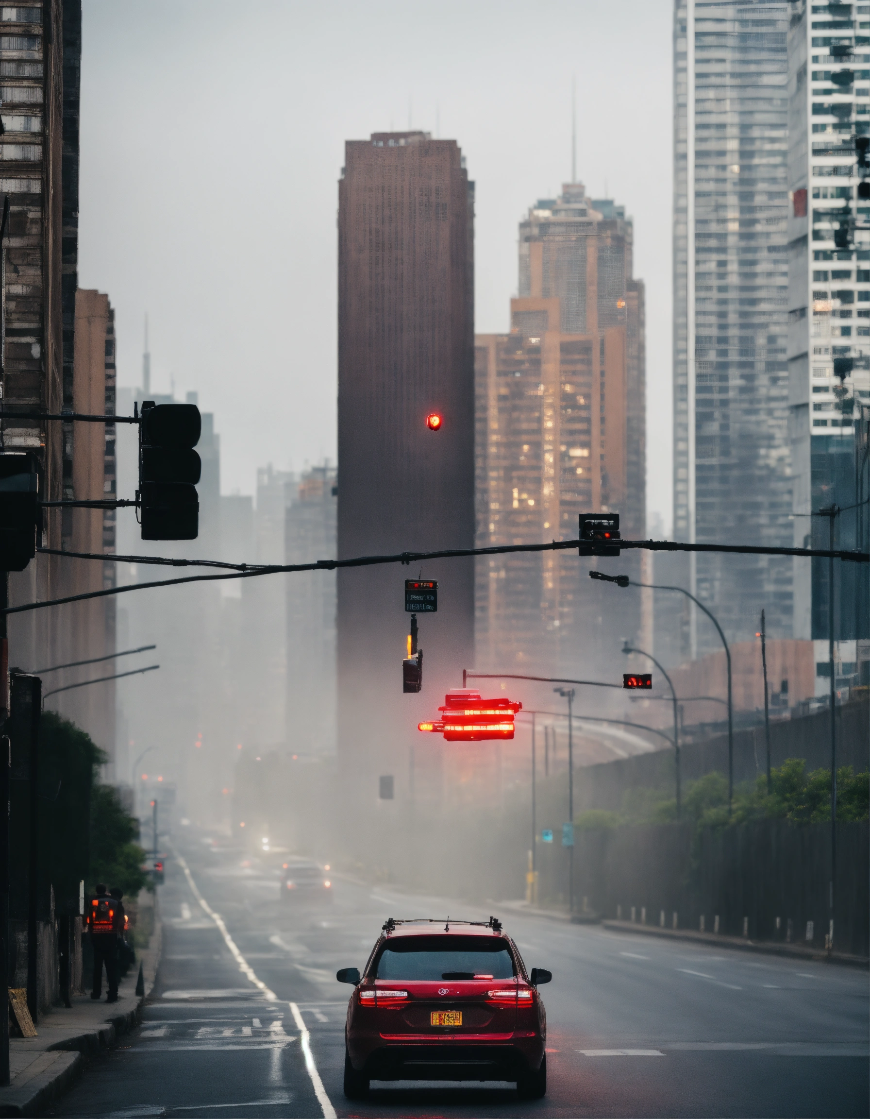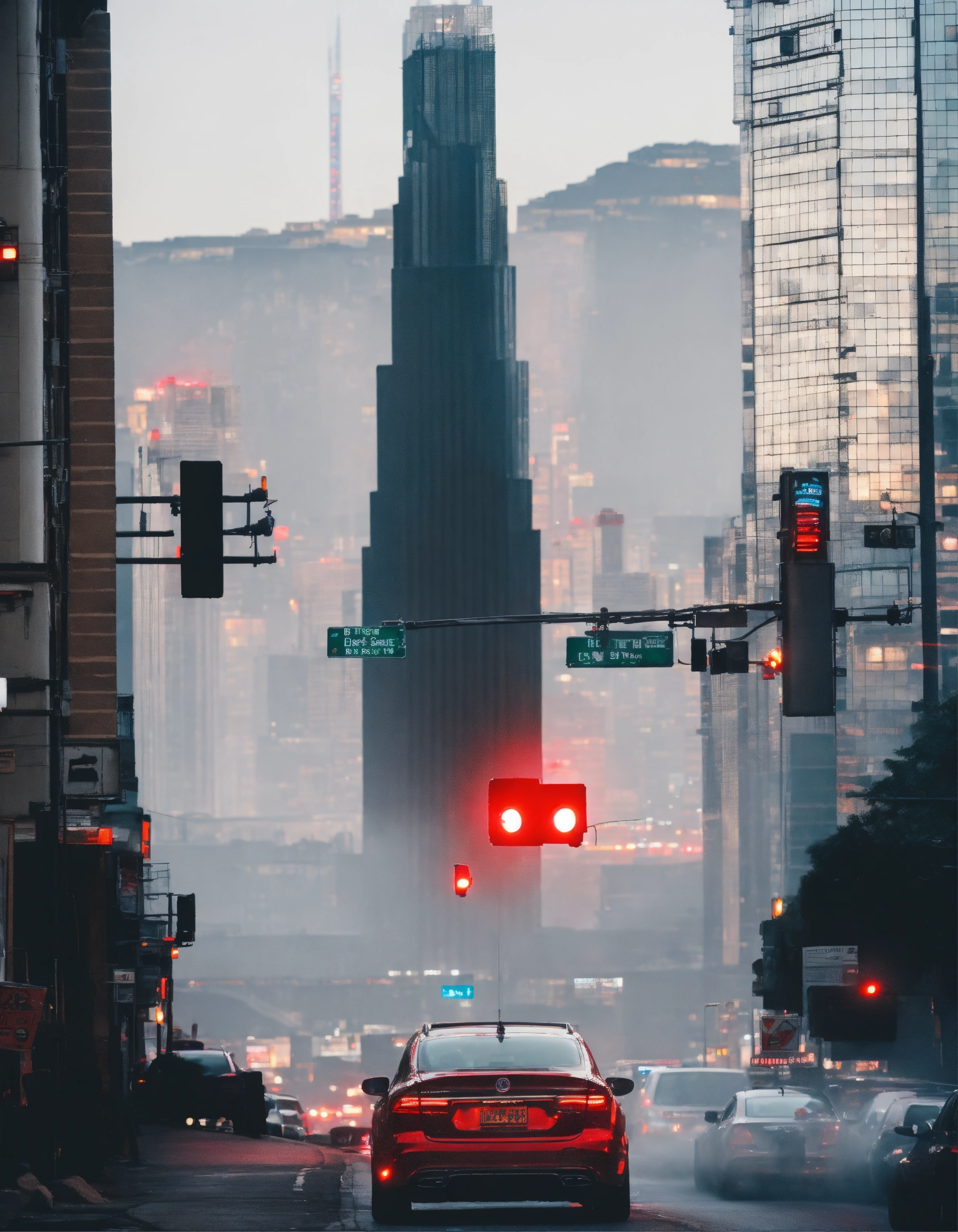 A disturbing photo in which in the foreground you can see the rear of a car with red brake lights on. in the background you can see the street and tall buildings of a big city, which create the impression that a car is moving at the bottom of a dark canyon.