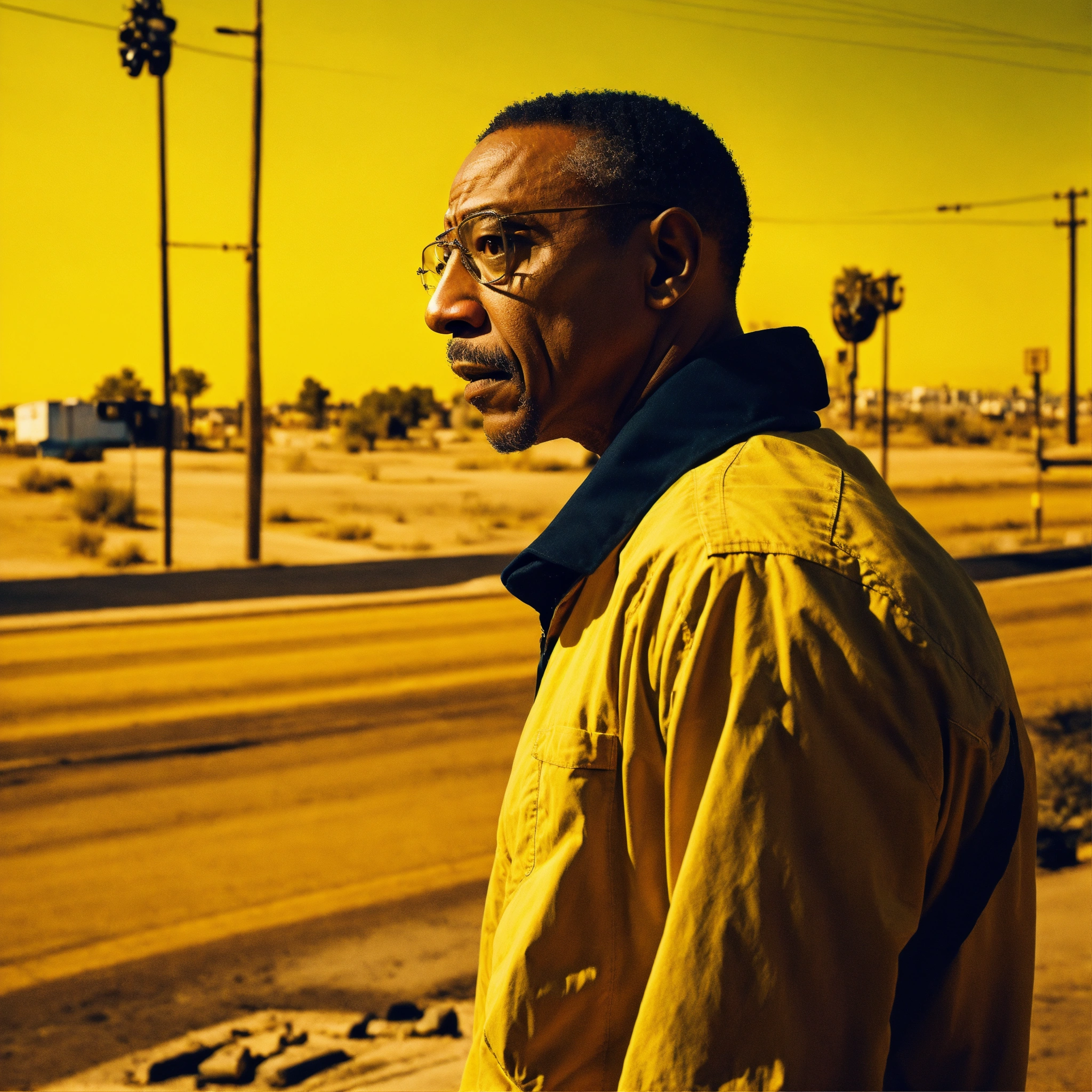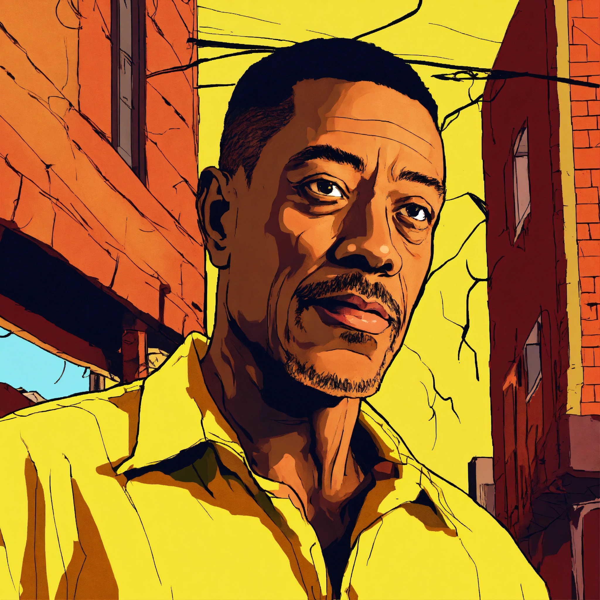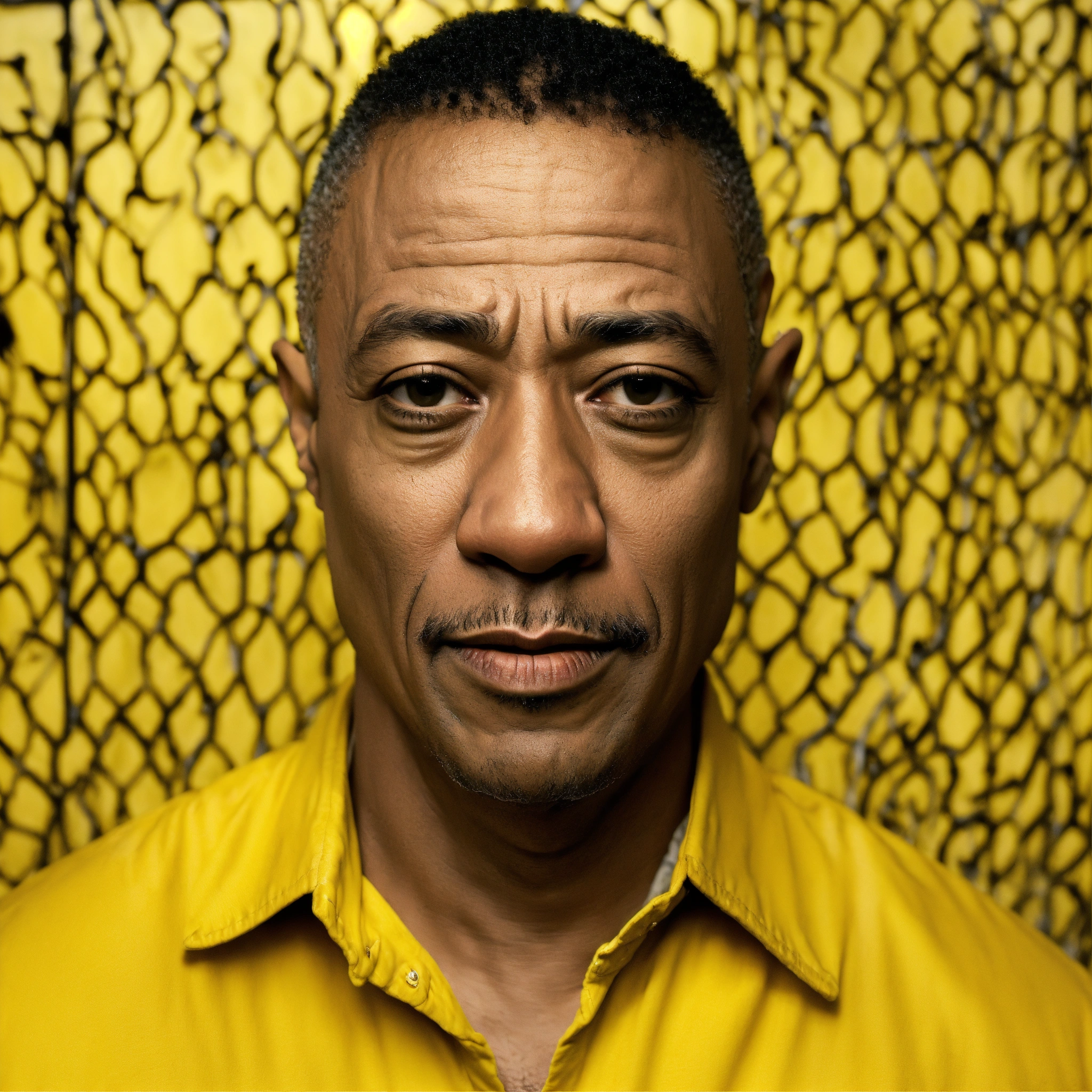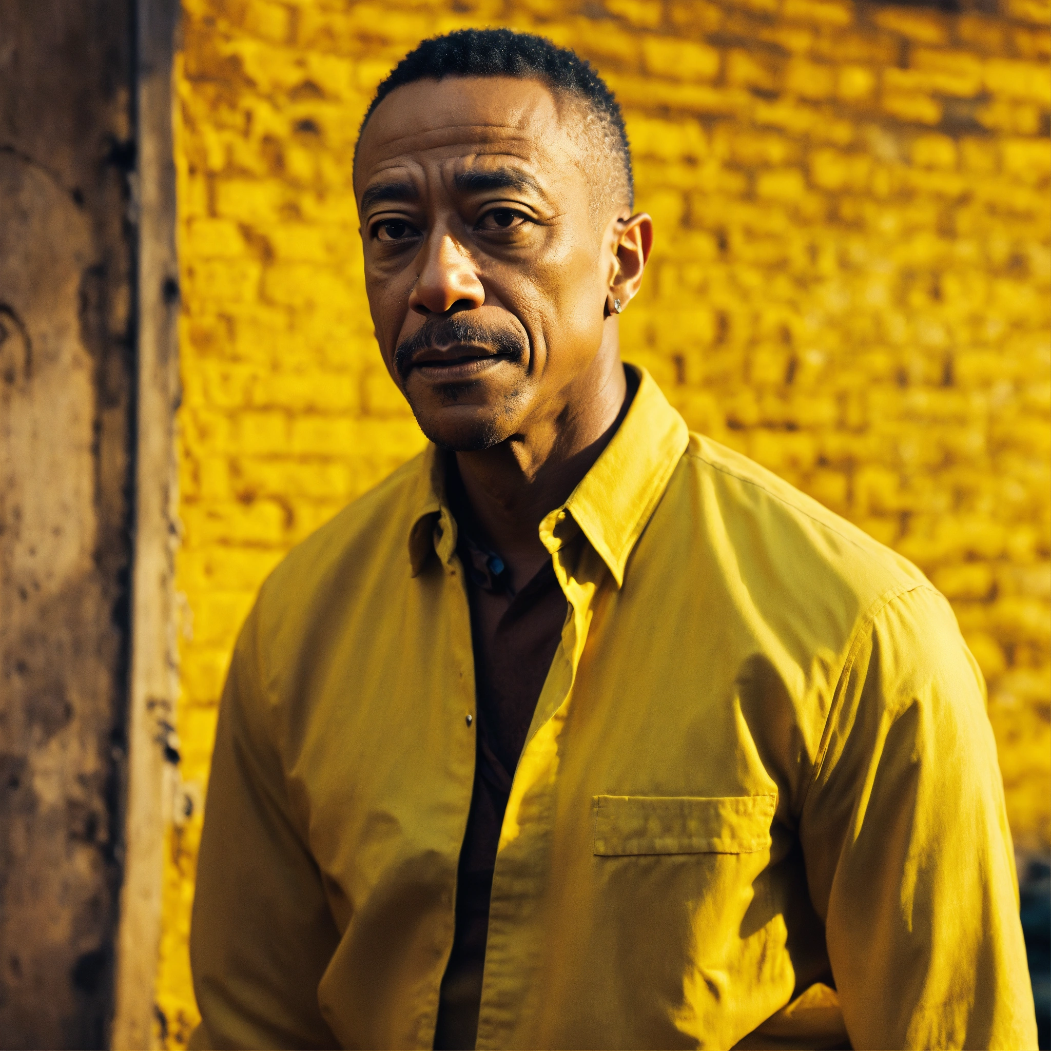 Giancarlo esposito, gus fring, expressionism, spooky, breaking bad, bustling city, yellow shirt, profile picture, no beard, shaved