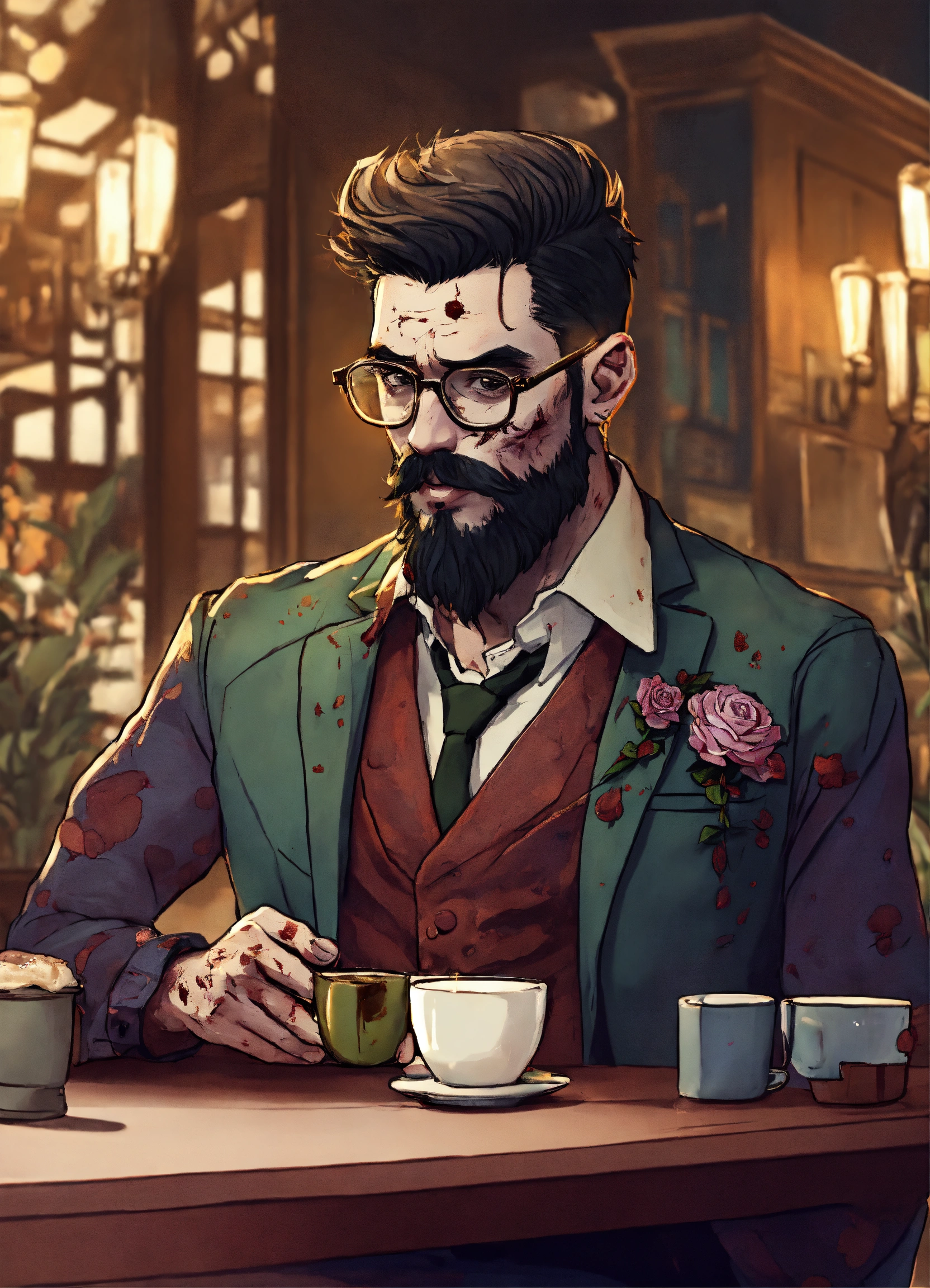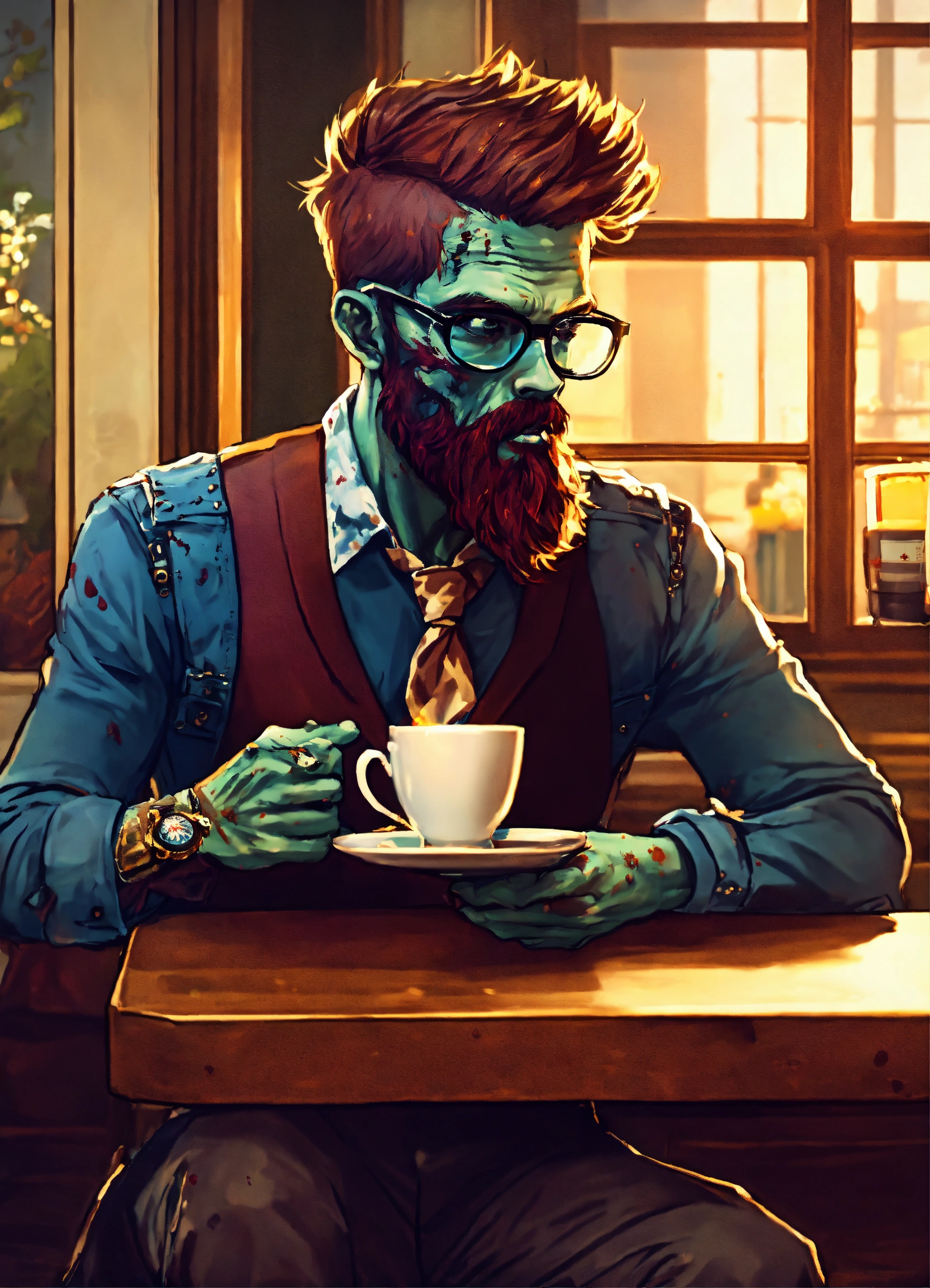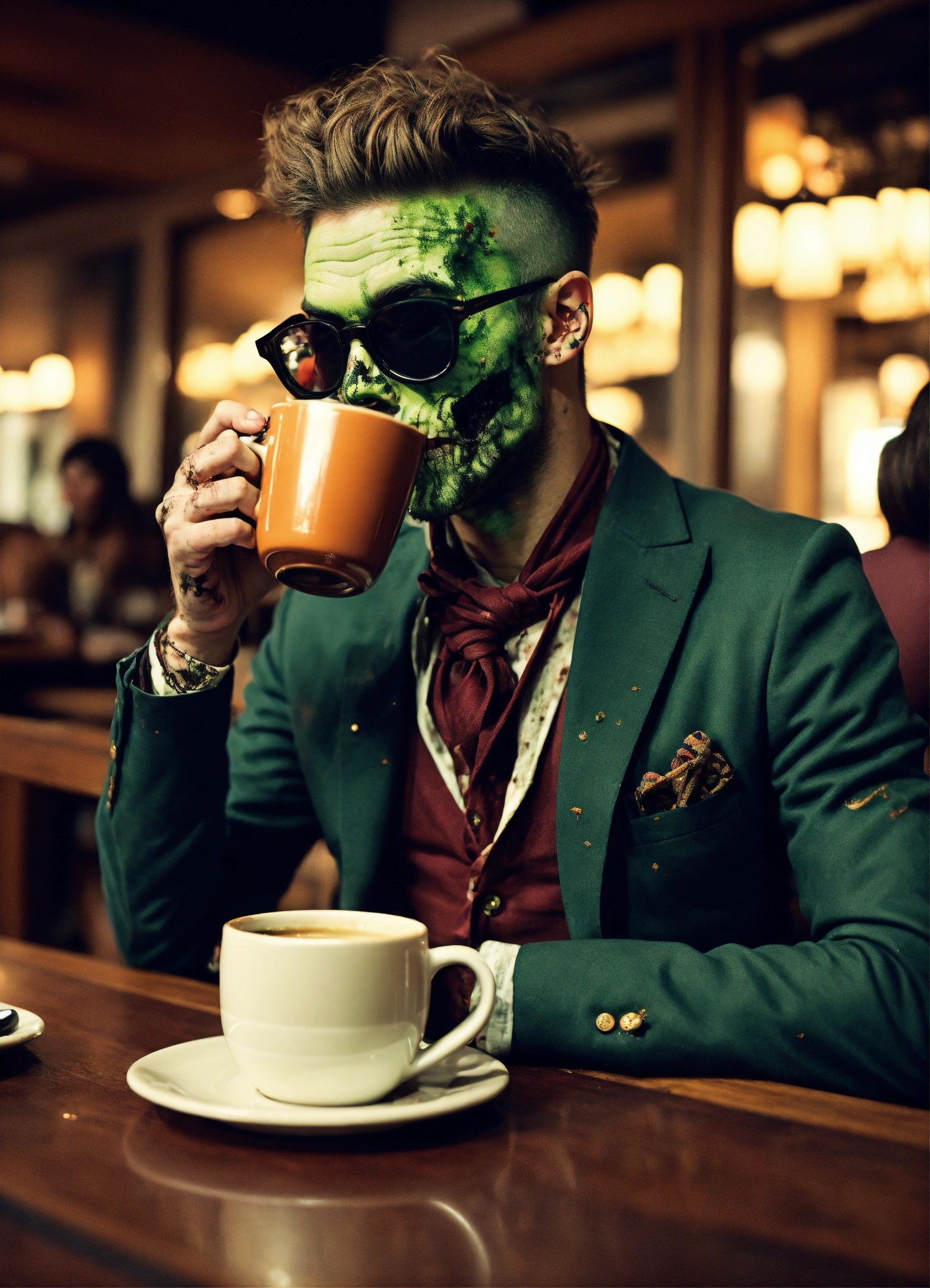 Hipster zombie with no beard drinking coffee at a fancy restuarant