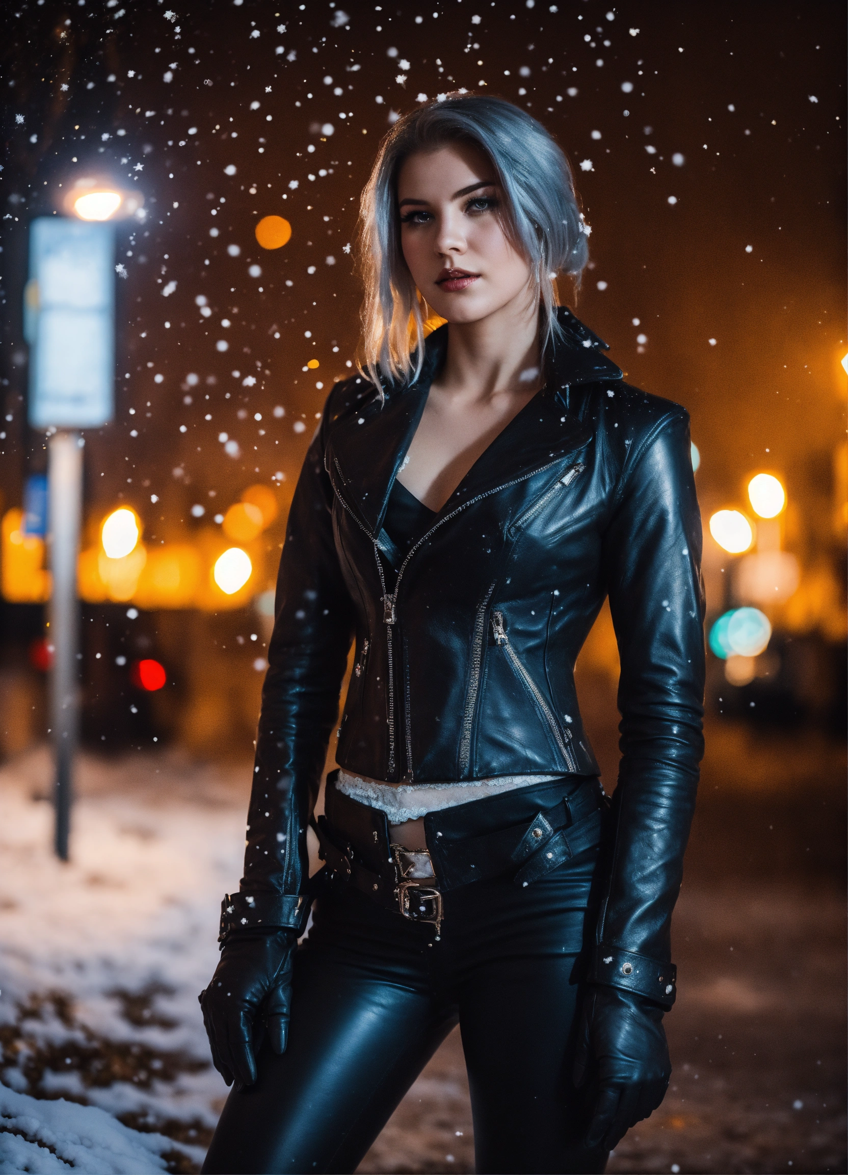 A real photo of a 25 year old metal woman with looking like a real version of cinderella, wearing black leather jacket pants corsets and gloves. urban background in the sky we see stars. full body snow at night.