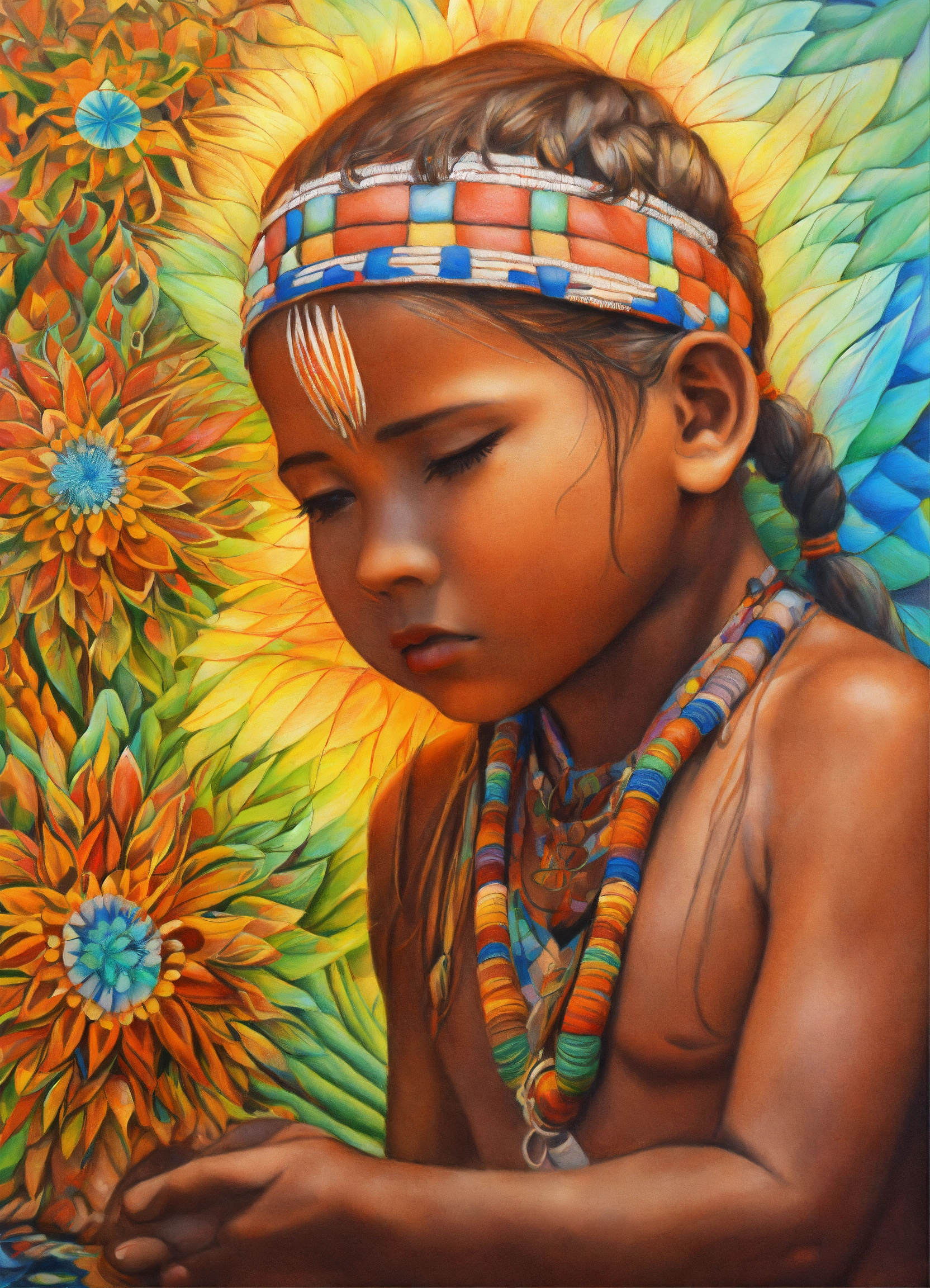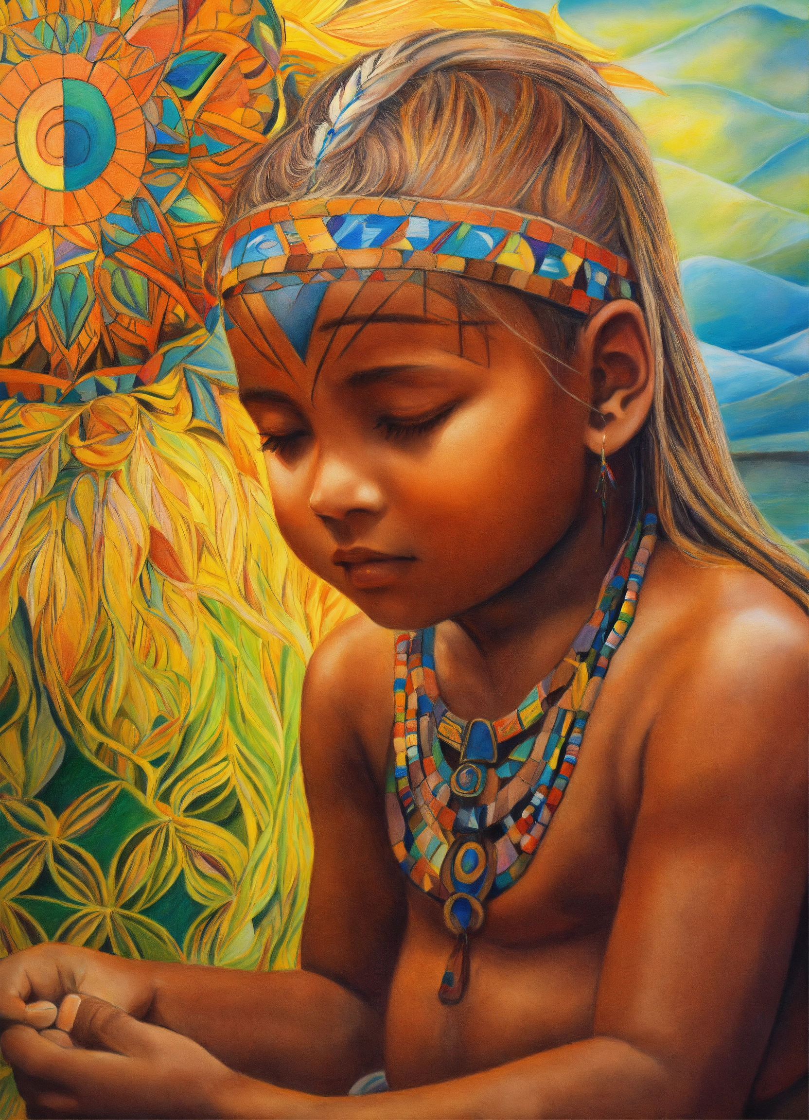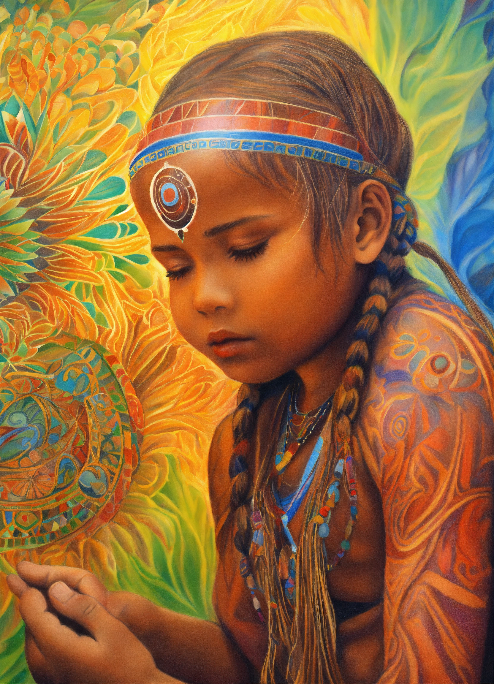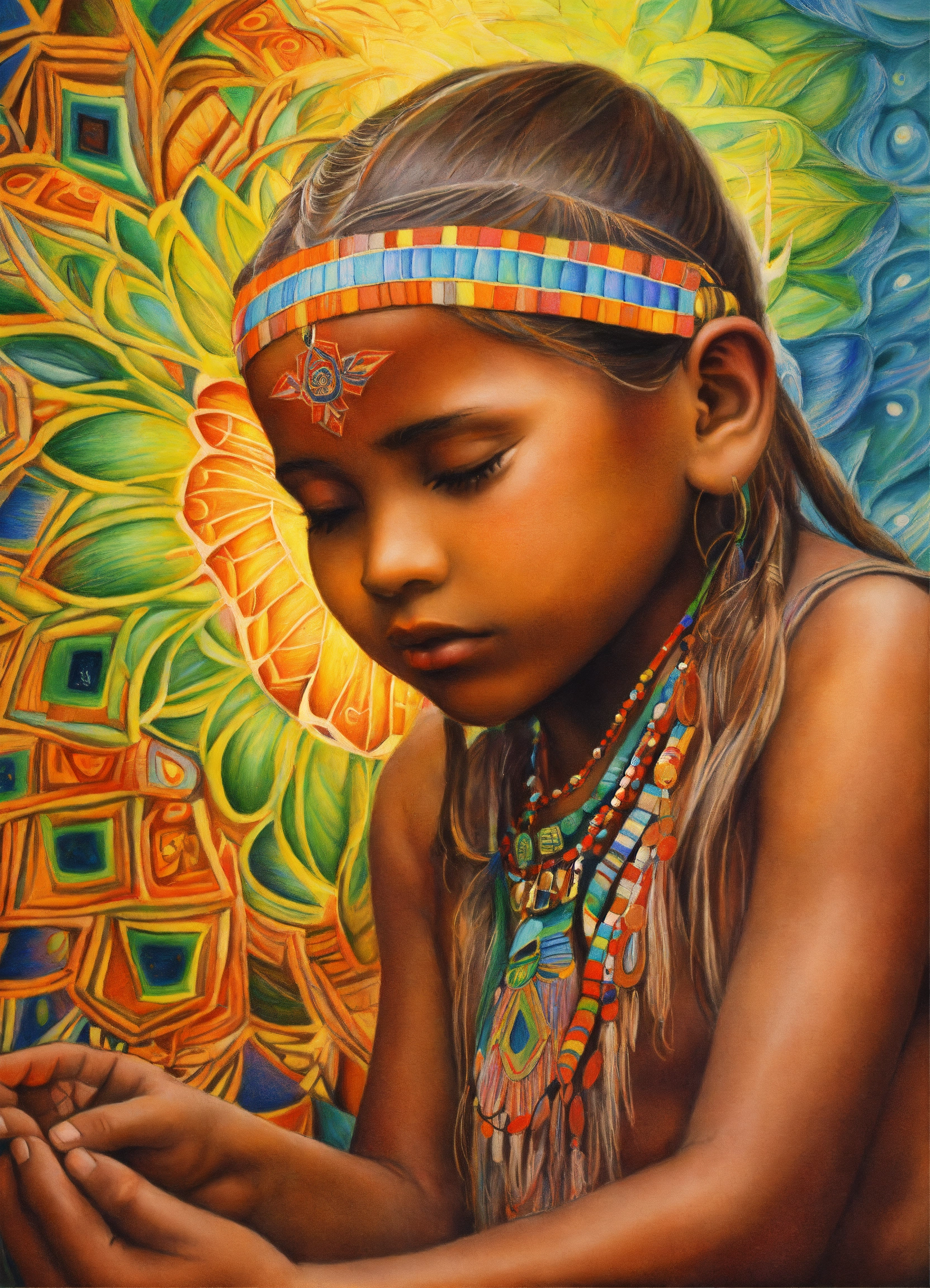 Colored pencil drawing of an indigenous healer, painting the forehead of a beautiful indigenous child. fractals. spiritual art.