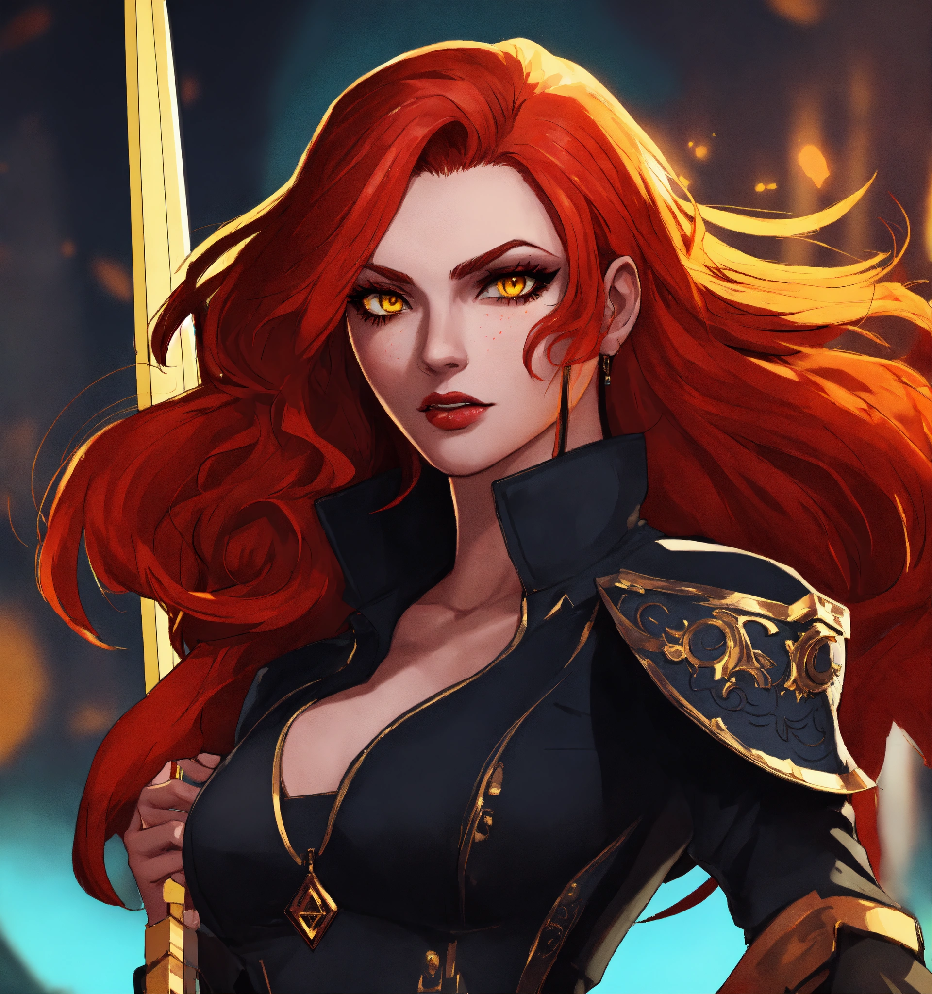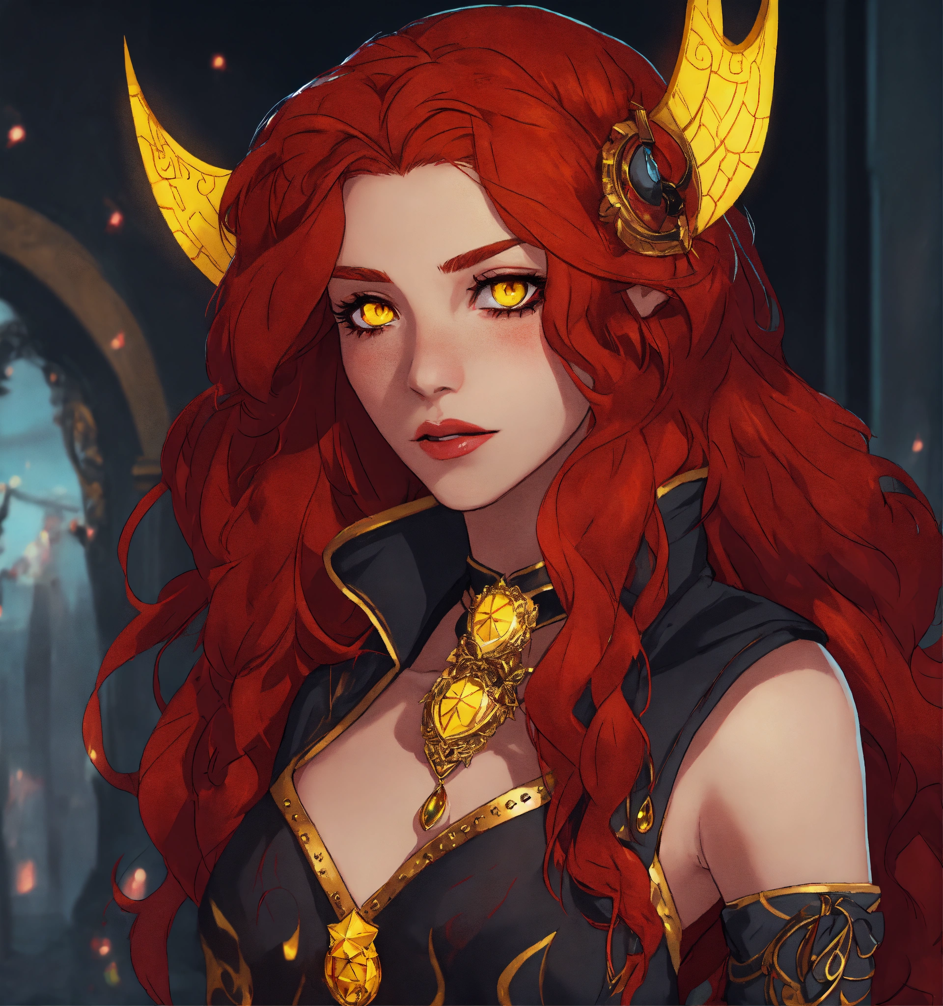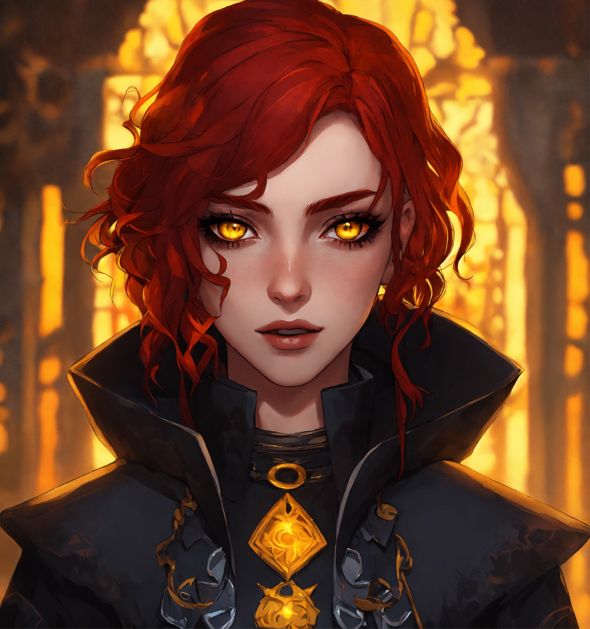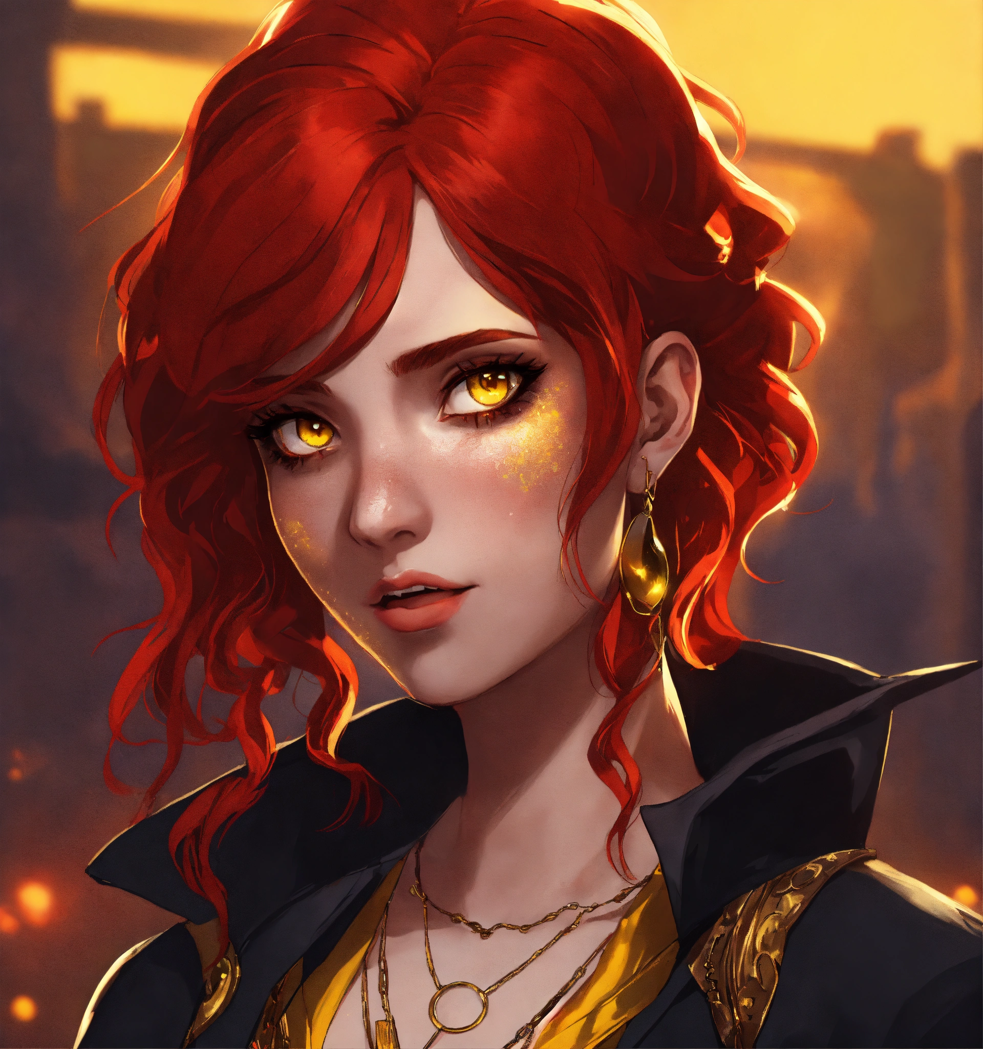 A goth red haired girl with yellow eyes