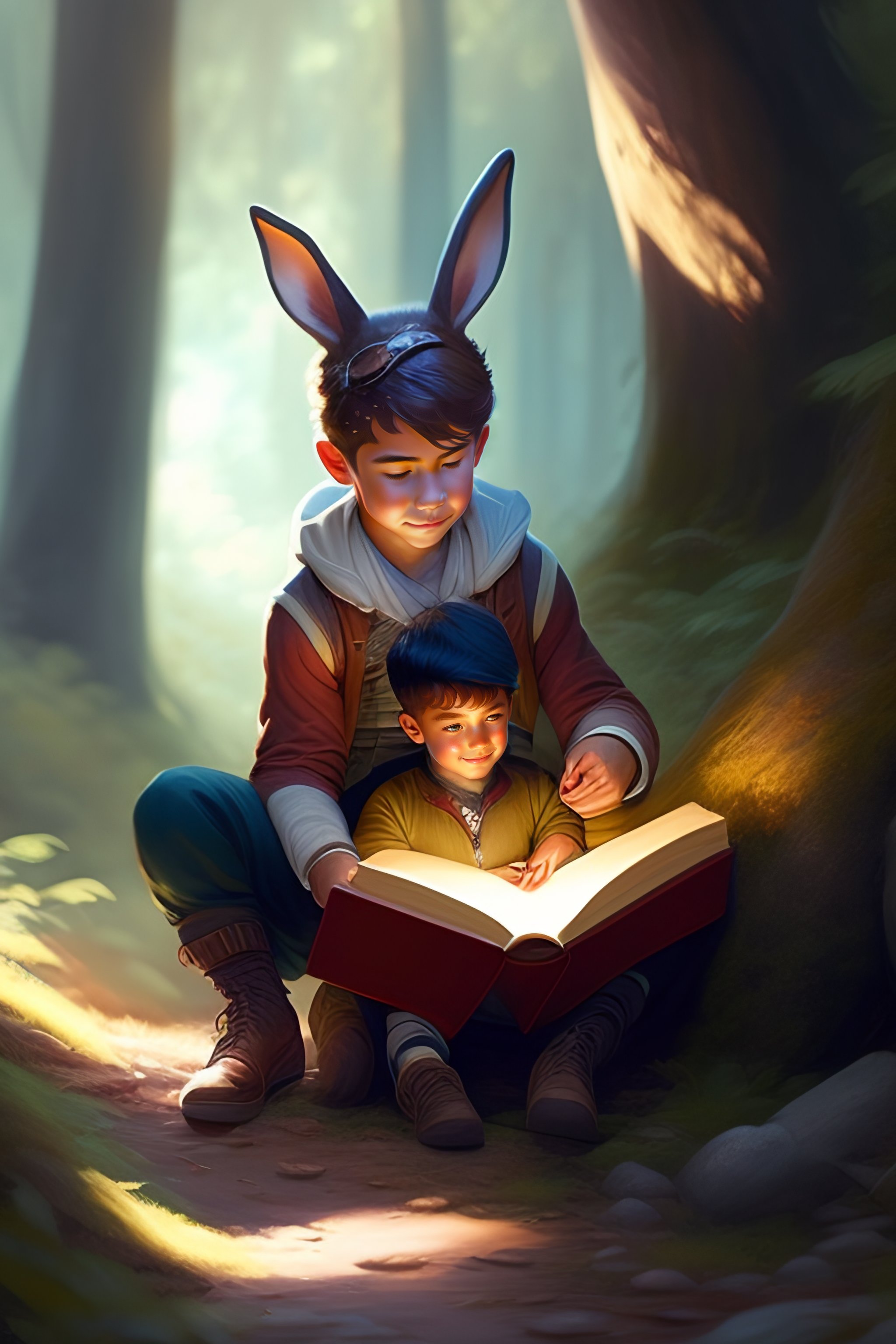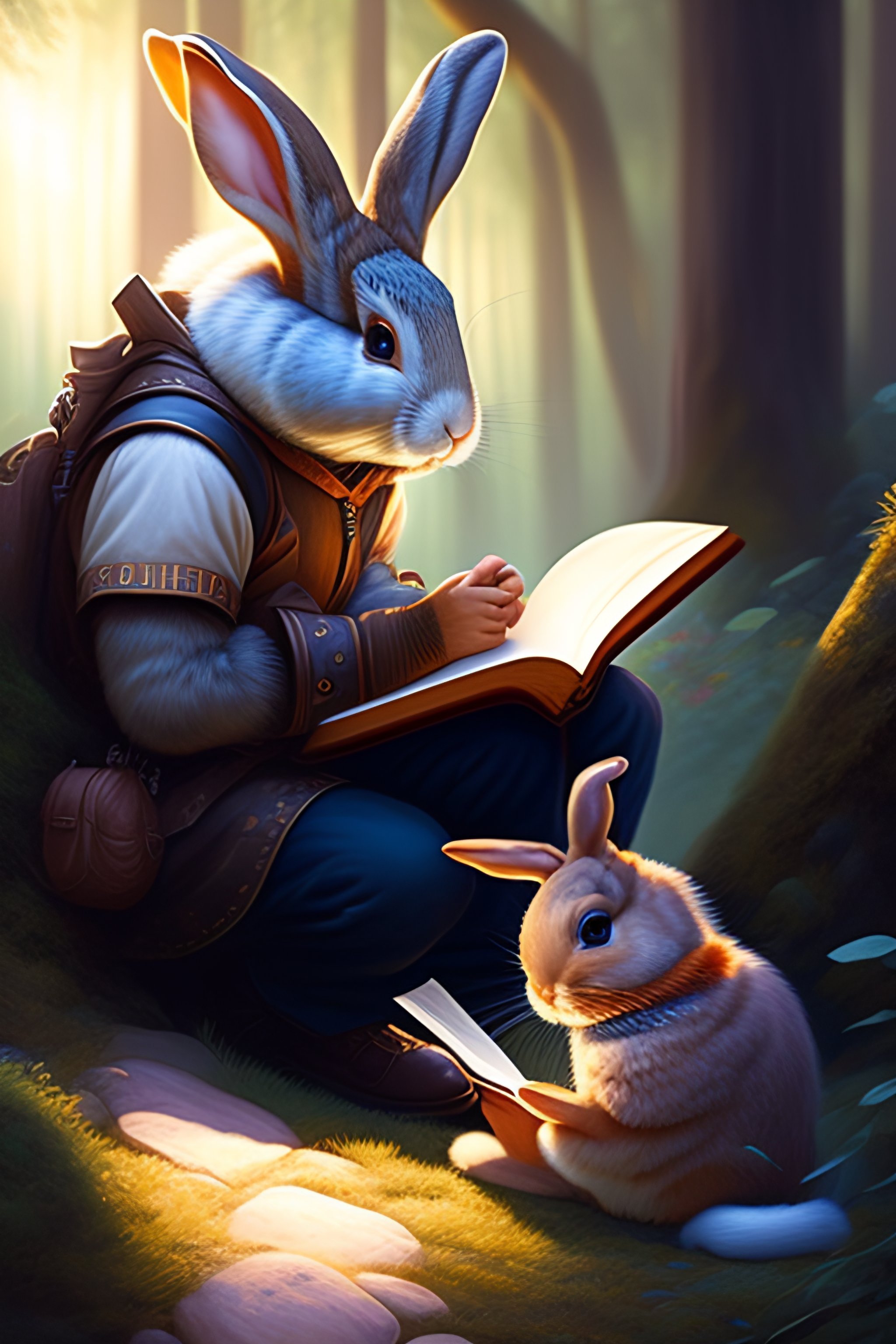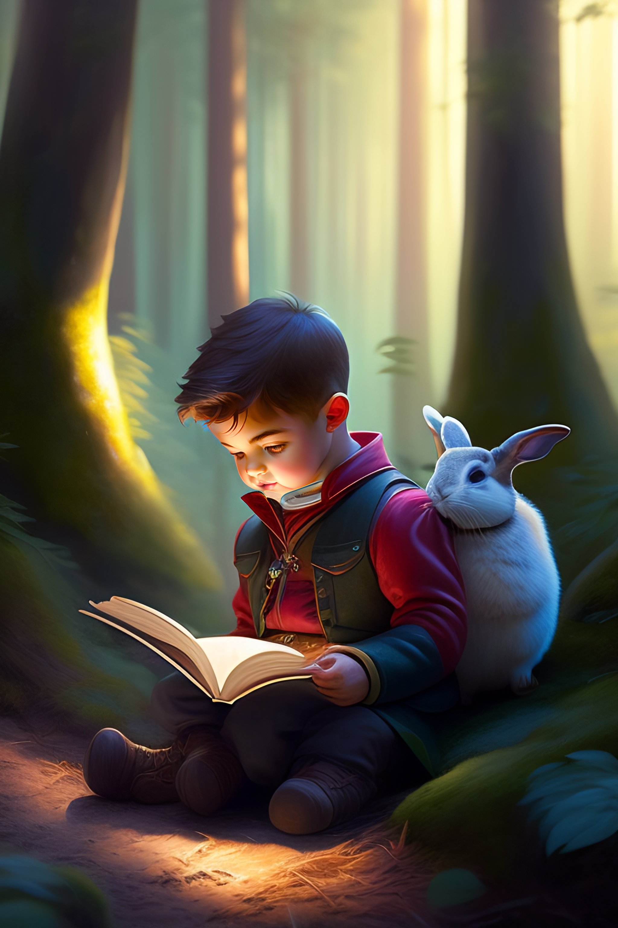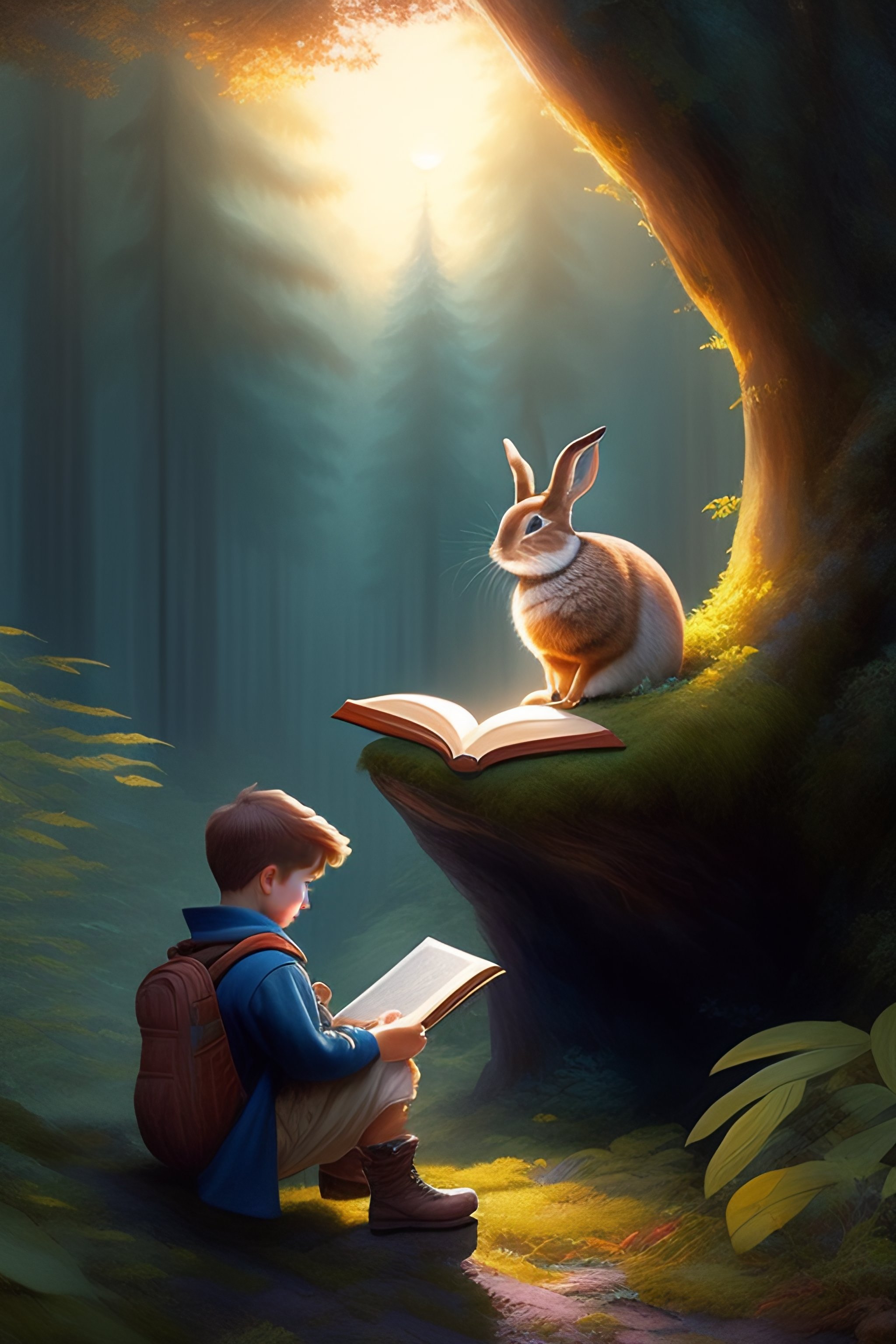 Boy reading a book to a rabbit, watching the rabbit reading the book to him, epic adventure, fantasy, magic, digital matte painting by steve henderson and mark brooks (and greg rutkowski), extremely detailed, artstation in a forest