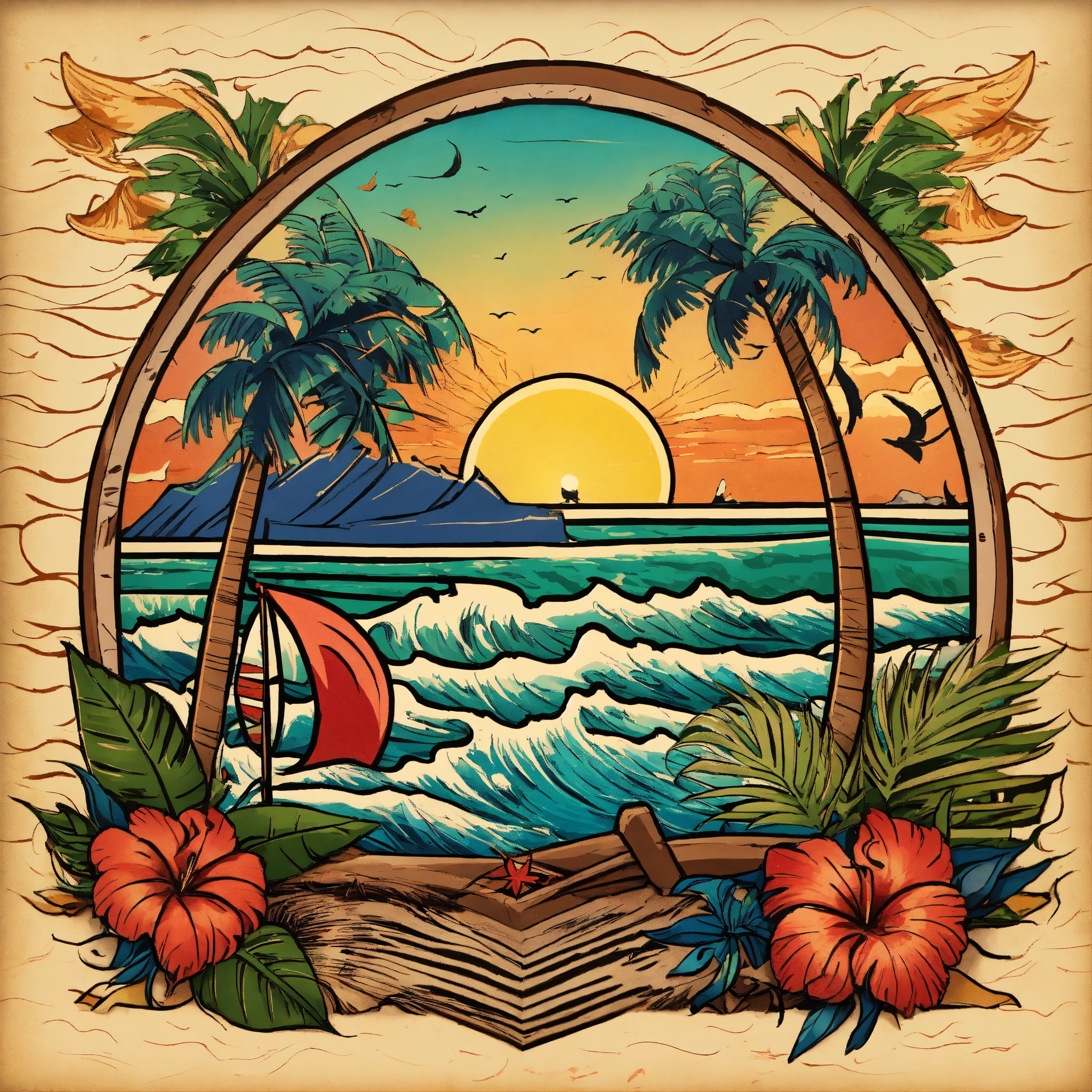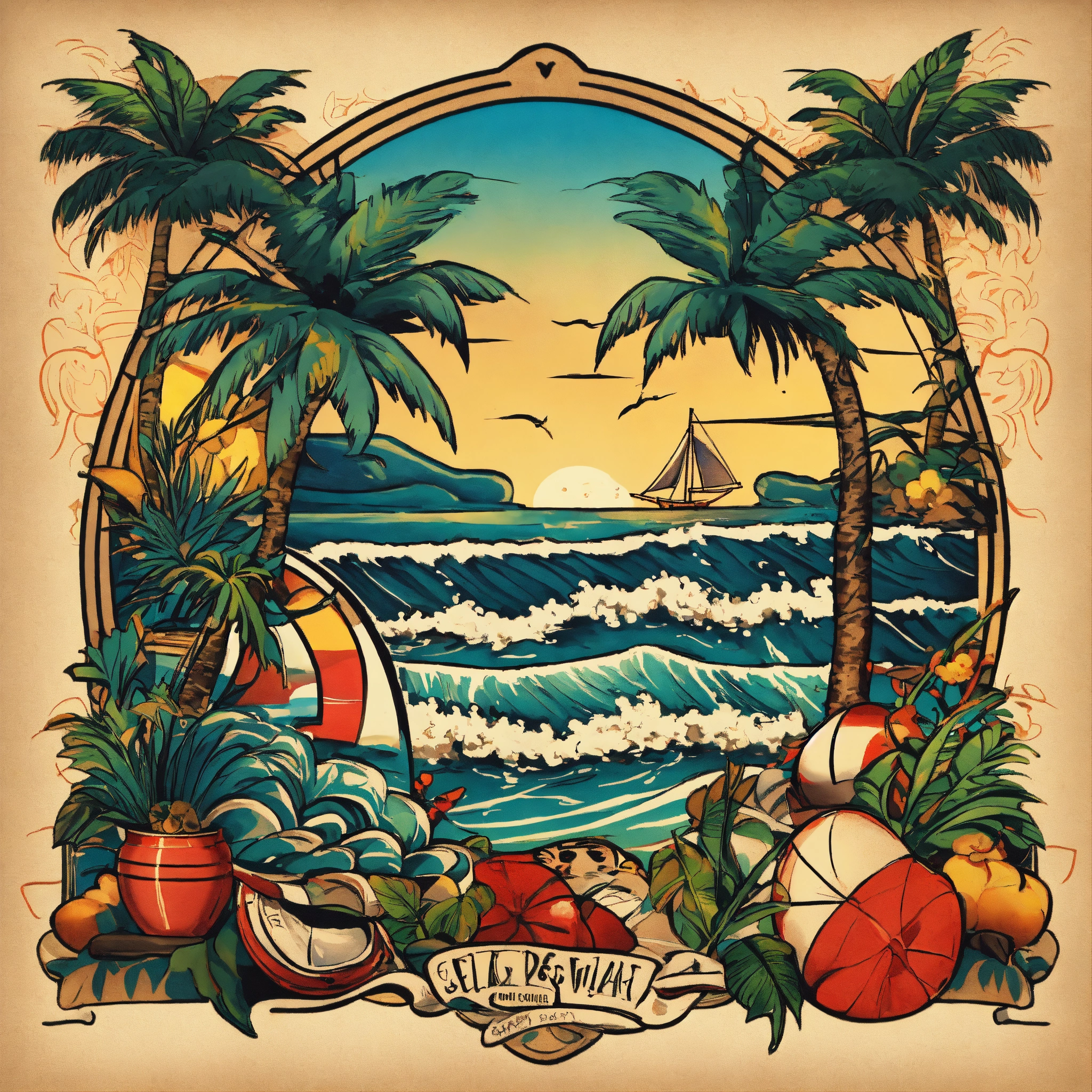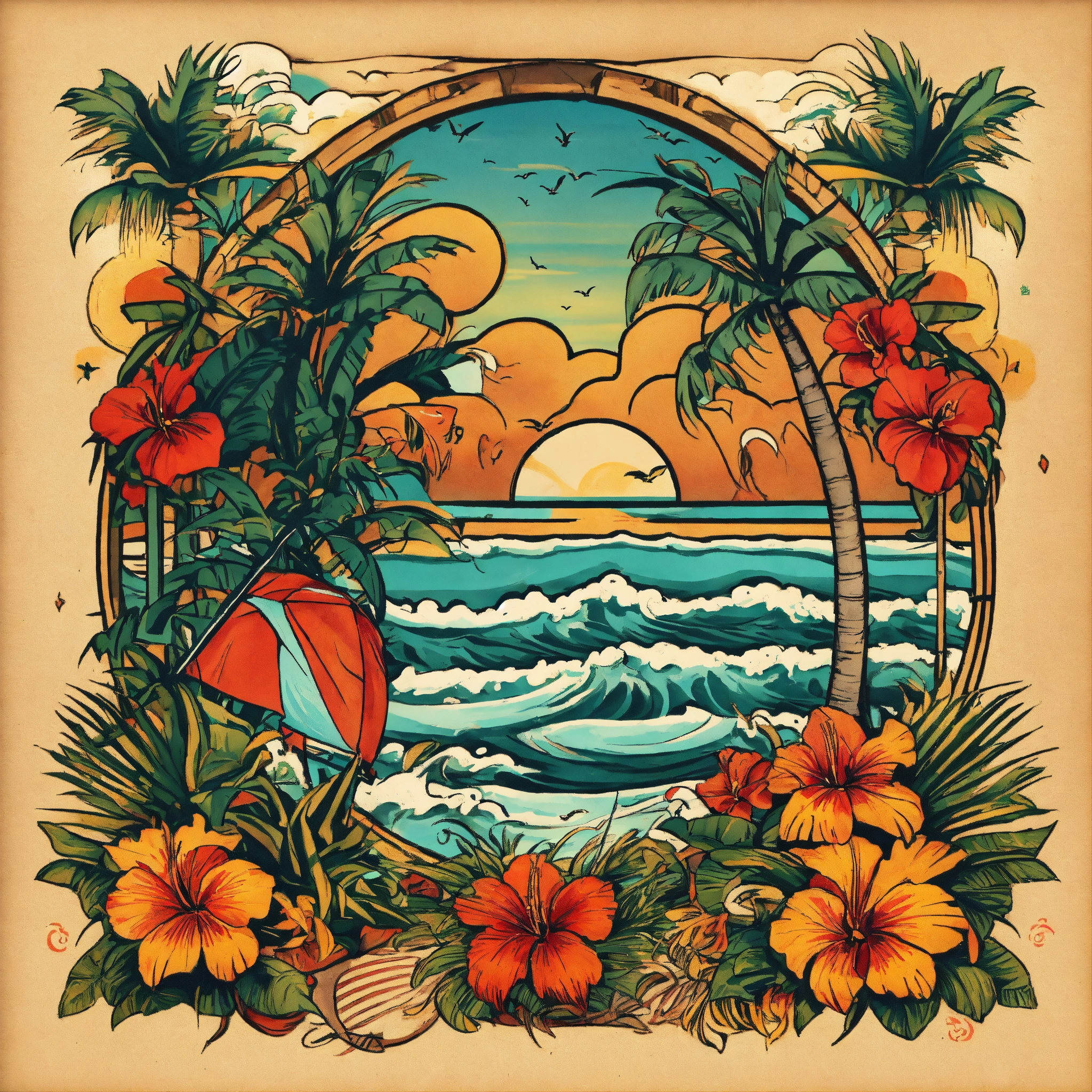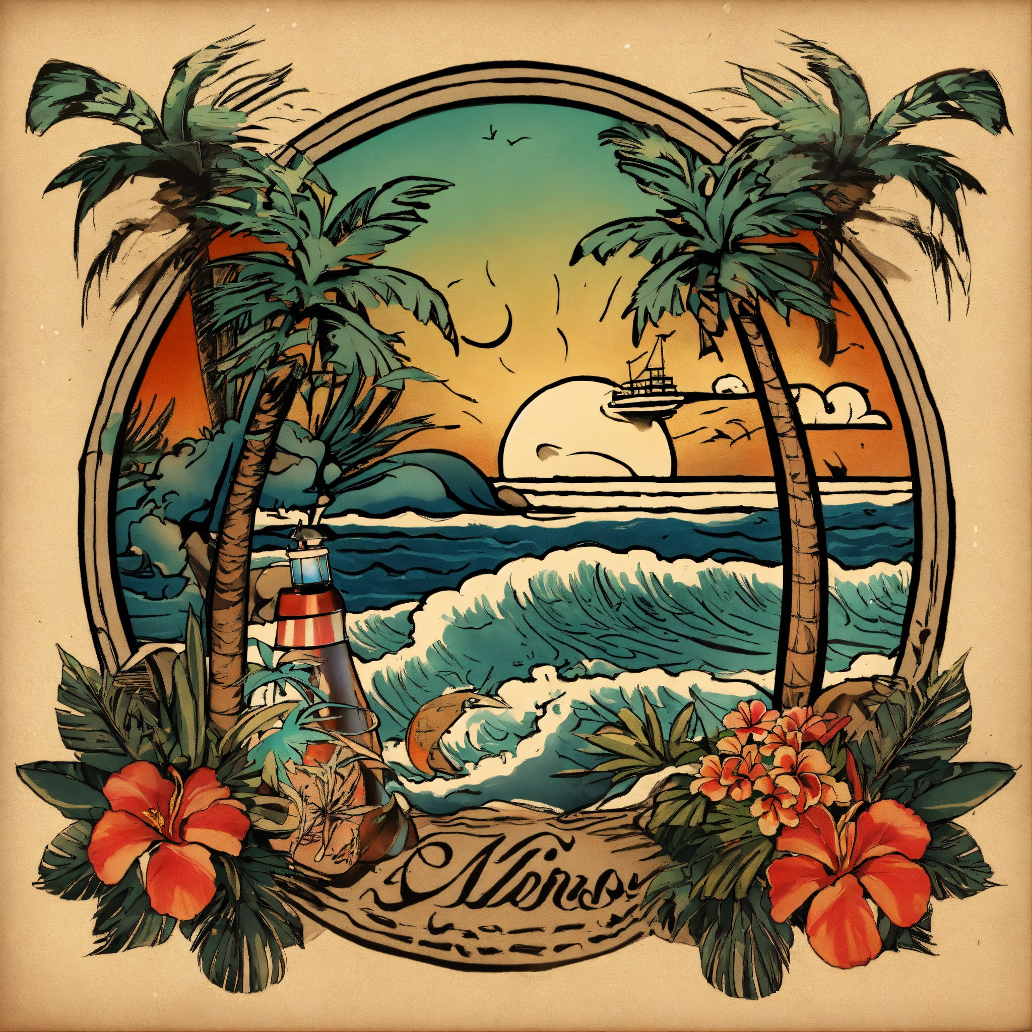 Artistic image type of image tattoo art-inspired digital illustration prompt description create a stunning digital illustration that takes inspiration from the iconic sailor jerry tattoo art style, featuring a beach scene with palm trees, ocean waves, and a lush tropical setting. the artwork will capture the essence of traditional tattoo art with its bold lines and classic motifs, infused with the allure of a tropical paradise.