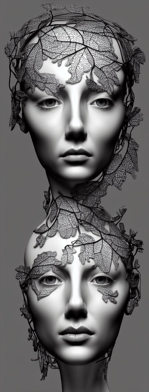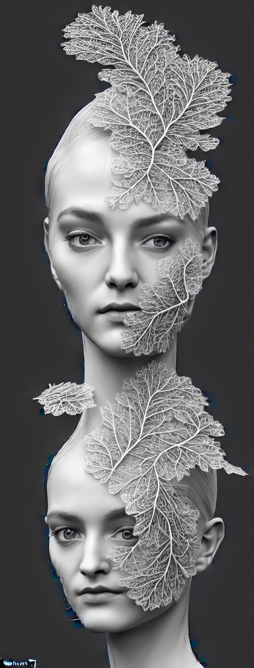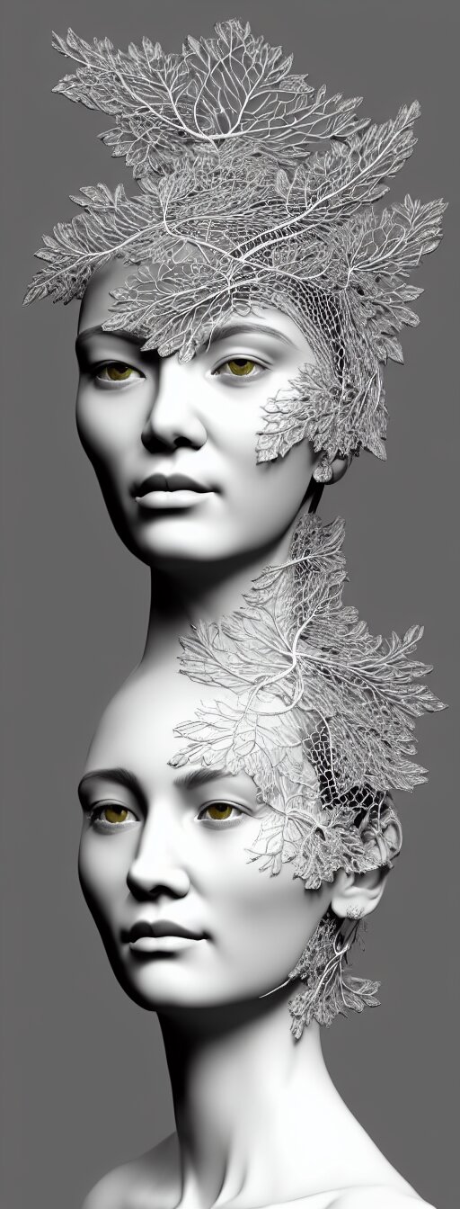Complex 3d render ultra detailed of a beautiful porcelain profile woman face, black eyes, vegetal dragon cyborg, 150 mm, beautiful natural soft light, rim light, silver vanilla details, neural network, synapsis, magnolia big leaves and stems, roots, fine foliage lace, maze like, mesh wire, hyperrealistic, ultra detailed, mandelbrot fractal, anatomical, white metal neocubism armor, facial muscles, cable wires, microchip, elegant, octane render, black and white, h.r. giger style