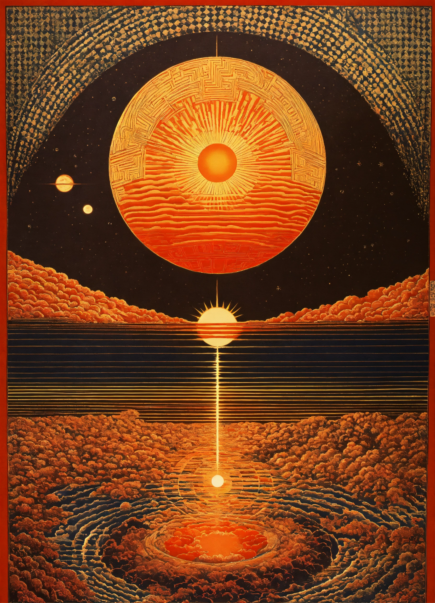 Japanese vintage poster, oriental, sun merging into moon, psychedelic, nebula, the four corners of the cosmos, checkerboard patterns, monochrome by alex grey