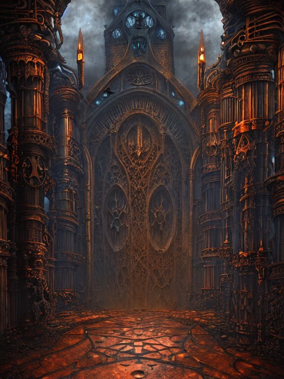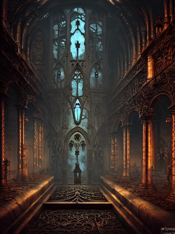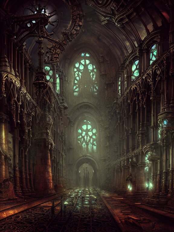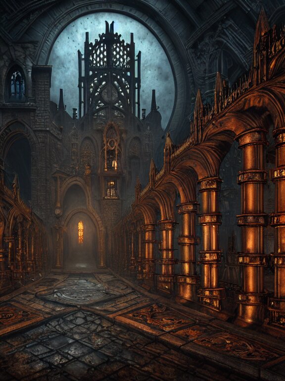 Steam necropolis, memento mori, gothic, neo - gothic, art nouveau, hyperdetailed copper patina medieval icon, stefan morrell, philippe druillet, ralph mcquarrie, concept art, steampunk, unreal engine, detailed intricate environment, octane render, moody atmospherics, volumetric lighting, ultrasharp, ominous, otherworldly