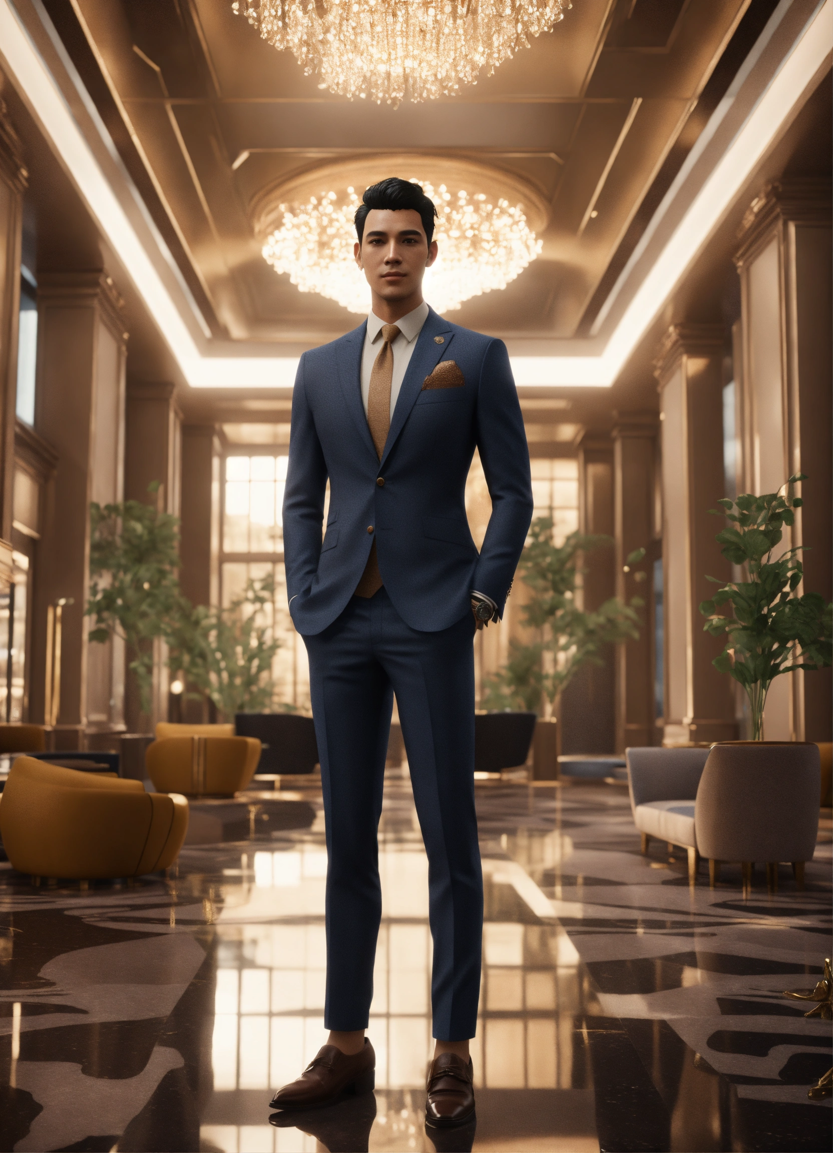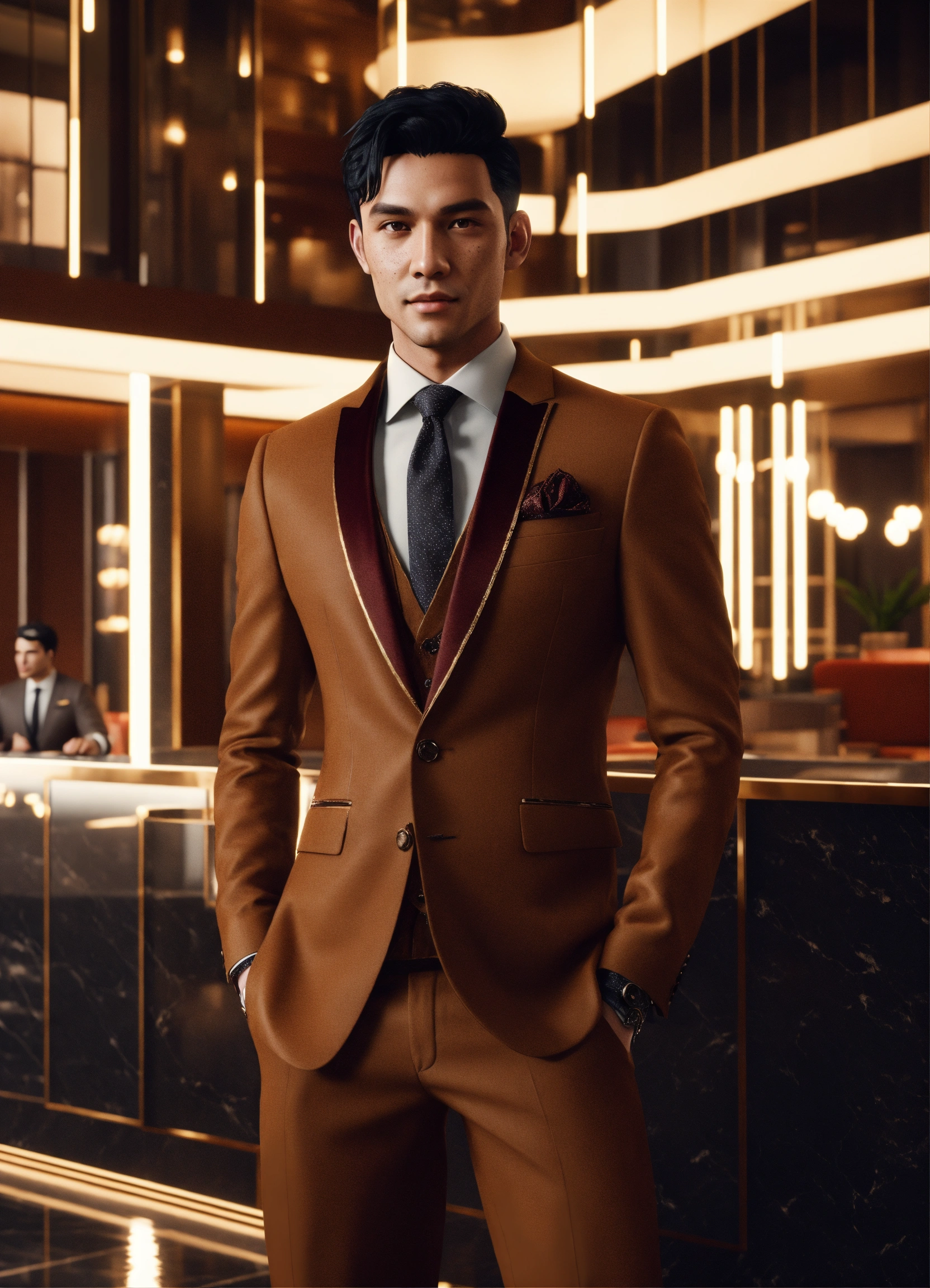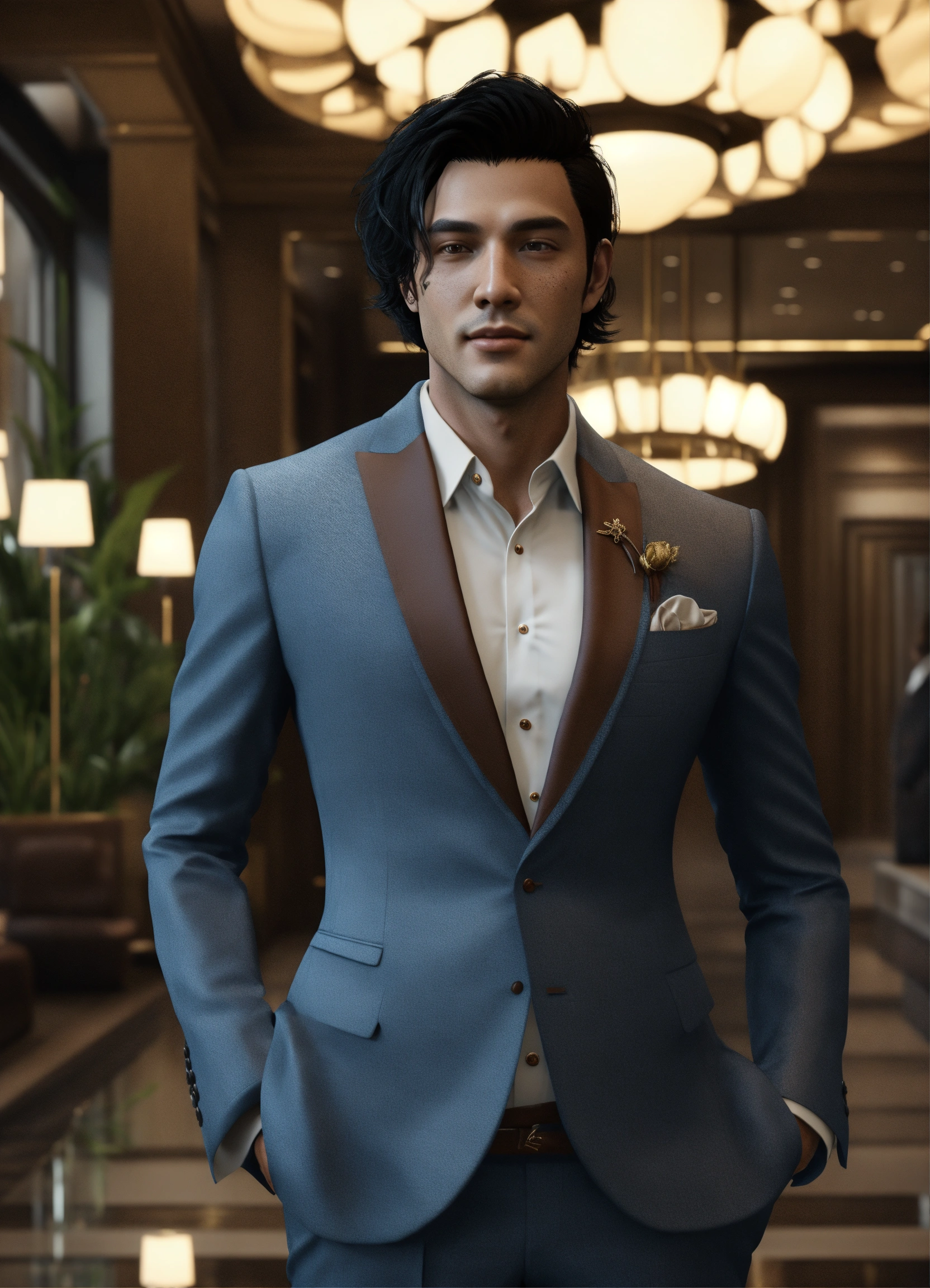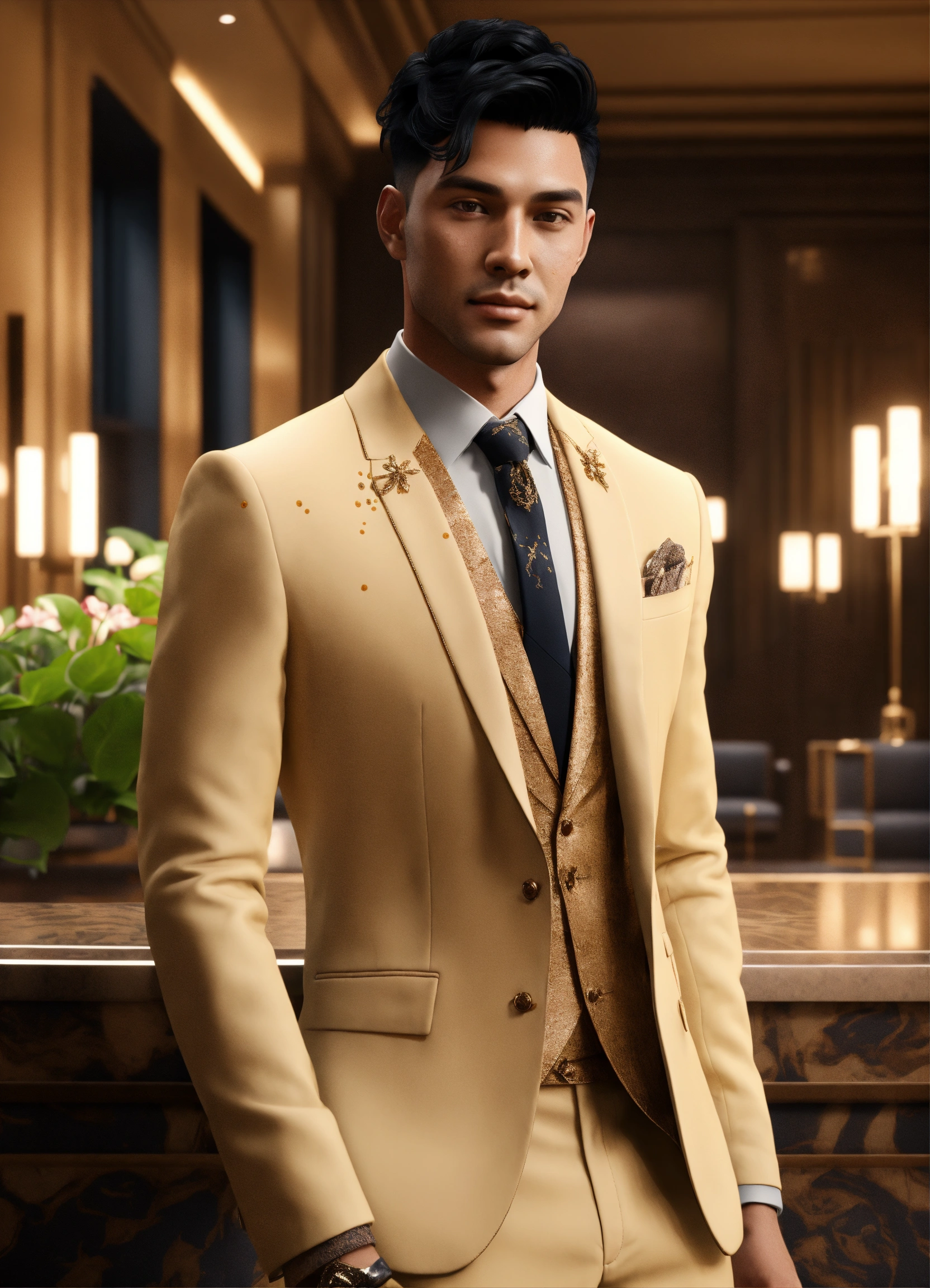 Handsome alien college student, black hair, dimple chin, brown spots, in haute couture suit, in upscale lobby, 8k, unreal engine