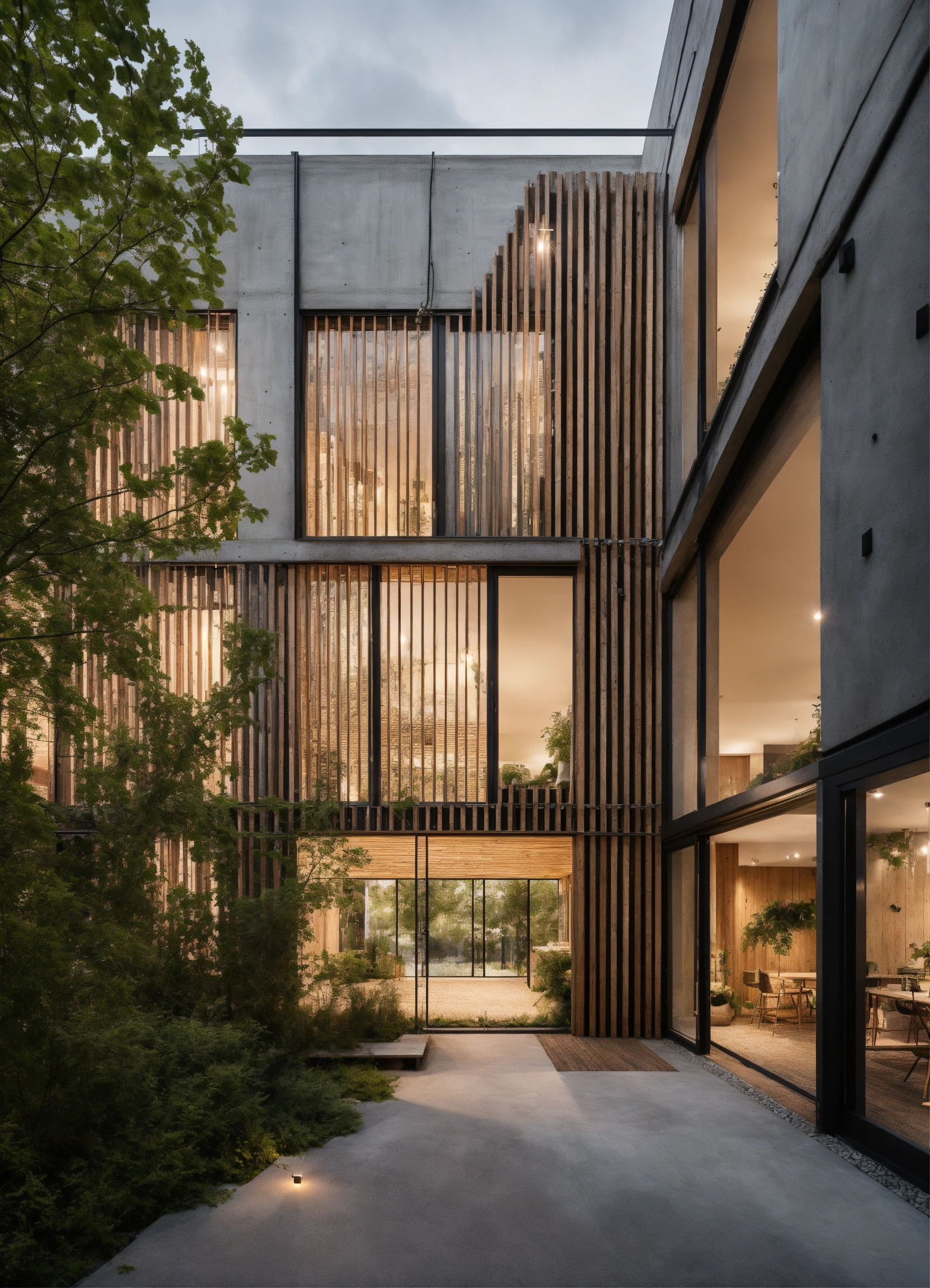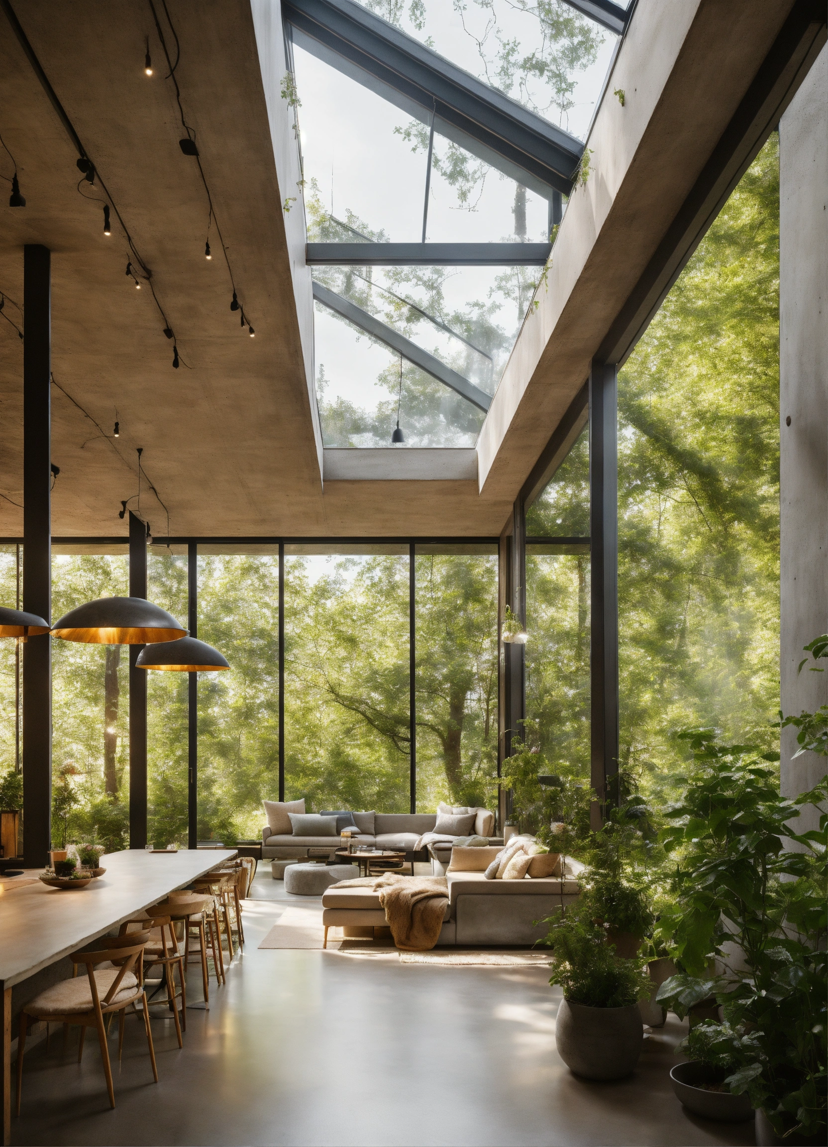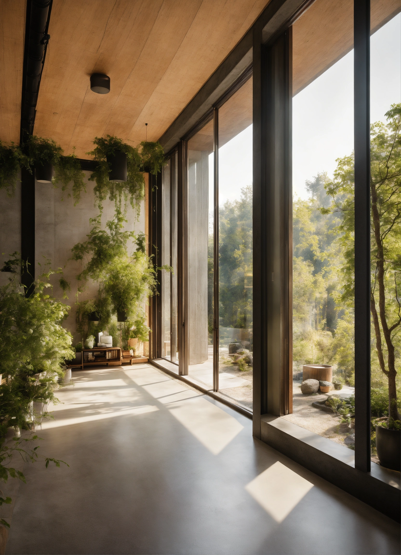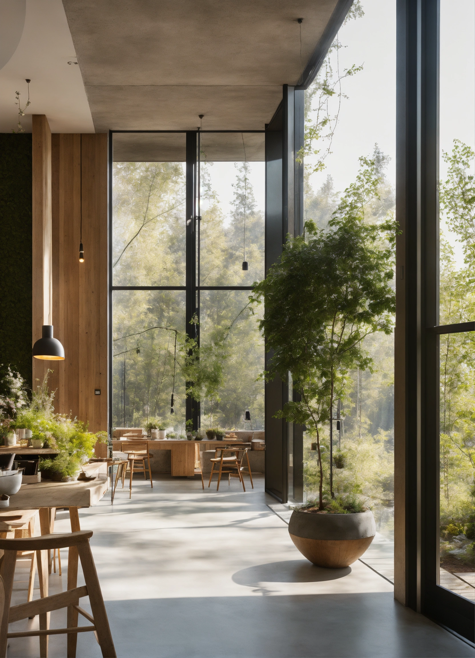 A well-lit environment with large windows that allow natural light to enter. concrete, biophilic design, natural materials, light colours scandinavian lots of vegetation exterior