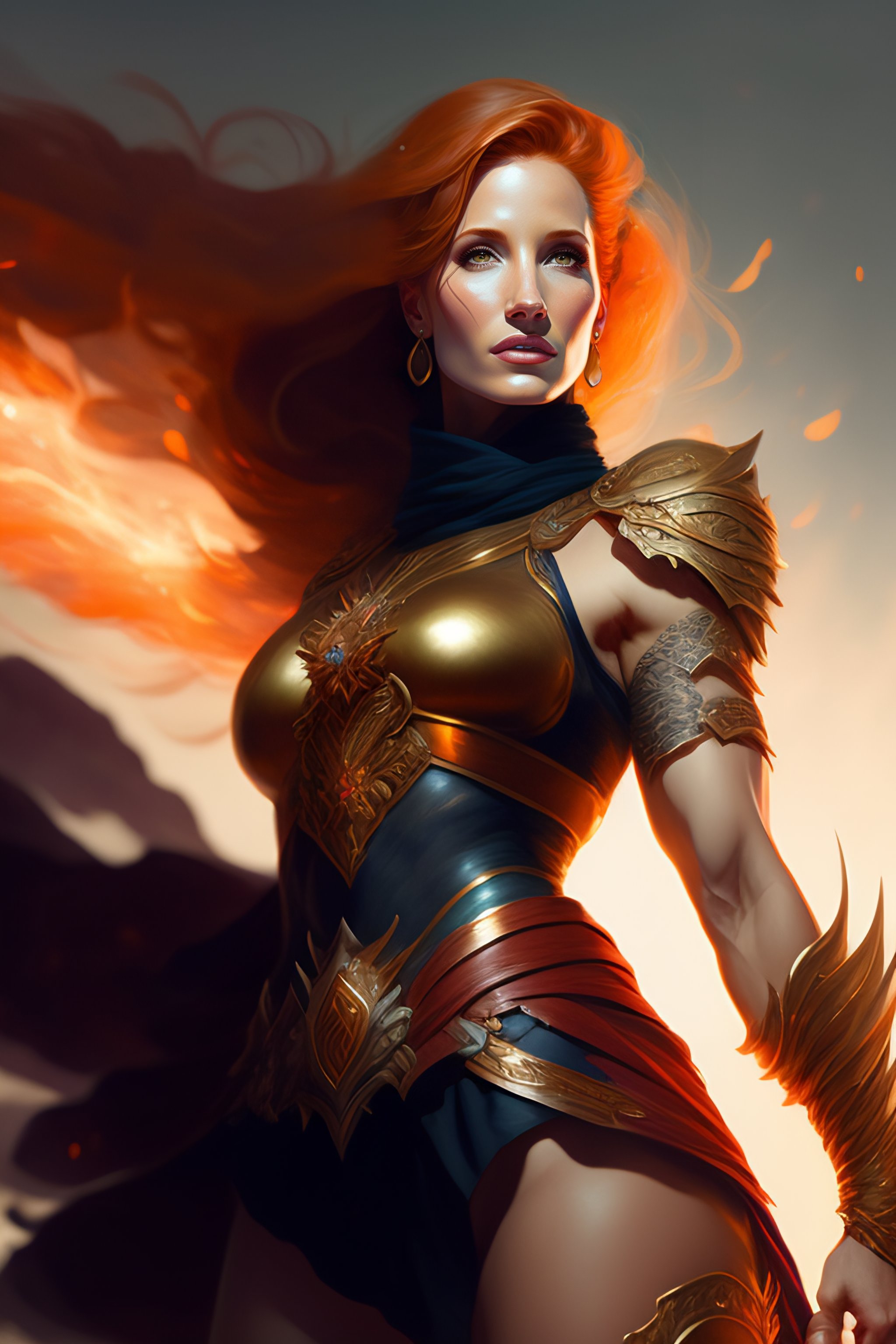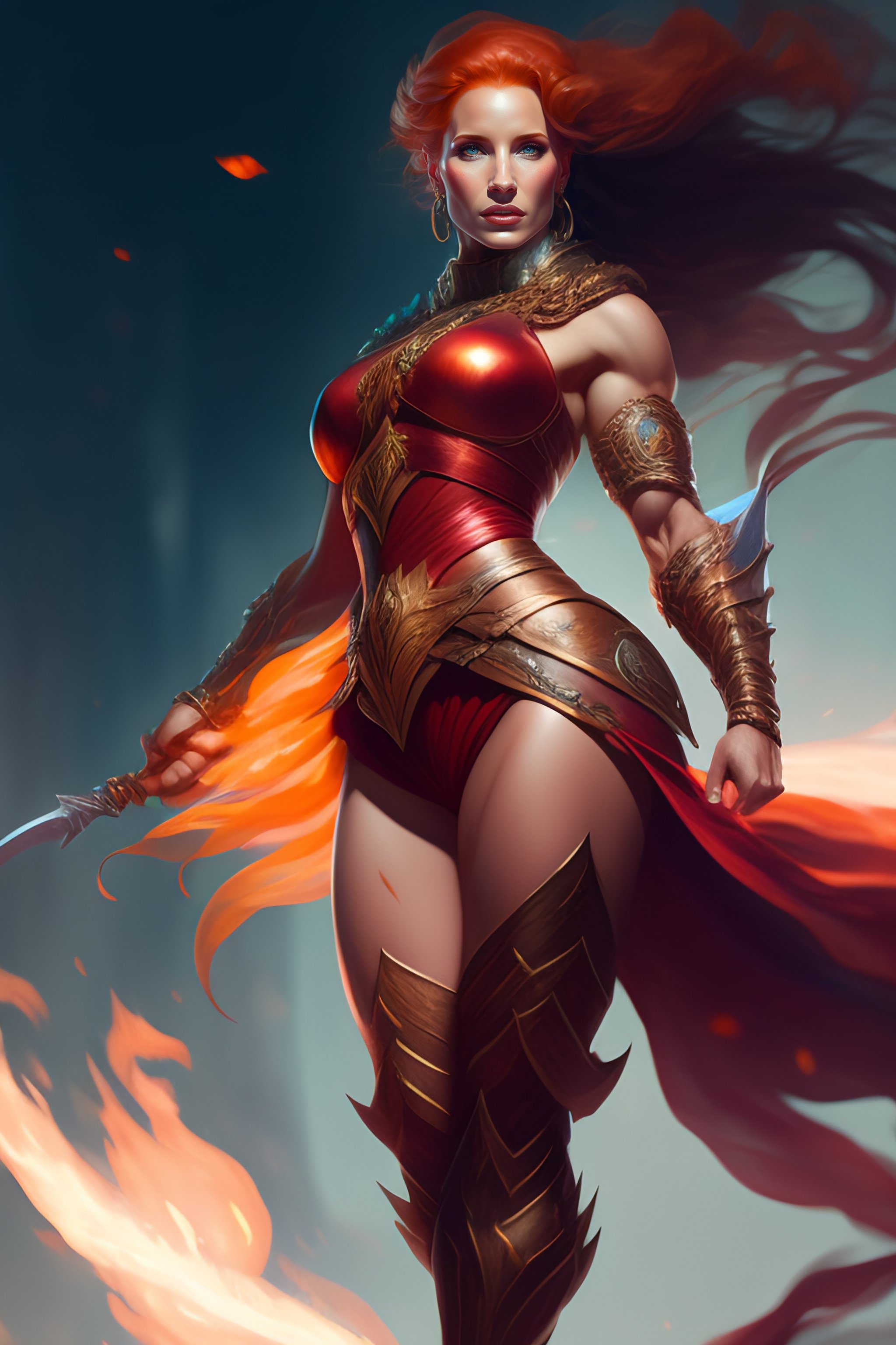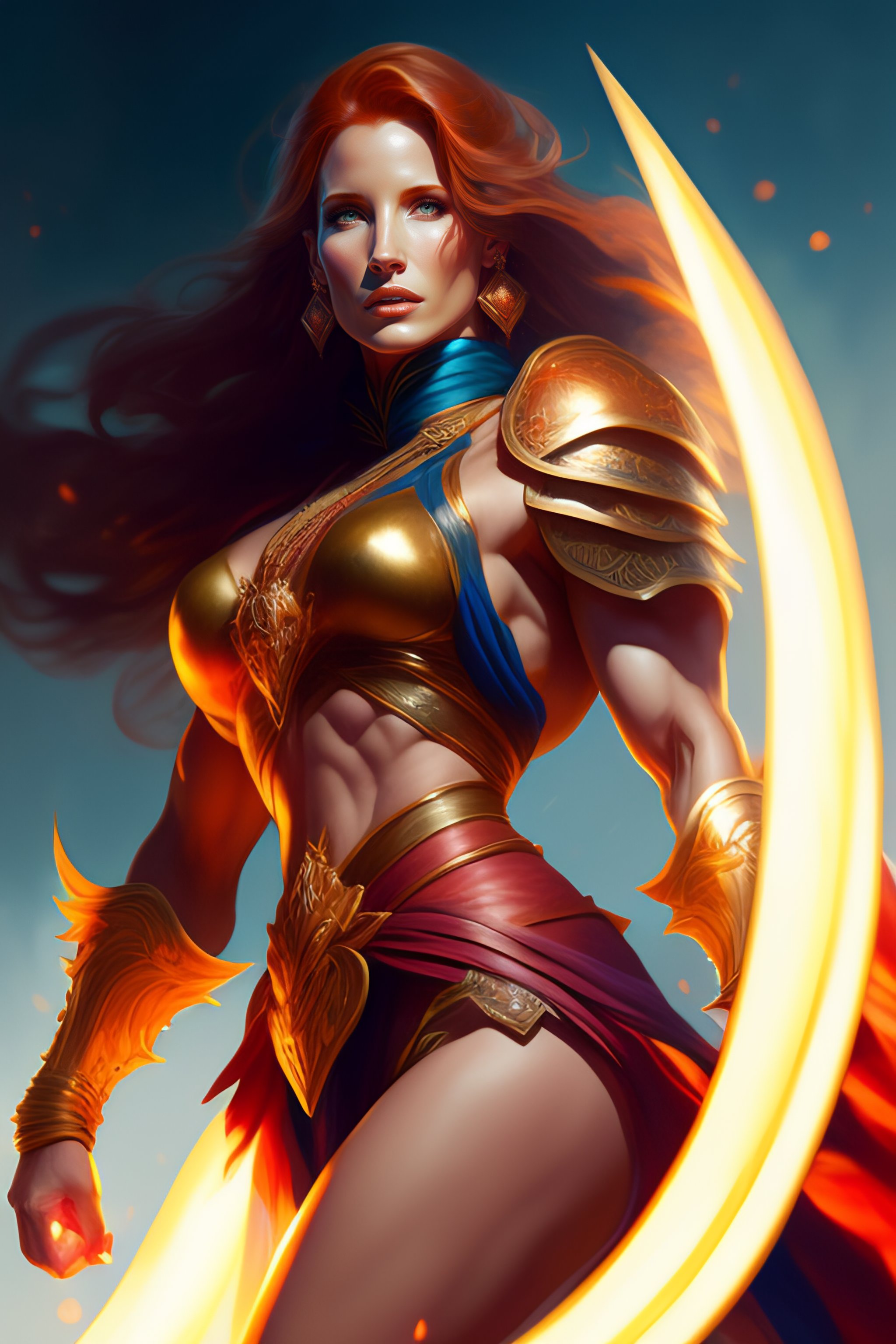 Full body potrait of muscular jessica chastain as rugged warrior sparying sword(flame) in air, muscular legs and six abs, highly detailed, digital painting, artstation, concept art, smooth, sharp focus, illustration, art by tian zi and wlop and alphonse mucha