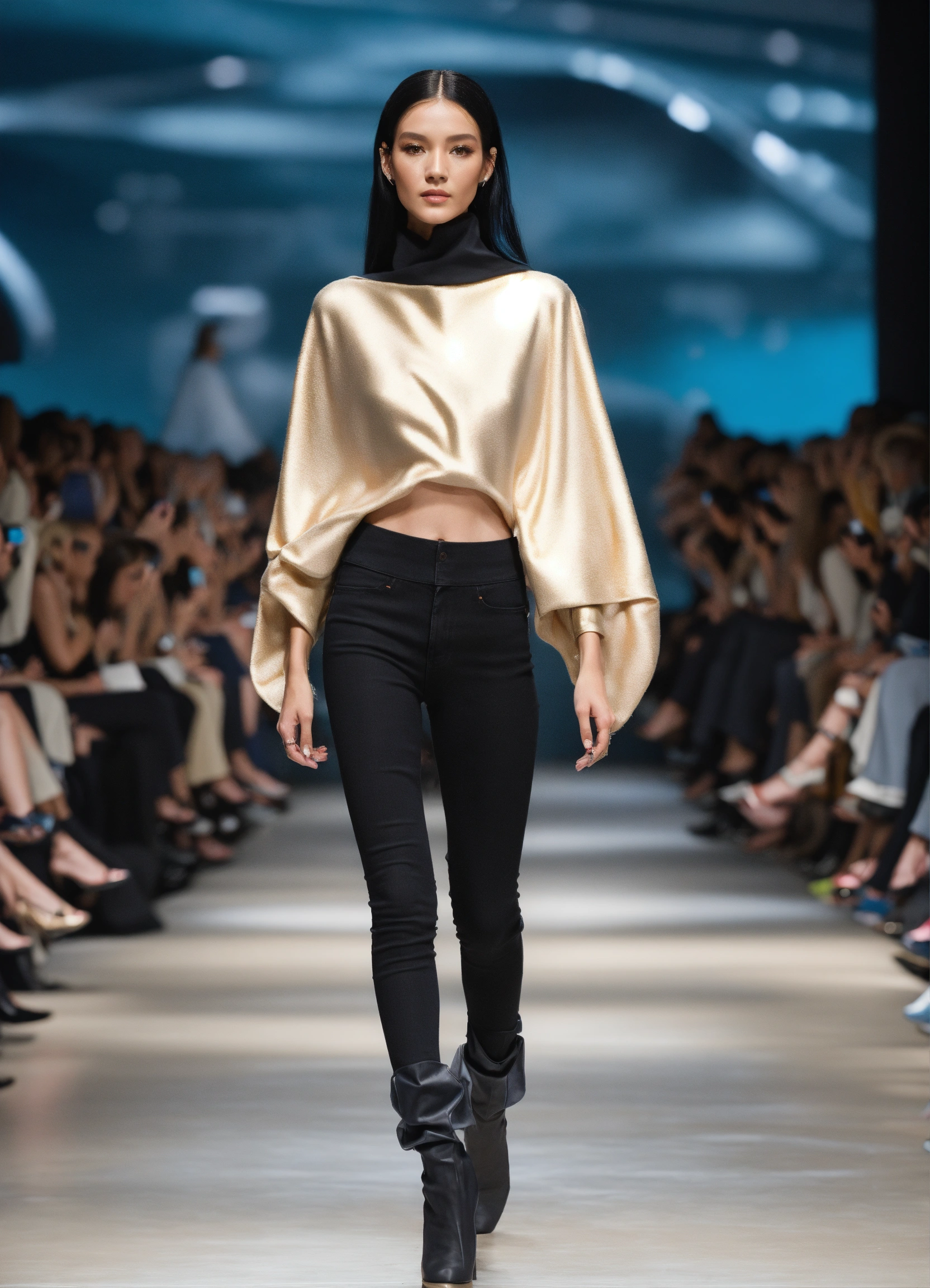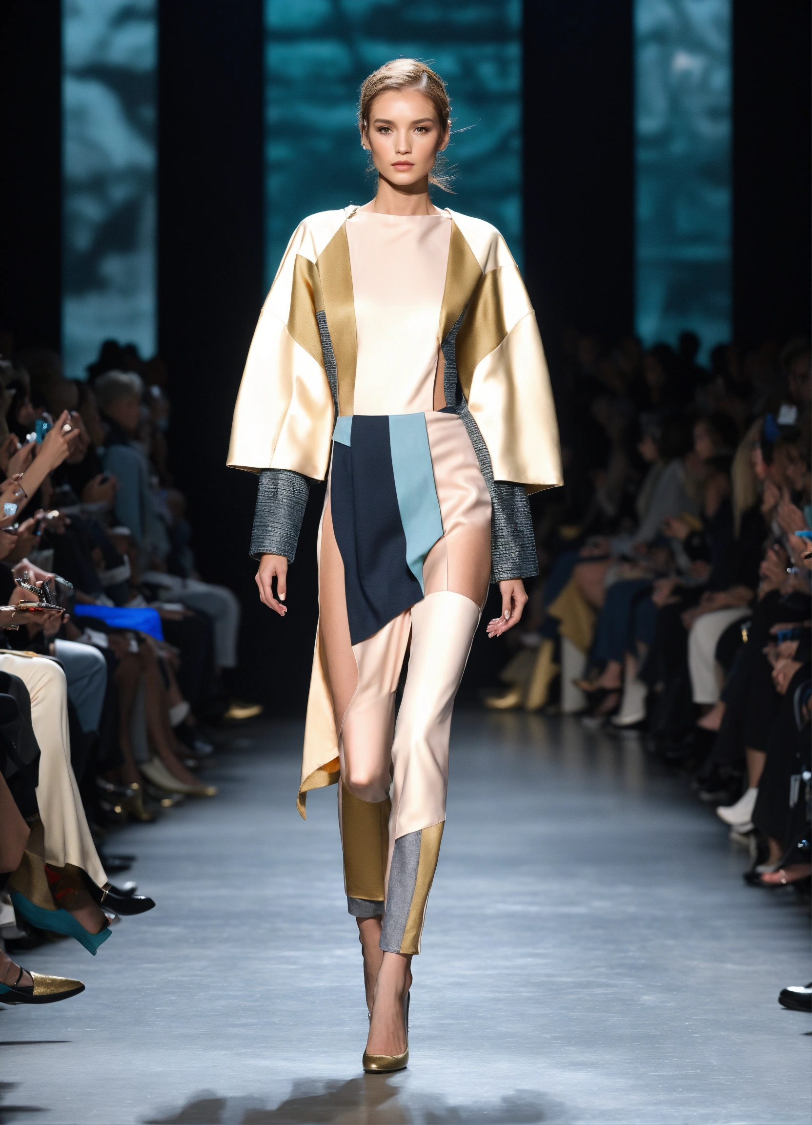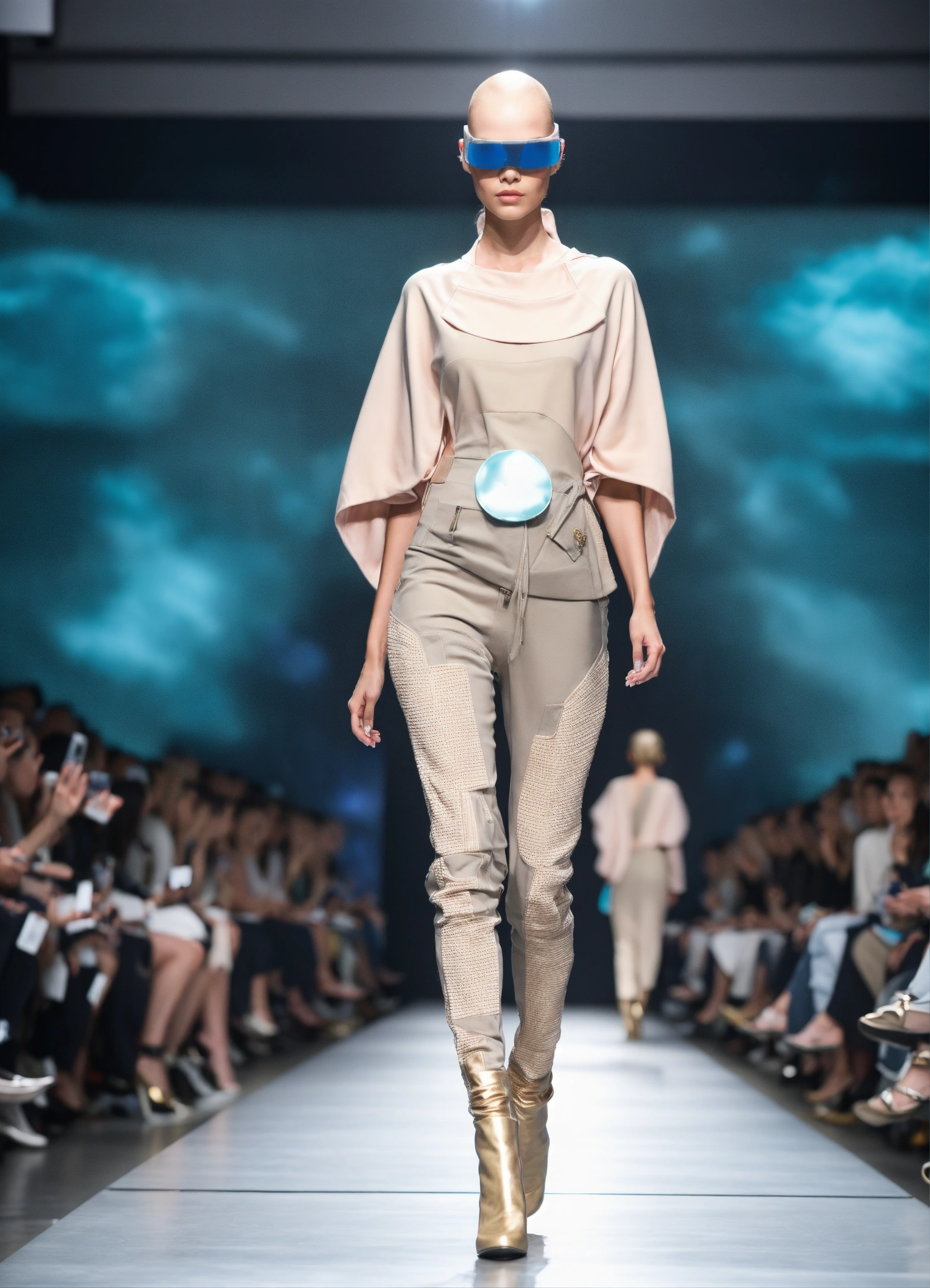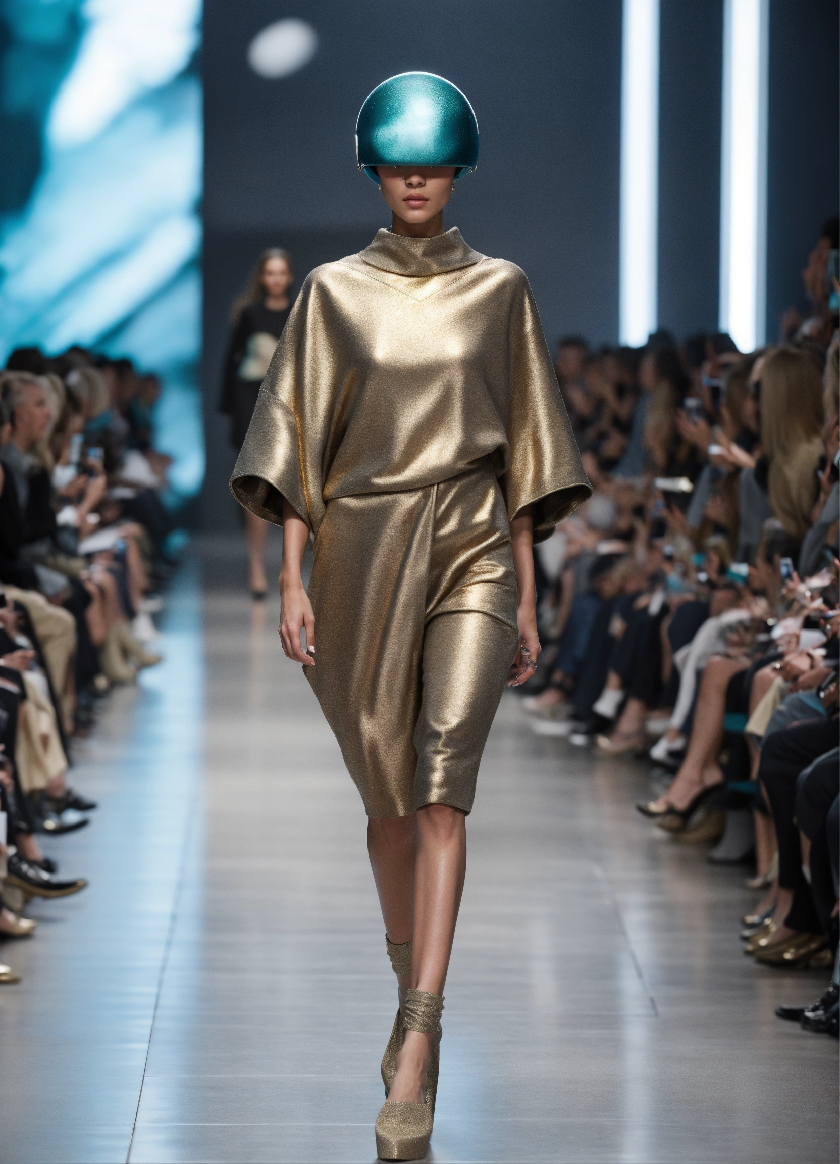 3d realistic photo of extraterrestrial alien looking creatures walking runway during space fashion week wearing dolman sleeve donna karan interstellar fashion in black, white, blush, grey, beige, stone, gold, denim, blue, teal walking a runway in 5he shire