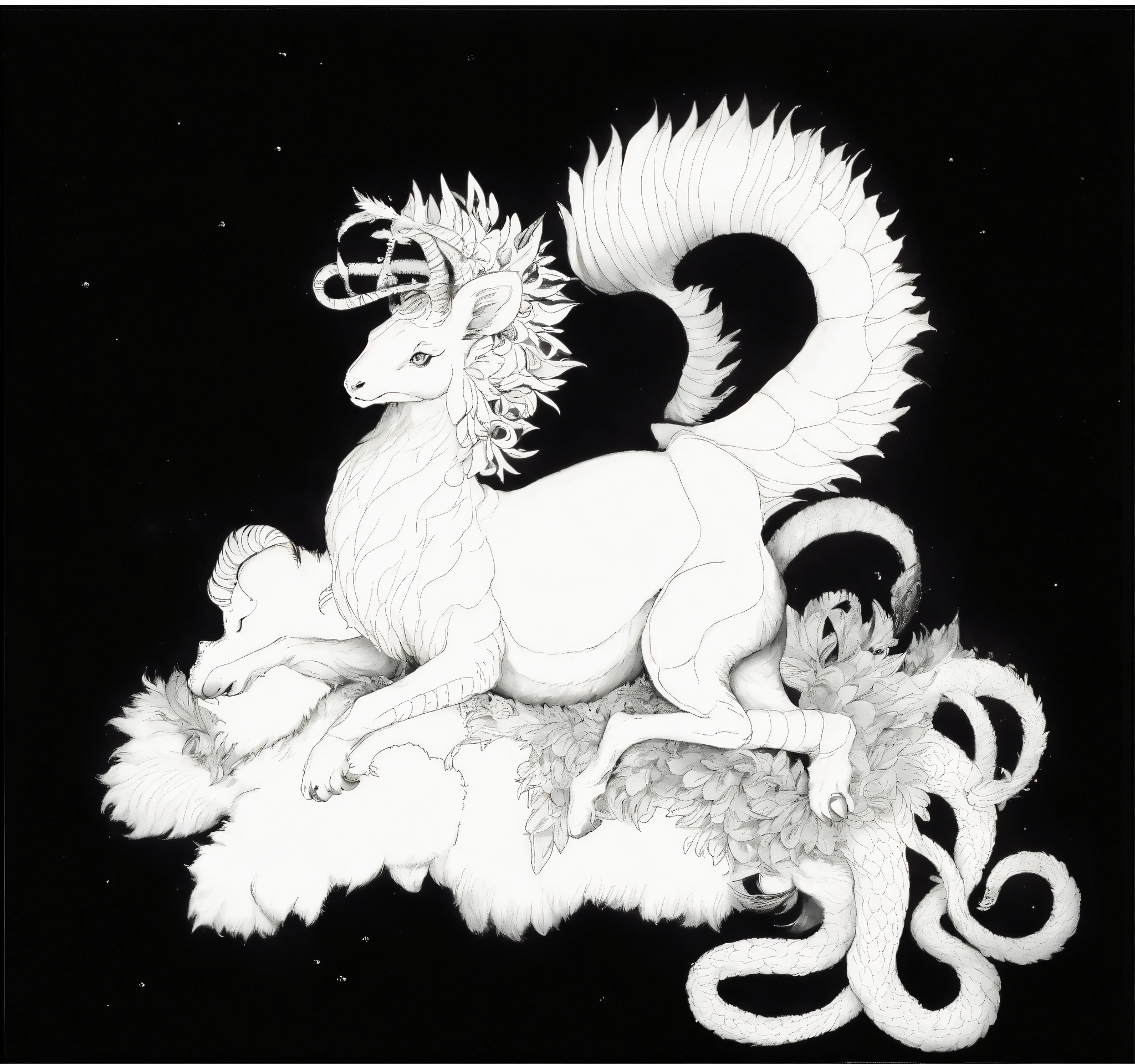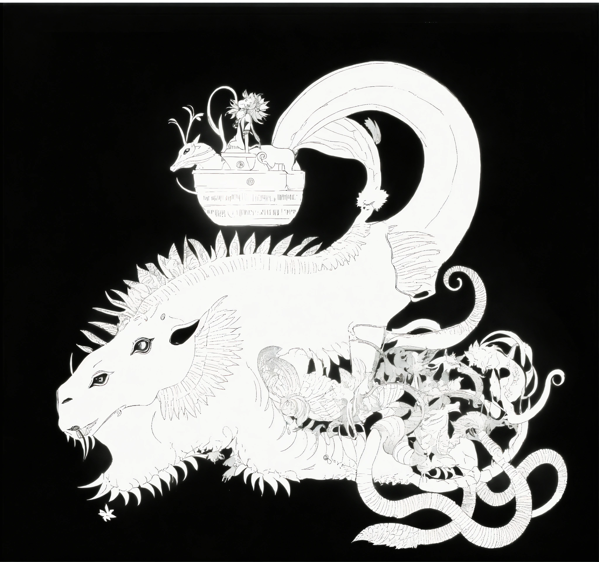 A surrealistic mythical creature assembled from different animal components, existing in a world where reality and surrealism intertwine.