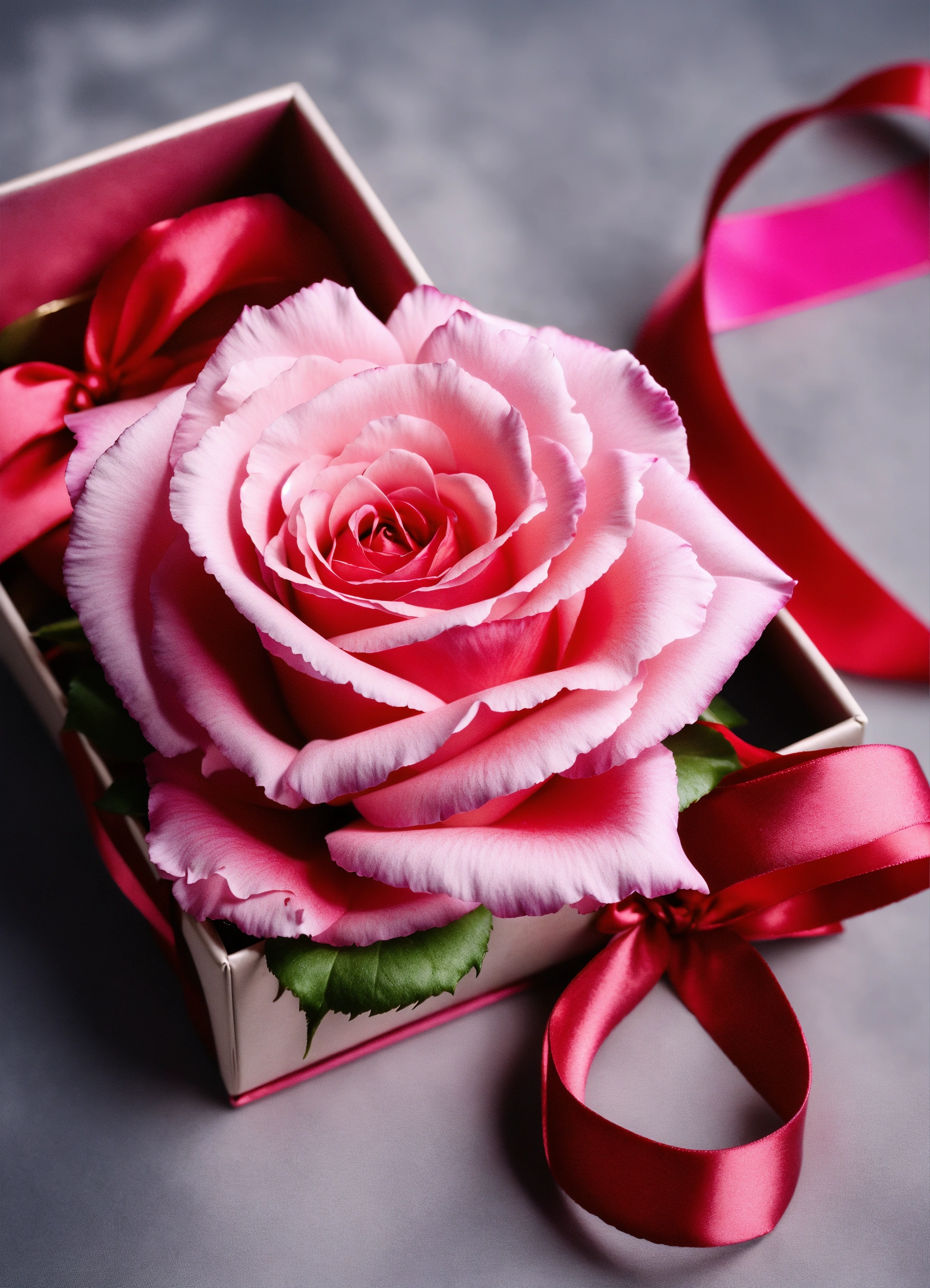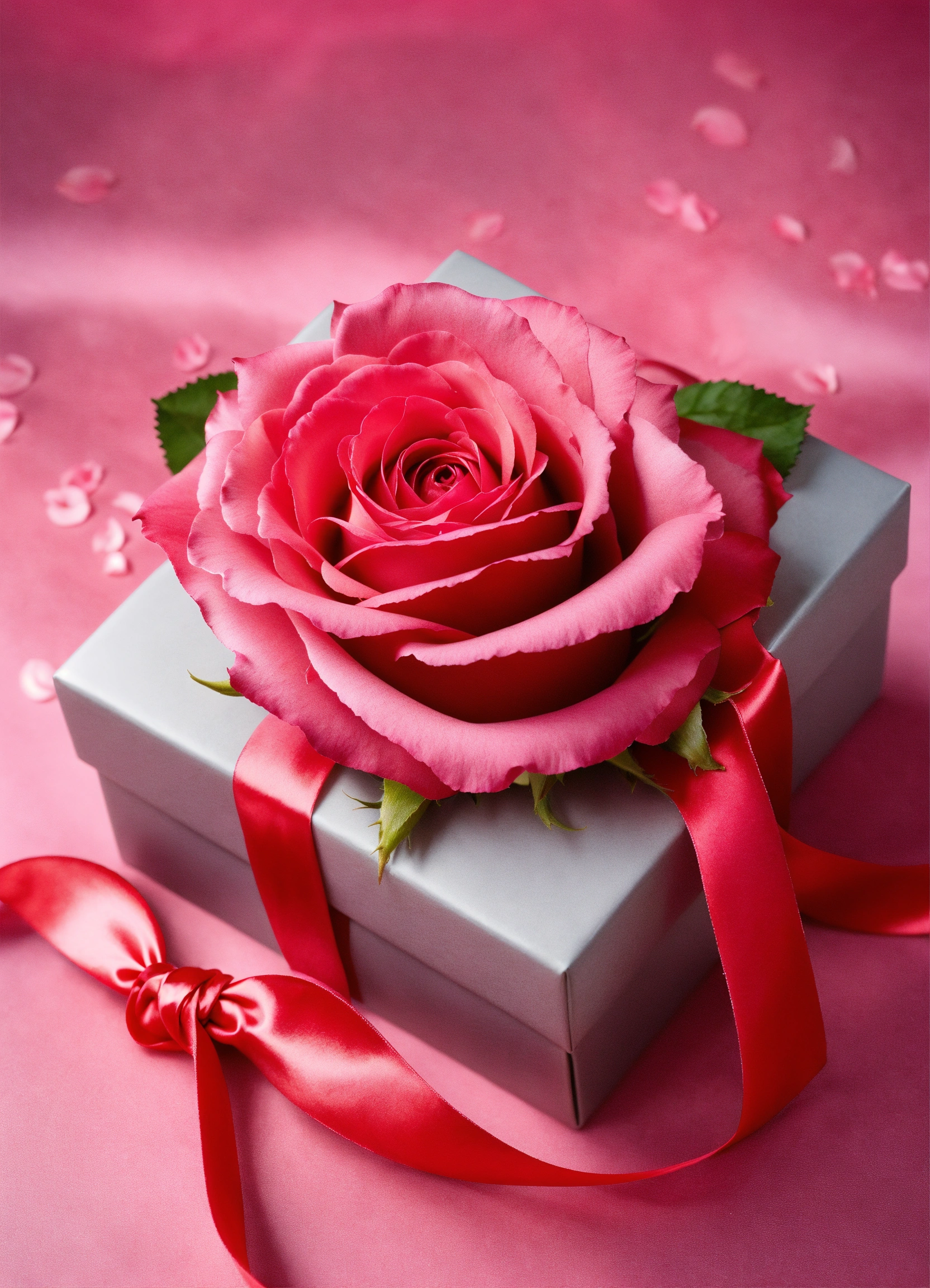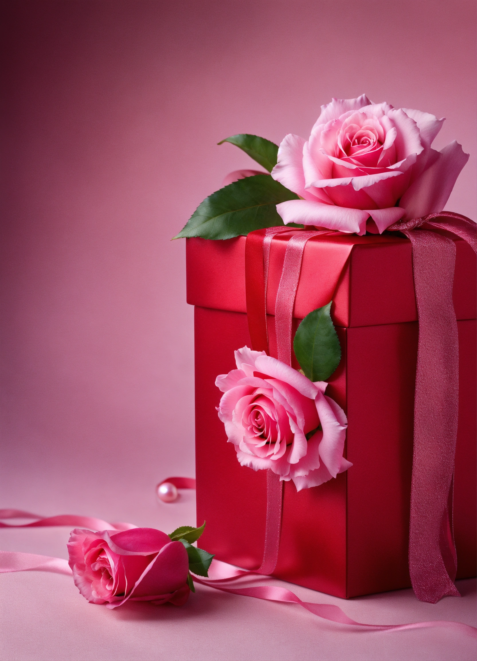 Flora, scarlet rose, unusually beautiful, elegant, with wavy petals lies on a gift box tied with a scarlet ribbon and around a pink pearl, high detail, bright colors, soft pink-gray background
