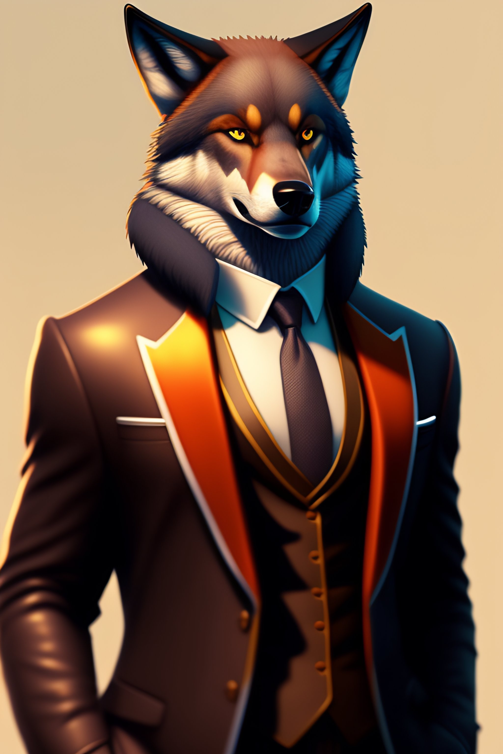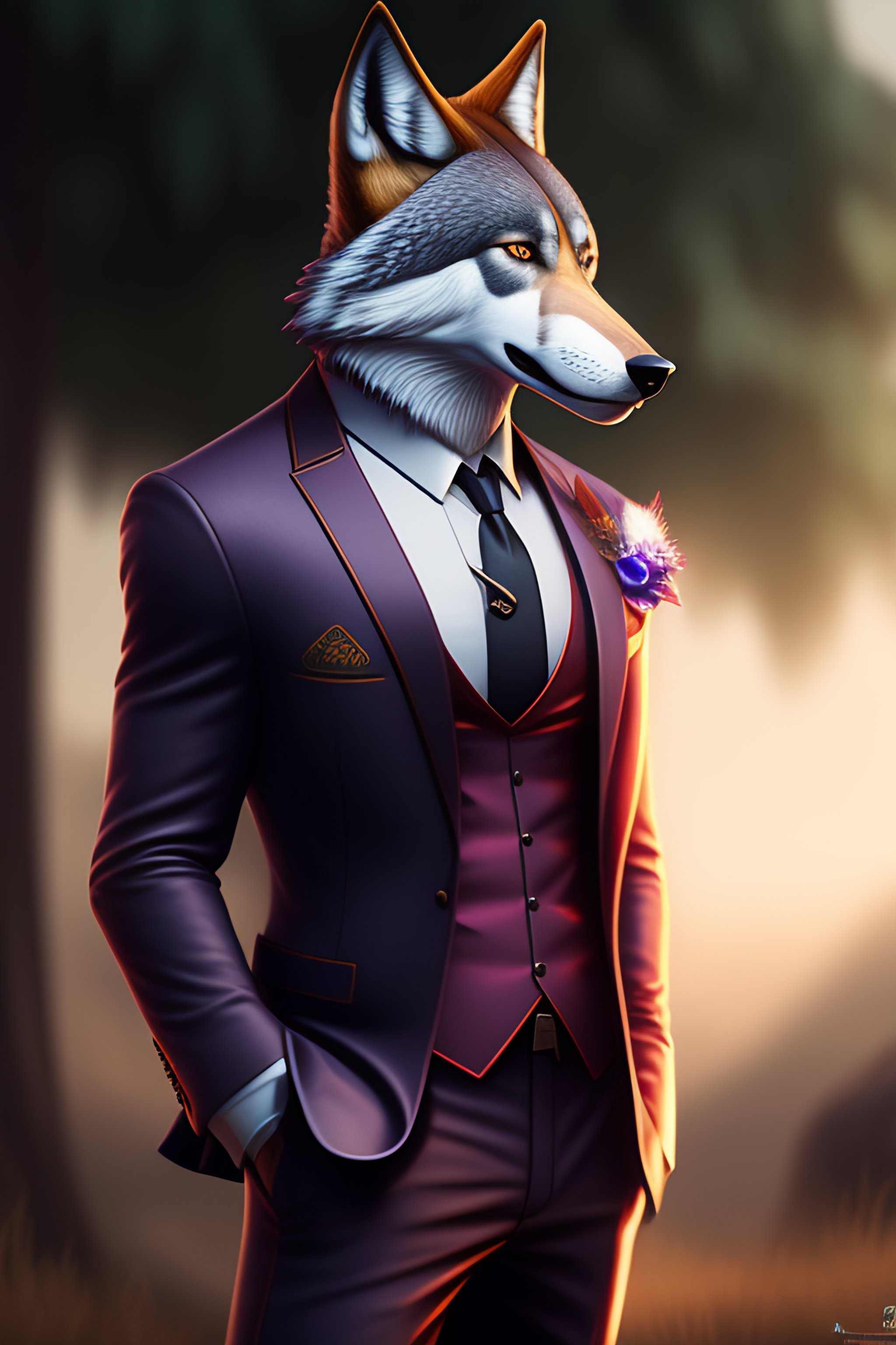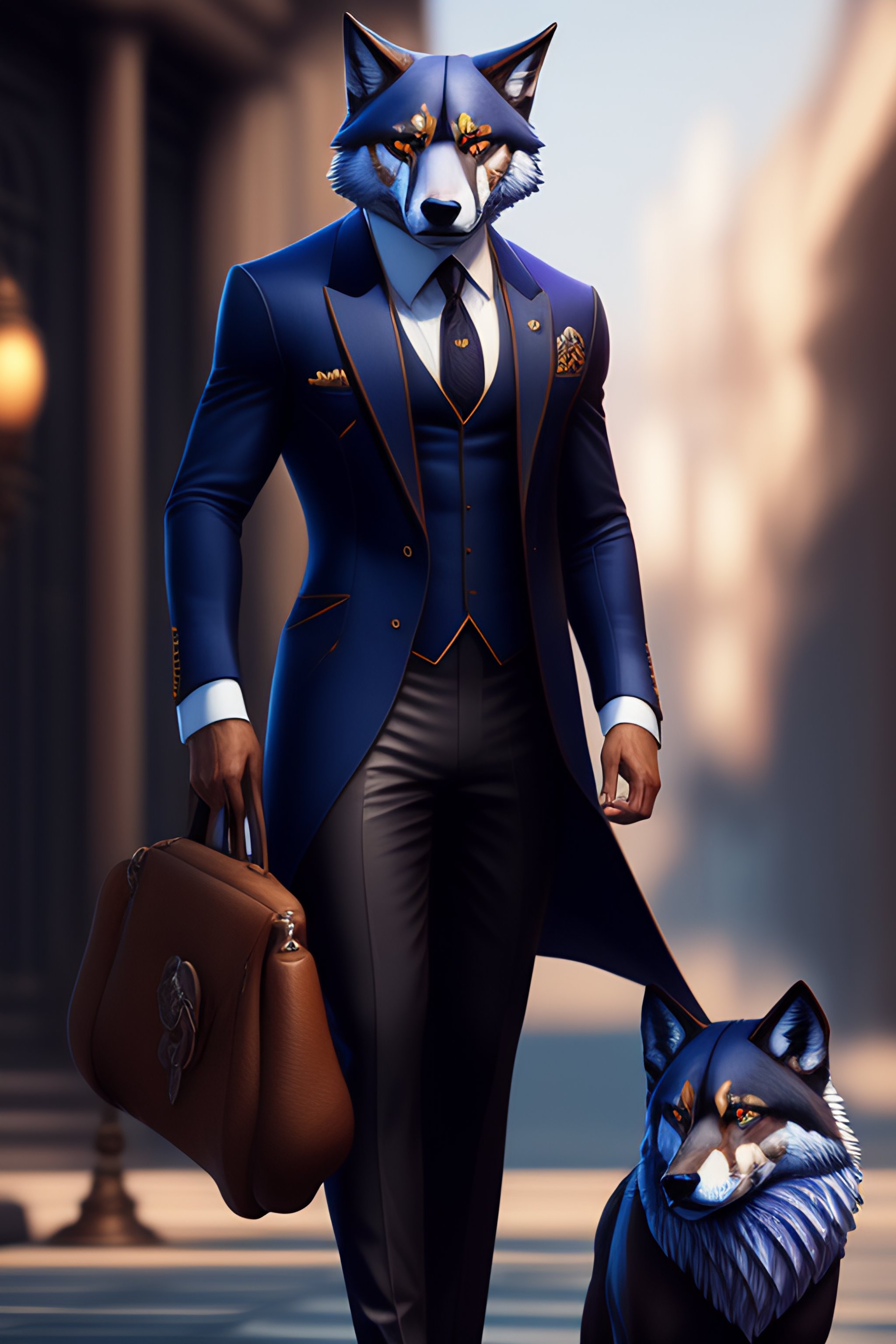 Anthro furry humanoid wolf, three piece suit, checking watch, character concept design, painting, detailed, vivid, trending on artstation