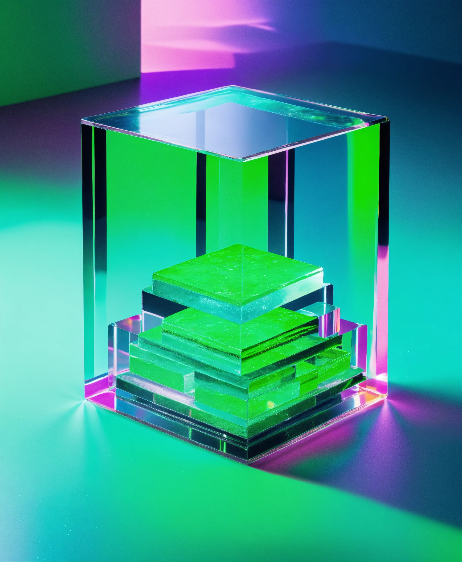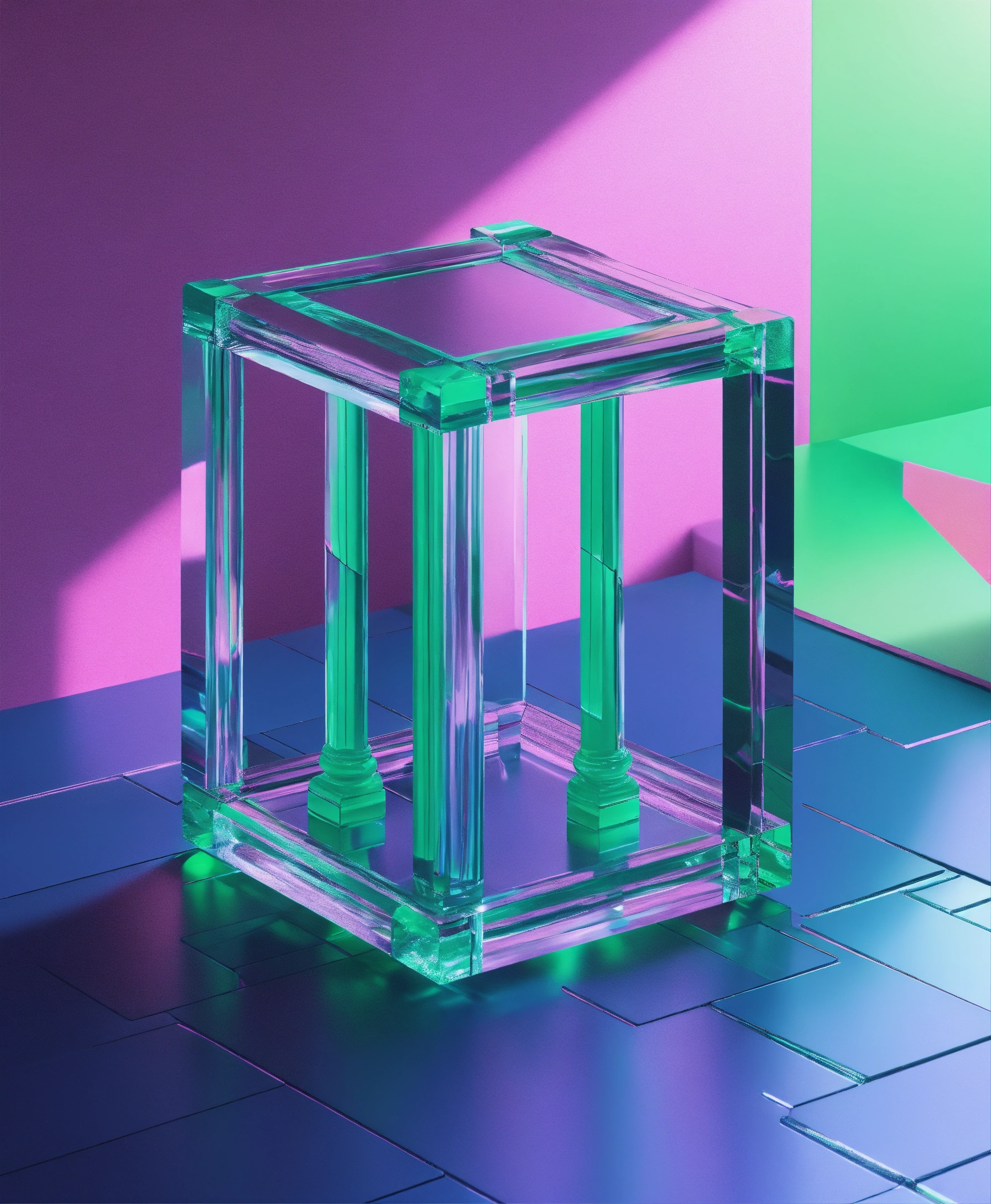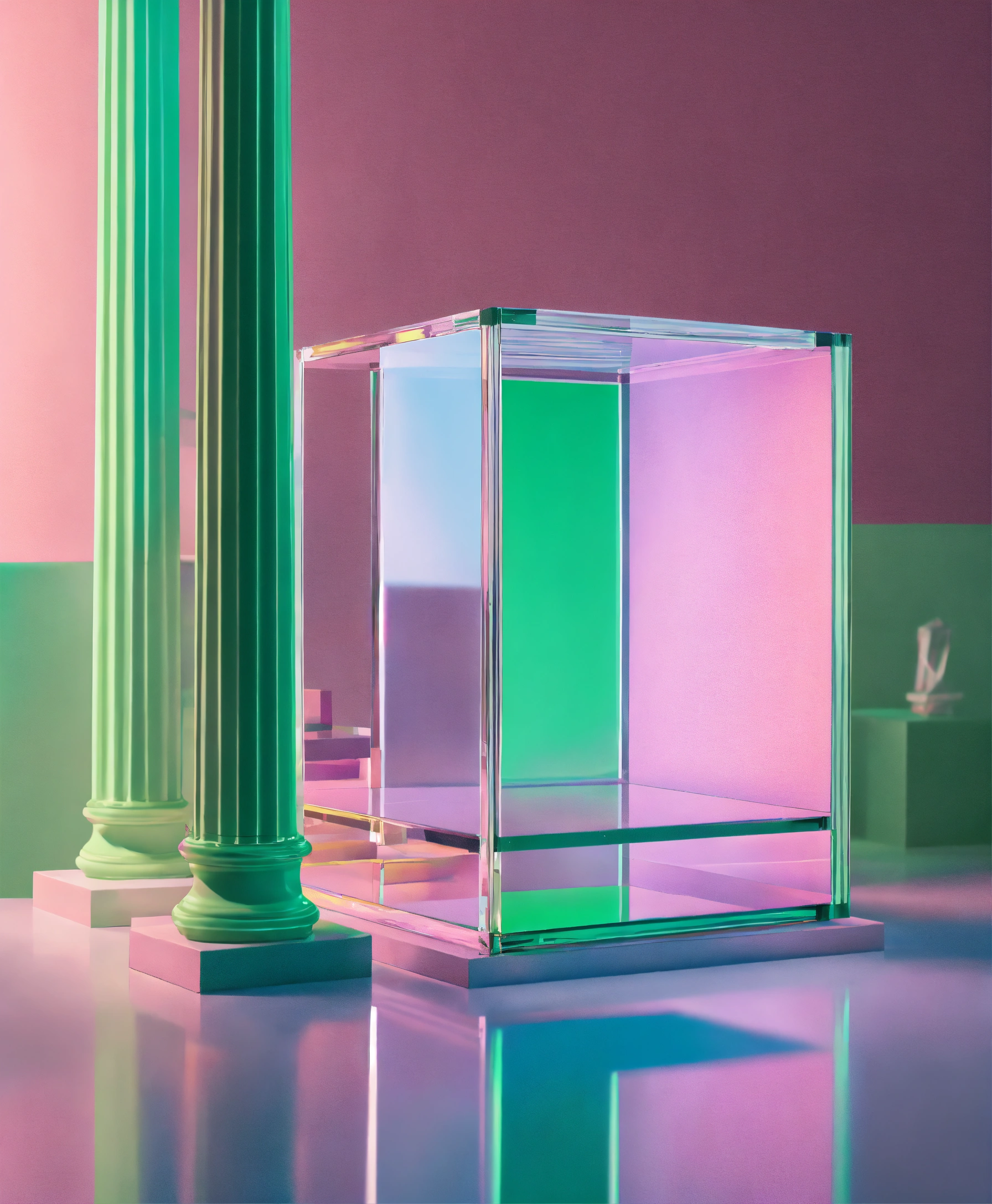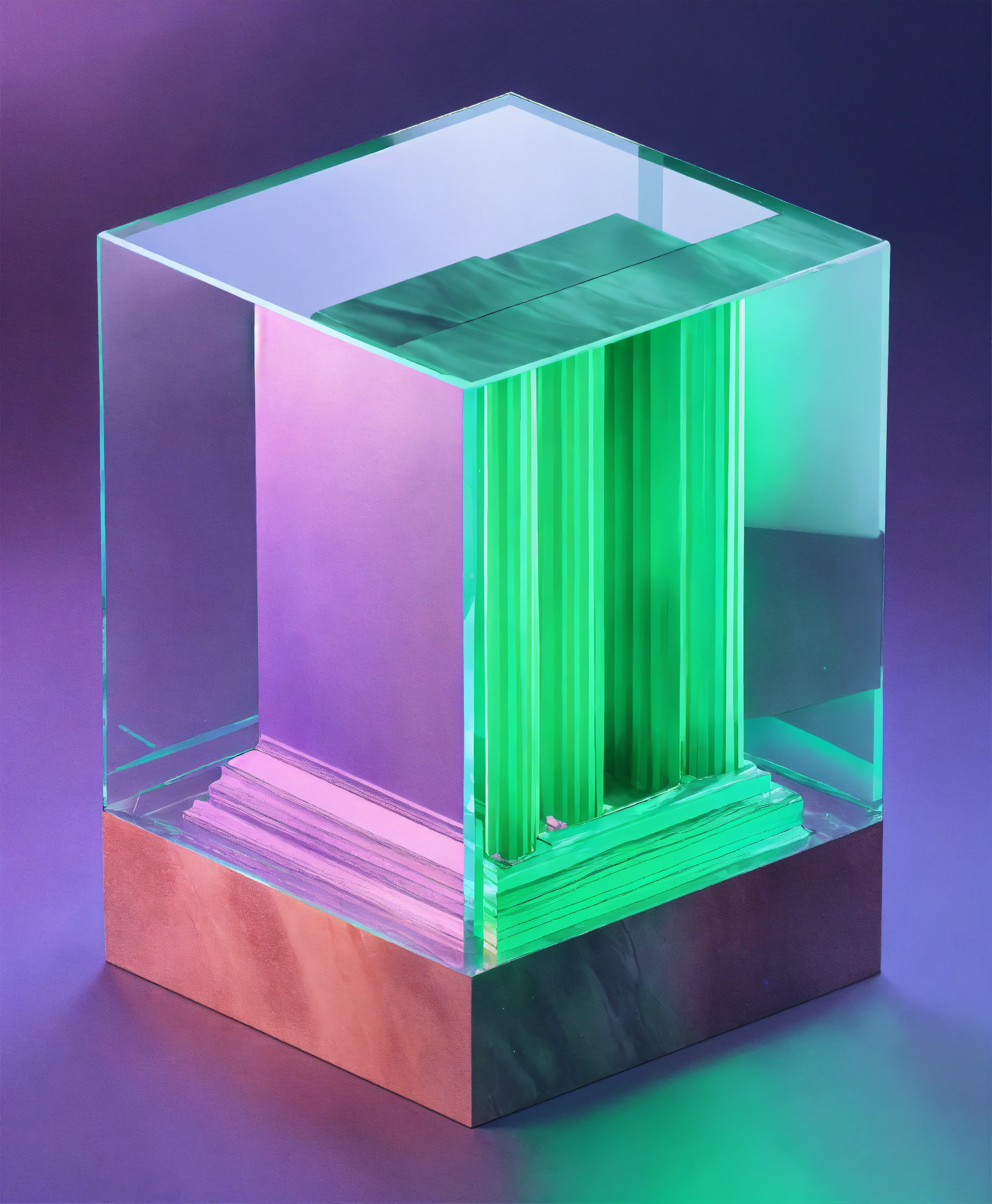 Isometric clear glass cube, stacked marble roman columns, studio photography, some neon green accent color, 4k, iridescent! muted color background! realistic!