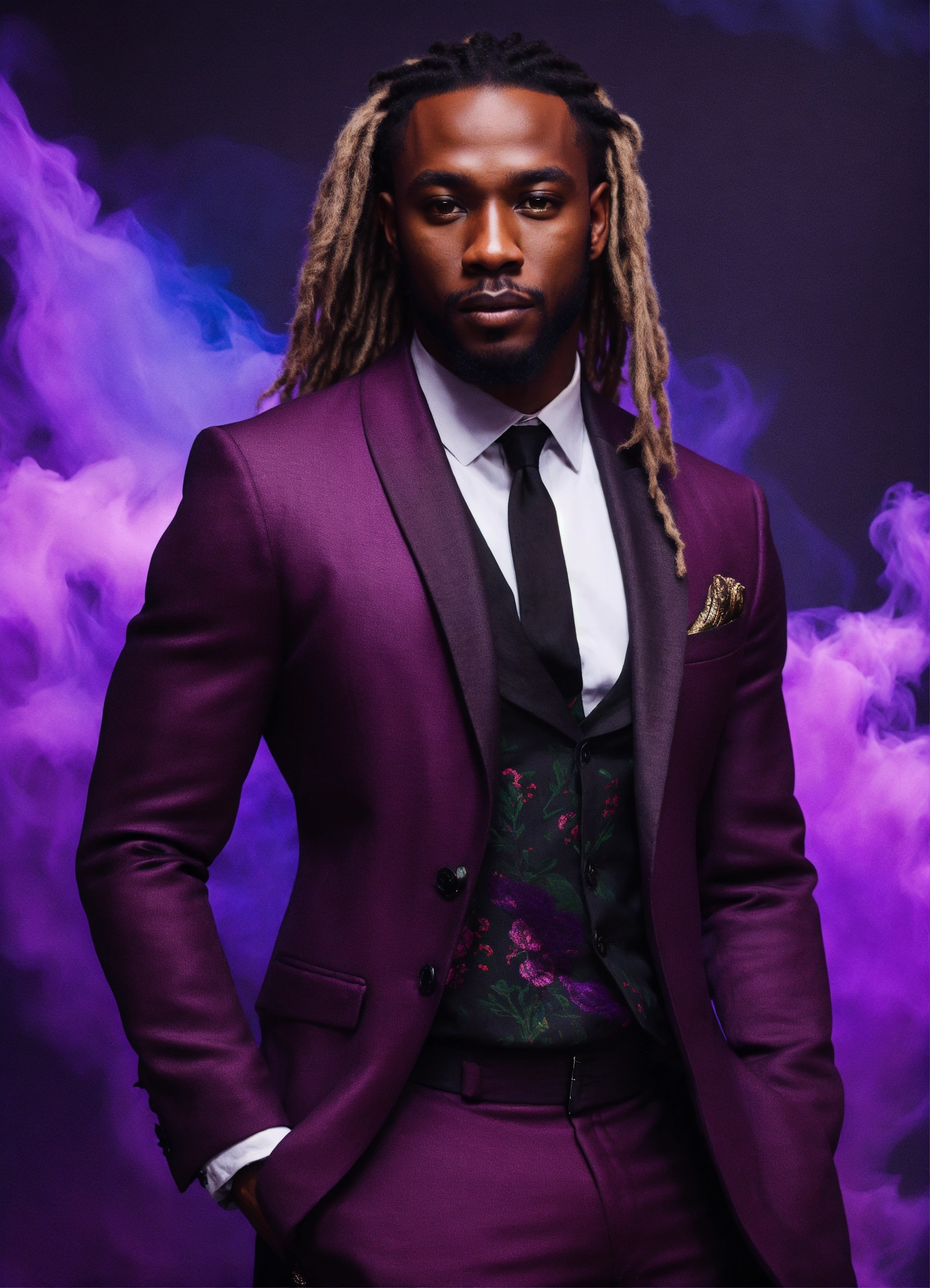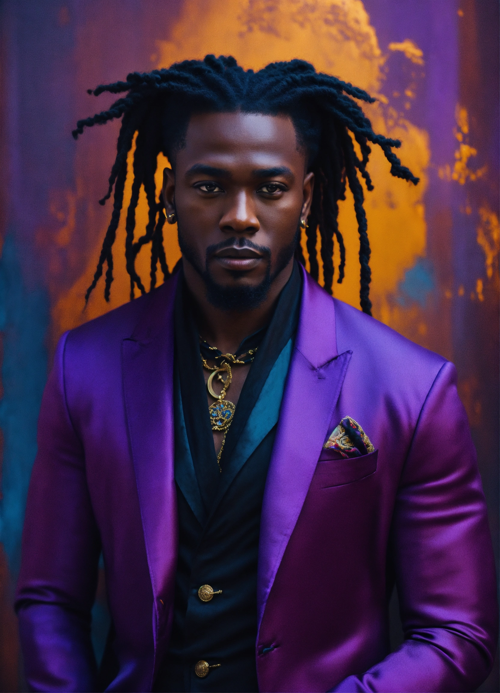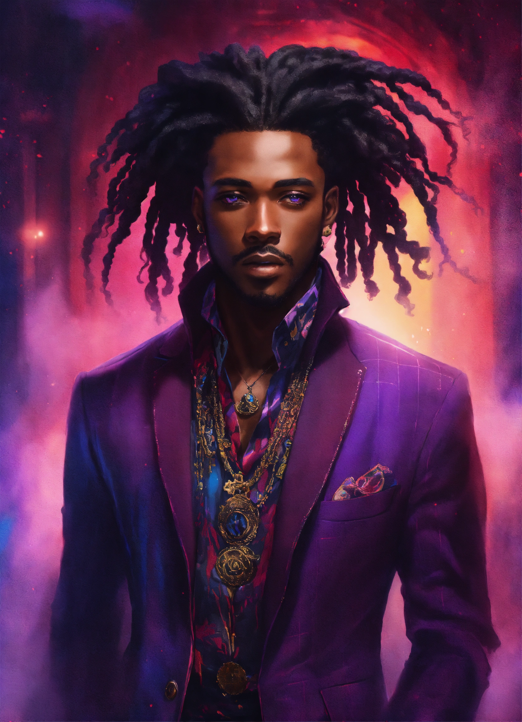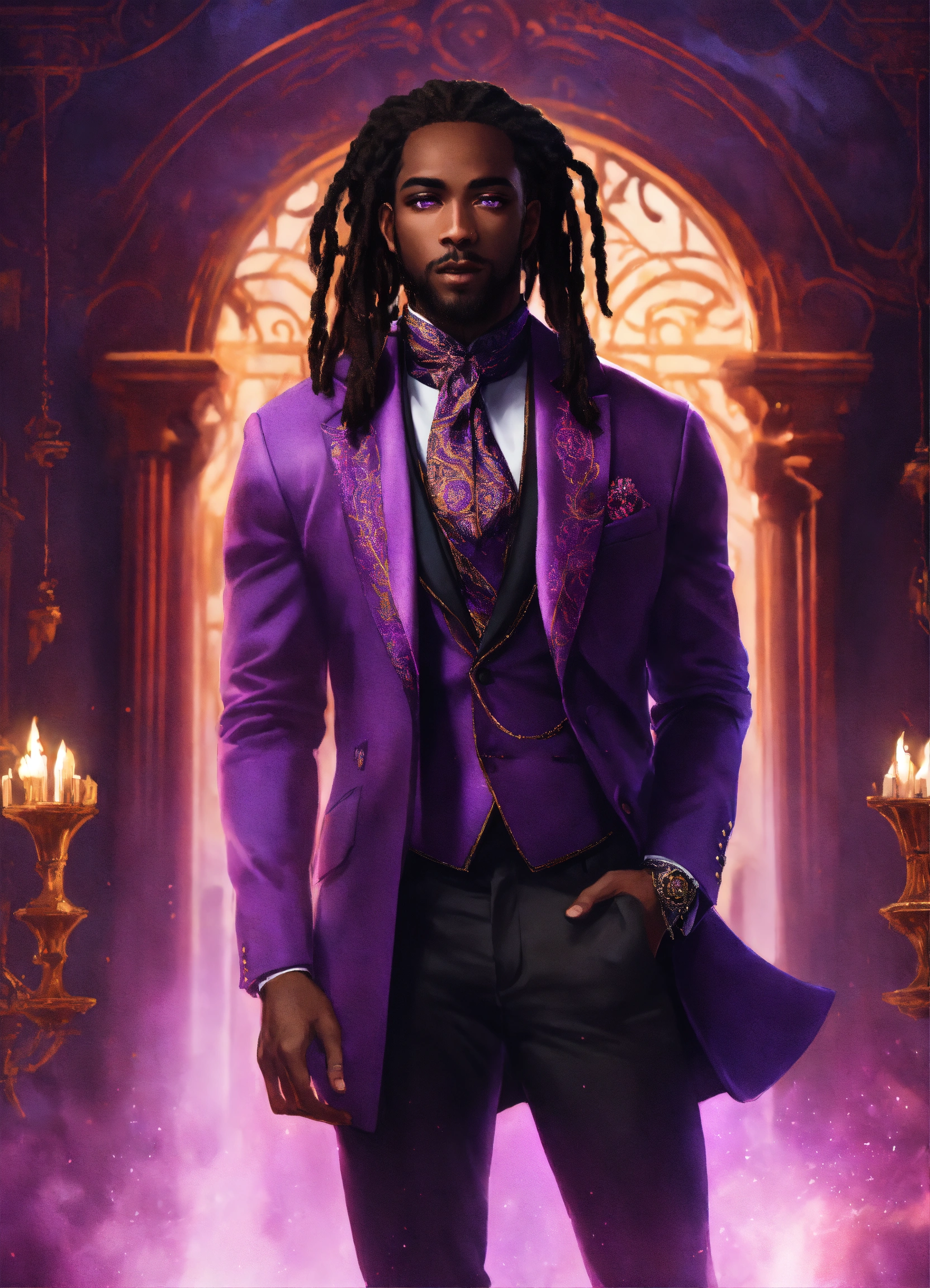 A black man of dark skin with ornate styled dreadlocks vibrant violet eyes a broad check and shoulders he wears black and purple blazer with a silk coat and black linen pants background a floating ethereal spirit